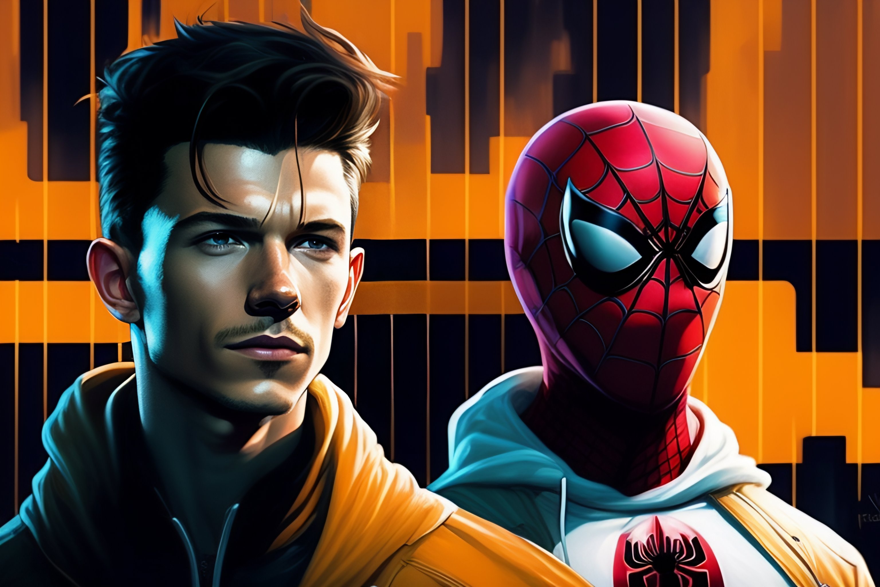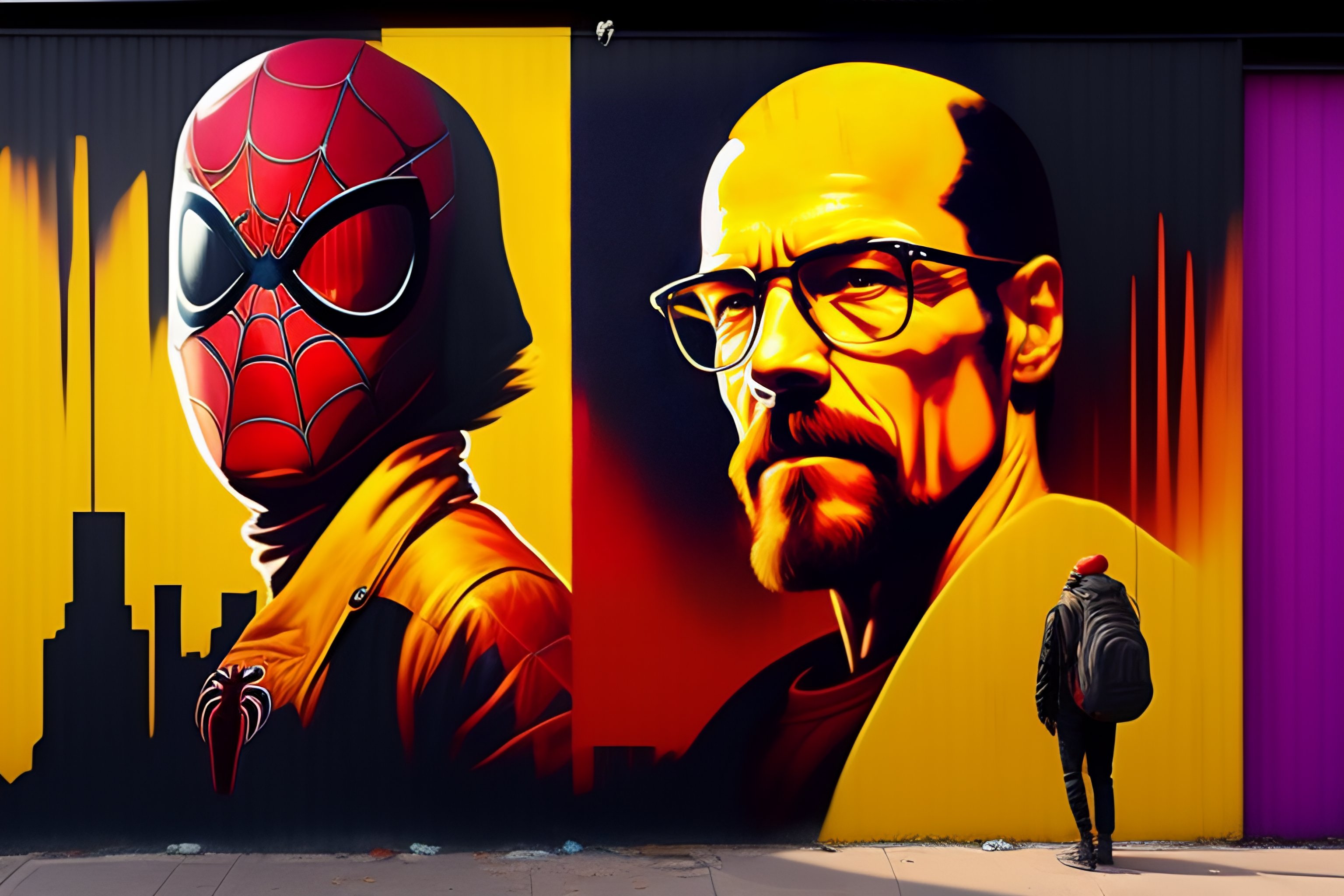 Full body highly detailed portrait of walter white and tom holland as spiderman in the twin towers september 11 attack, by greg rutkowski, by greg tocchini, by james gilleard, by joe fenton, by kaethe butcher, gradient yellow, black, brown and magenta color scheme, grunge aesthetic!!! graffiti tag wall background