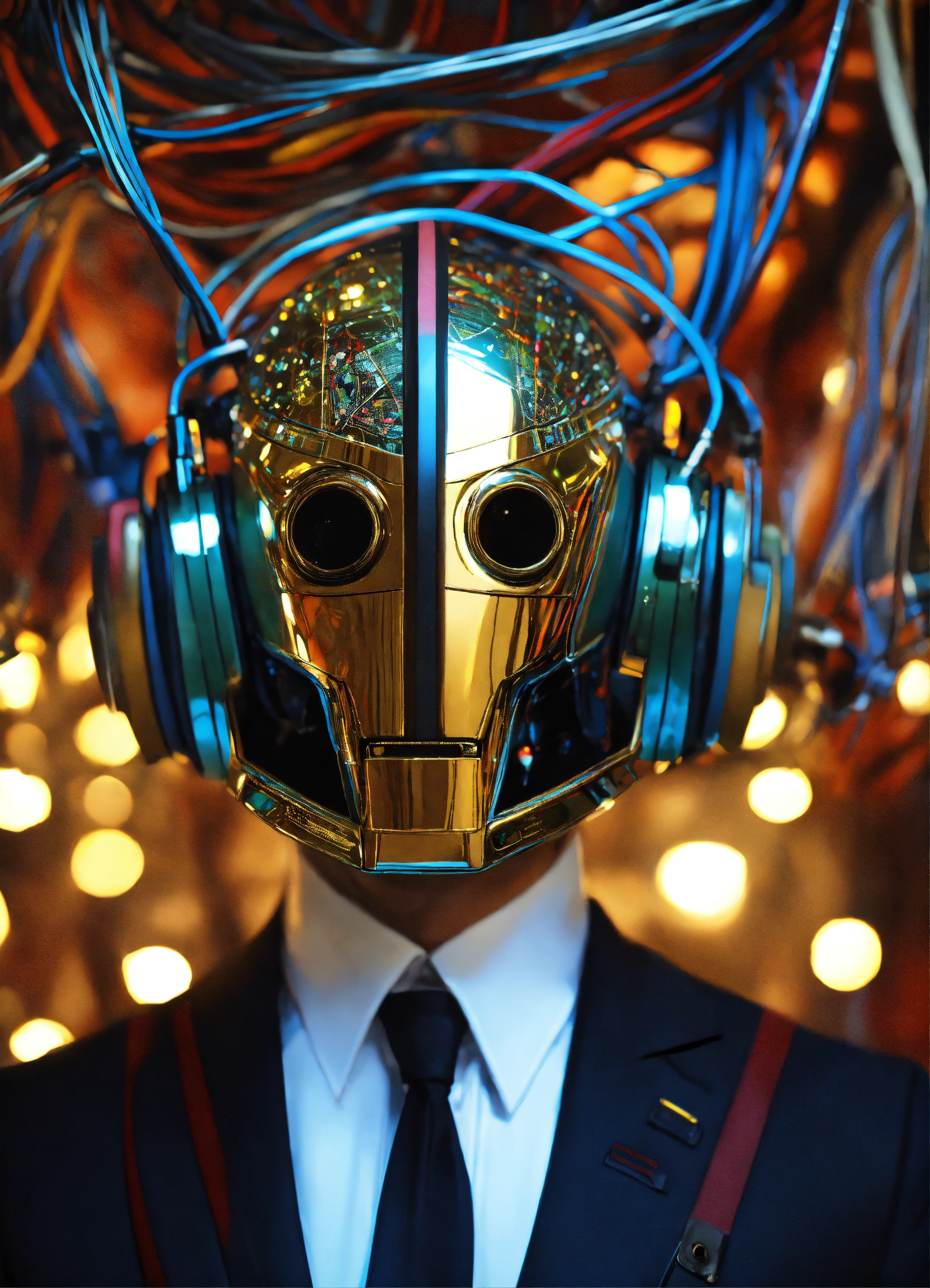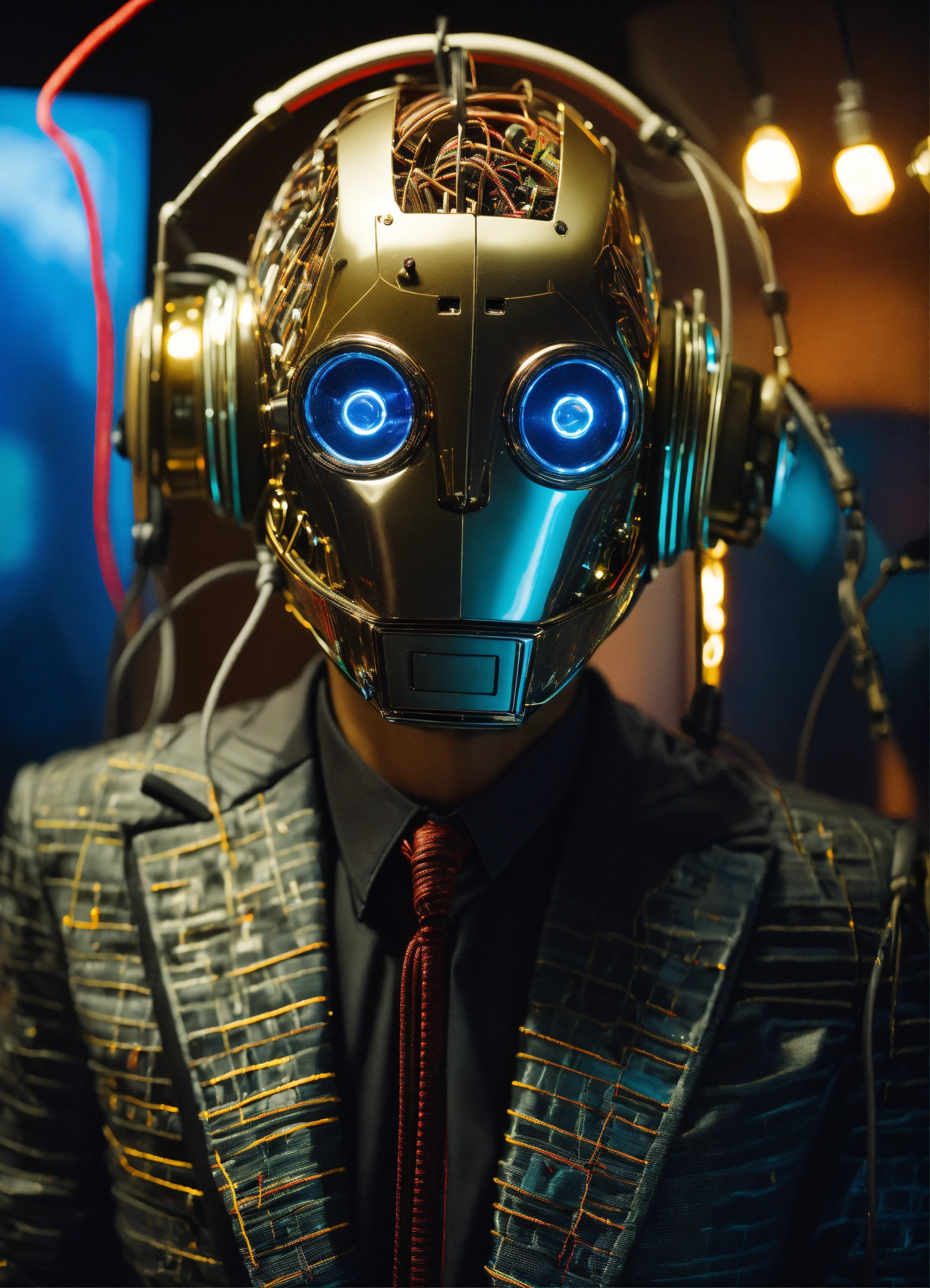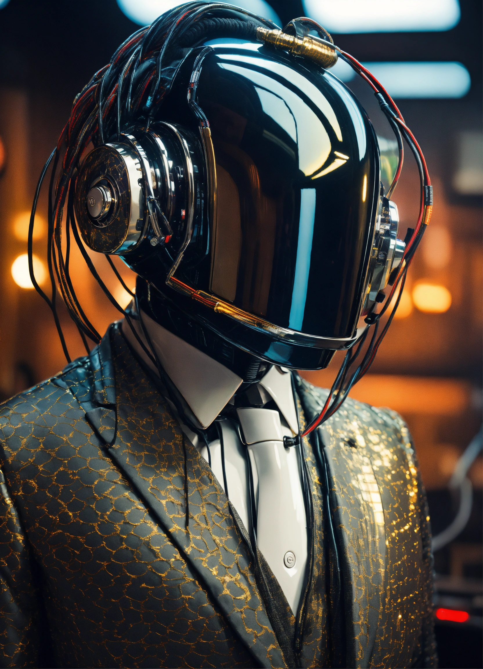 Close up portrait photography, one of the daft punk robots dressed in suits, in a music studio full of cables and wires and led, 80 degree view, art by sergio lopez, natalie shau, james jean and salvador dali