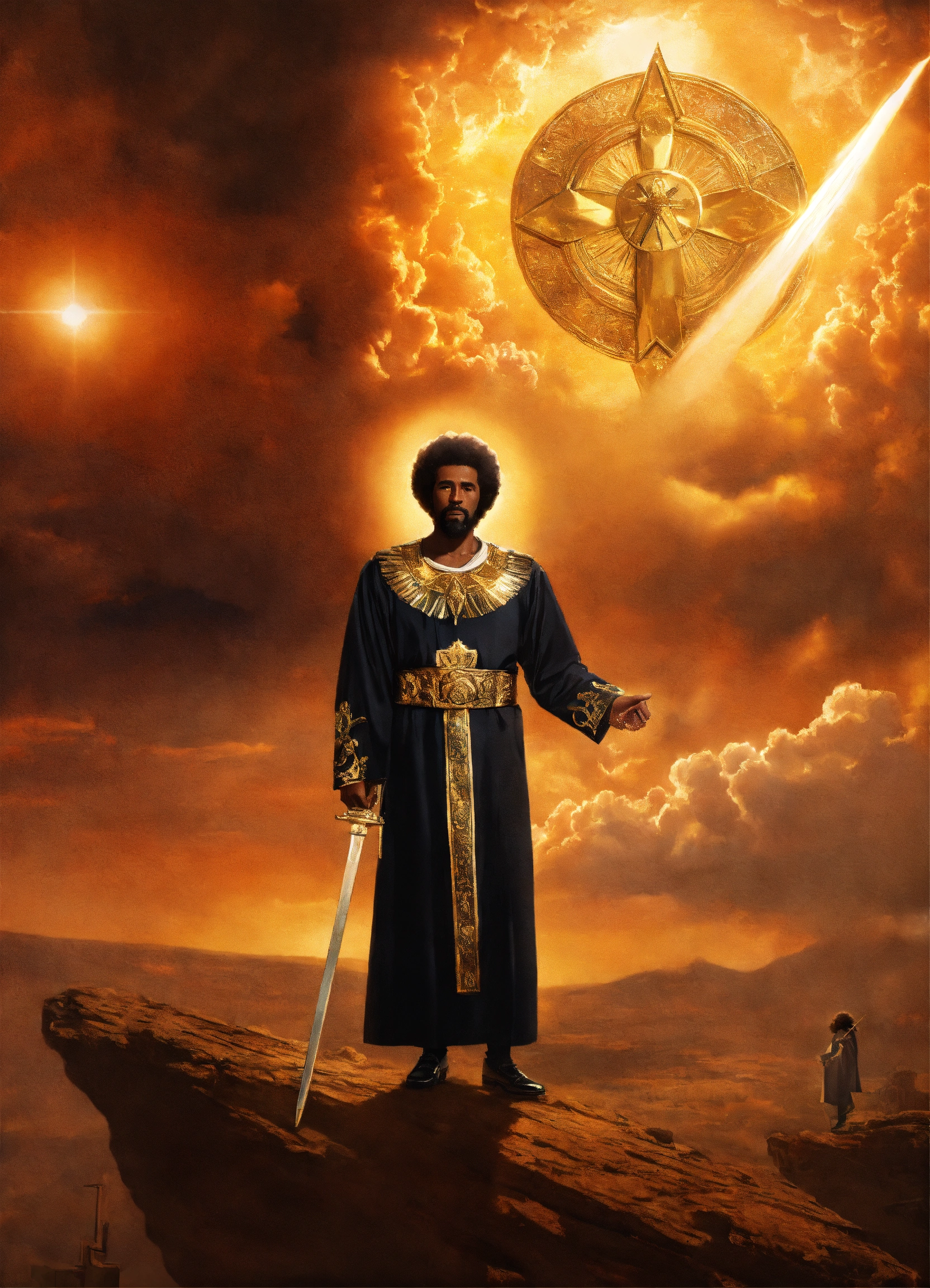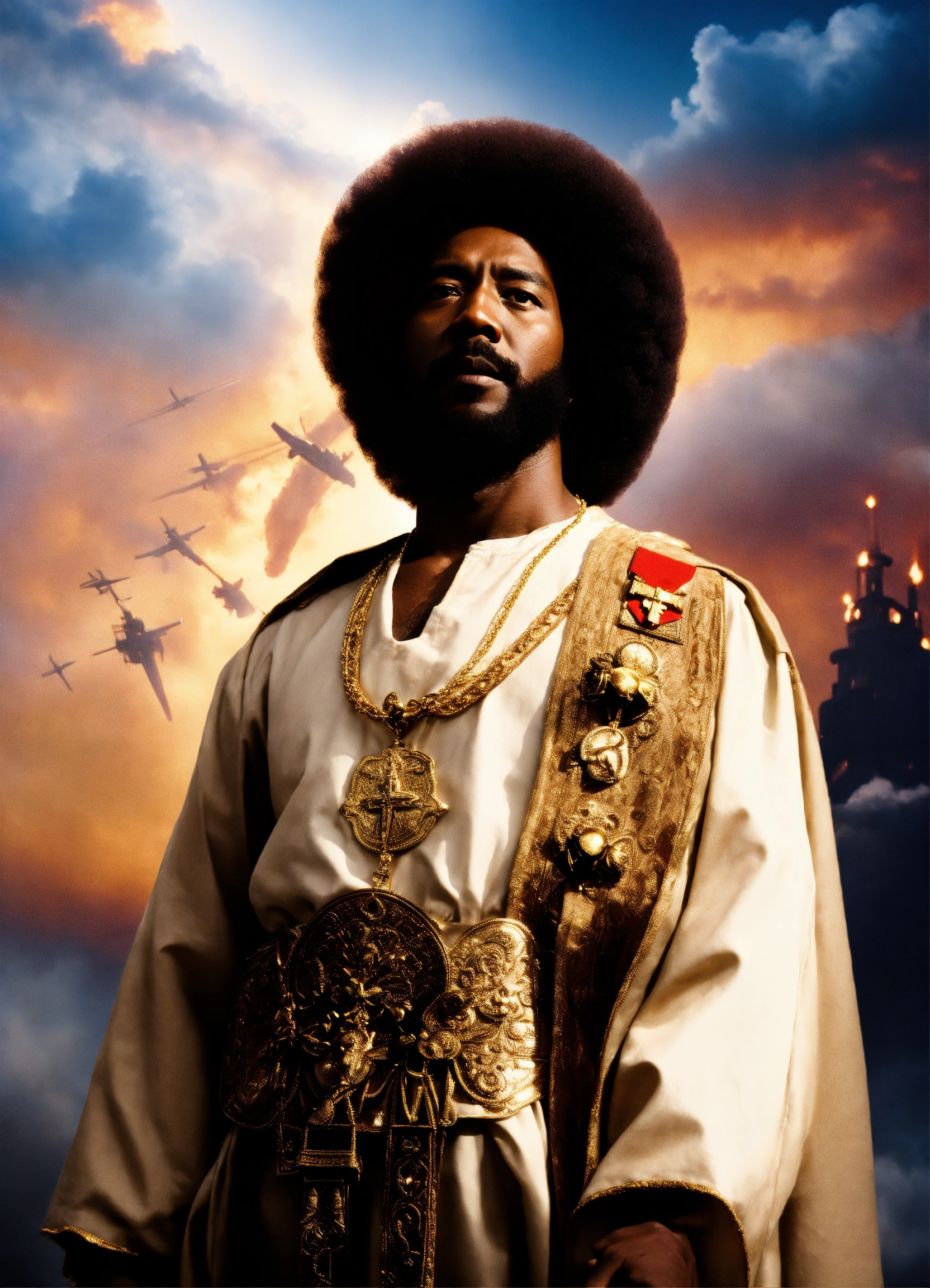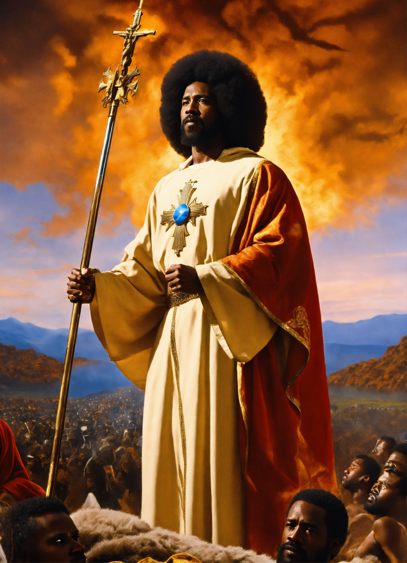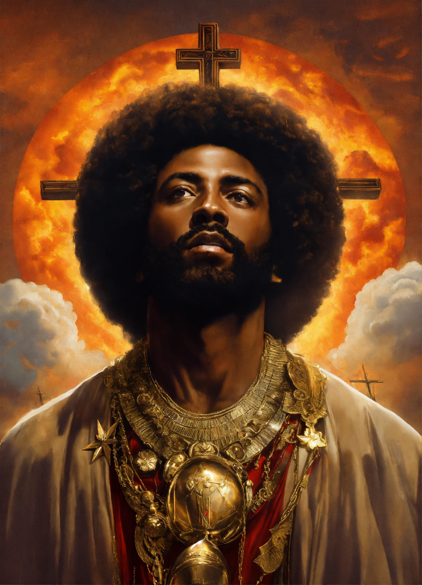 Black christ like richard roundtree with afro decending from heaven wearing war like apperal