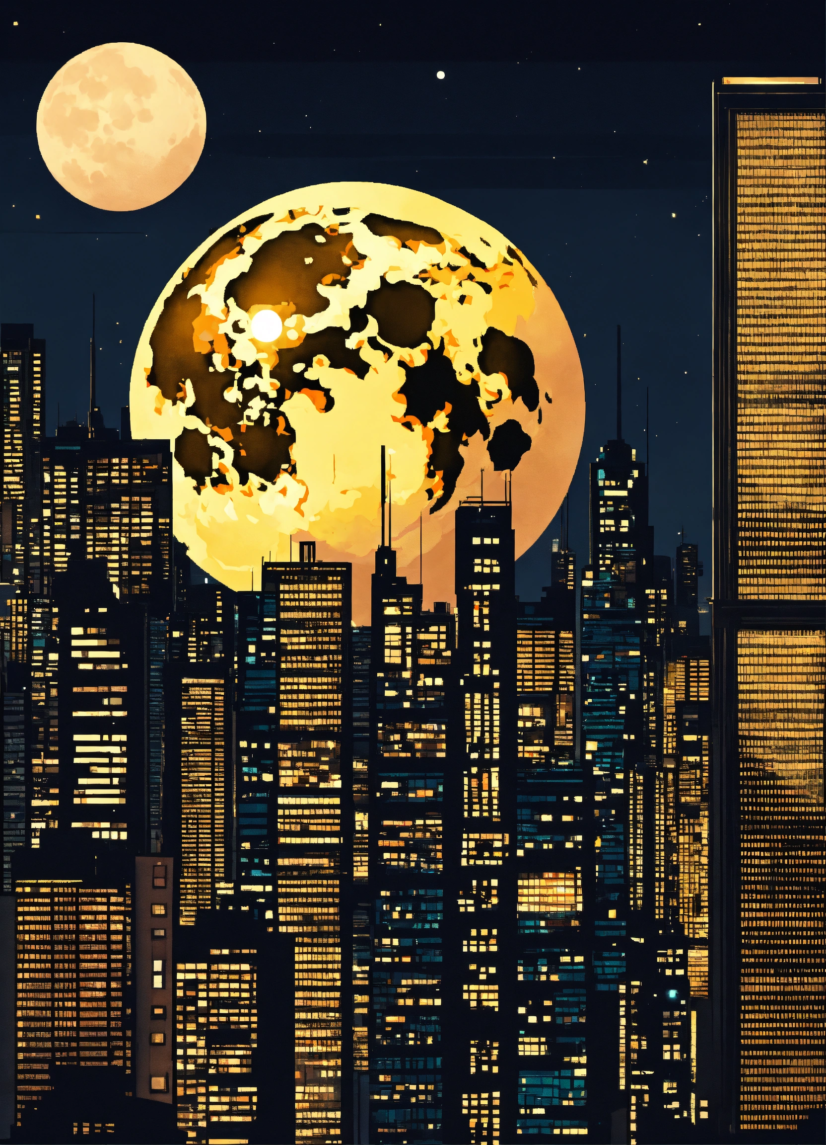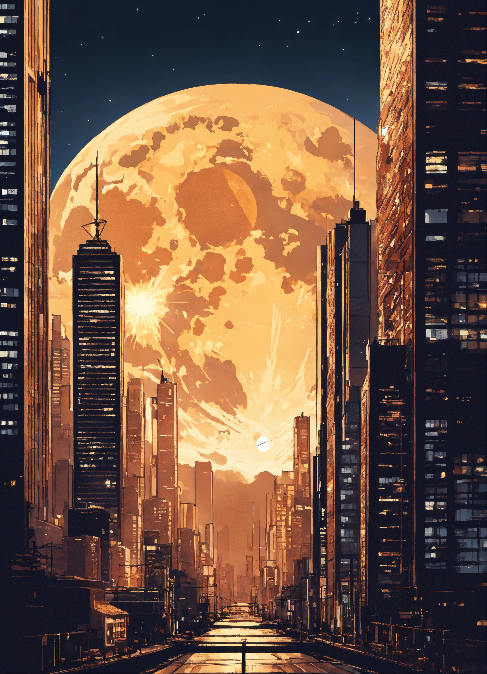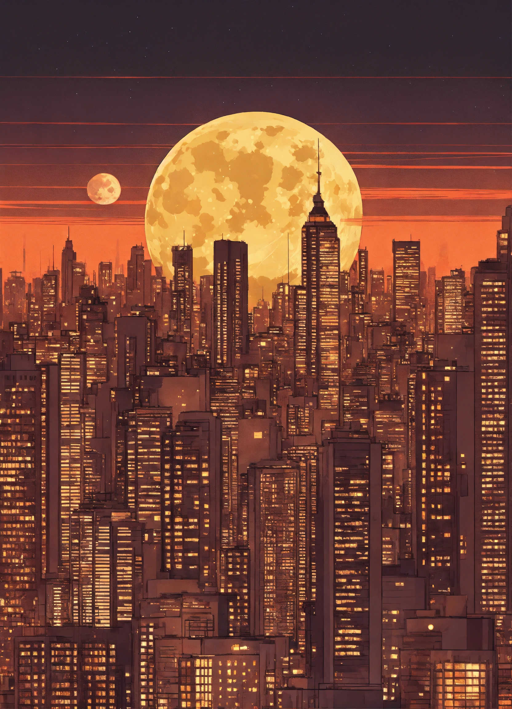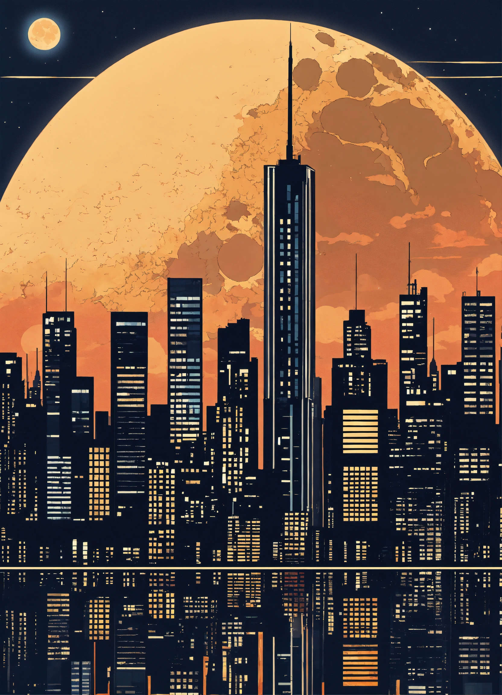Metropolis with tall buildings with a big moon behind no texture