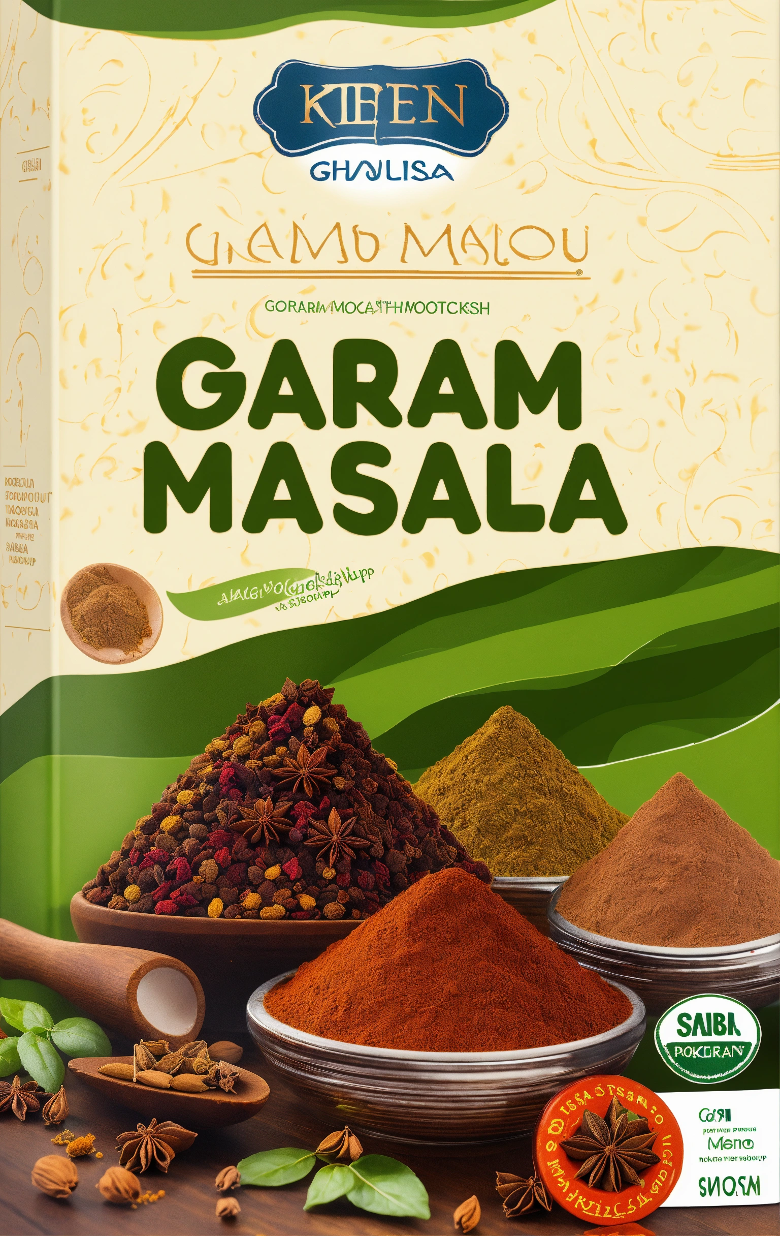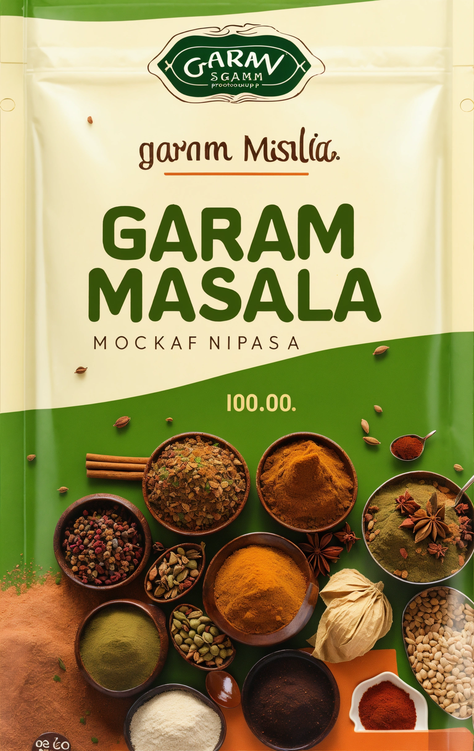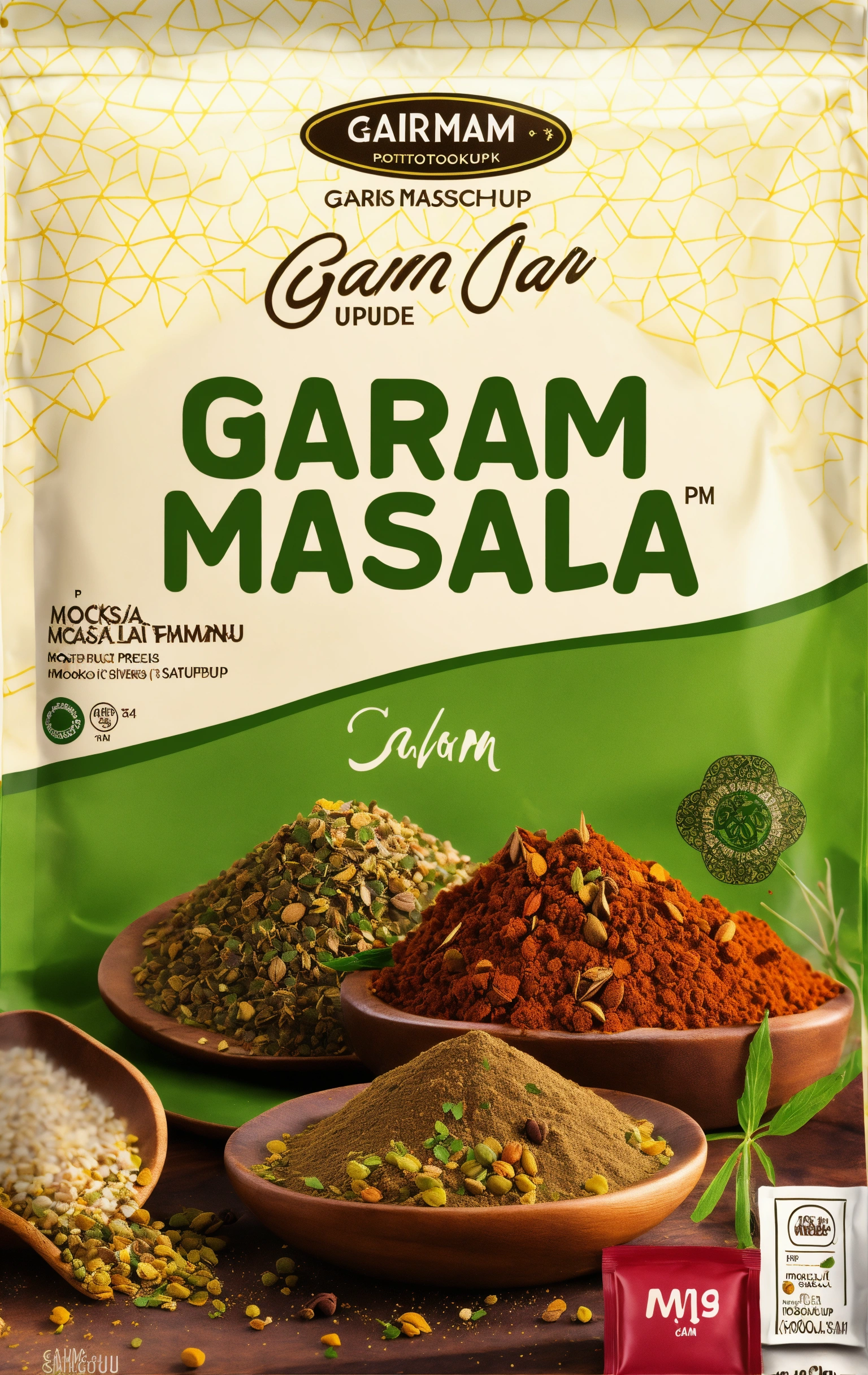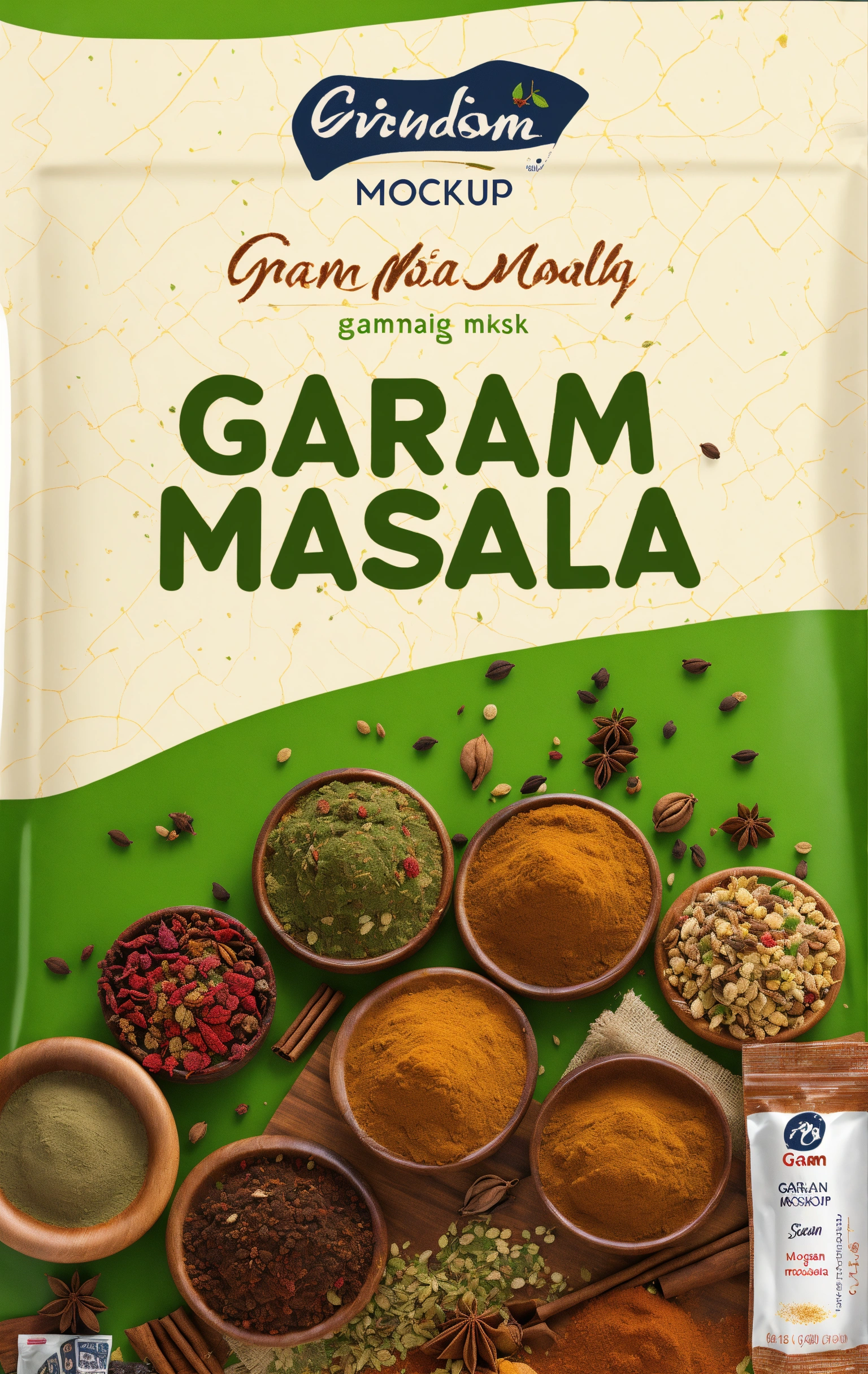 Modern product photography of a garam masala mockup sachet during a photo shoot session, using the image uploaded as the product packet design