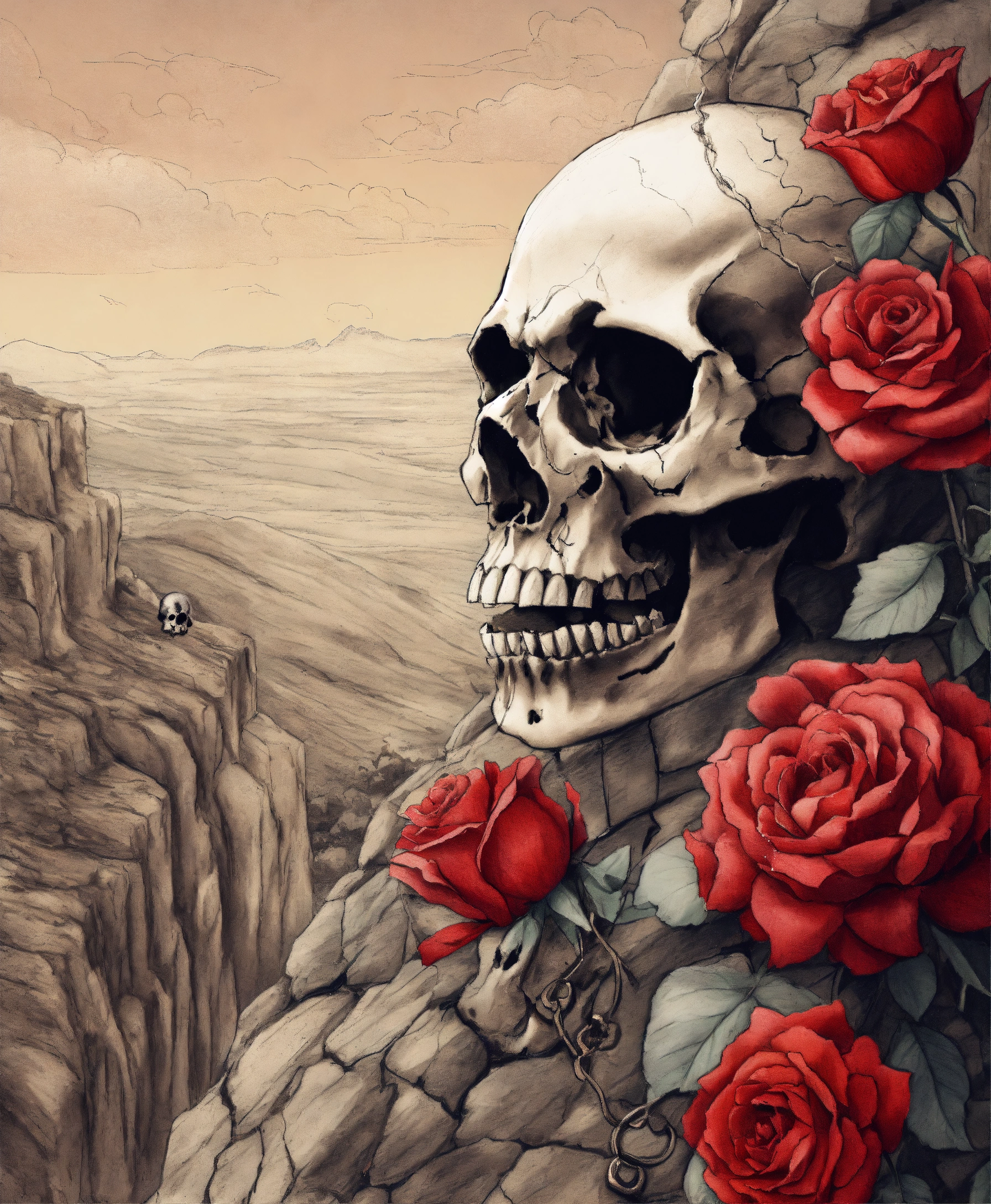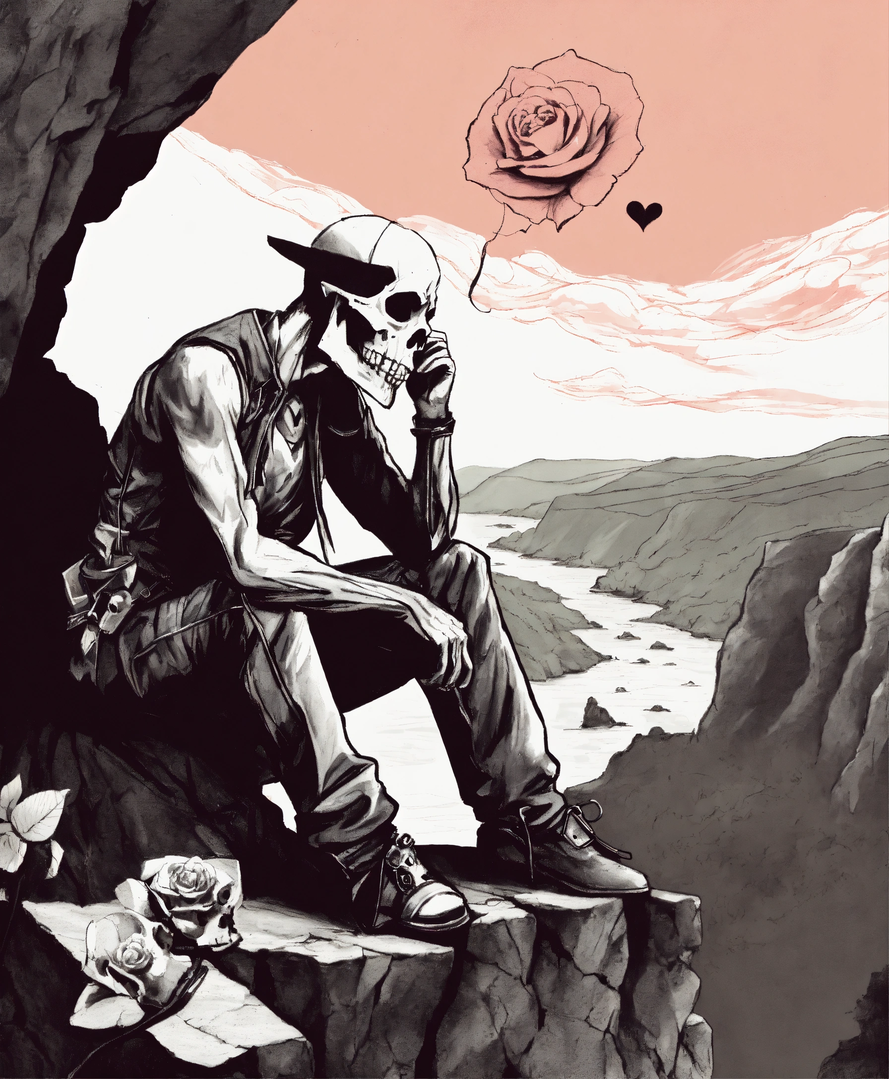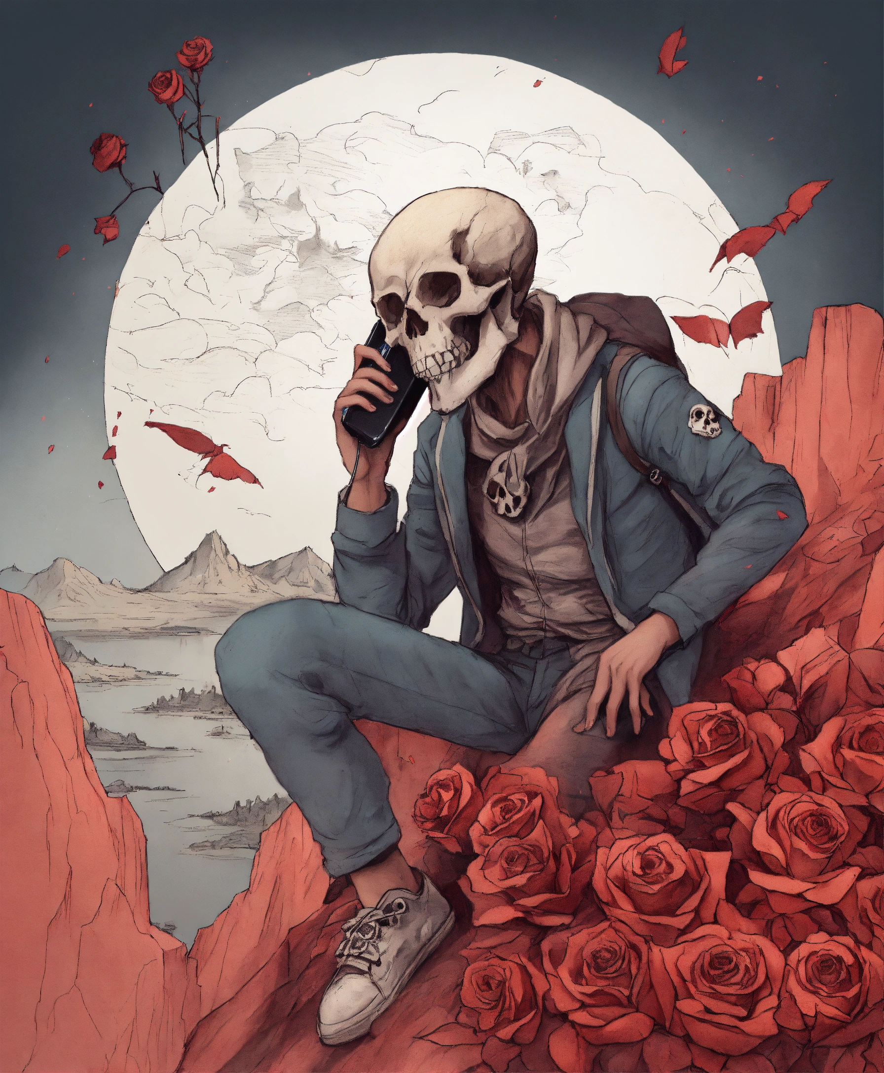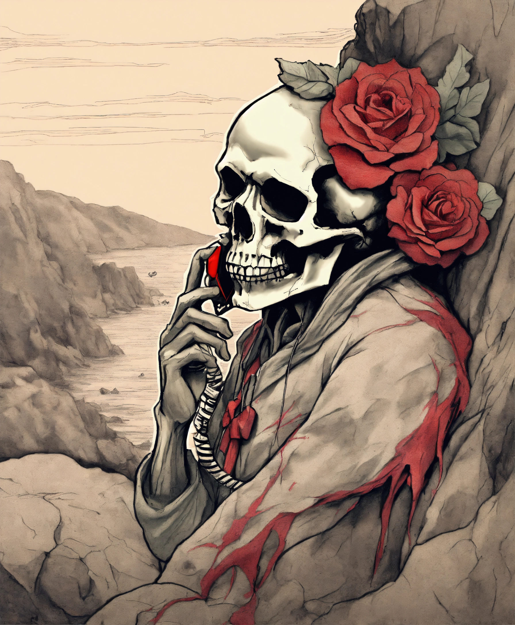 A broken heart, skull face with personified capcuhca calling on the phone from a cliff around roses, while crying, pencil drawing style