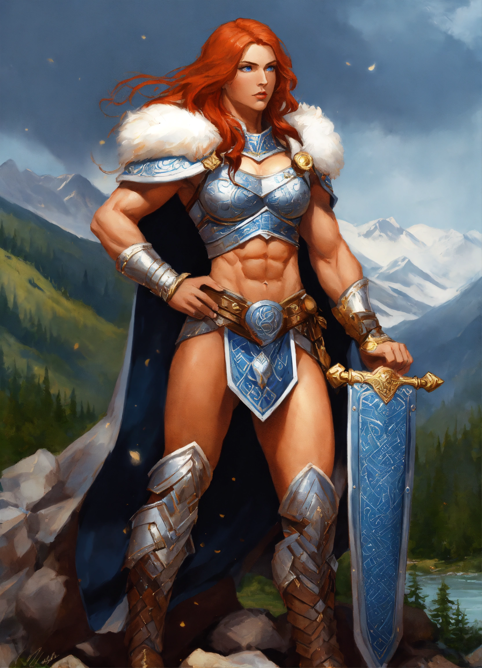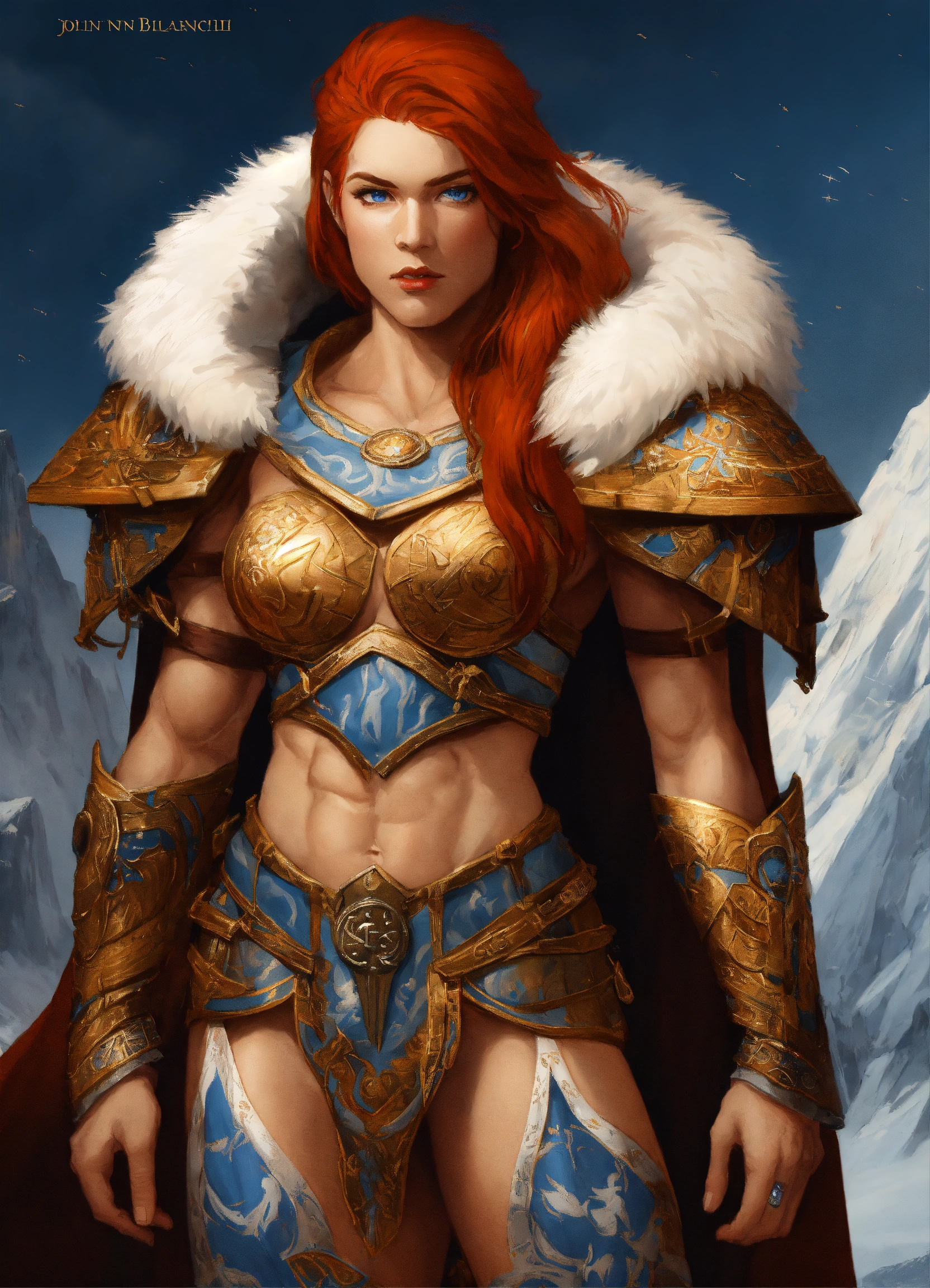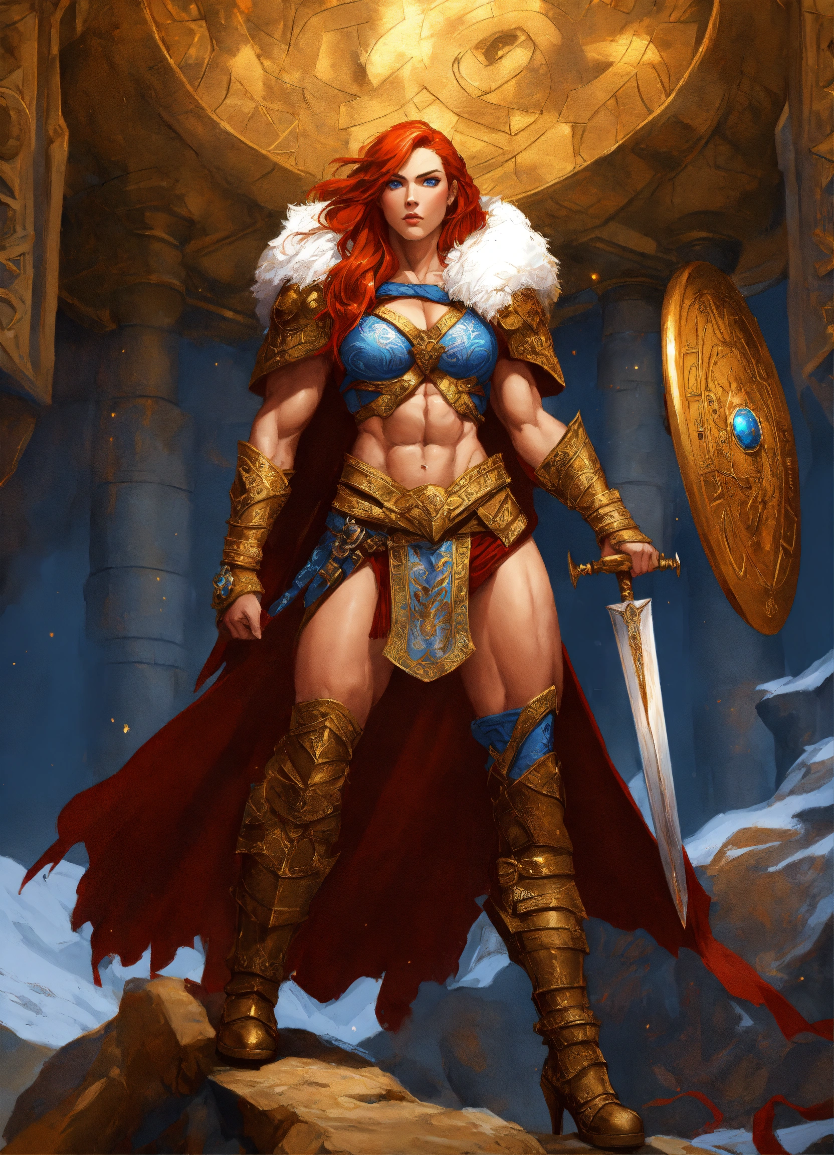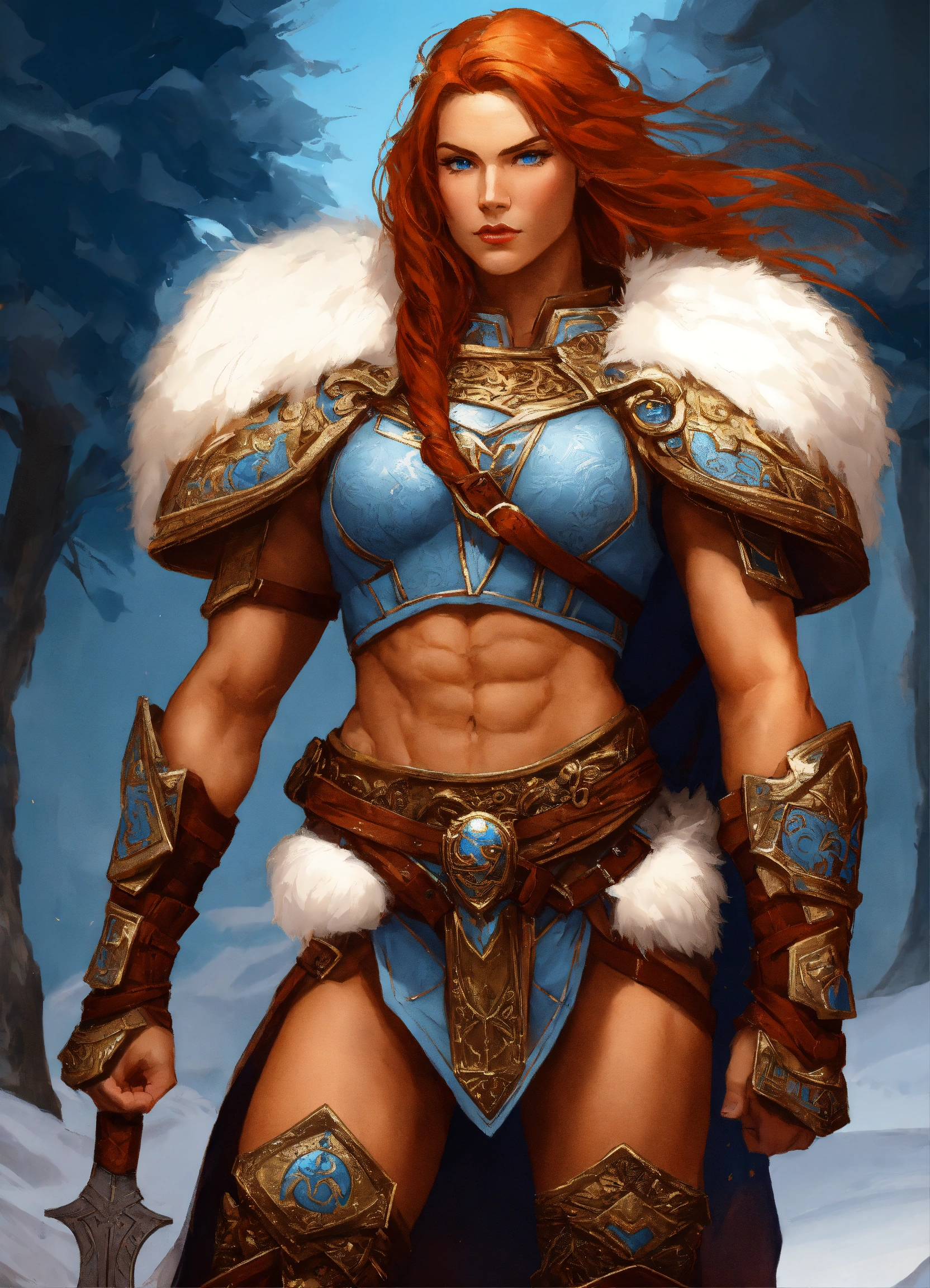 Fantasy art, muscular norse goddess, strong, buff, tall, bulky shoulders, muscular arms, muscular legs, handsome woman, female, red hair, blue eyes, portrait, white fur shoulder cloak and intricate runic armor, nordic chieftess, giantess, very muscular, artist john blanche style art, john blanche warhammer art style, big shoulder pauldrons, intricate nordic runes on a golden gauntlet.