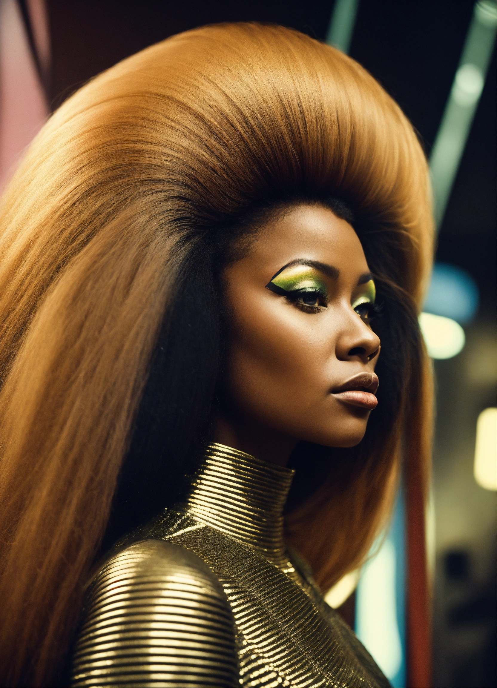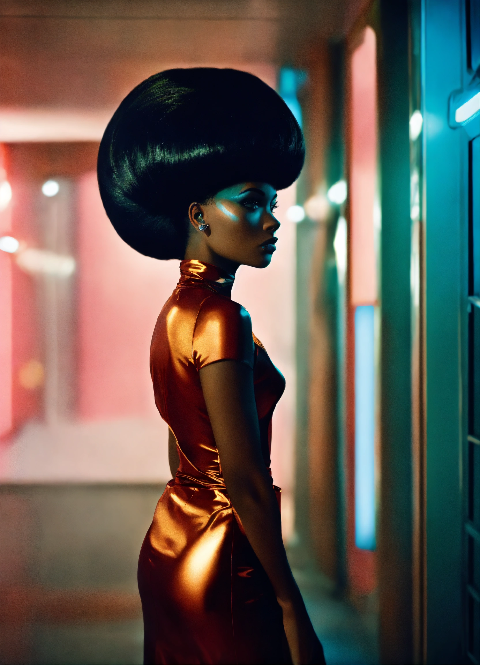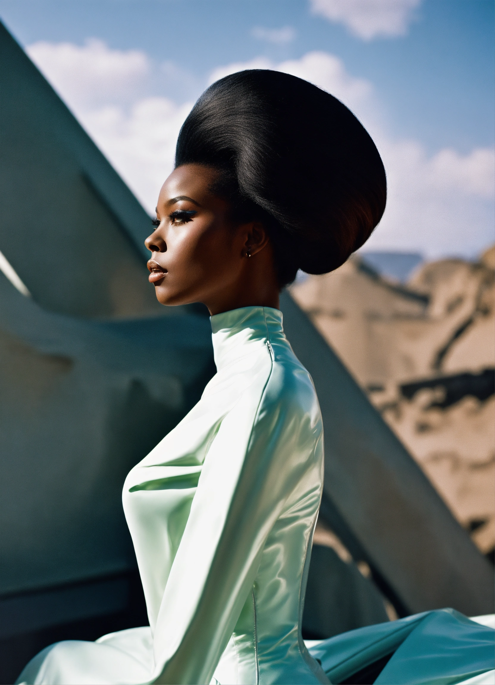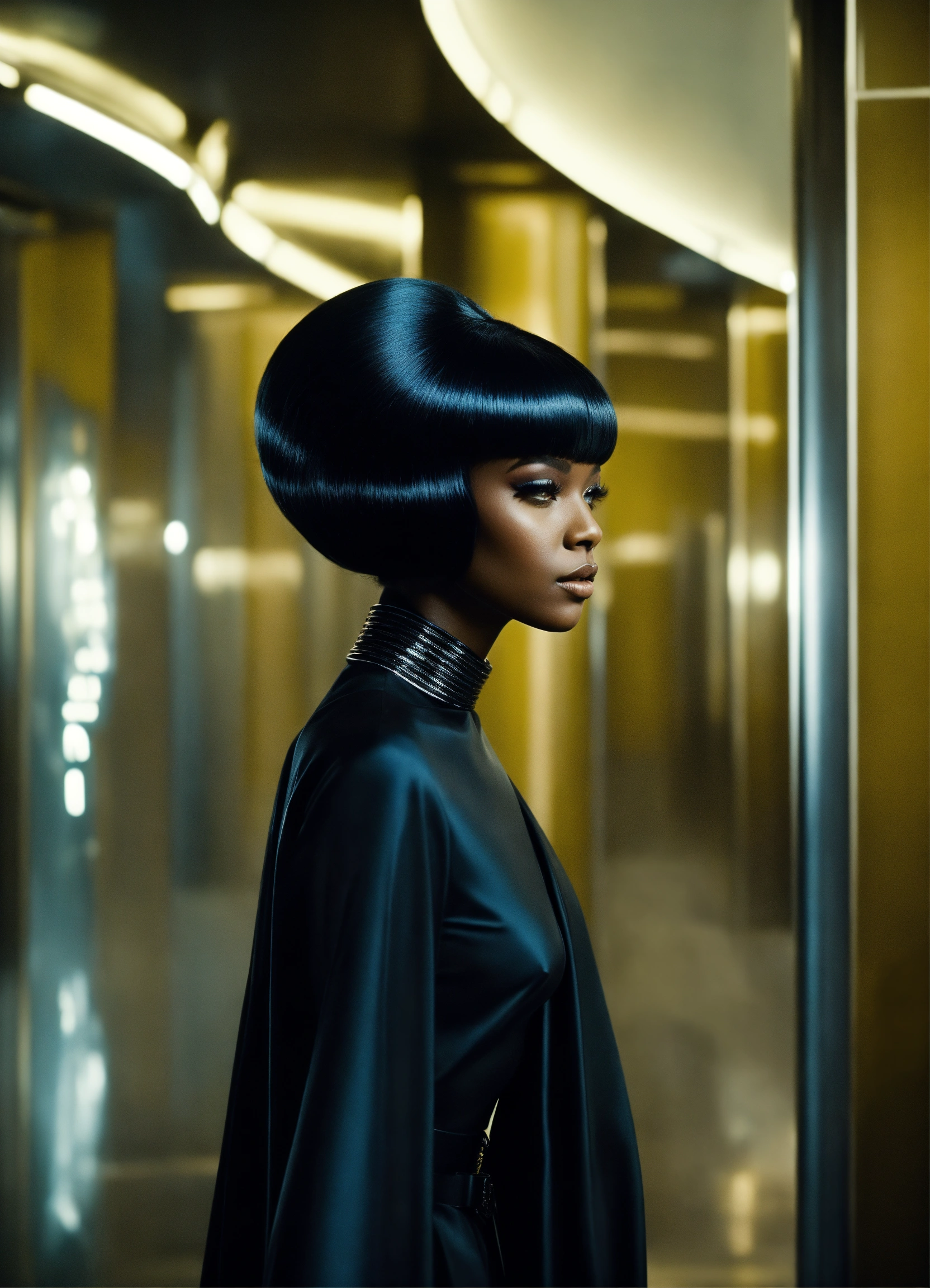 Scene retro future movie from the 1960s sci fi film, black woman, futuristic fashion avant-garde couture photography, sleek oversized flowing hair, minimalism