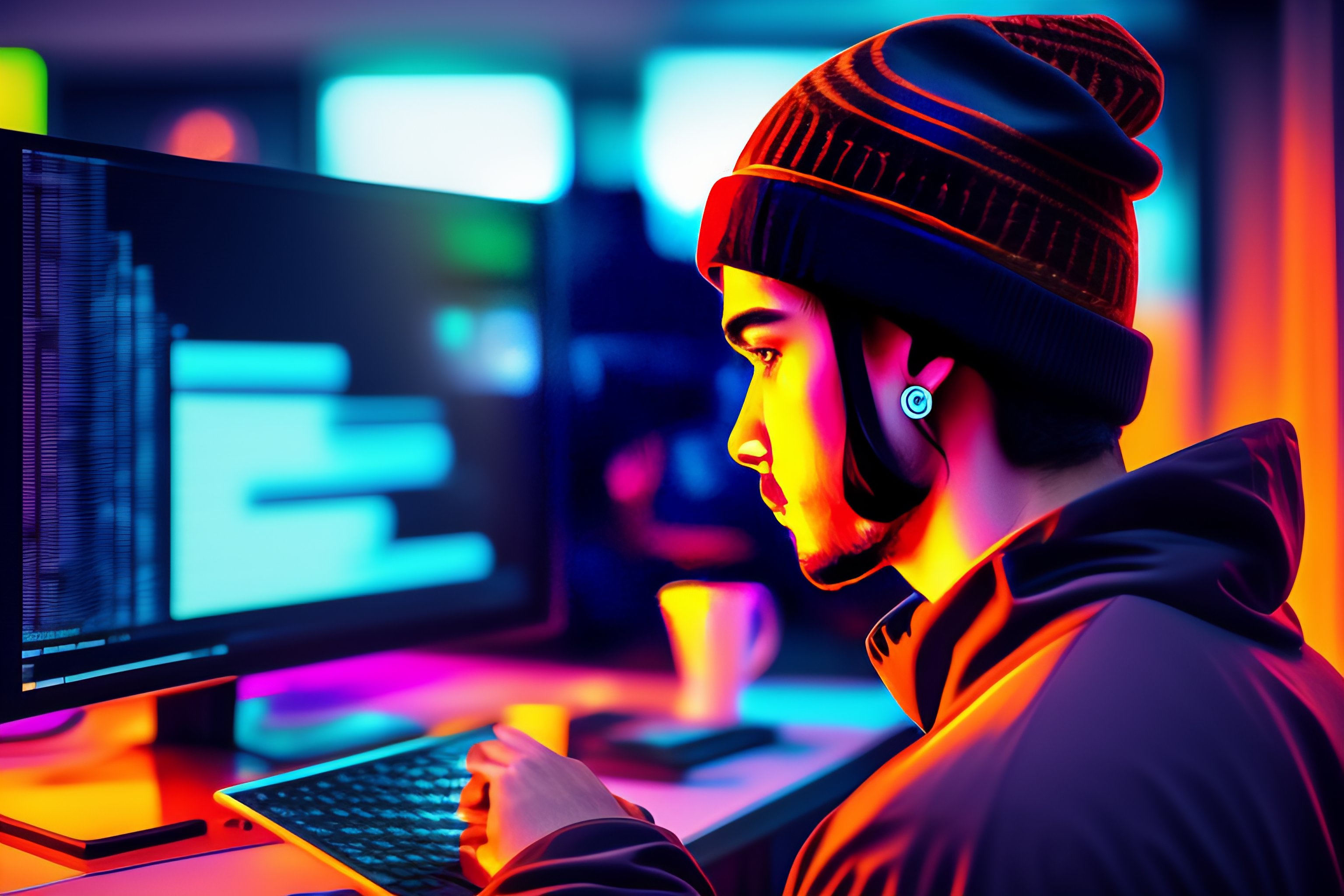 Male master programmer artist architect working on the laptop and screens, back facing, wearing beanie, techno cyberpunk futuristic, colorful background, concept art, digital painting, fantasy, photo realism, cinematic lighting, insane details, intricate, --v 4 --ar 3:2