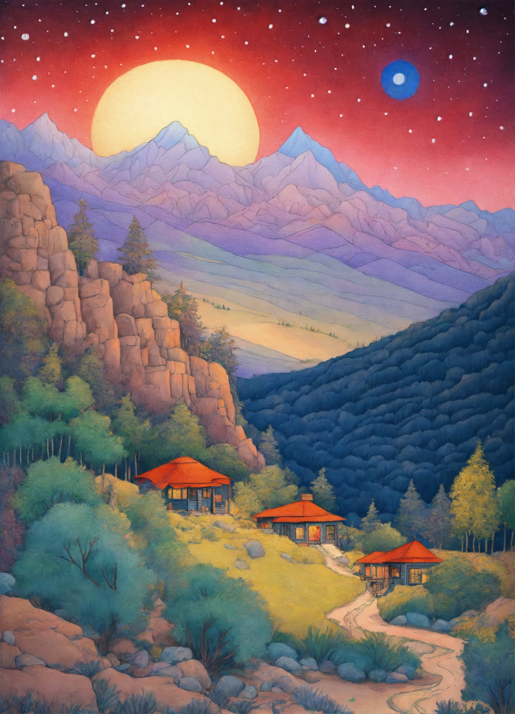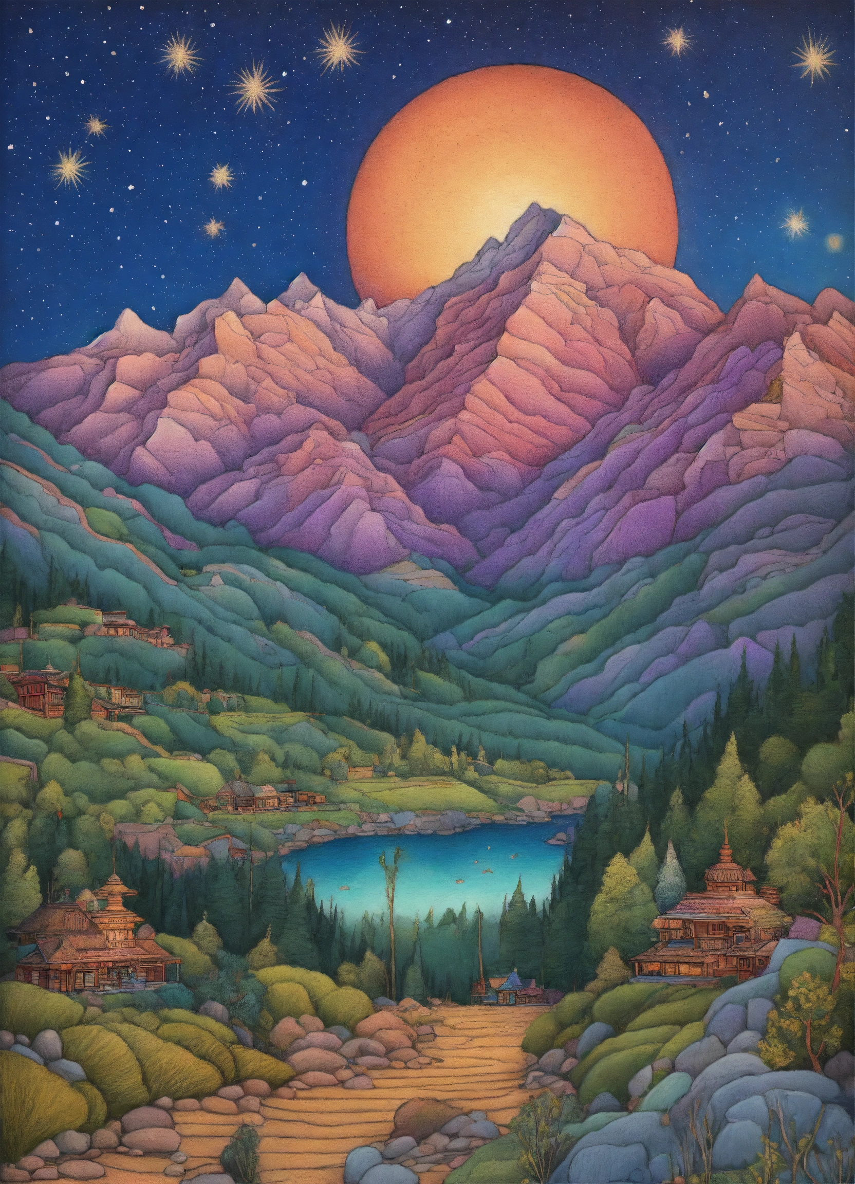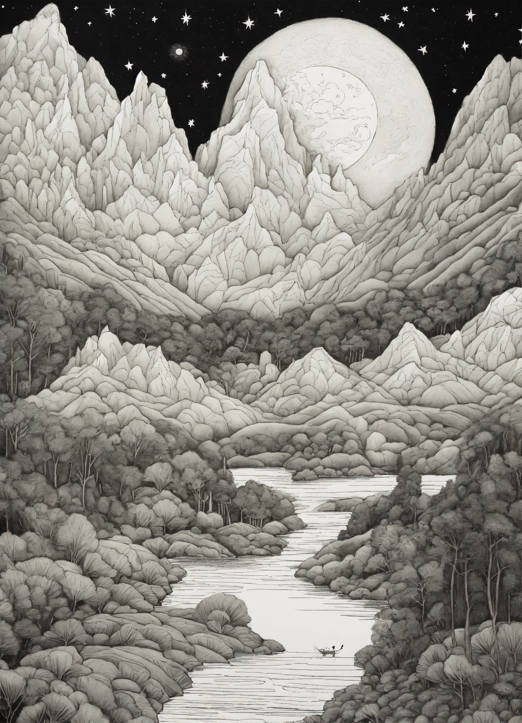Indian drawing a night in the mountains on a starry night. line drawing, clean clear lines, coloring book style, bright colors, intricate details, elegant, discreete, serene, peaceful, fine detail, pastel pencils, winsor mccay style.
