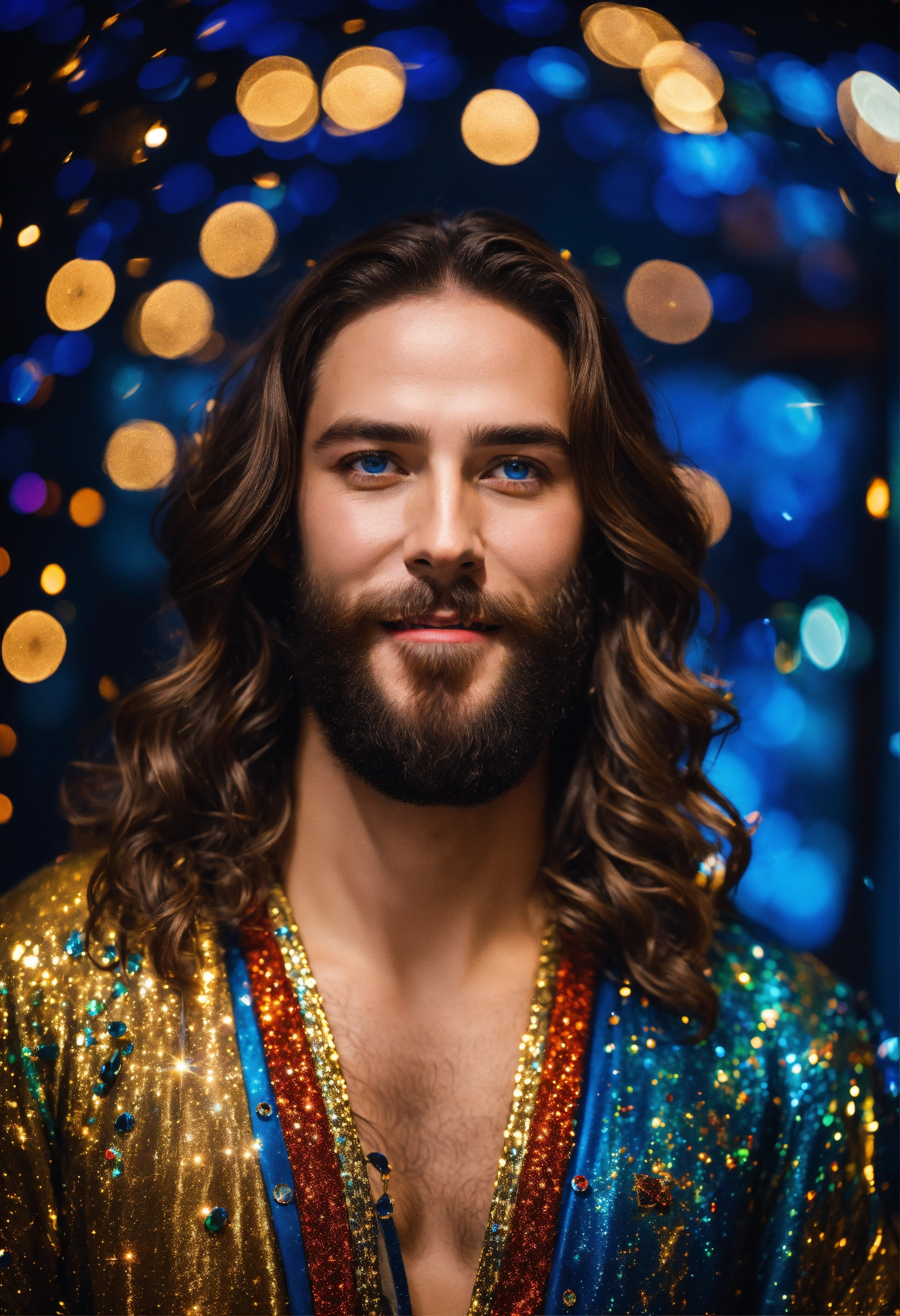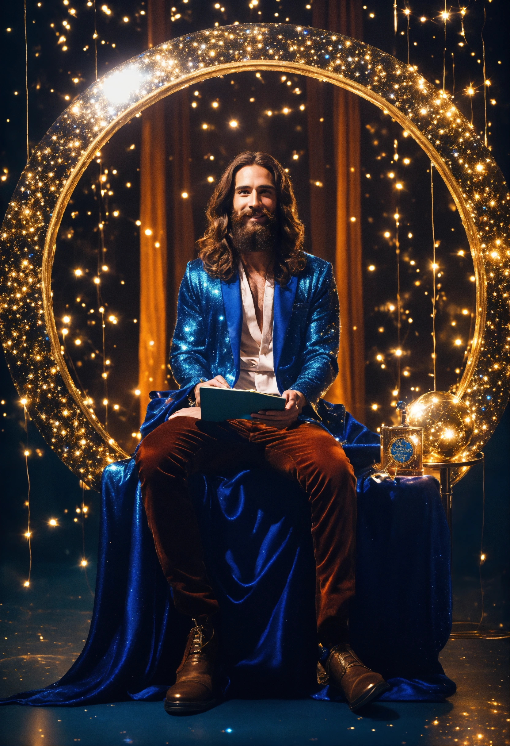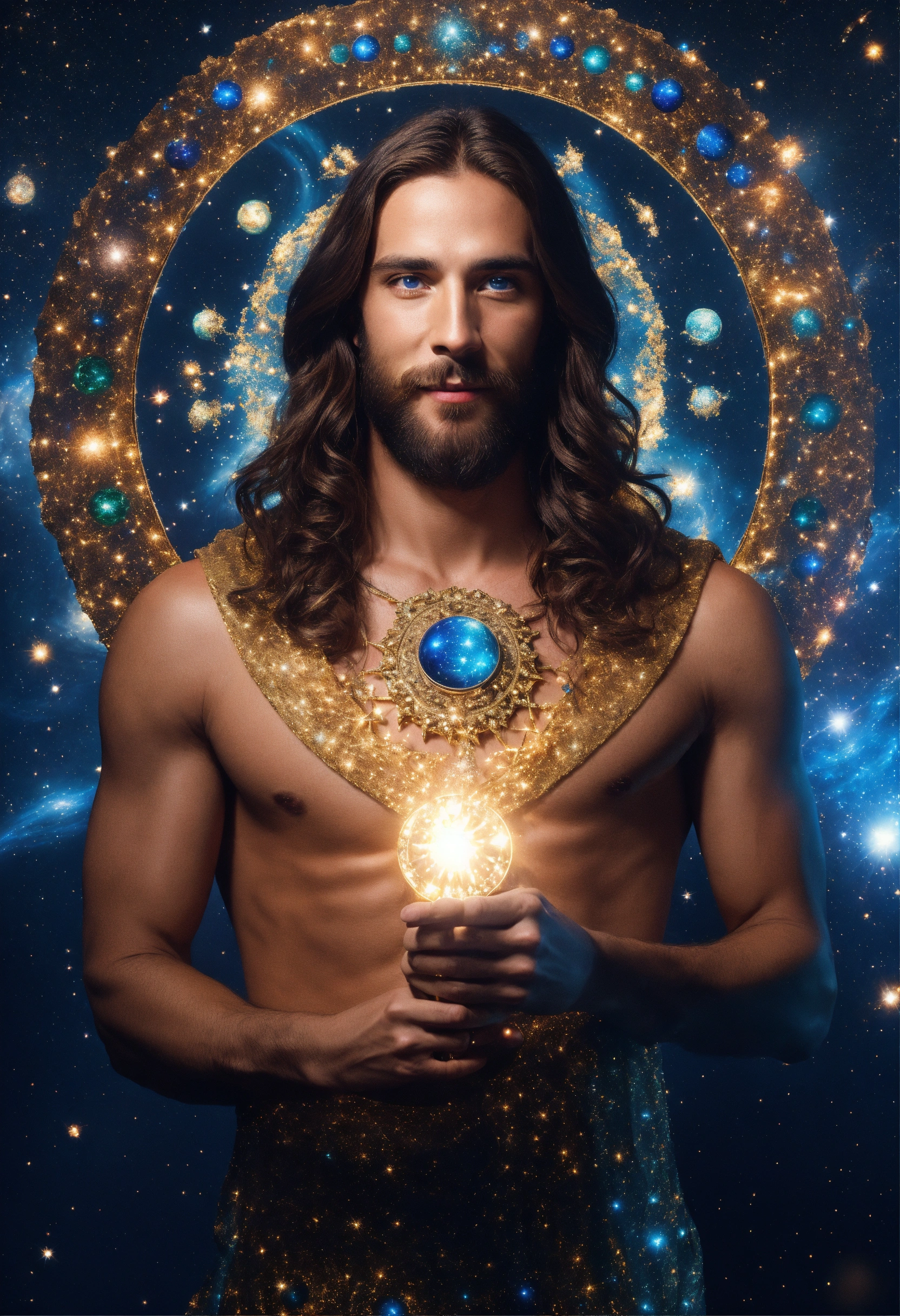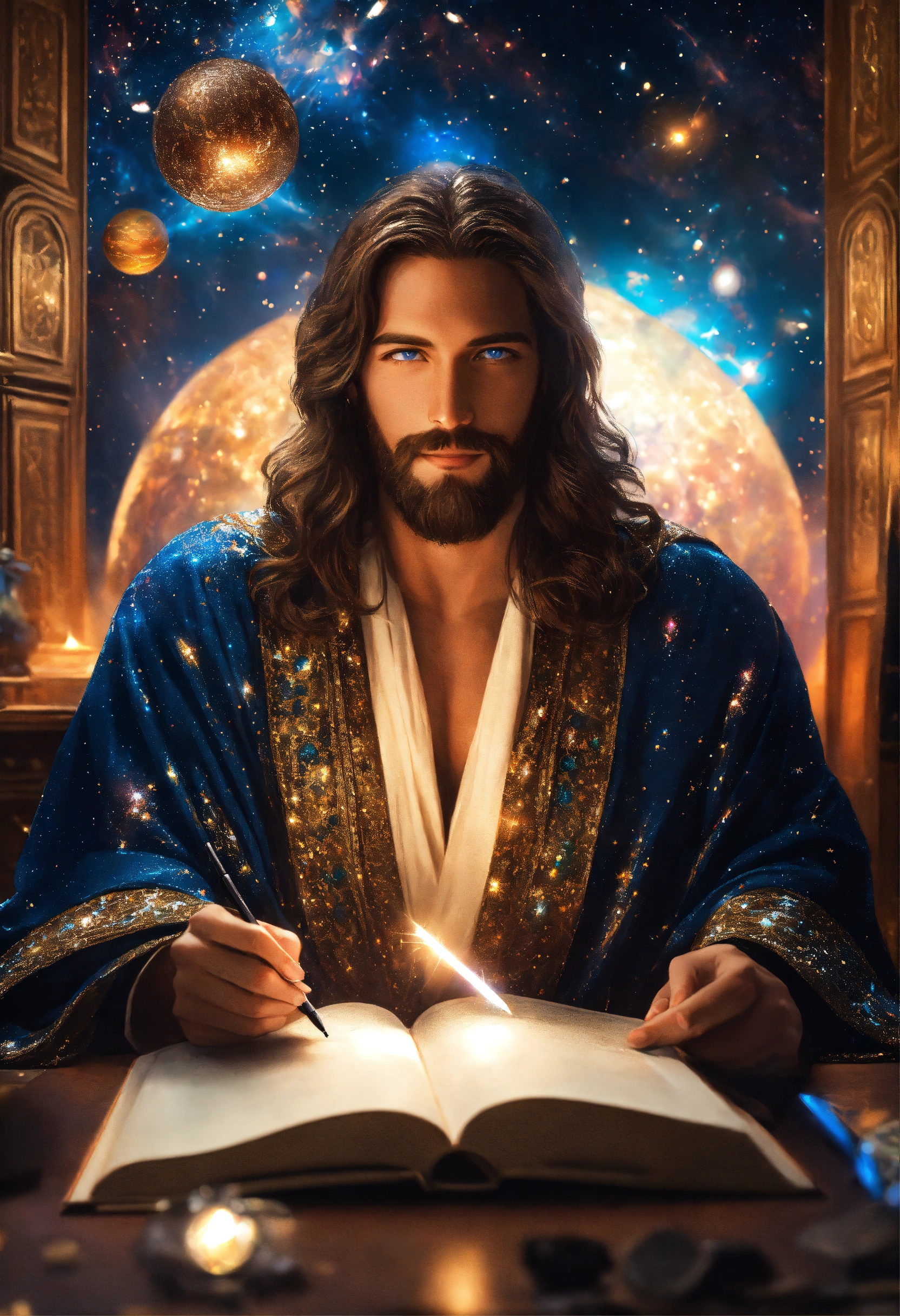 3/4 stunningly handsome supermodel 30-year-old jesus christ gentle happy smile, long brown hair and full beard, bright blue eyes, writing a book at a desk, sparkles and magic everywhere, ultra hd! surrealistic! wearing cosmic sparkling galaxy robes, chest covered, fashion photoshoot, background is beautiful sparkling orbs in outerspace, editorial magazine, sharp details, symmetrical, joyful, overly dramatic, theatrical lighting