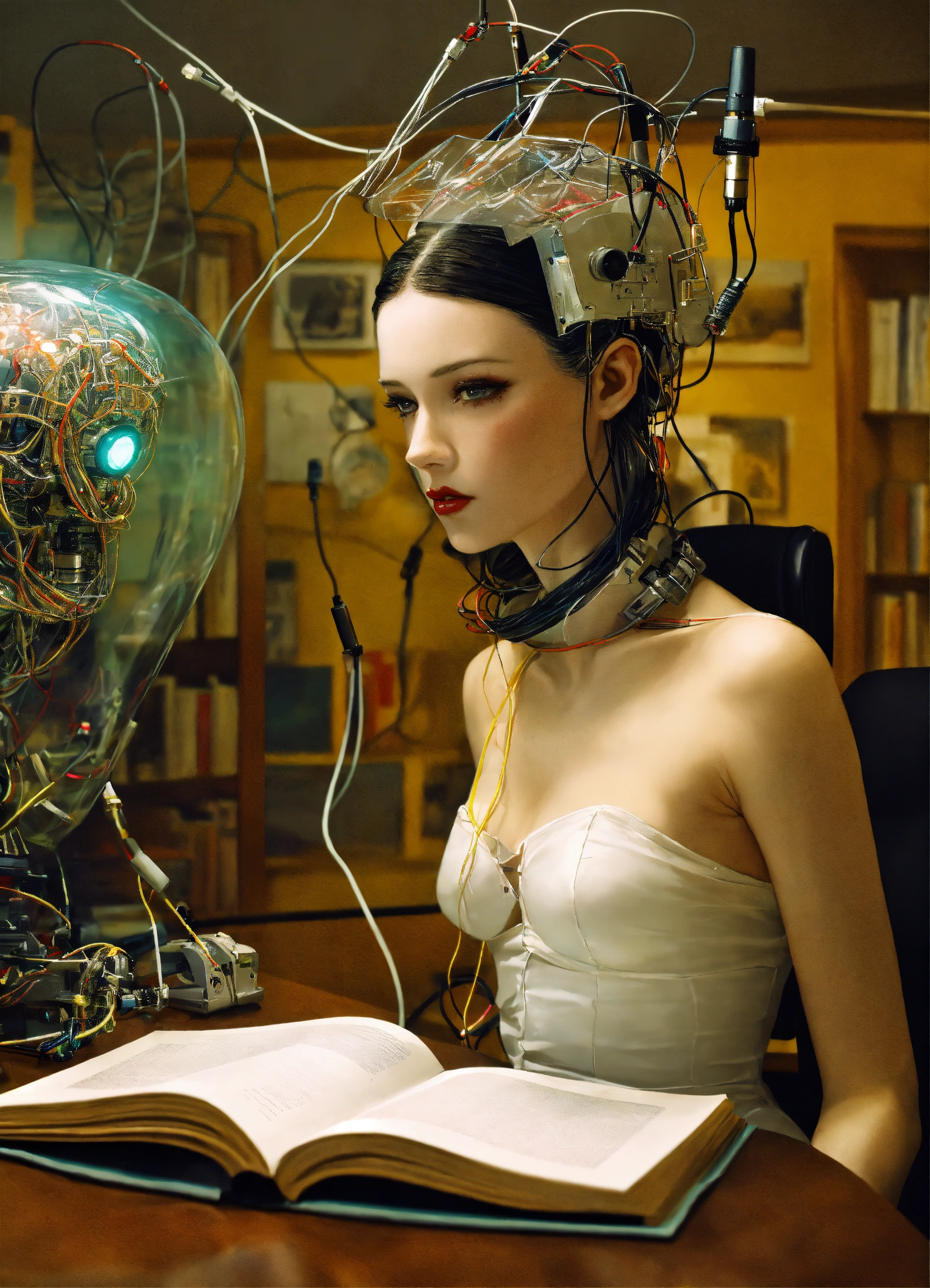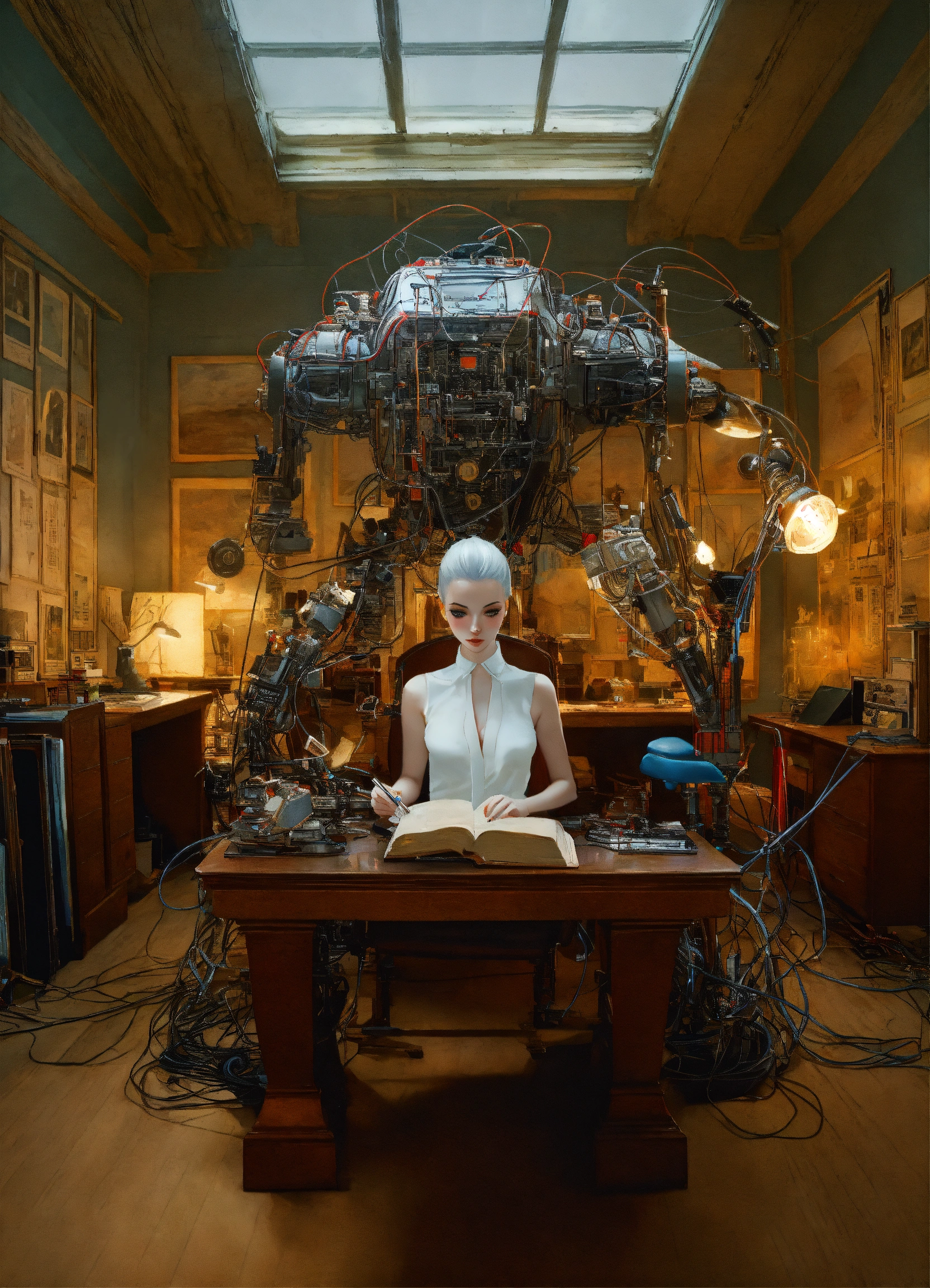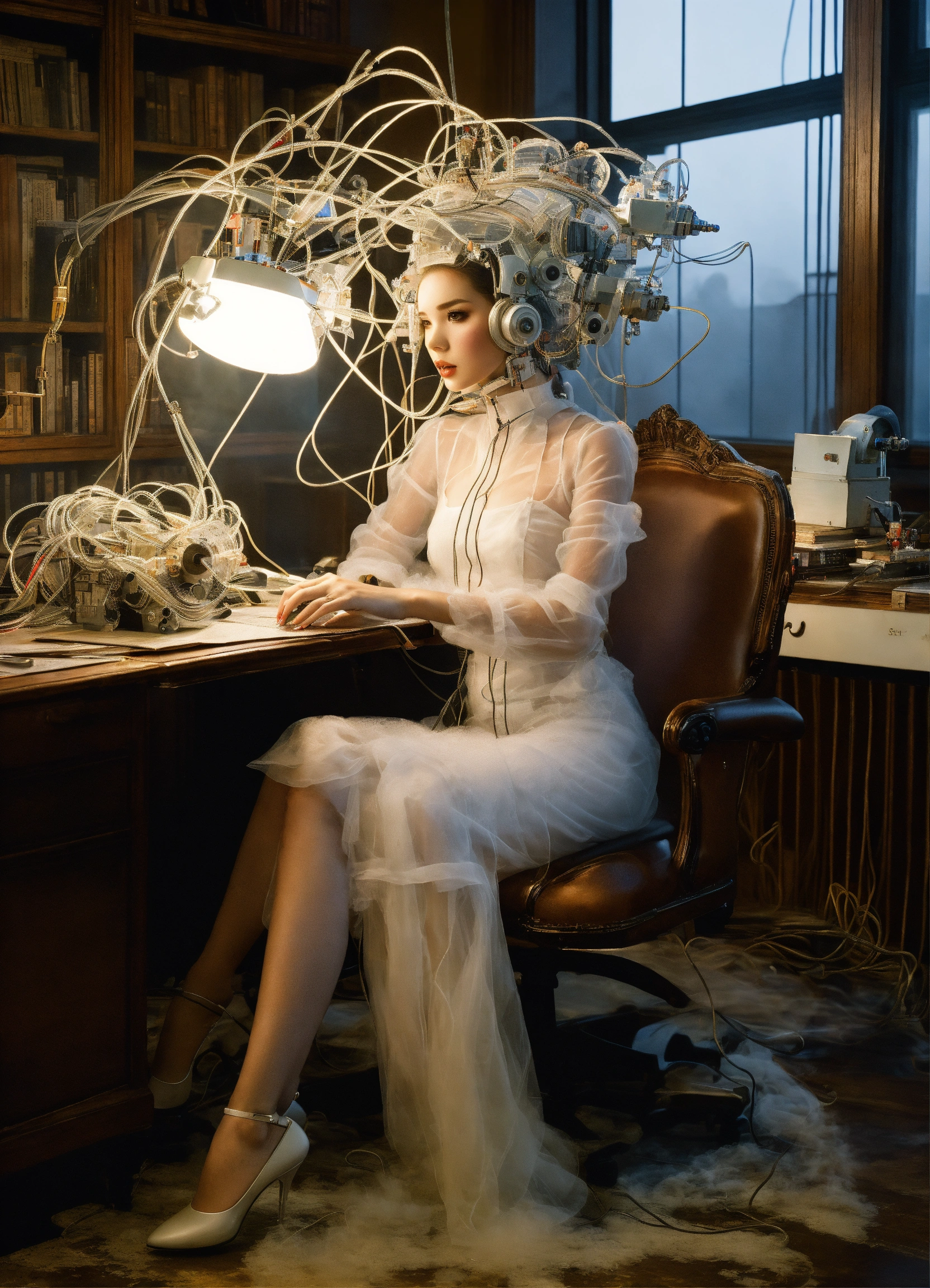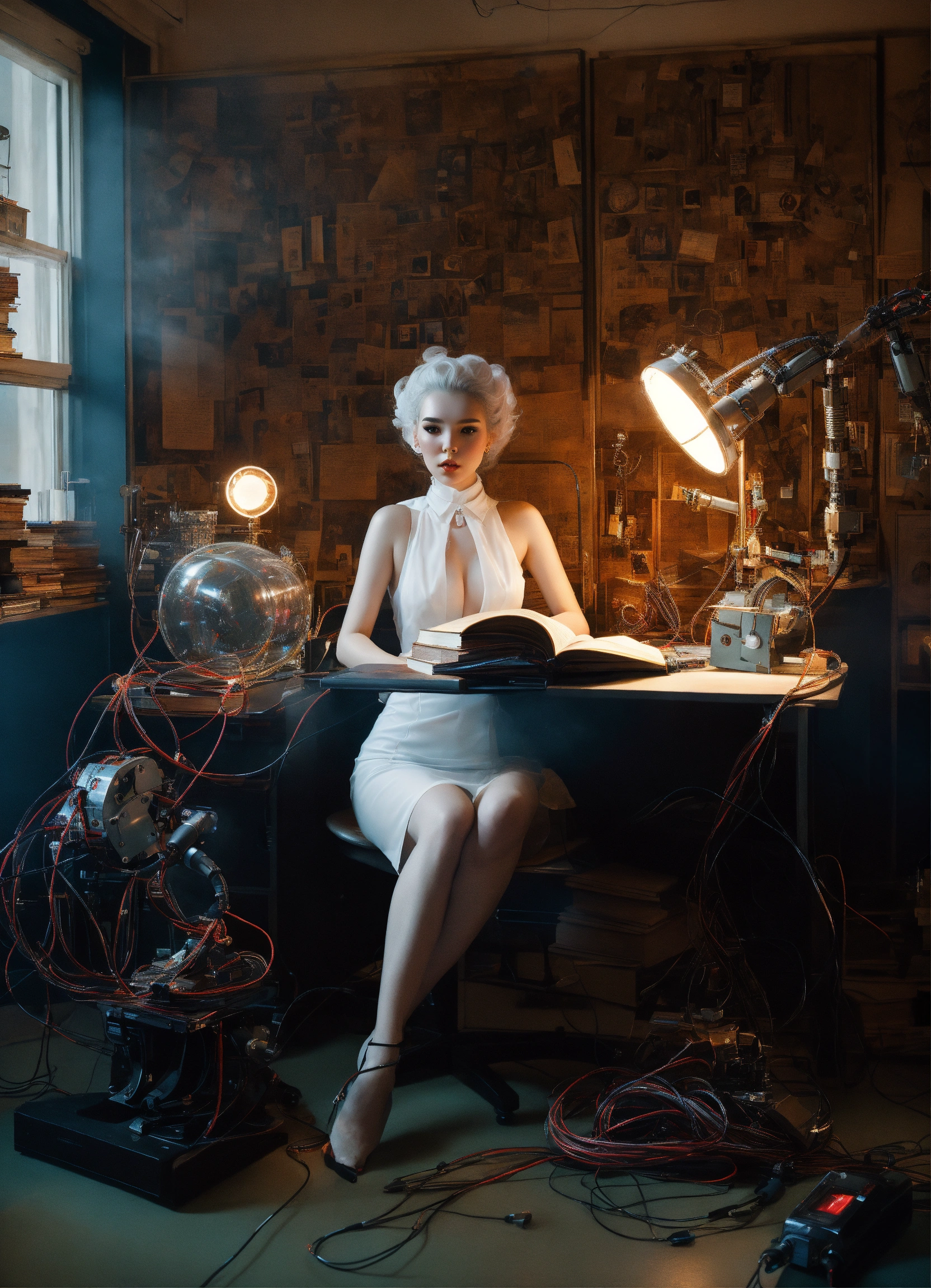 Body portrait photography, in a smoke-filled office full of cables and wires and led, driving a carbon motor head attractive transparent white plexiglass secretary robots read an ancient book at her desk, 80 degree view, art by sergio lopez, natalie shau, james jean and salvador dali