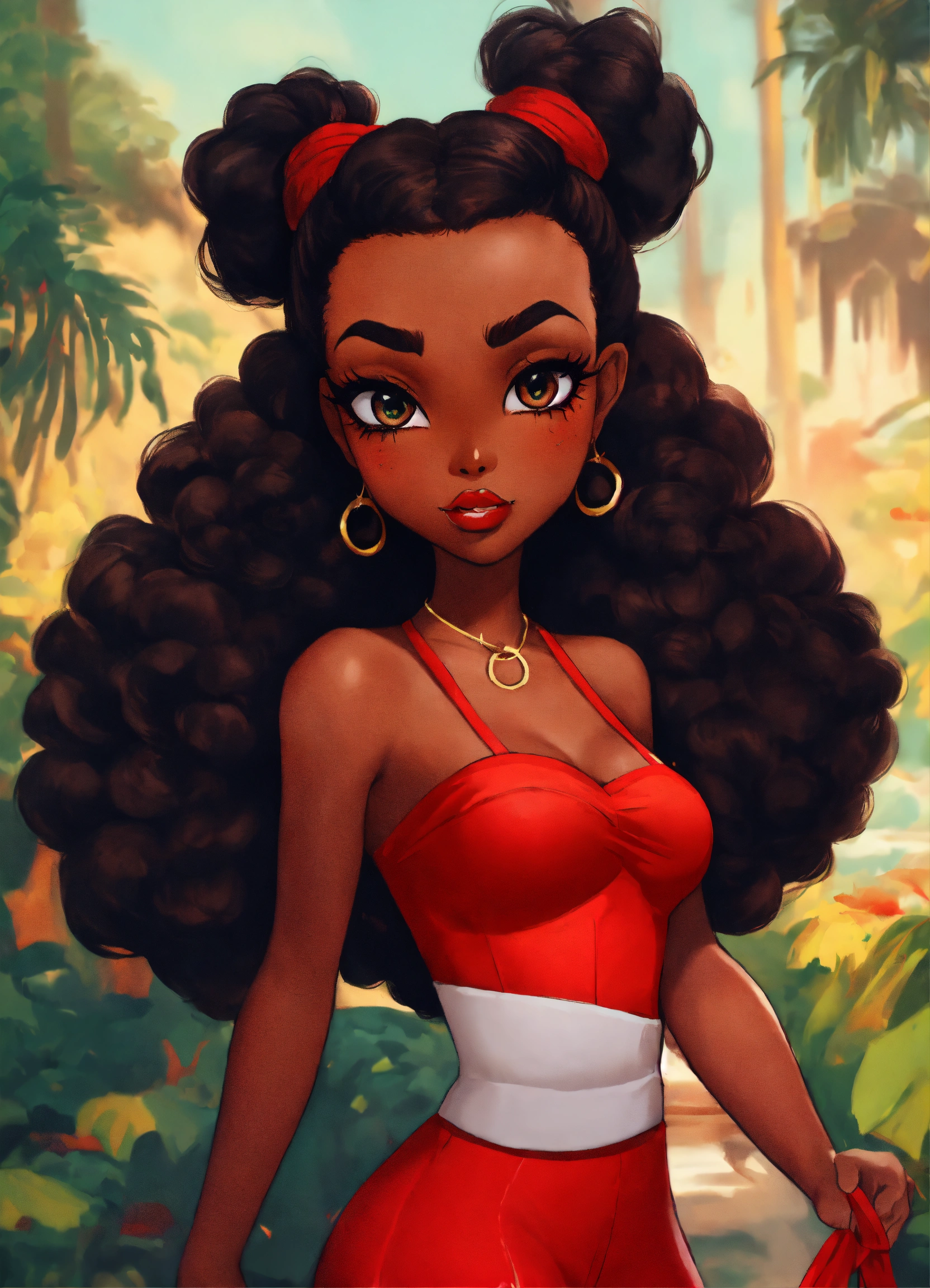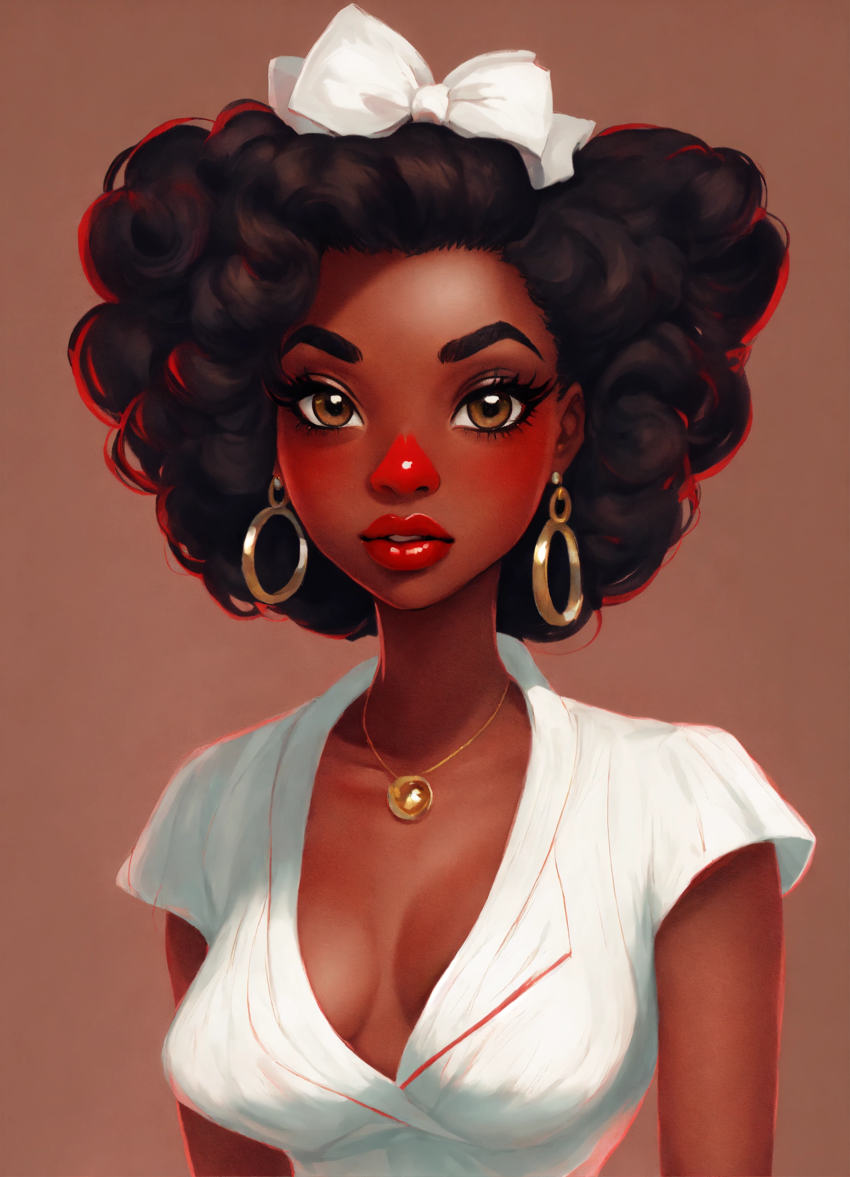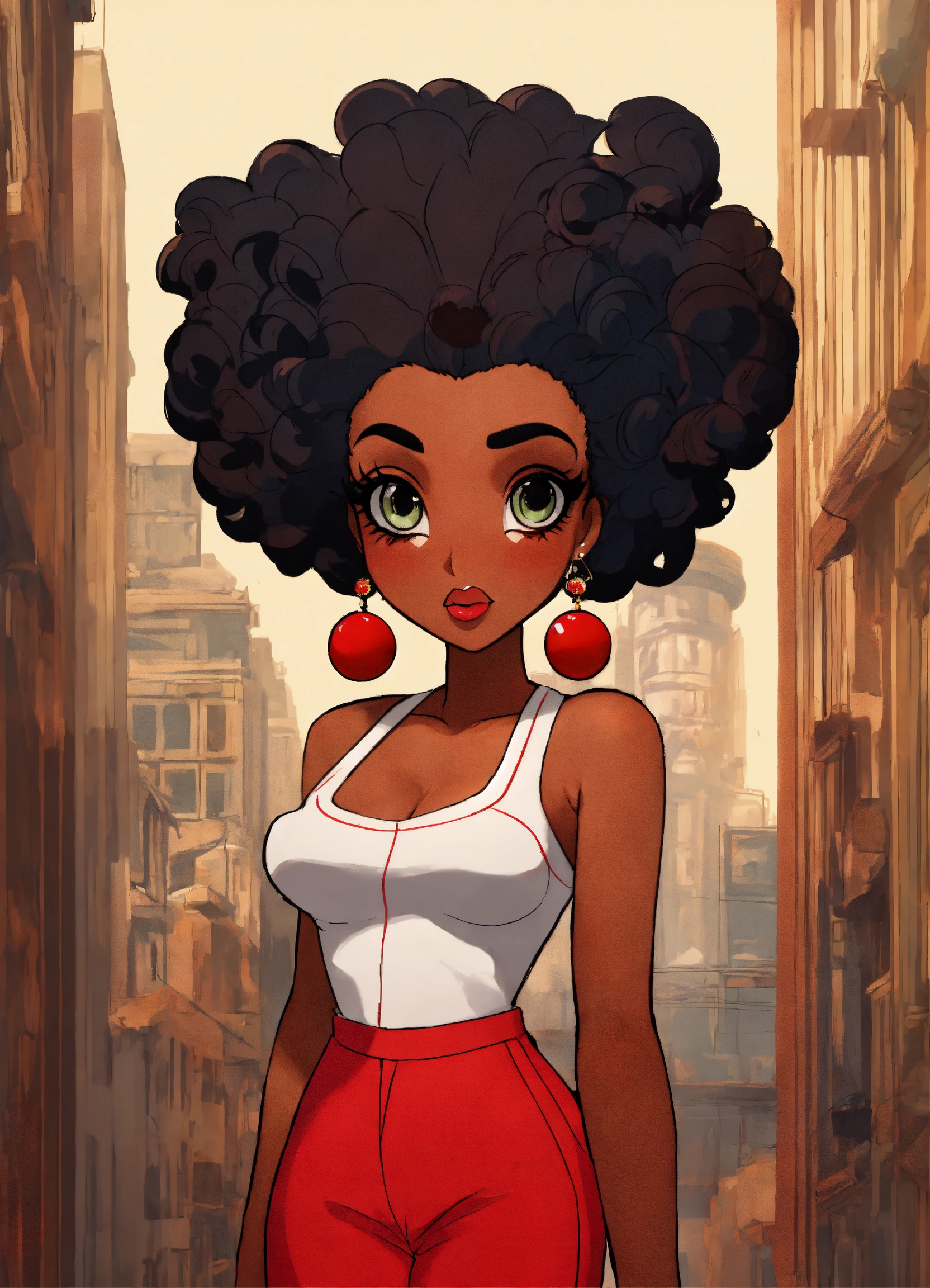 Create a stern powerpuff girl meets betty boop inspired black female character in white with oversized red flowing yarn hair and big gorgeous eyes, retro 1940’s anime