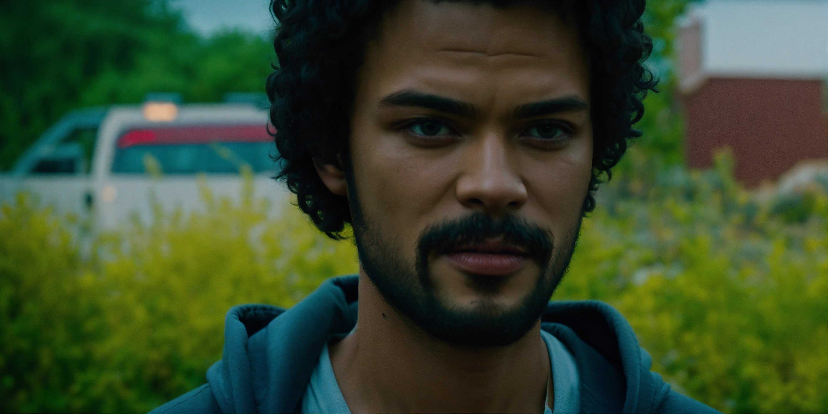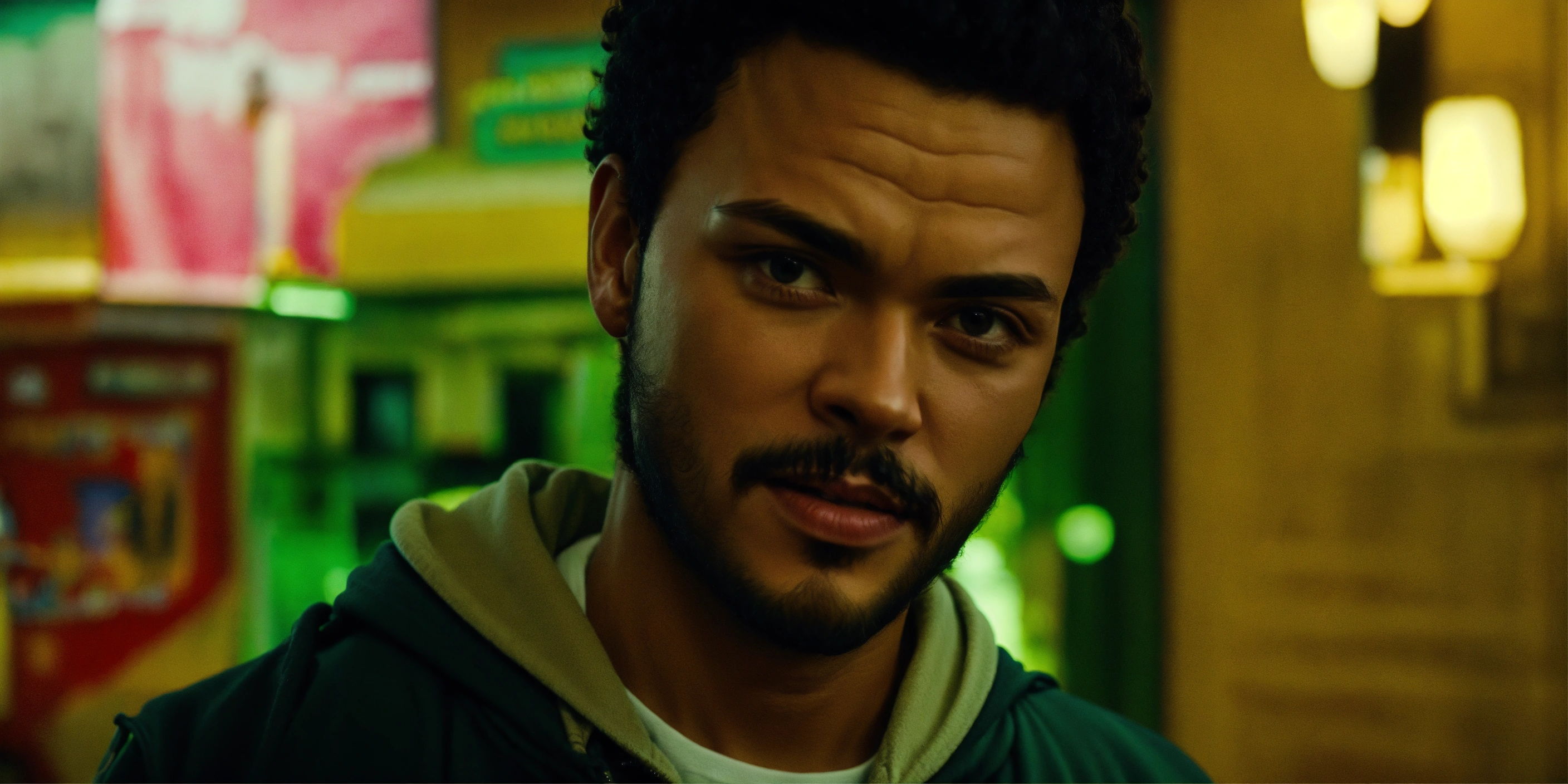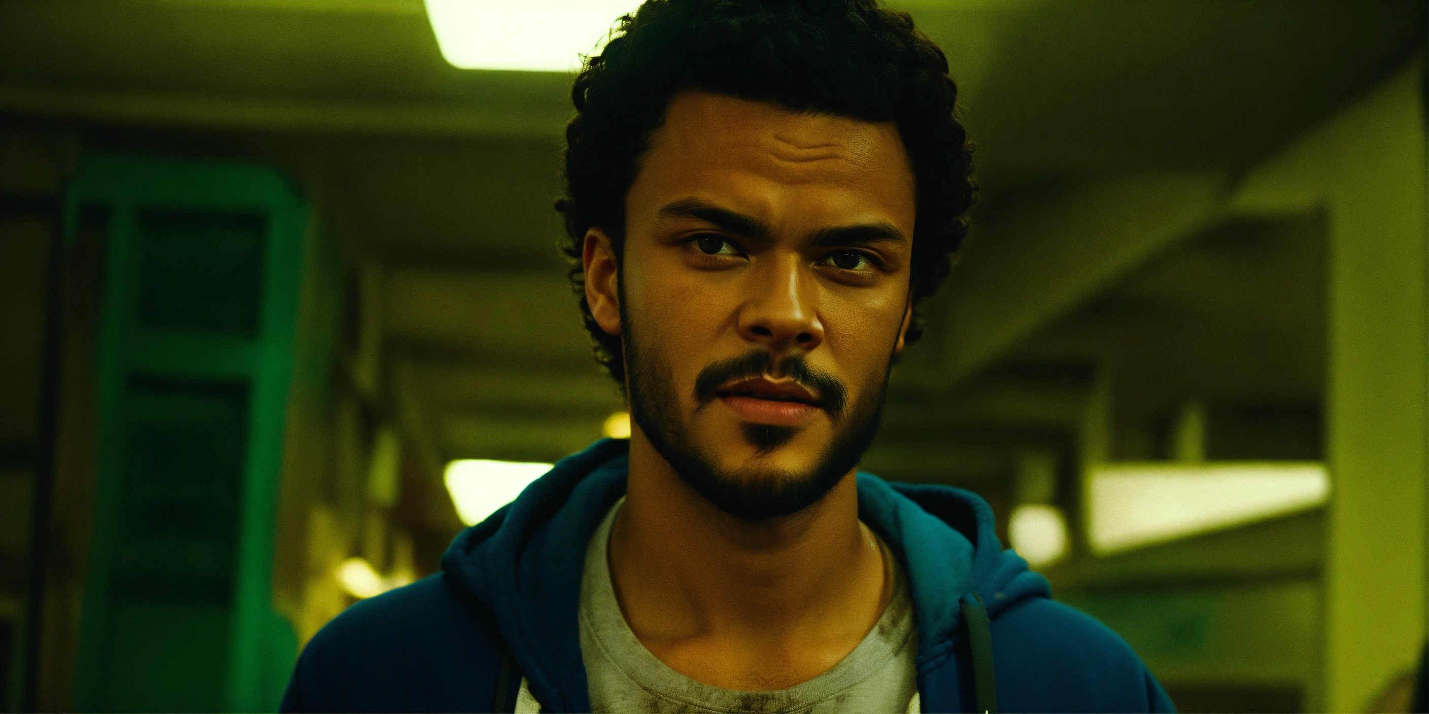 Handsome nice eka darville, zombie-infested city, dark, cinematic, stranger things style, short hair, short temples, soft smile, hoodie