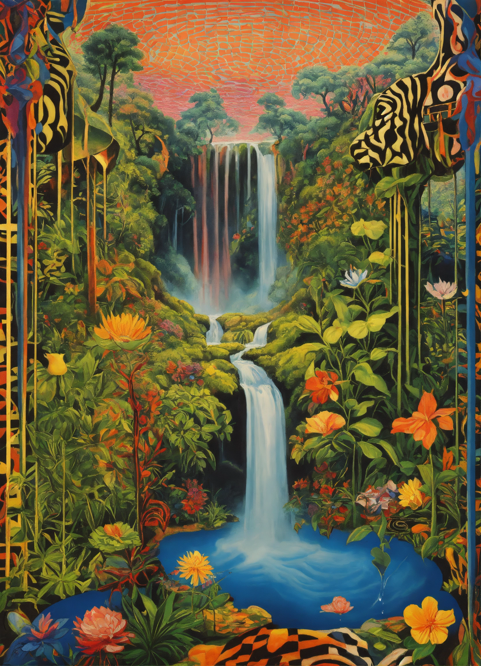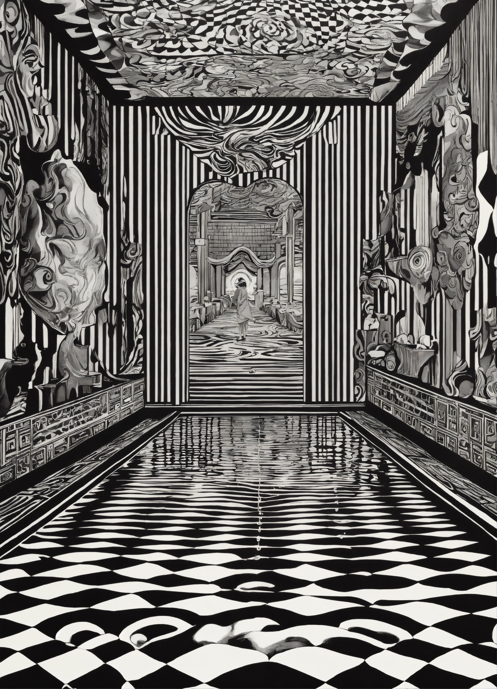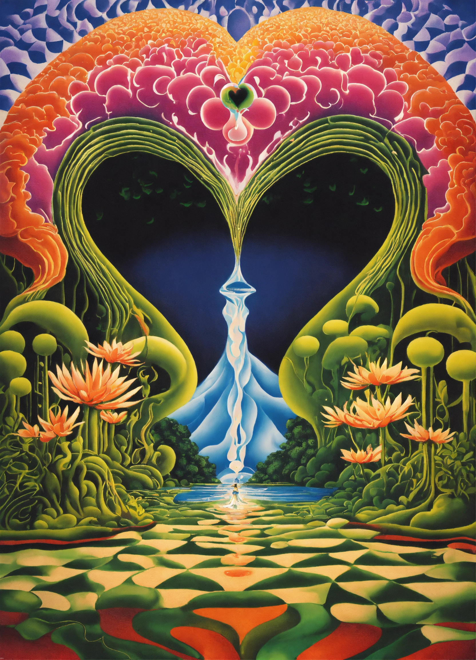 Janpanse groovy retro poster, human body containing god merging with love heart melting merging with oriental the most beautiful cosmos, himan body containing abstract psychedelic vortex by picasso, human body containing symmetrical grid patterns, psychedelic mount melting eyeball merging into dripping love-heart by coogi pattern mount, 5d outline, wavy dream dimension, chevron florescent geometrical clouds dripping, dense jungle melting into floor, black and white checkerboard patterns dripping by maurits cornelis escher