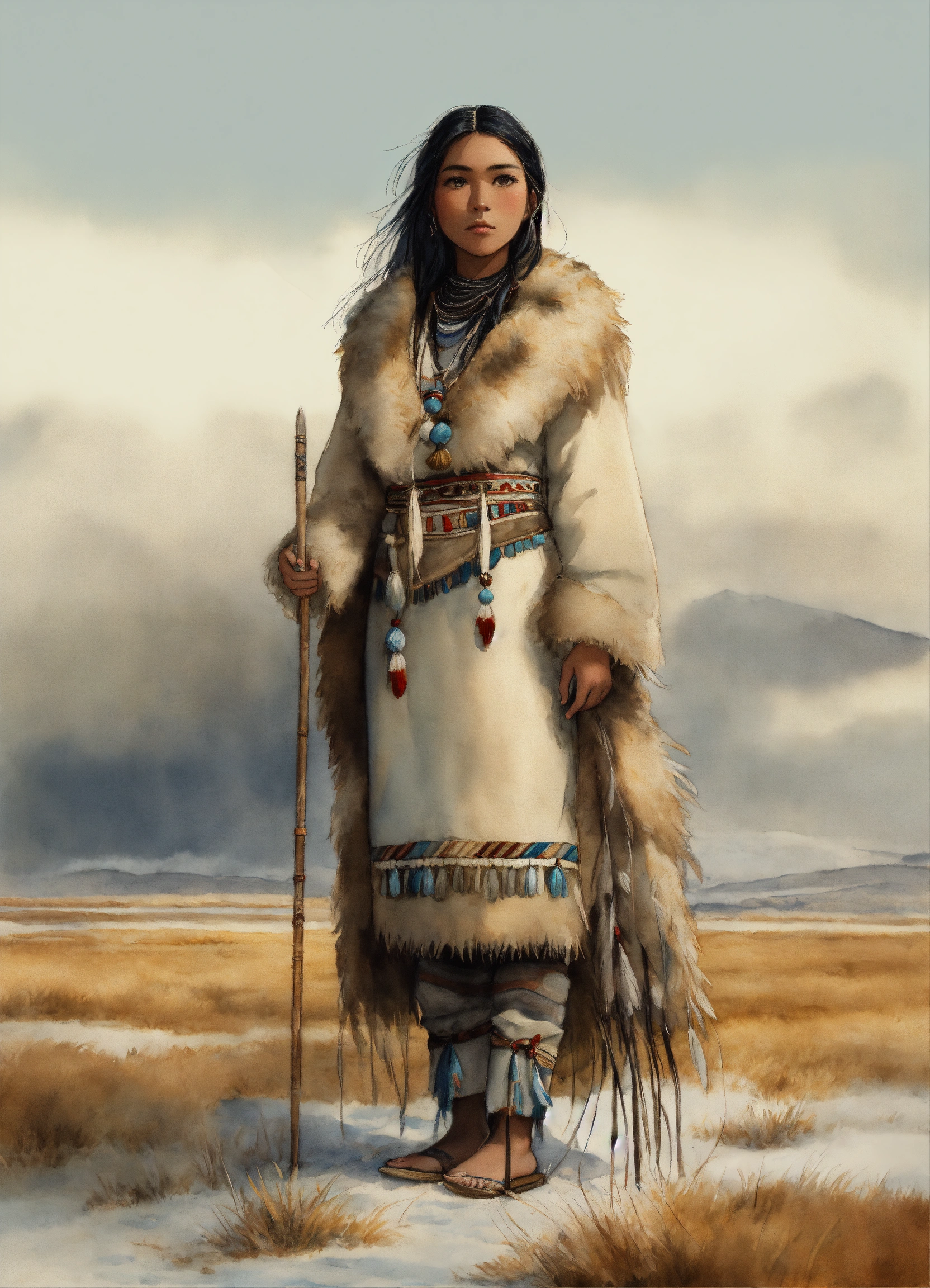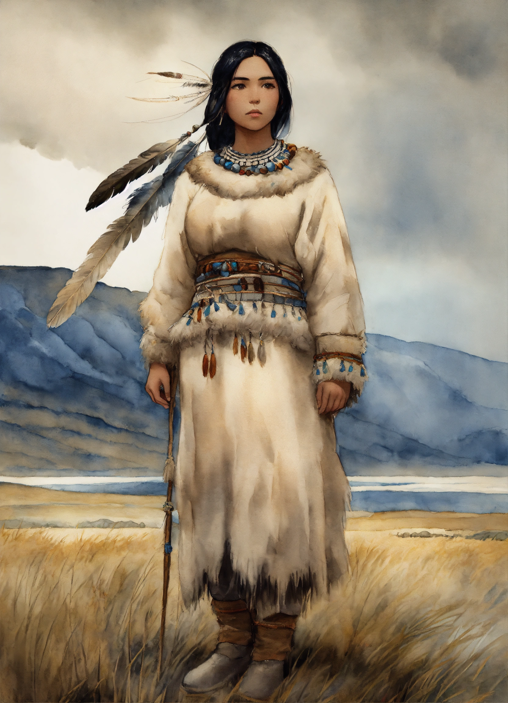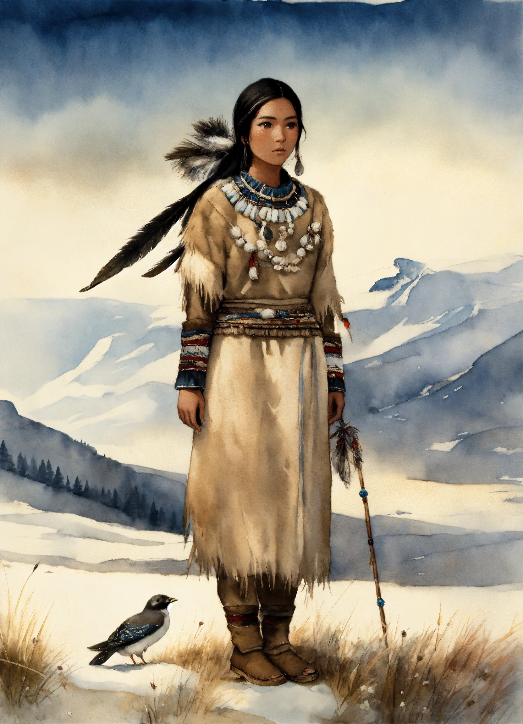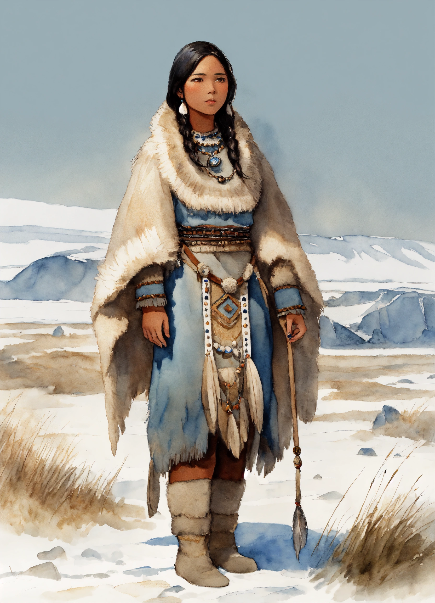 Full body illustration of an inuit woman, young, 18 years old, beautiful, native american phenotype, wearing stone age clothing made from natural fabrics like linen, cotton, or furs, adorned with feathers, beads and shells, stading on the steppe tundra landscape, watercolors, gloomy and depressing ambient, artwork by tom björklund