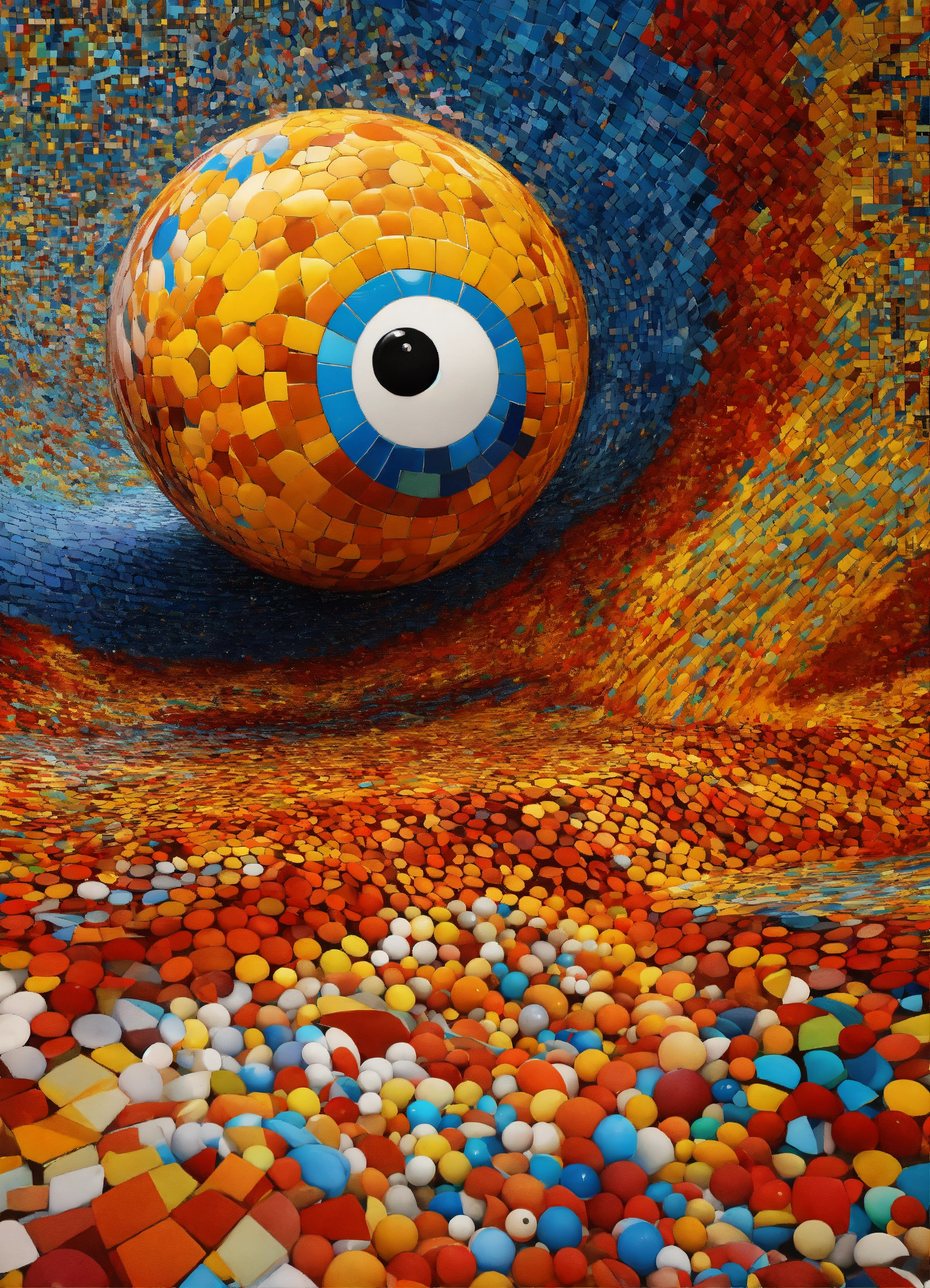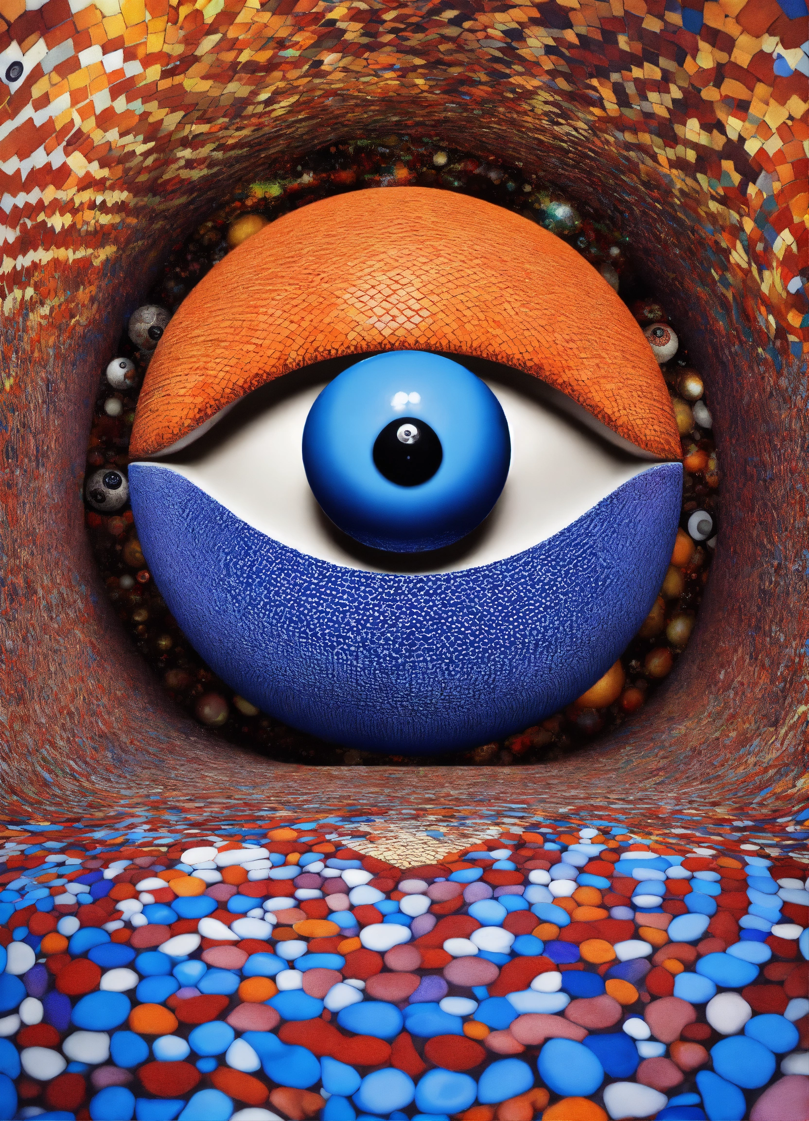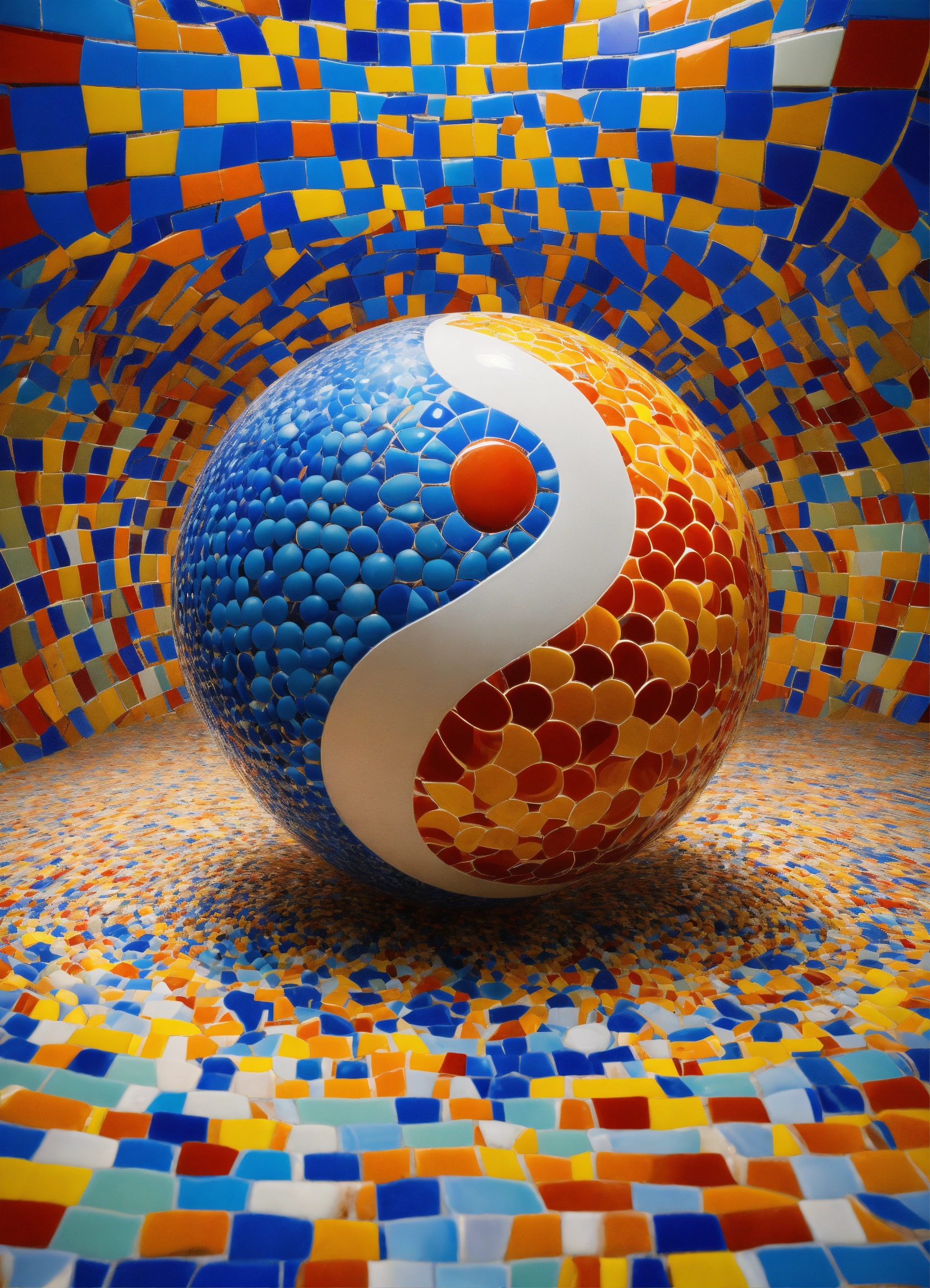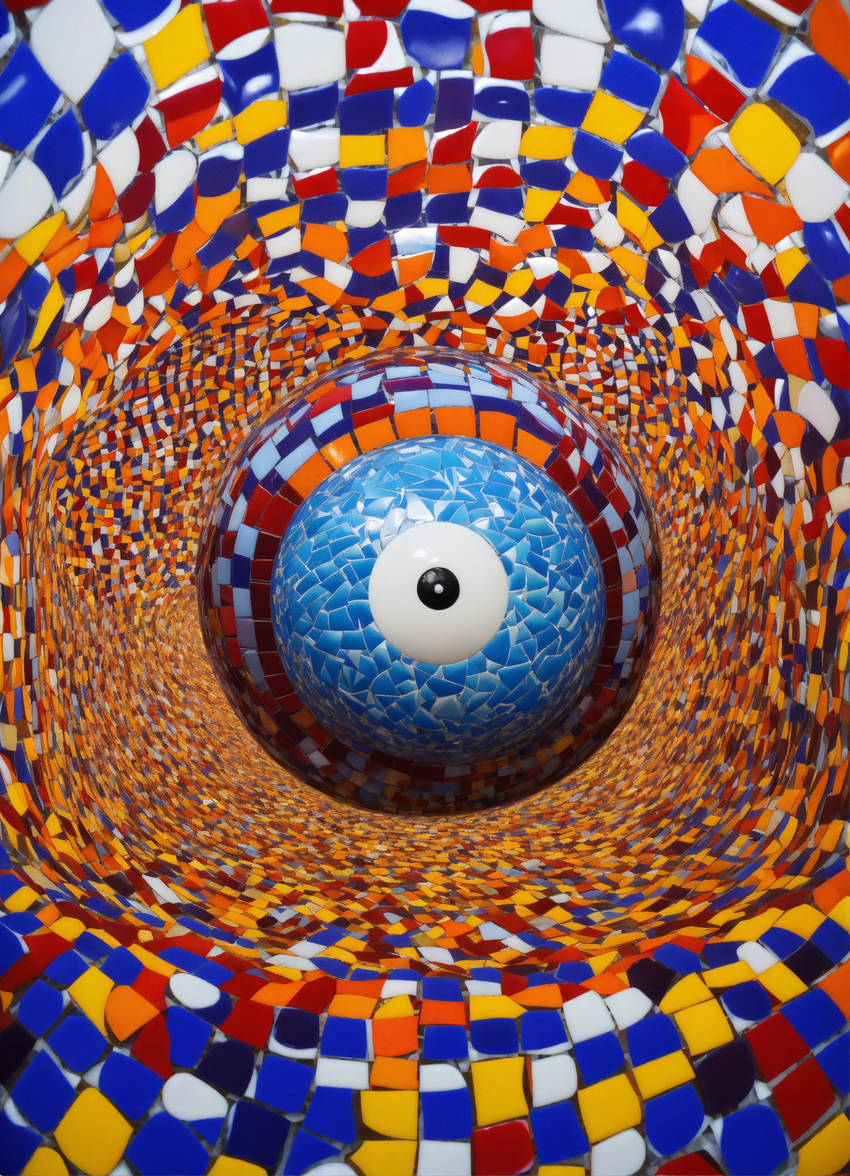 Japanese photograph, eye ball dimension merging with mosaic realm, wavy massive psychedelic dripping objects, ying yang, ball of energy, geometric shapes, chevron ying yang, wavy checkerboard tiles, by stephen alcron