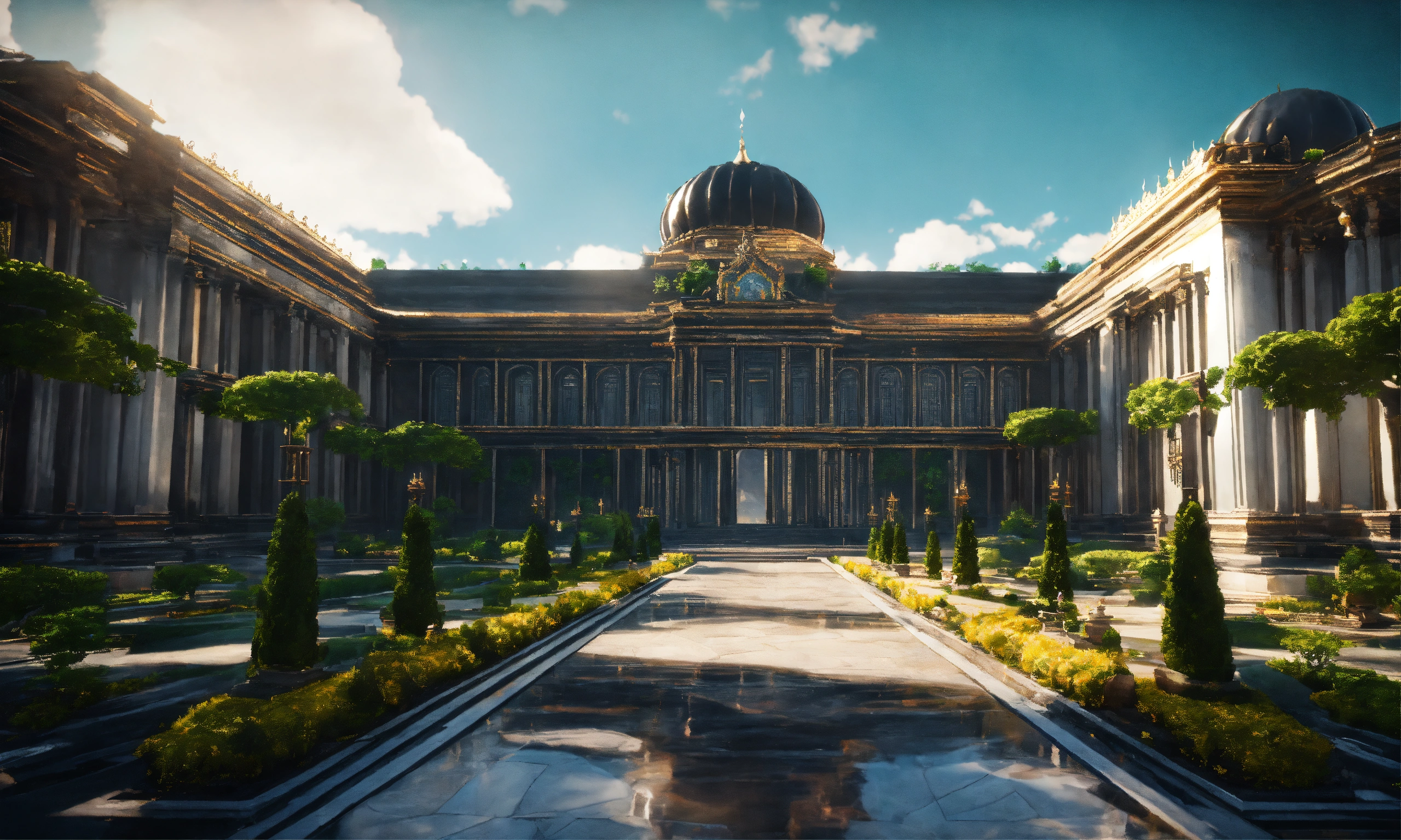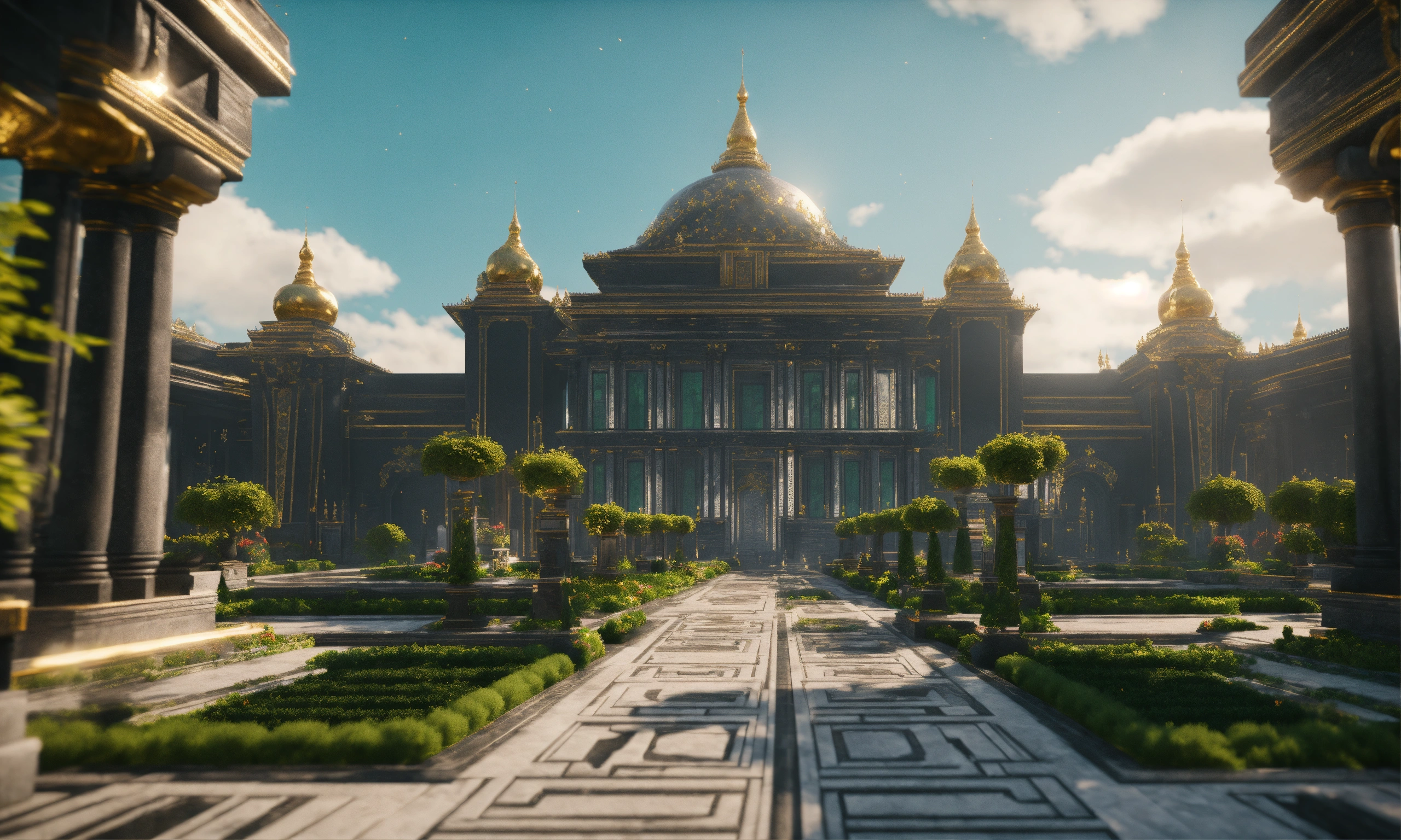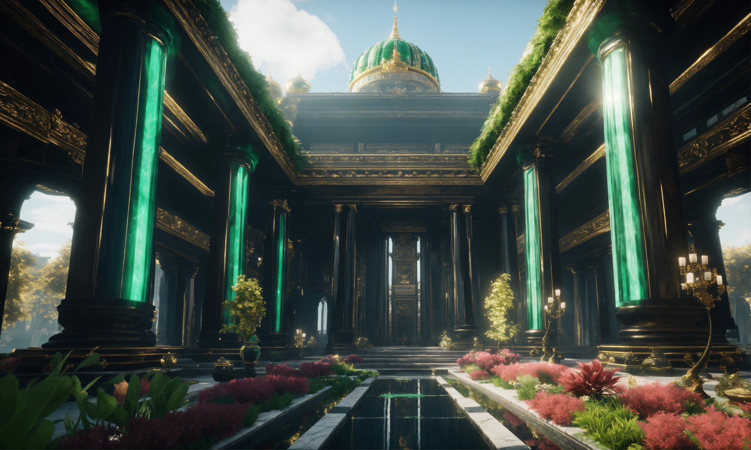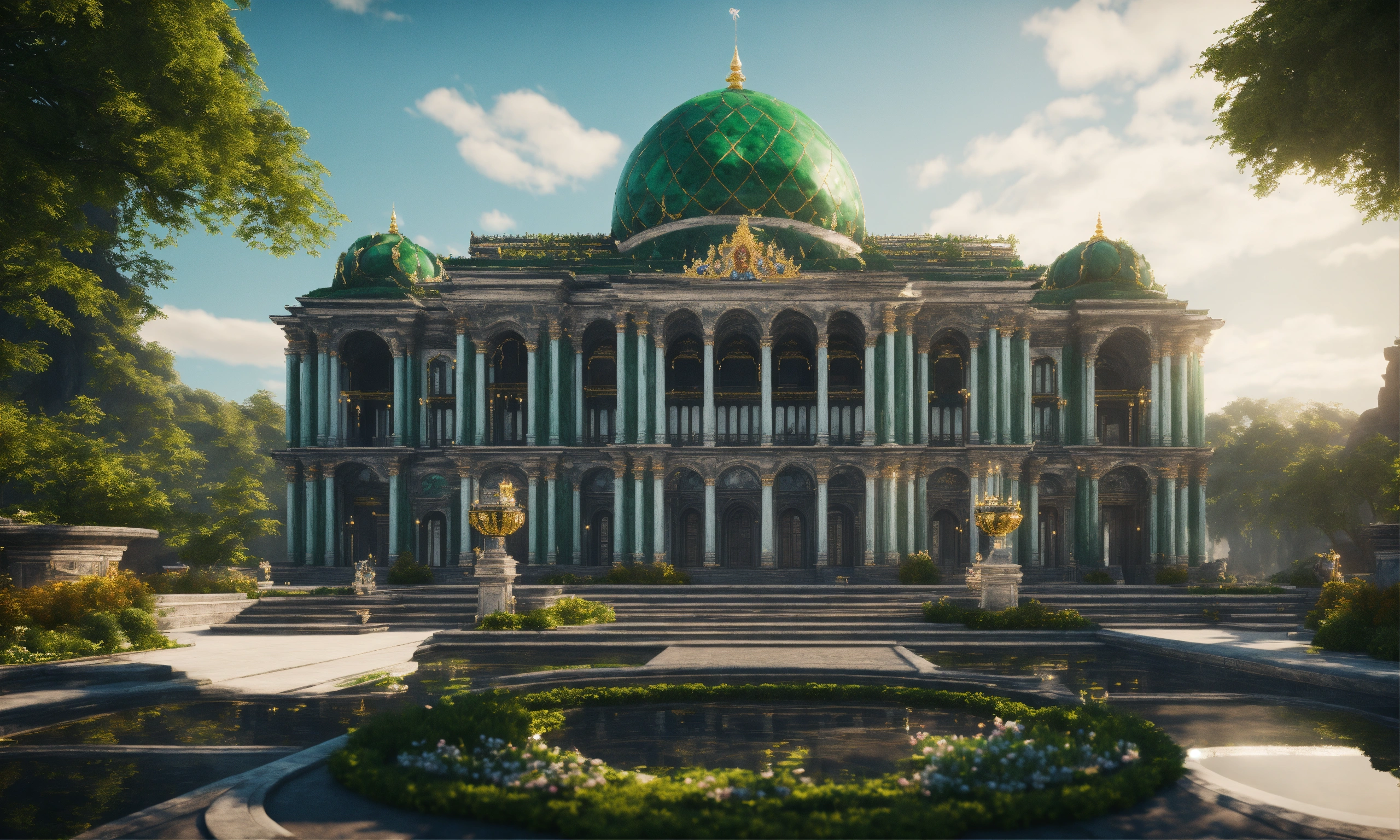 A massive black marble and jade royal palace, symmetrical, russian architecture, in the middle of a sci fi city, surrounded by elegant gardens, unreal engine, 8k, hd