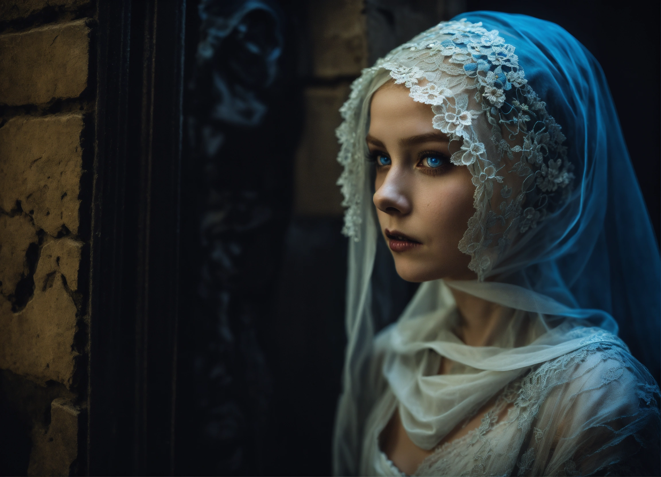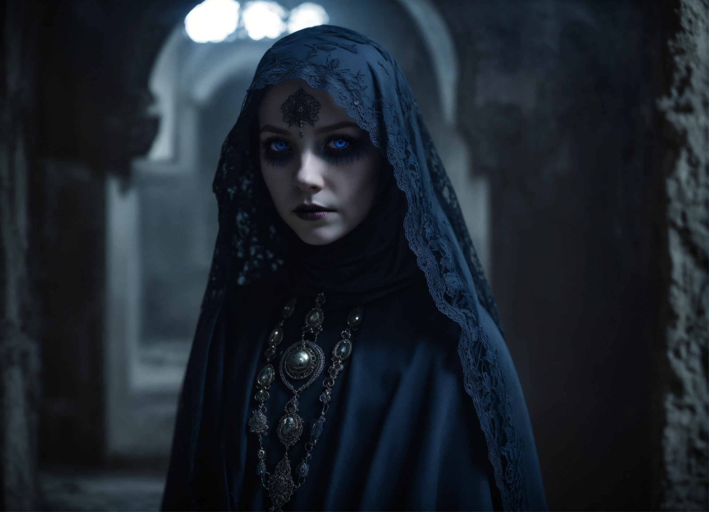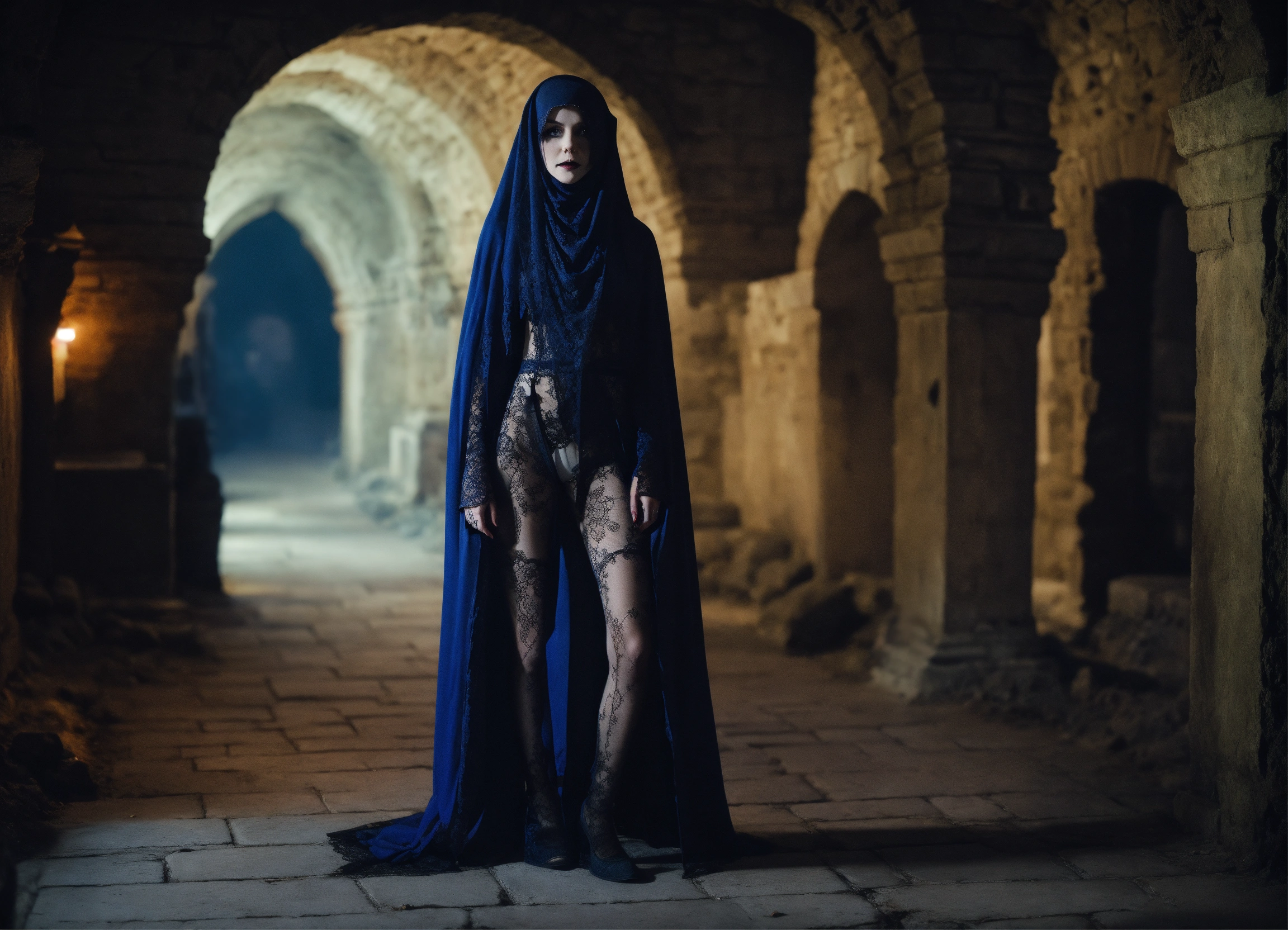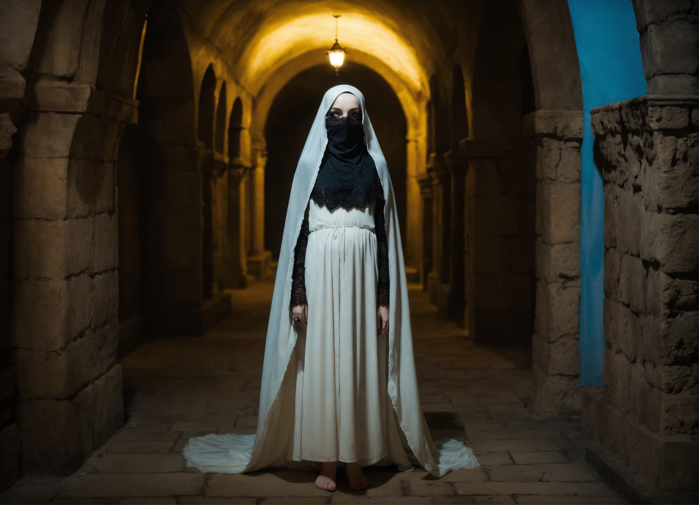Body portrait of a very childish deadly pale ultra slim twelve year old female child, she is a goth necromancer with waist-long silverwhite hair, lace niqab, face veil, fully veiled, very flat belly, ultra skinny, very slim body, emaciated body, completely emaciated, ultra narrow face, alabaster skin, pale as a corpse, glowing blue eyes, ultra slim face, innocent looking, in a gloomy crypt, lasziv, kindlich, unschuldig, childlike, graceful, wispy, glowing blue eyes, ghostly, dead, evil, demonic, undead, darkness, grotesque, mysterious, dark, cold ambient lighting, extremely detailed, fantasy, medieval setting