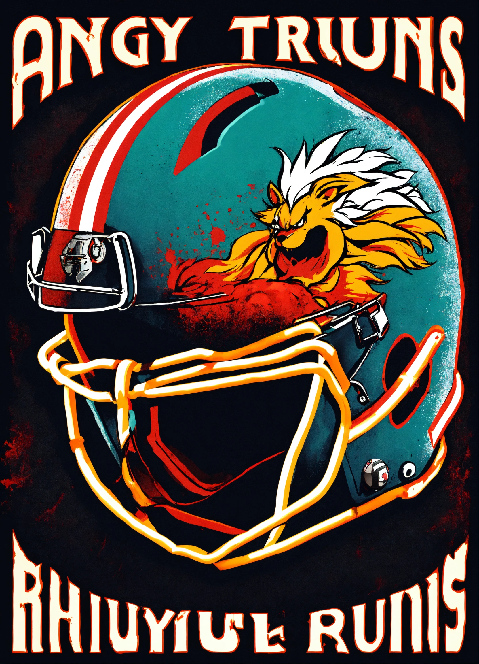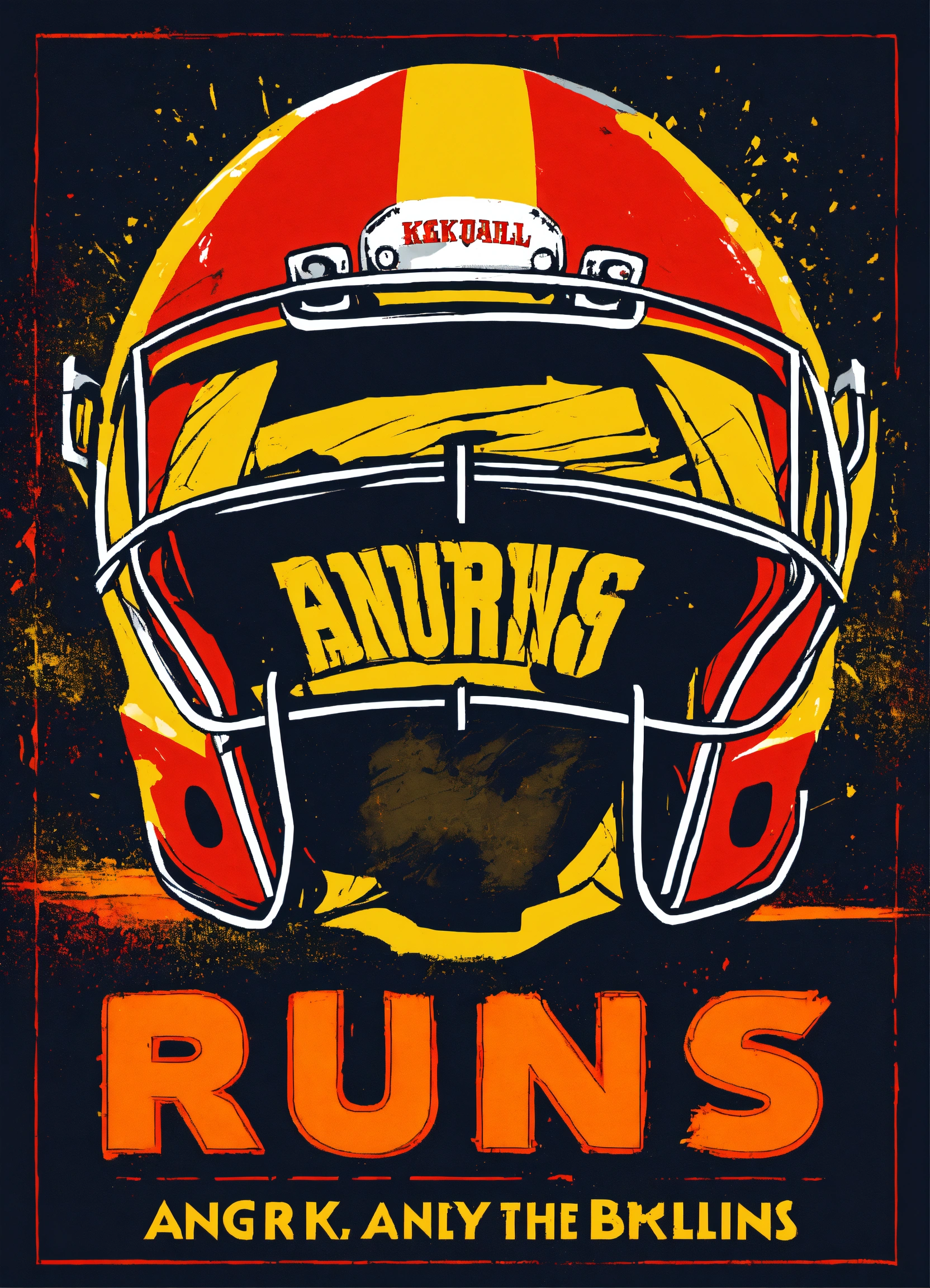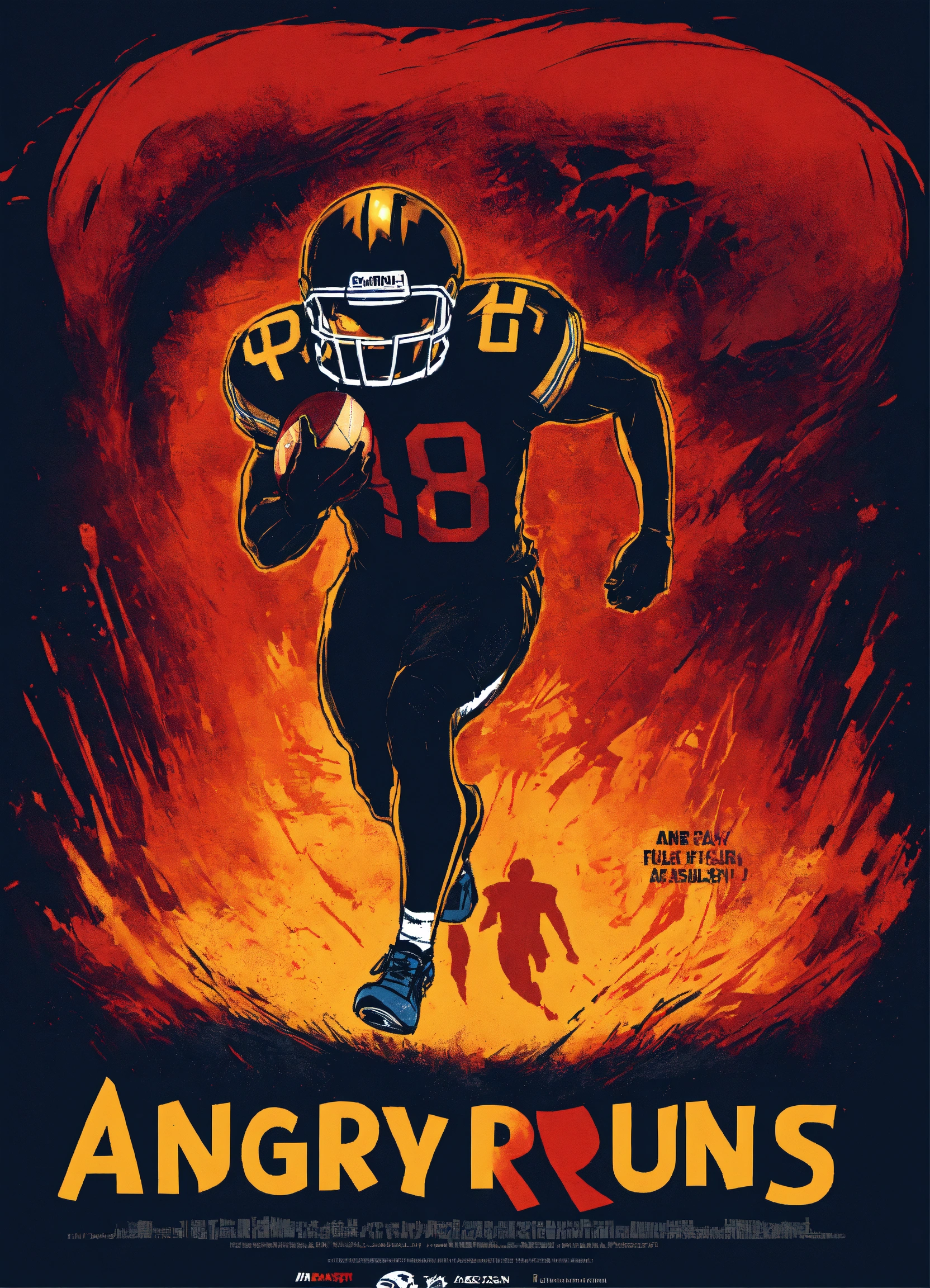 Distressed design for a black t-shirt with the text "angry runs" in a colorful font. the design should be eye-catching and visually appealing, and it should convey the meaning of the term "angry runs, " which is a football term used to describe a determined and aggressive ball carrier who refuses to go down easily. here are some specific ideas for the design the text "angry runs" could be written in a large, bold font in the center of the shirt. the text could be surrounded by a distressed effect, such as cracks or tears in the fabric. the text could be colored in a variety of bright colors, such as red, orange, and yellow. the design could also include other football-related elements, such as a football helmet, cleats, or a yard line. overall, the design should be eye-catching and visually appealing, and it should convey the meaning of the term "angry runs."