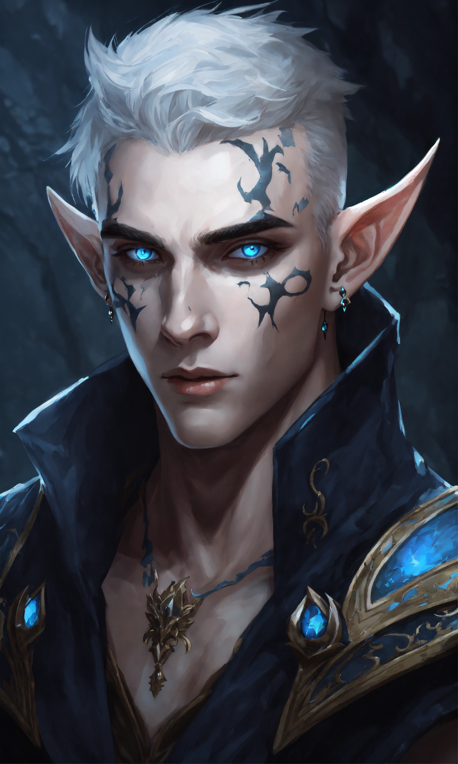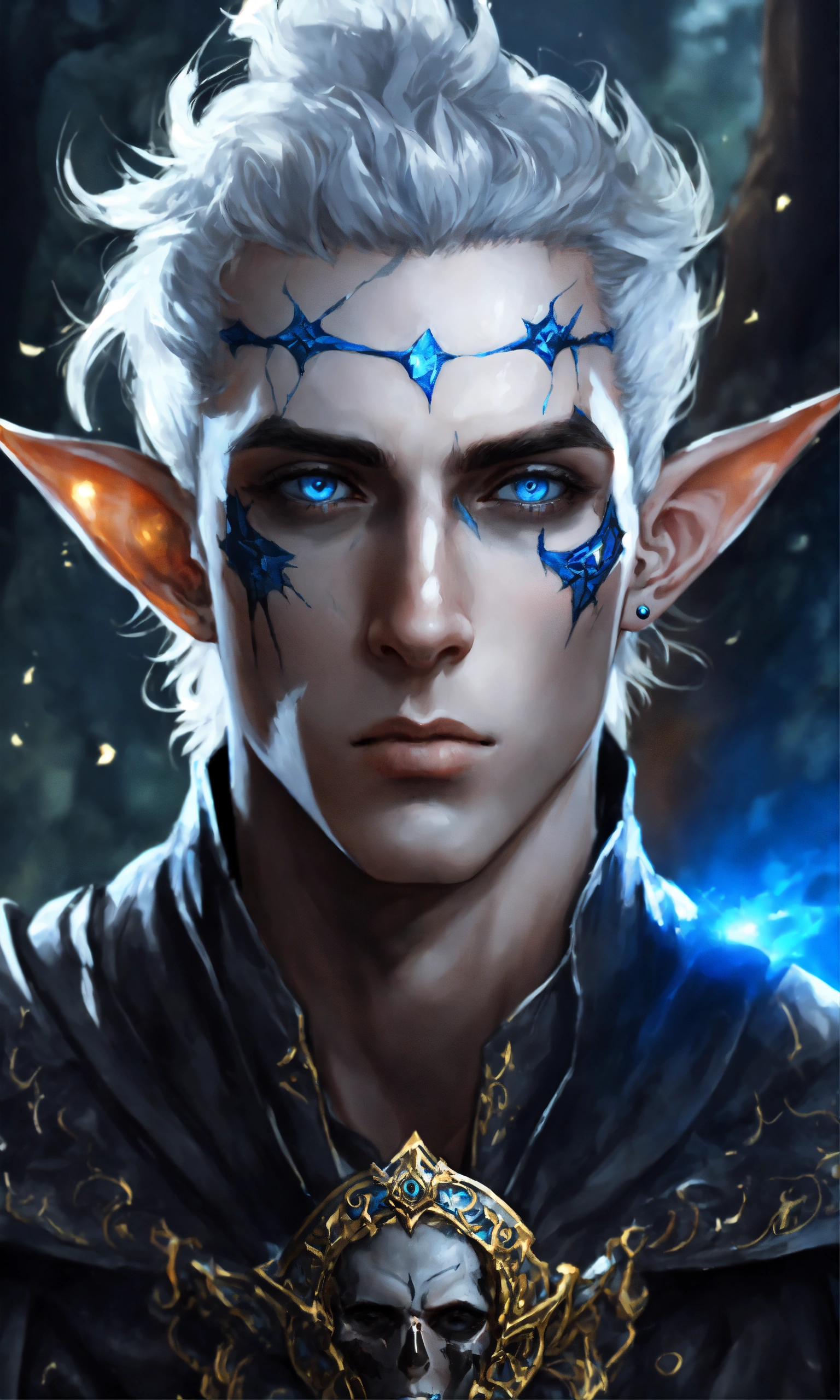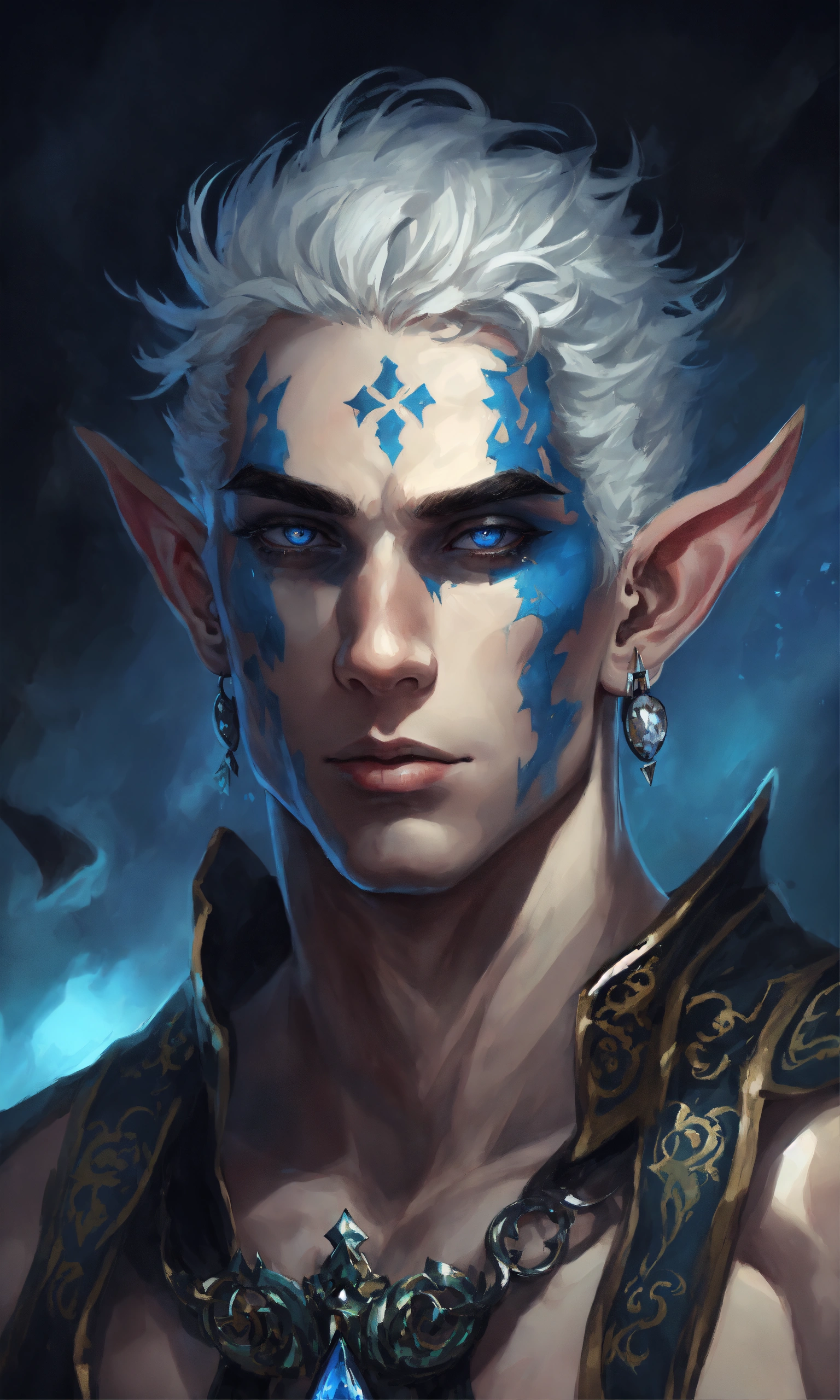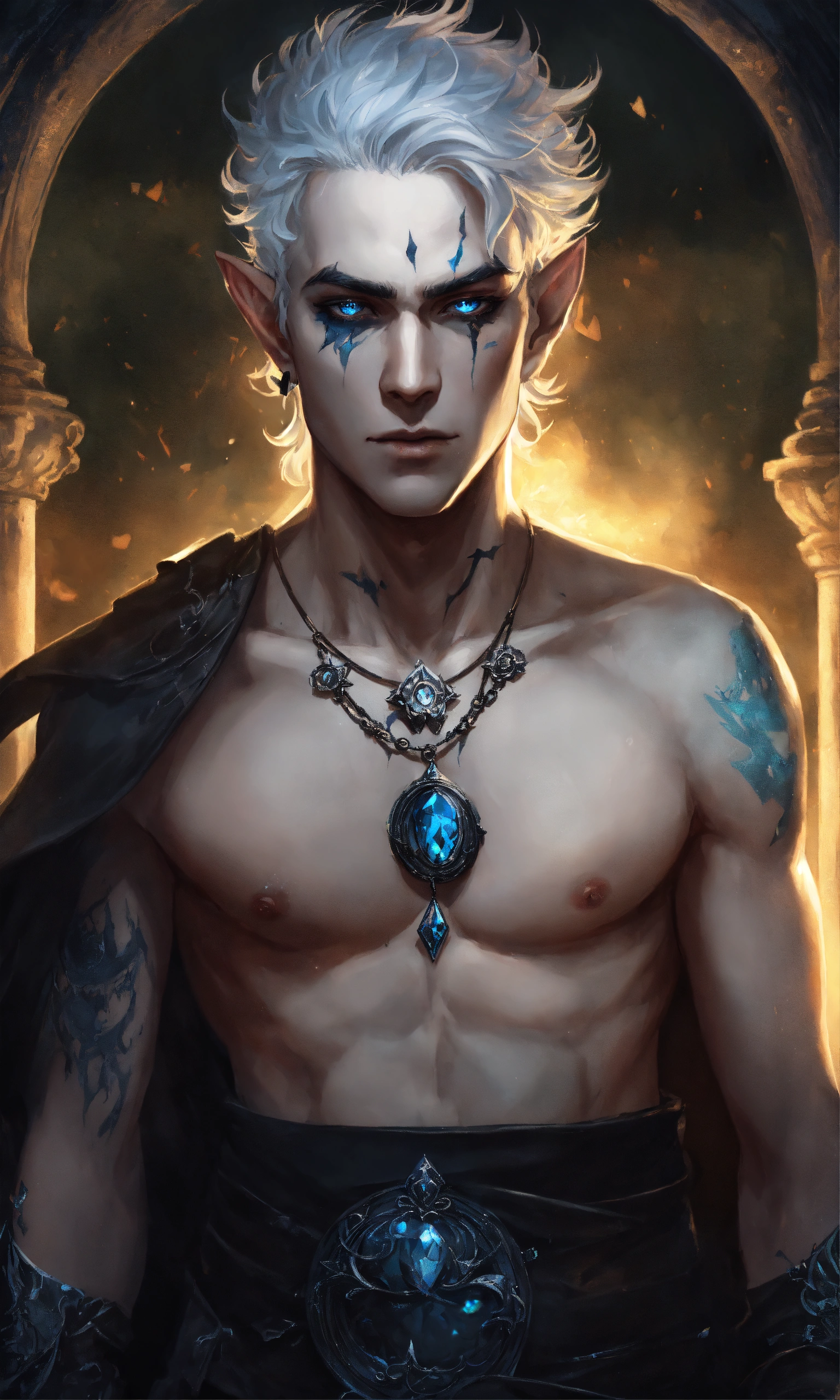 Fantasy portrait of a gaunt male elf, sickly thin, gaunt body type, shirtless monk, pale skin, black shattered skin, black cracked face, broken skin, inocent expression, chin up, lifted brow, pointy chin, glowing curly white hair, big blue eyes, lost expression, black shadow magic, ultra detailed, piercings, moonlight graveyard background