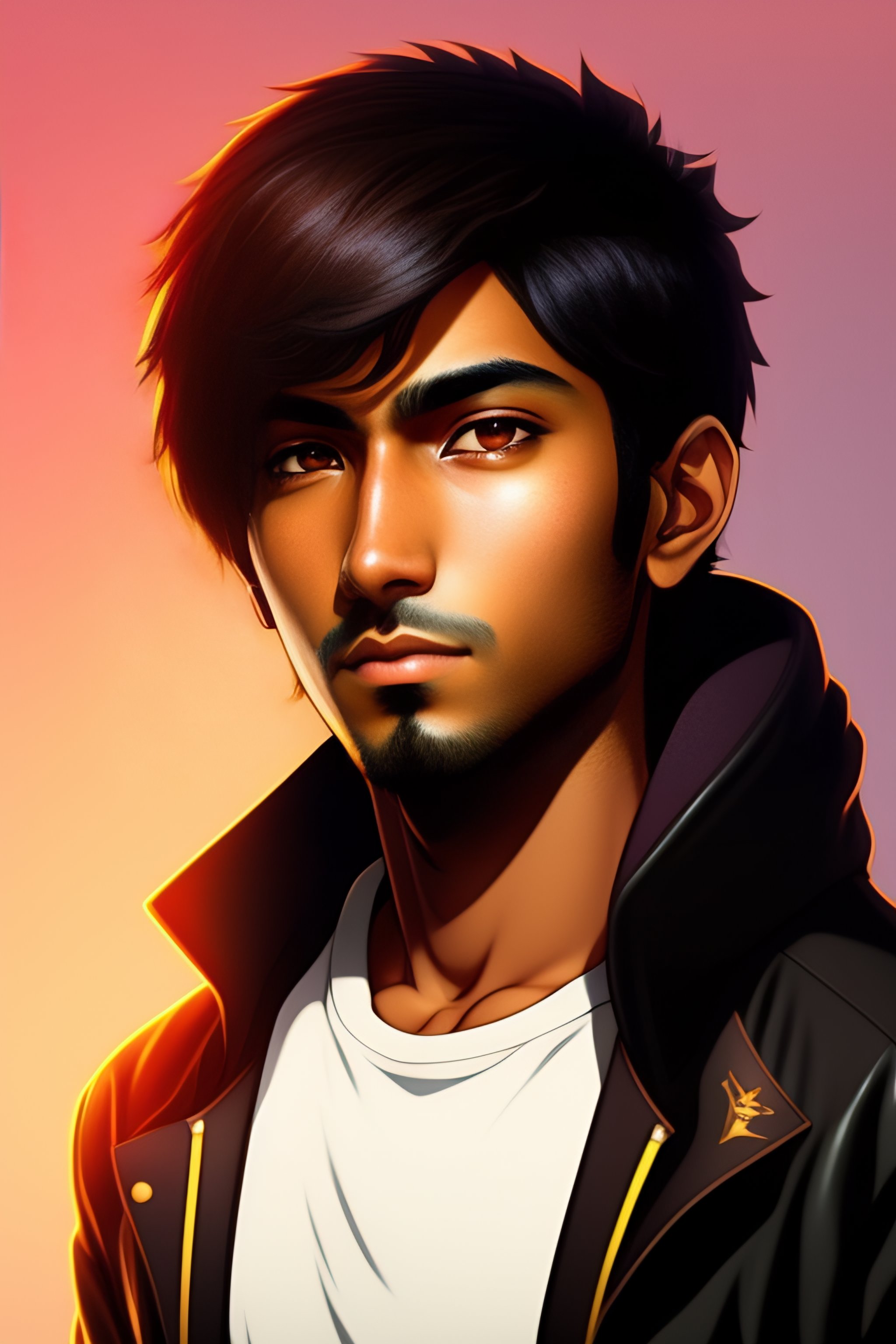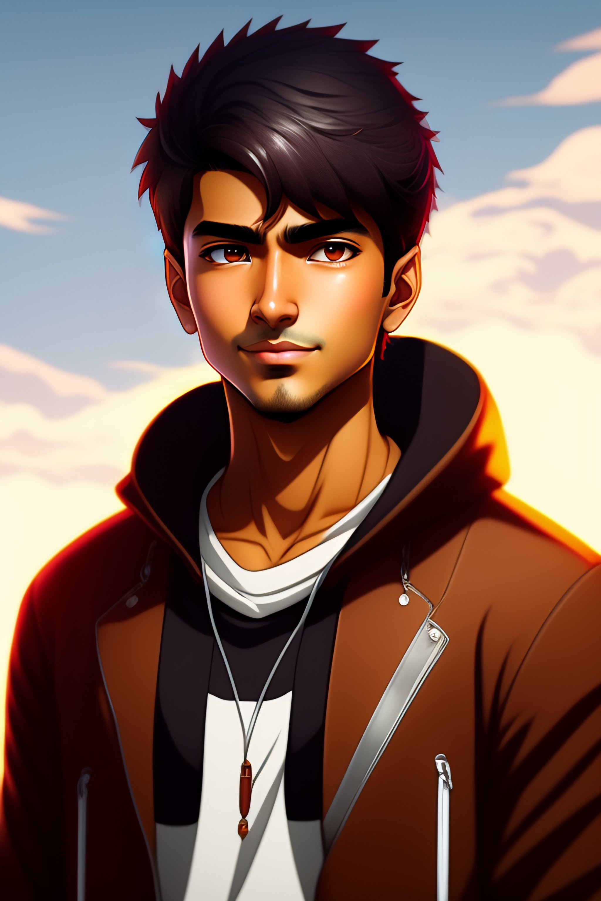 Anime brown guy, indian, coder, brown face, jacket, light brown skin, hacker, no expression, no emotion, no background, anime style, manga, cartoon, anime