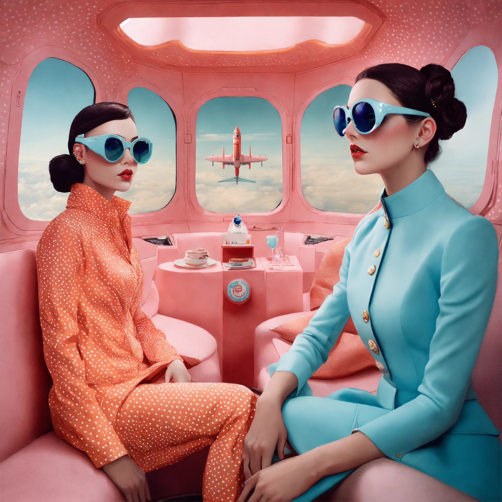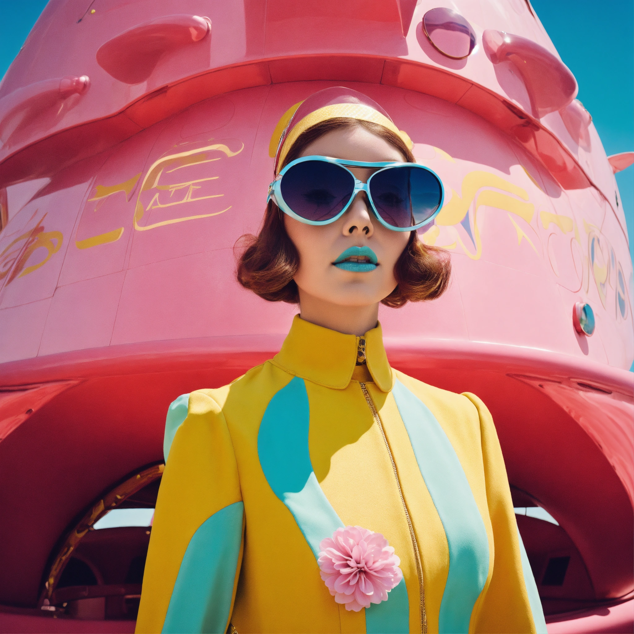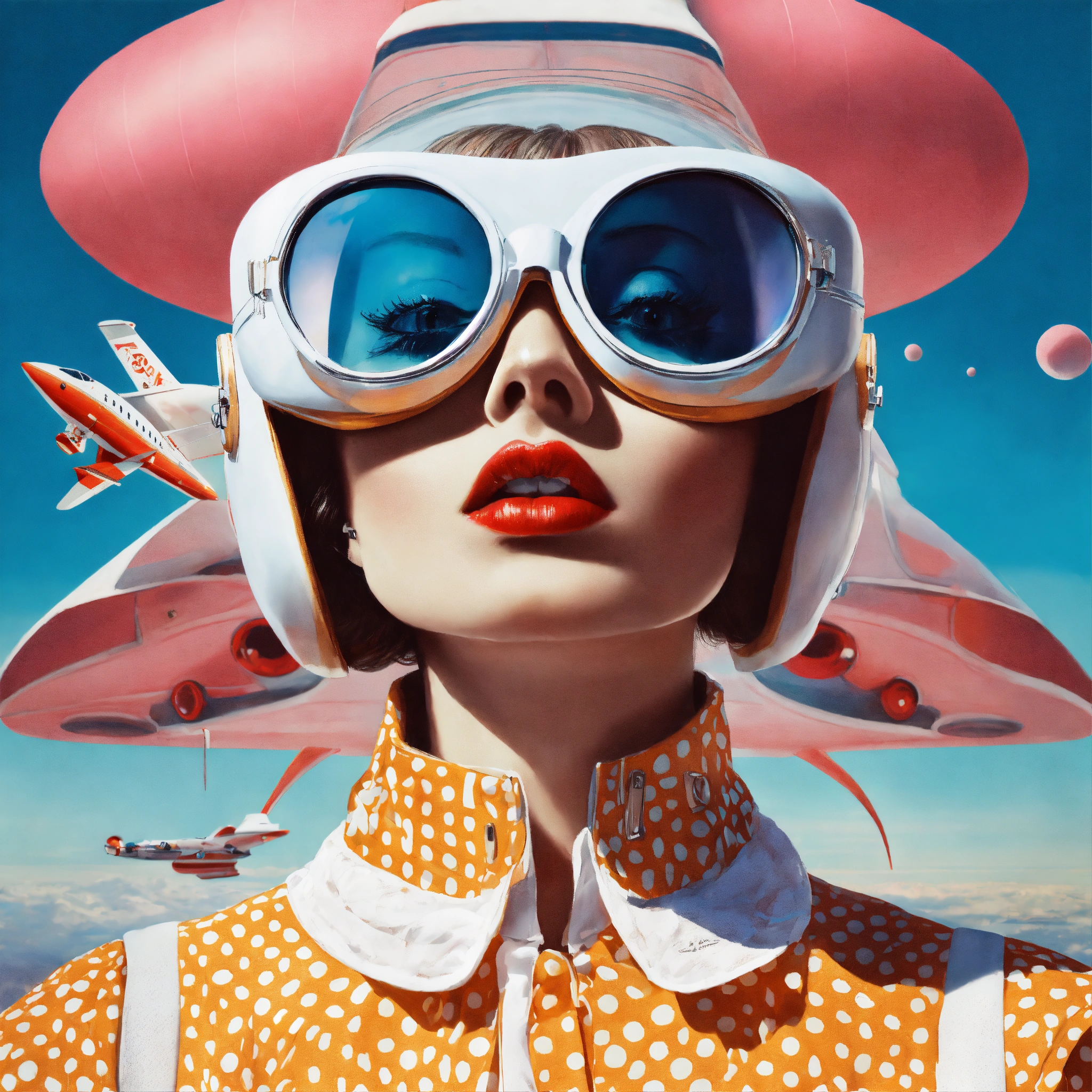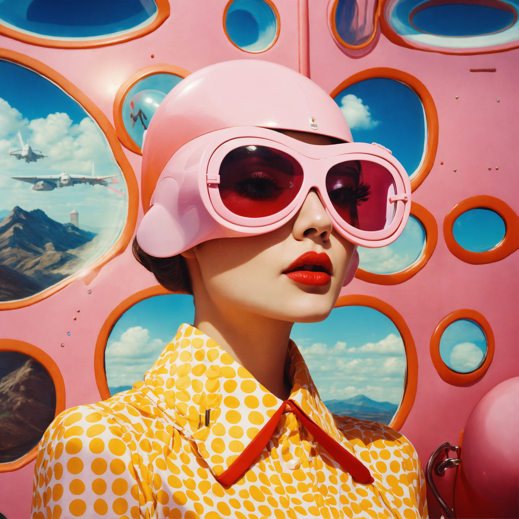 Front portrait photography, polkadot 60's pastels color, in front of a large spaceship, a pop courreges attractive air hostess with large sunglasses mask, 80 degree view, art by sergio lopez, natalie shau, james jean and salvador dali