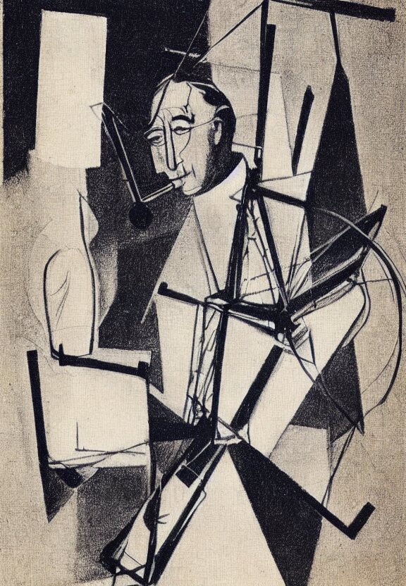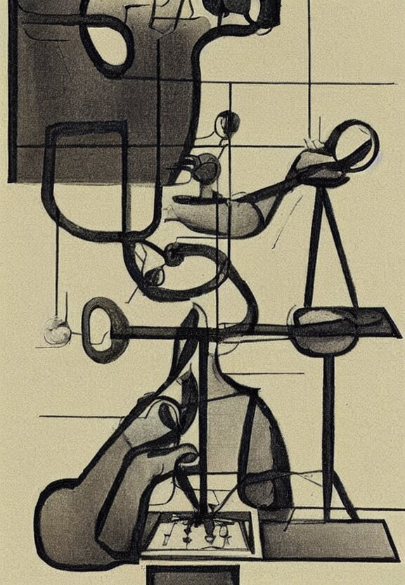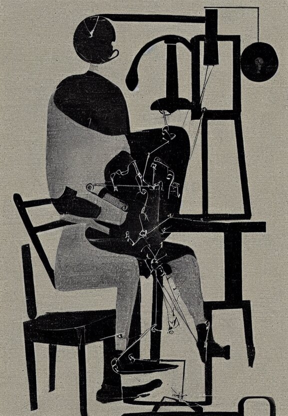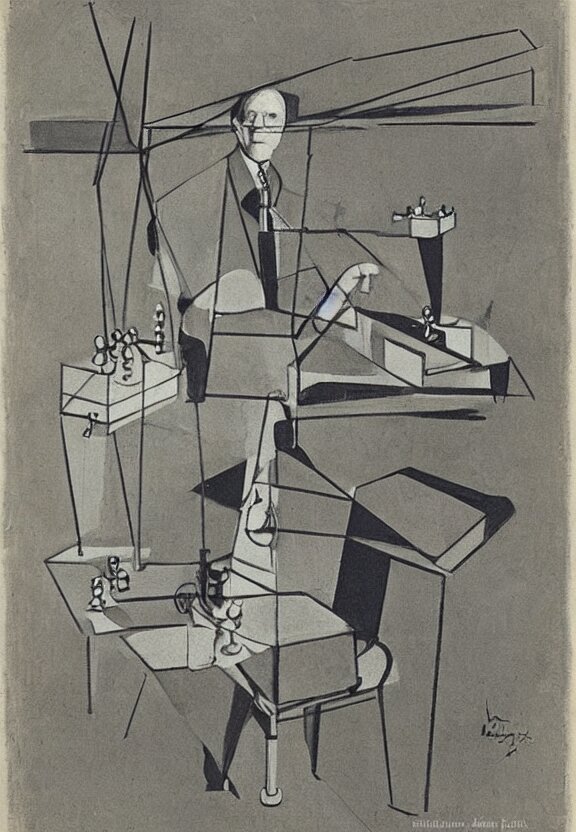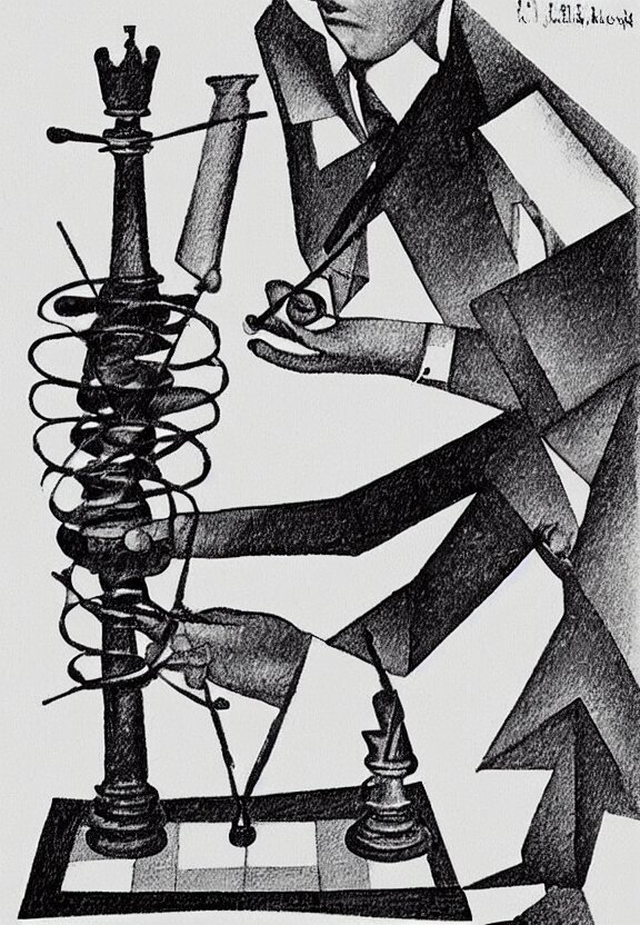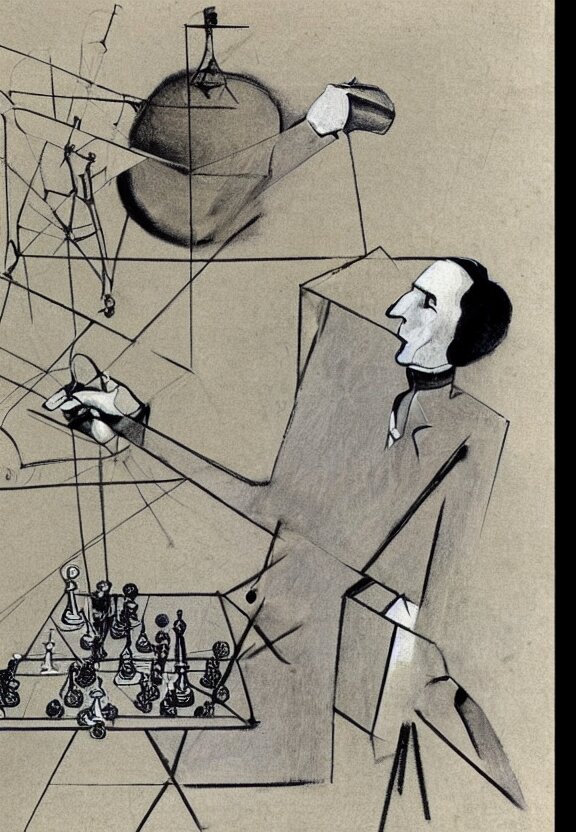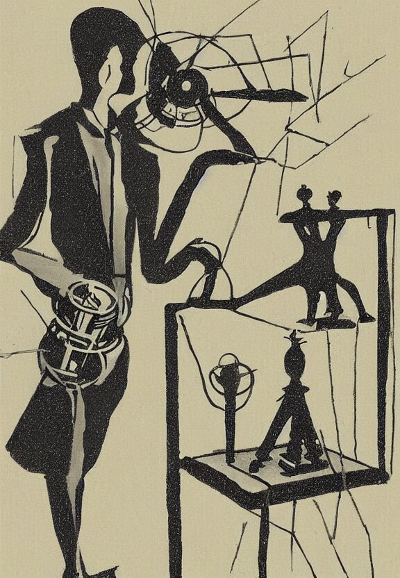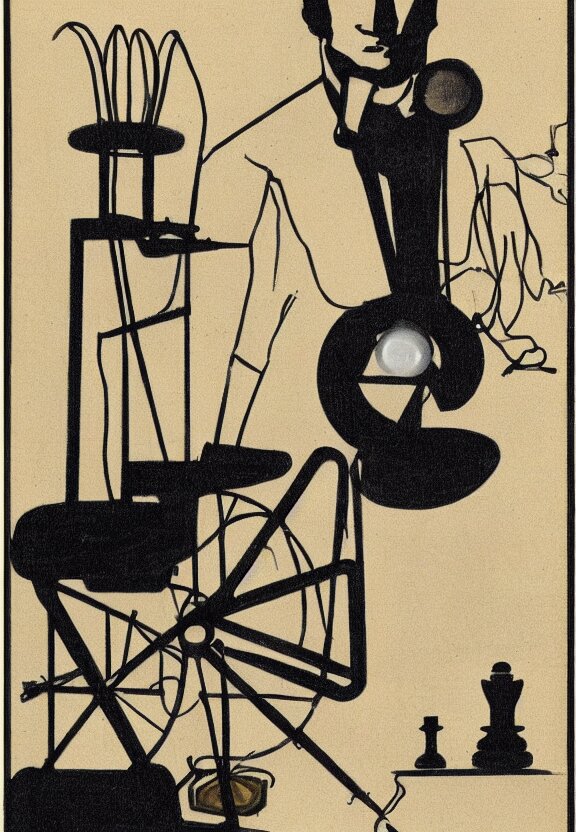 A concept drawing of marcel duchamp holding up a chess - piece wire - machine, a surrealist painting by marcel duchamp, complex artificial - intelligence machinery, minimal sketch flow - chart, academic art, 1 9 2 0 s