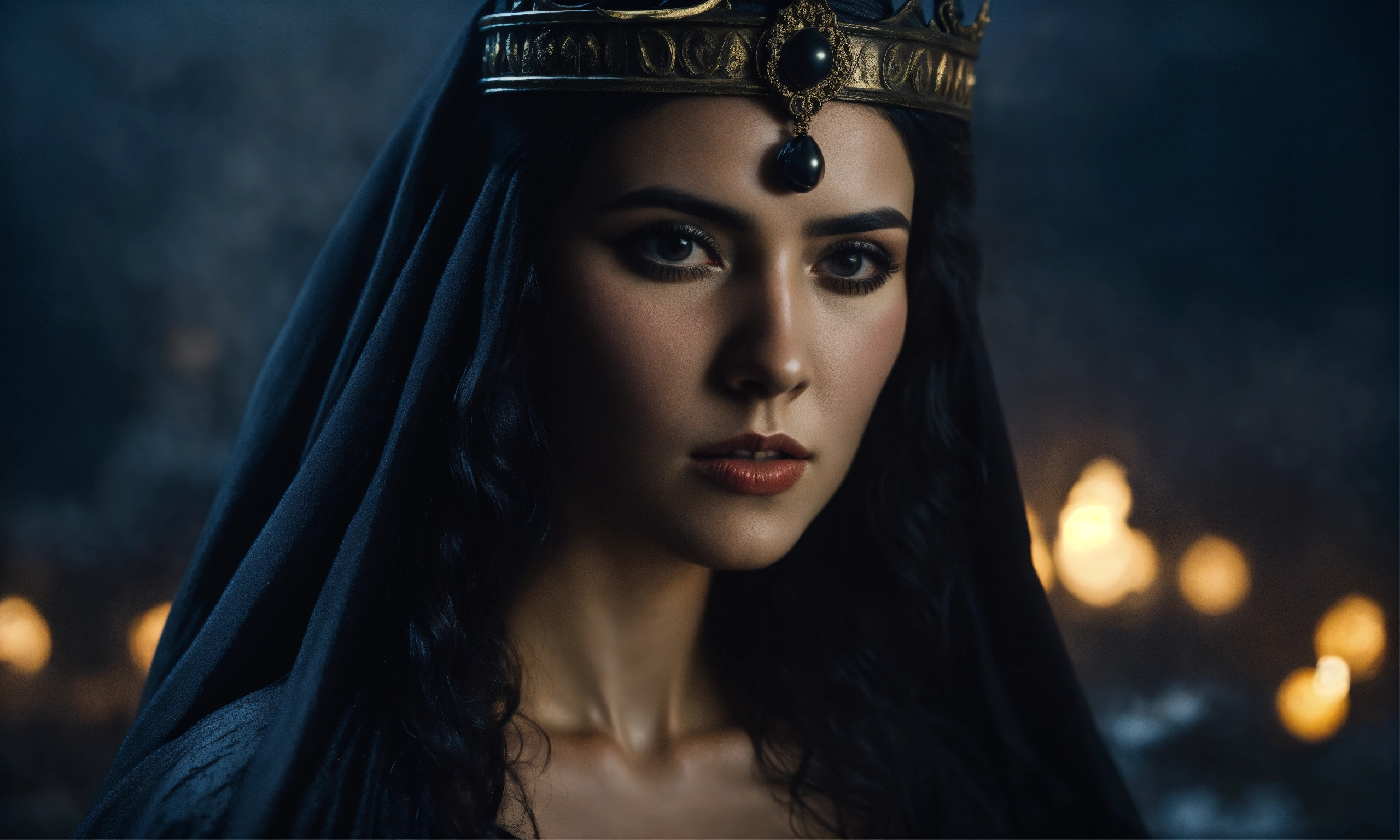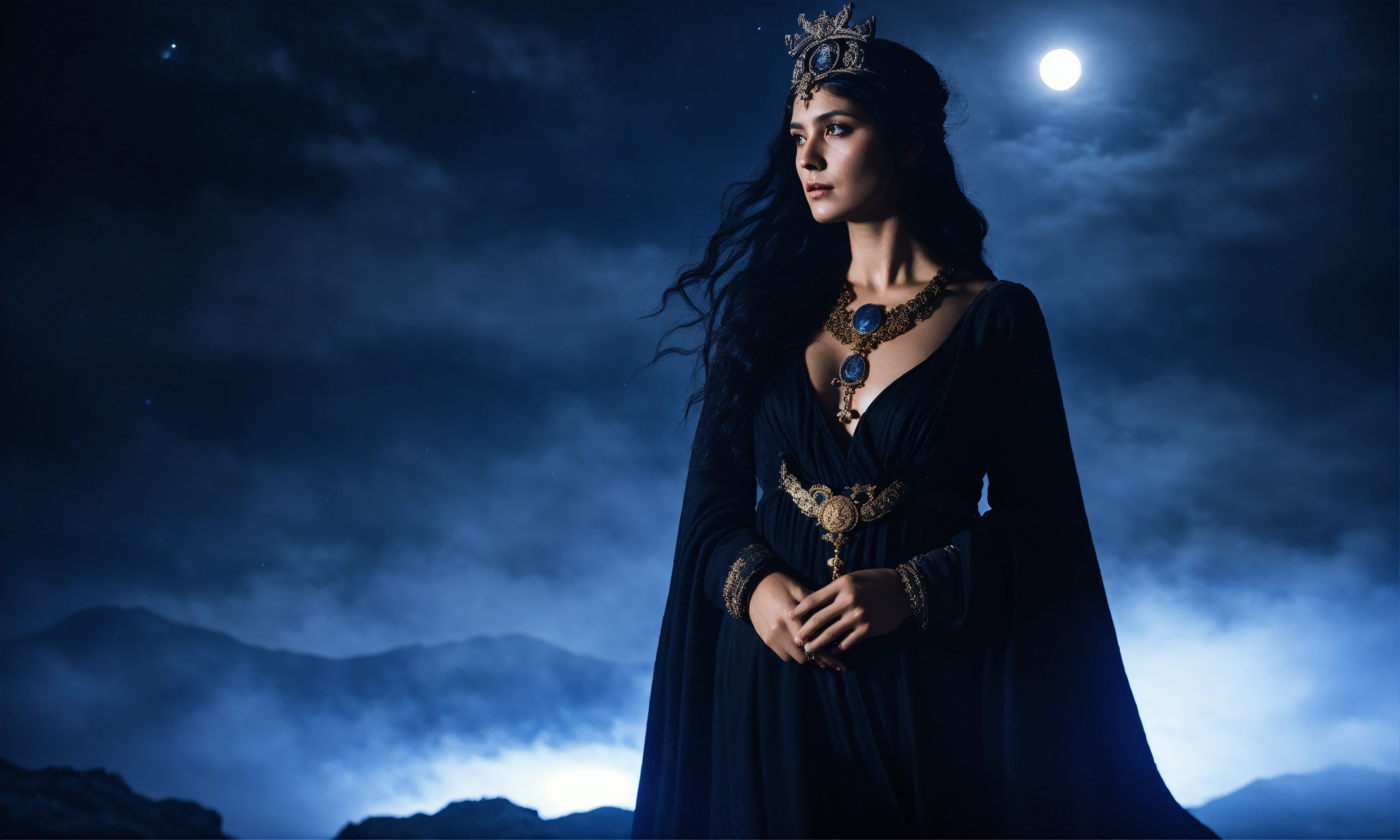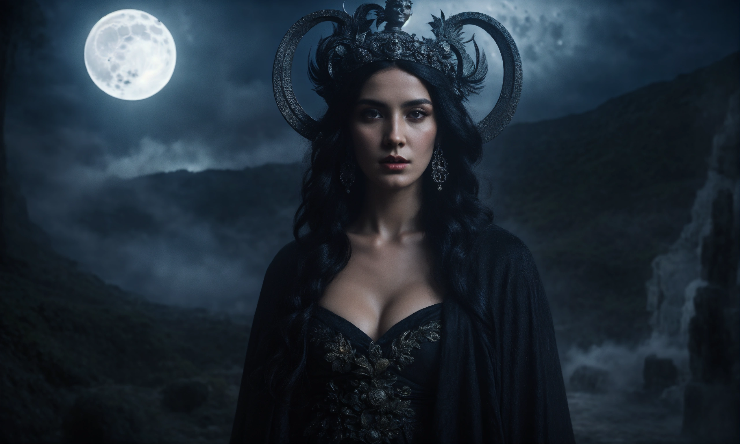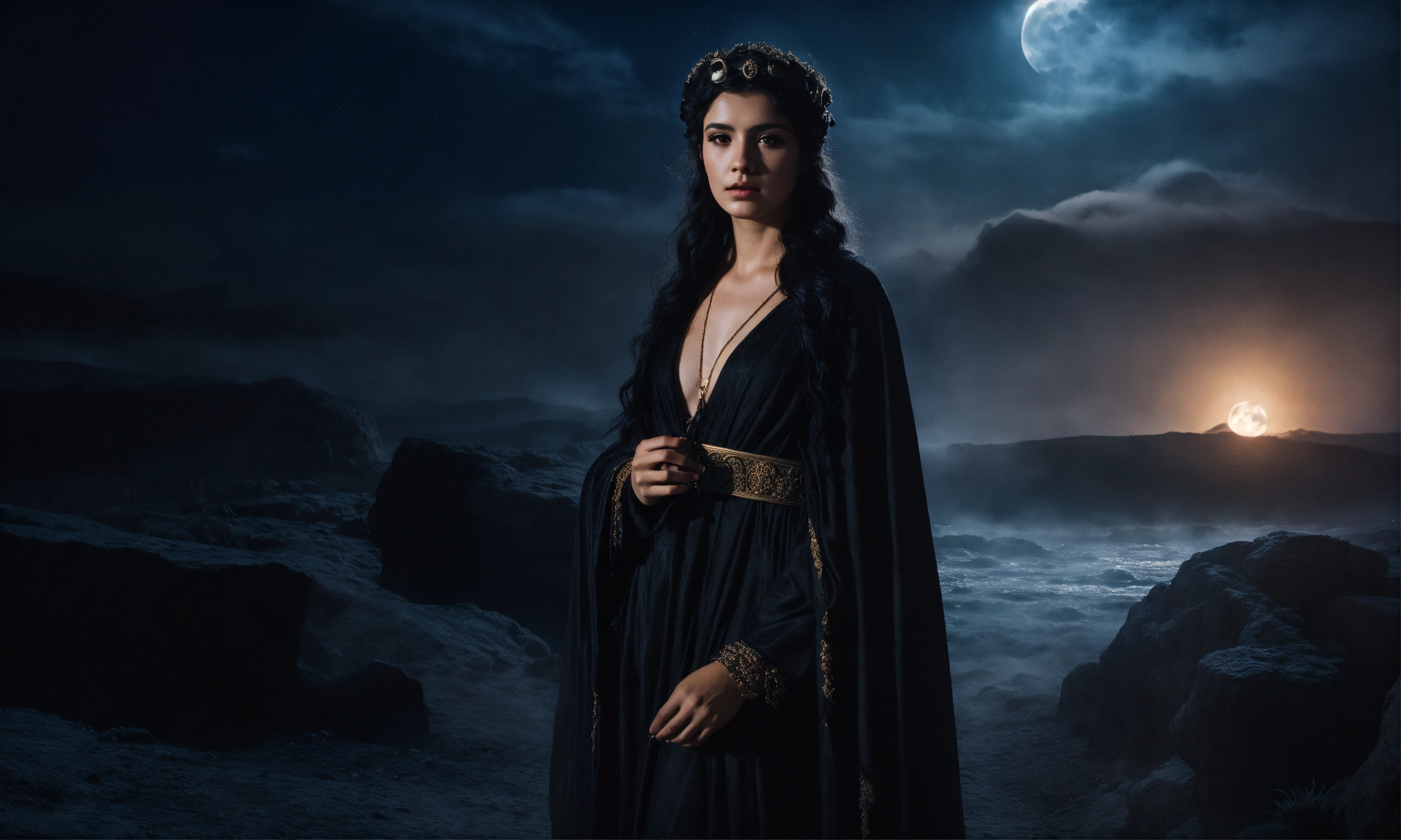 Greek mythology, goddess hecate in the underworld, black hair, adorned in a flowing black robe, greek gods in background, dark moonlight, mist, portrait photography, taken with a 50mm lens, hyper-realistic