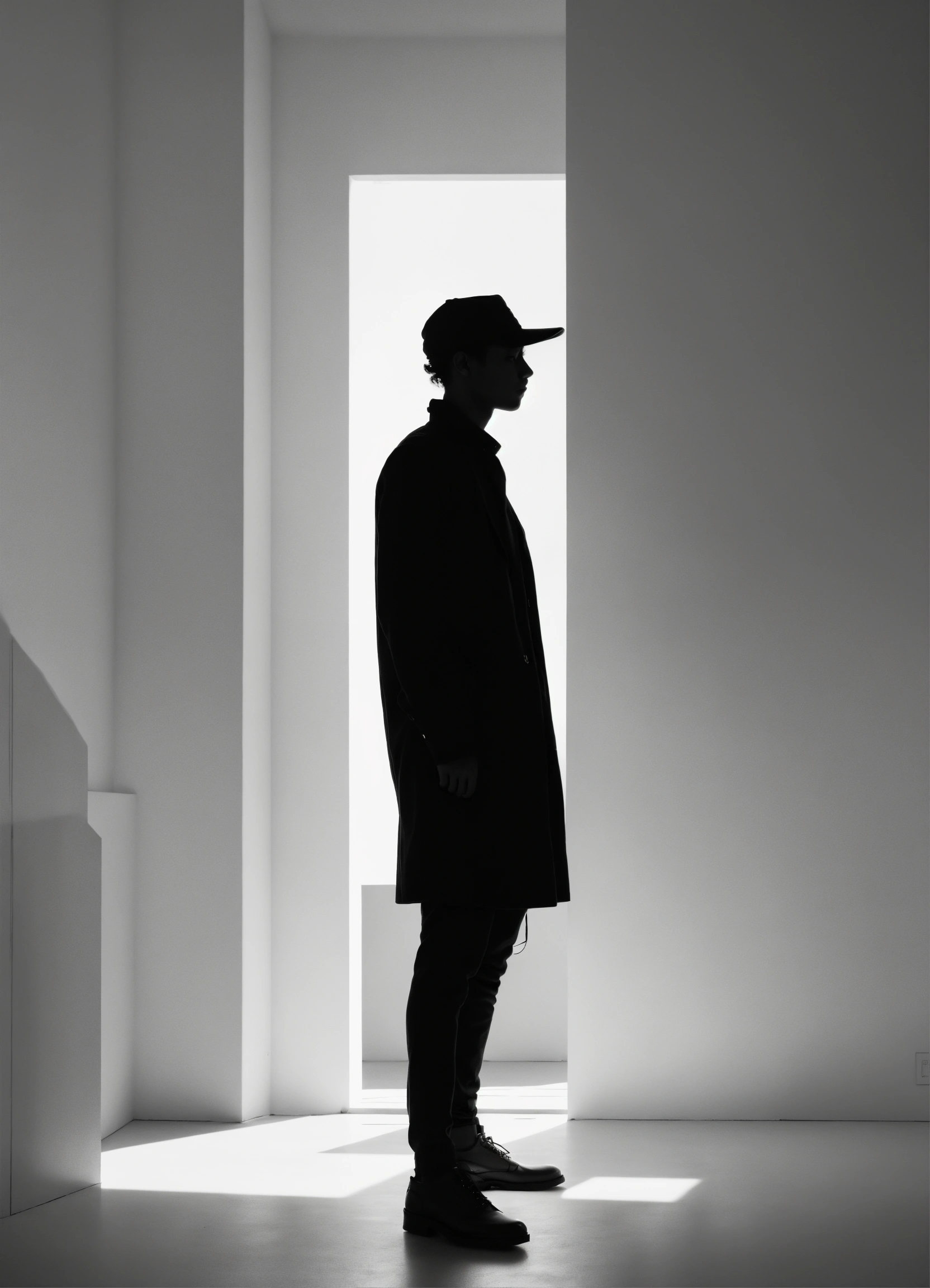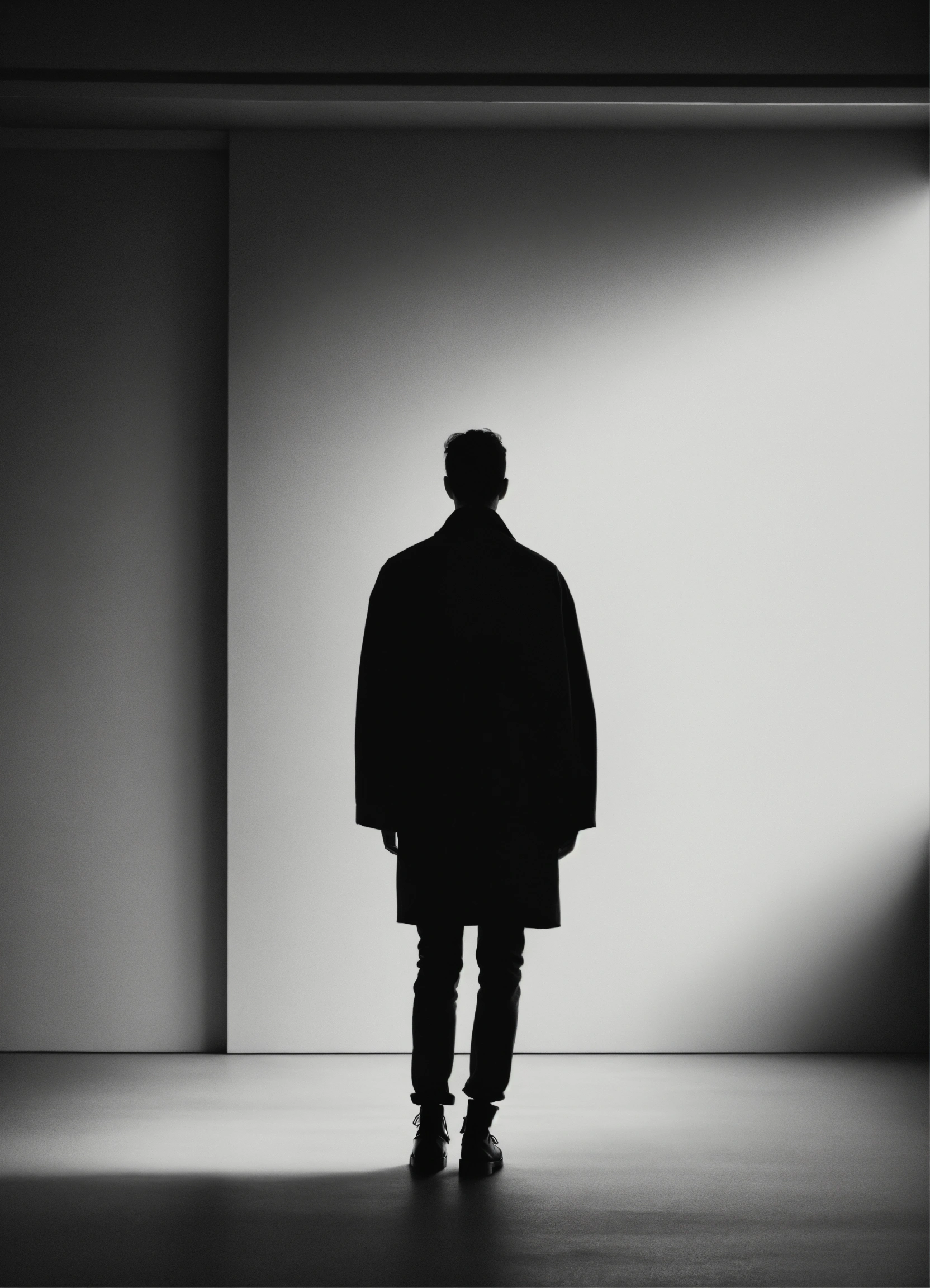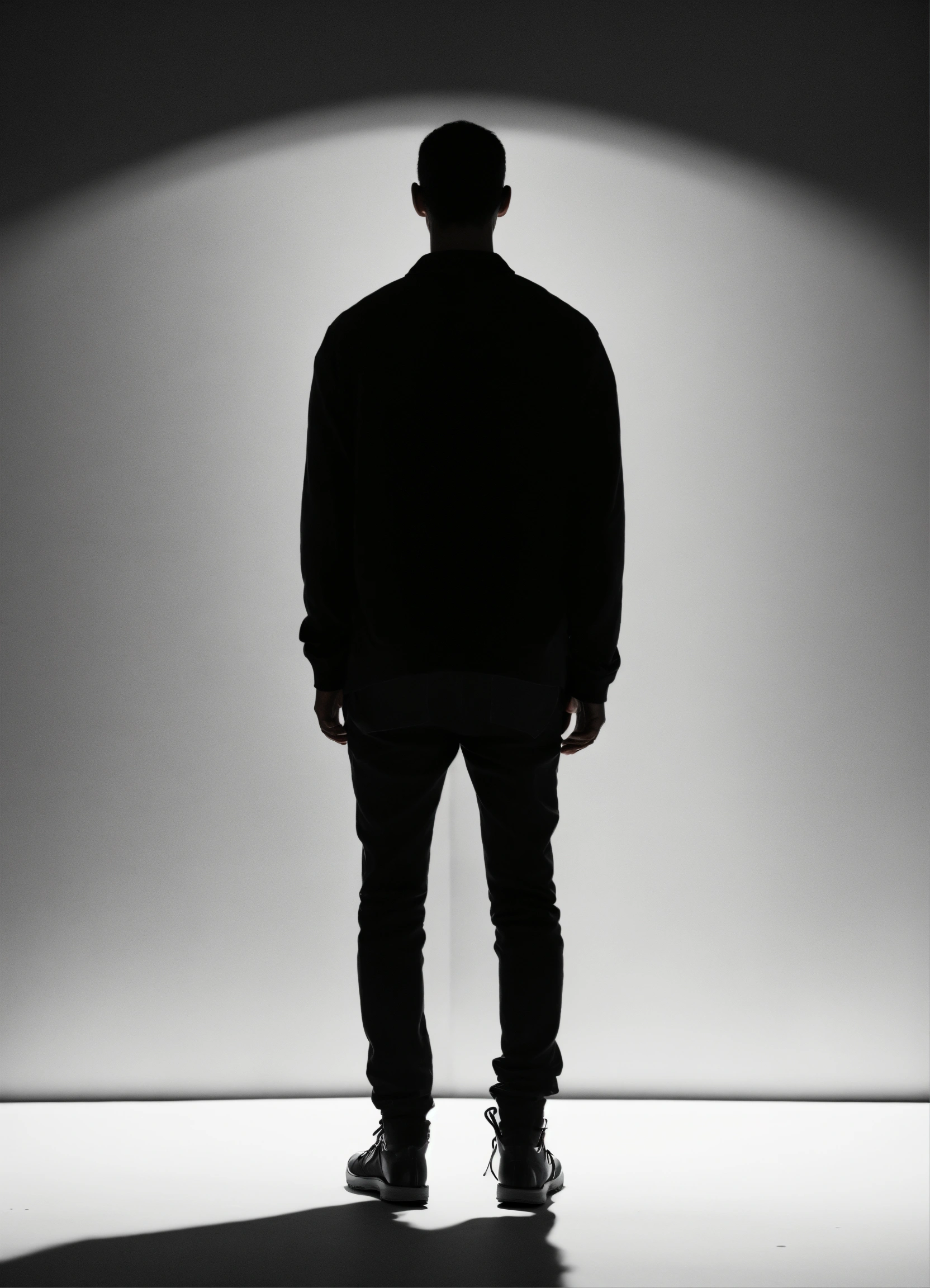 Silhouette noire d'une personne debout de dos sur fond blanc