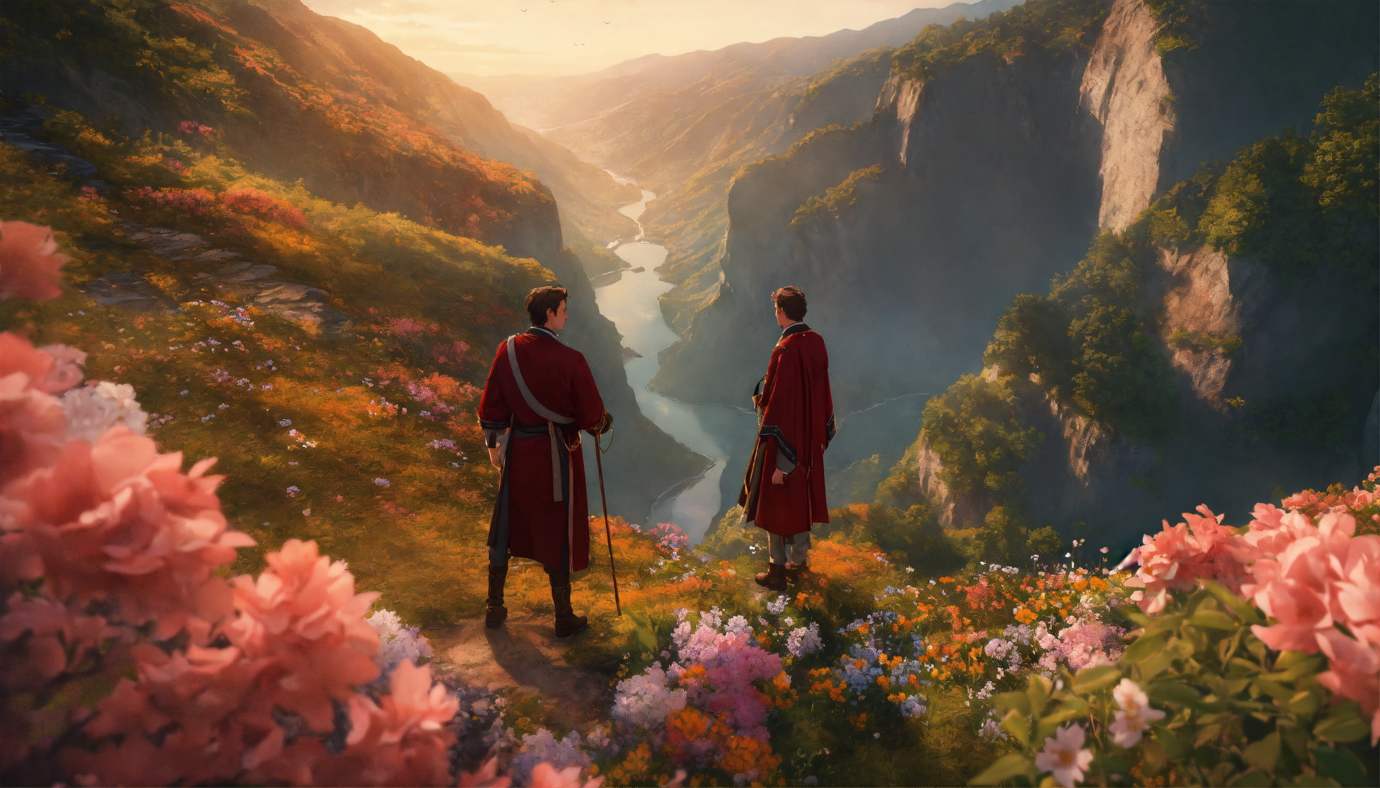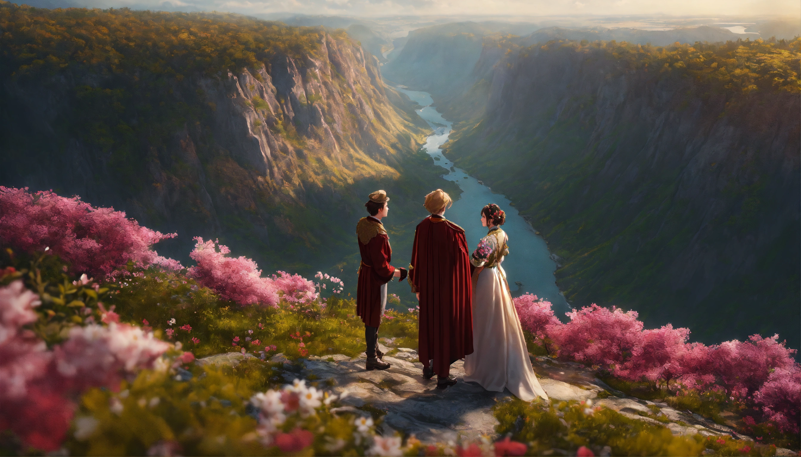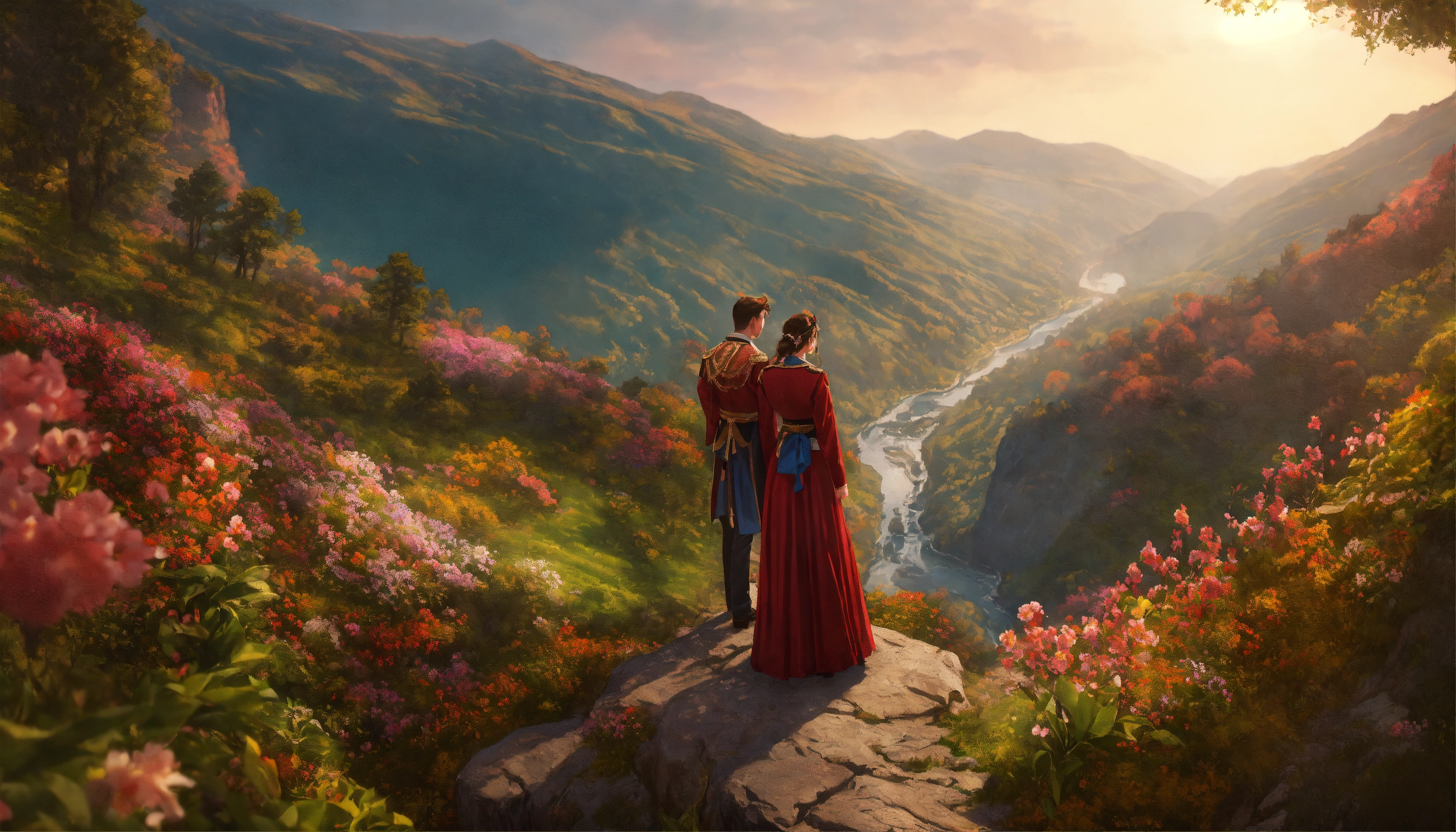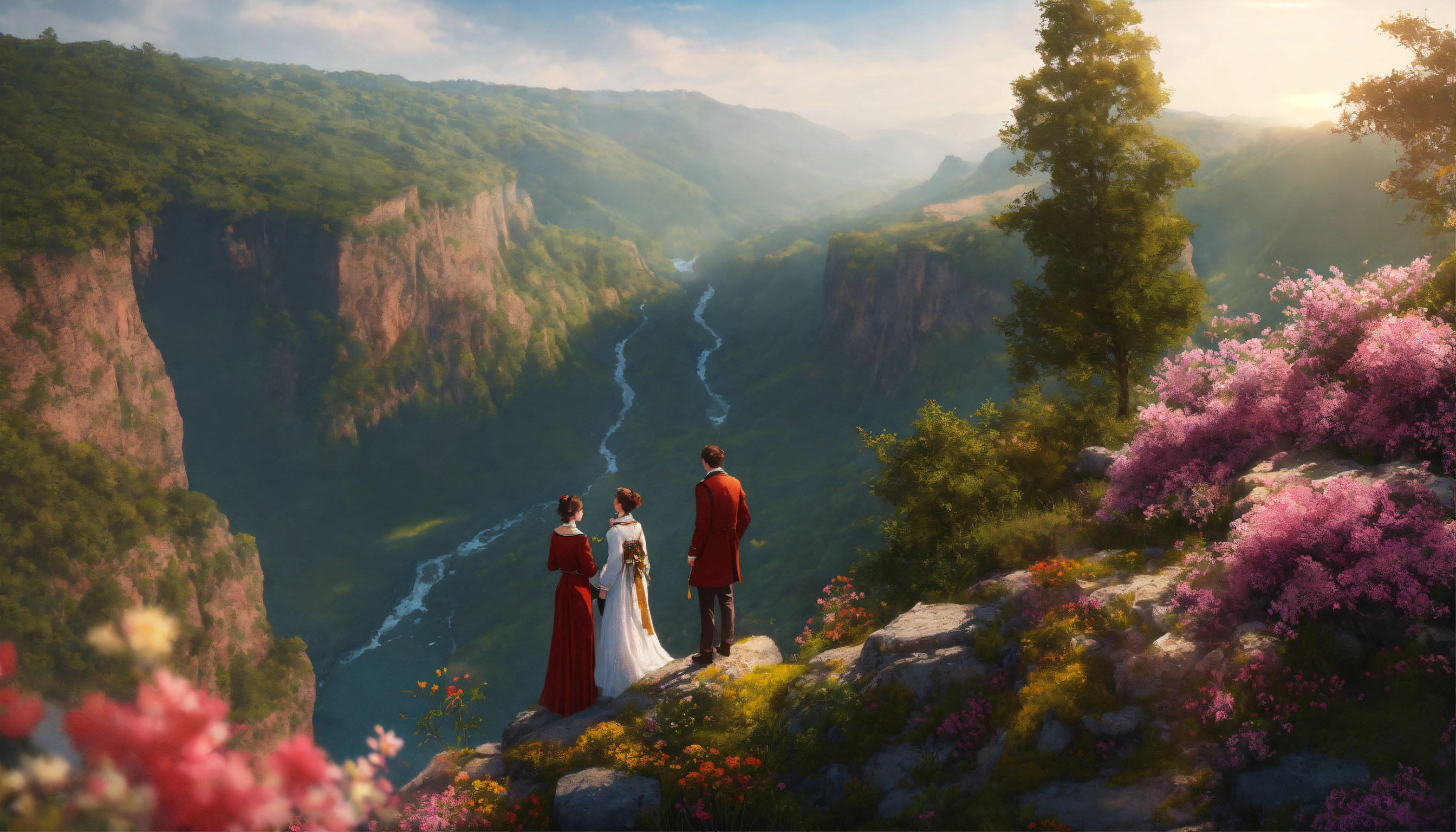 Illustrate a close-up view of two people in grand clothing, standing on the highest cliff of a mountain looking down into a beautiful gorge full of flowers, streams, trees, and animals. photorealistic 8k