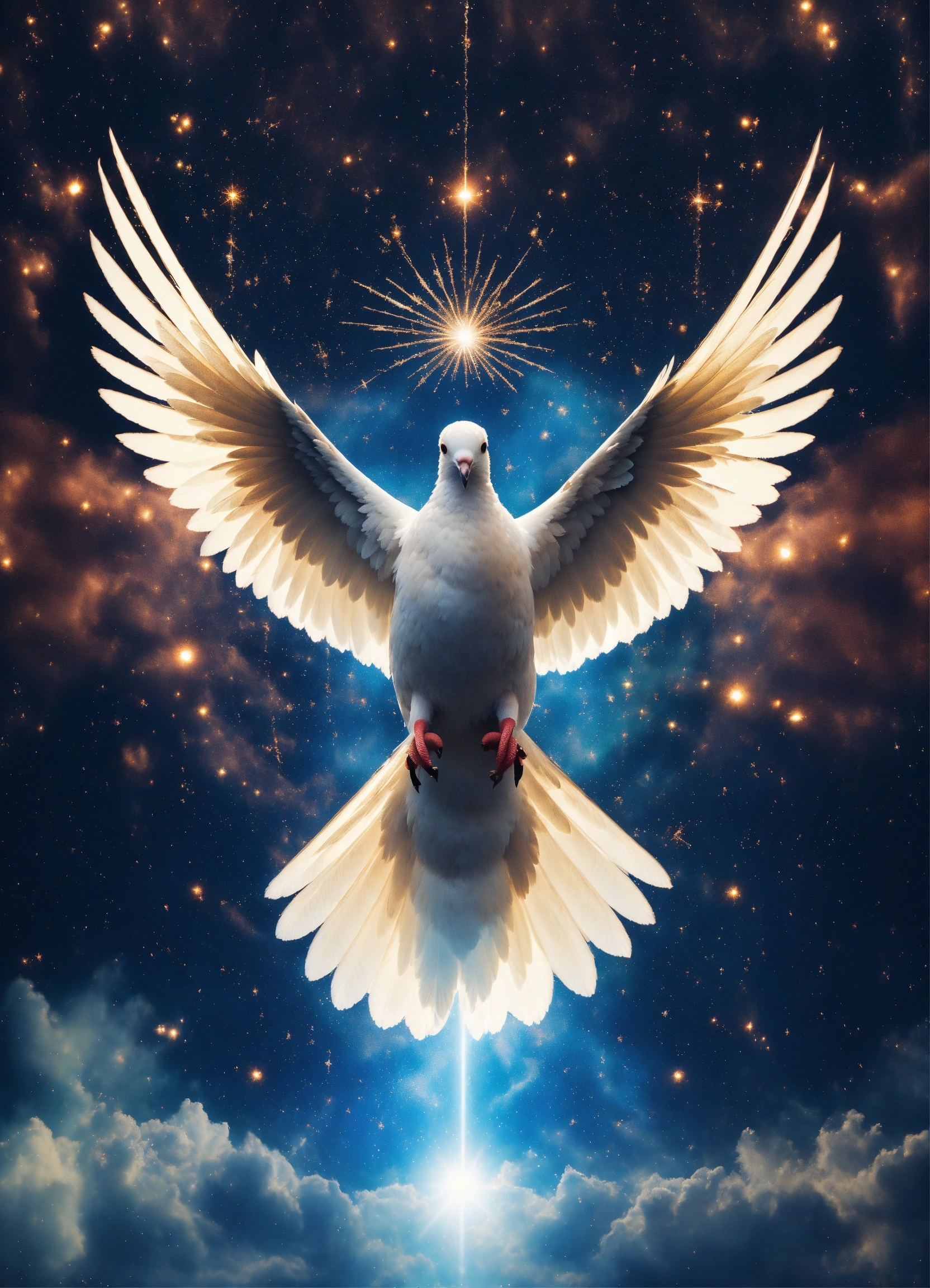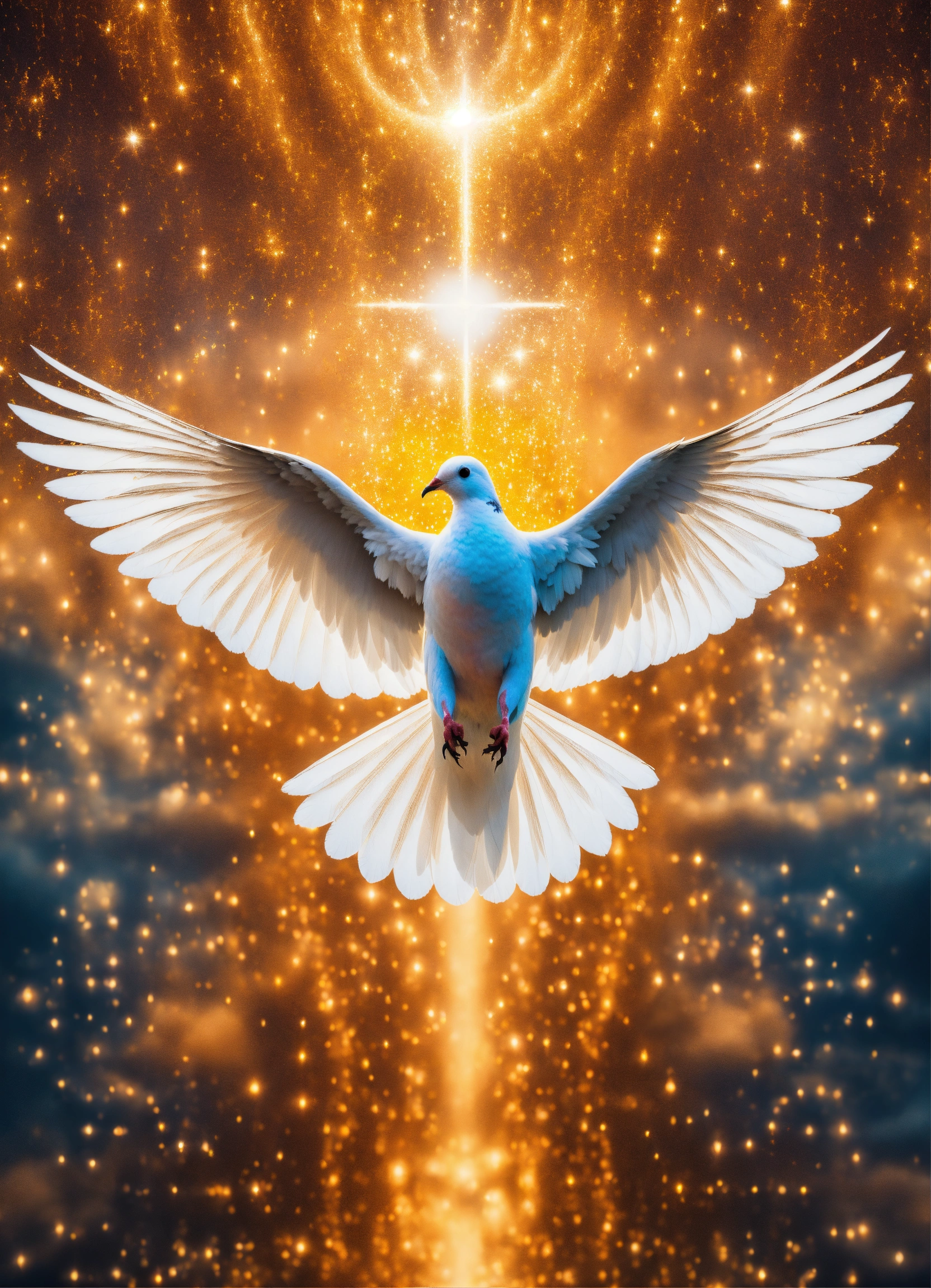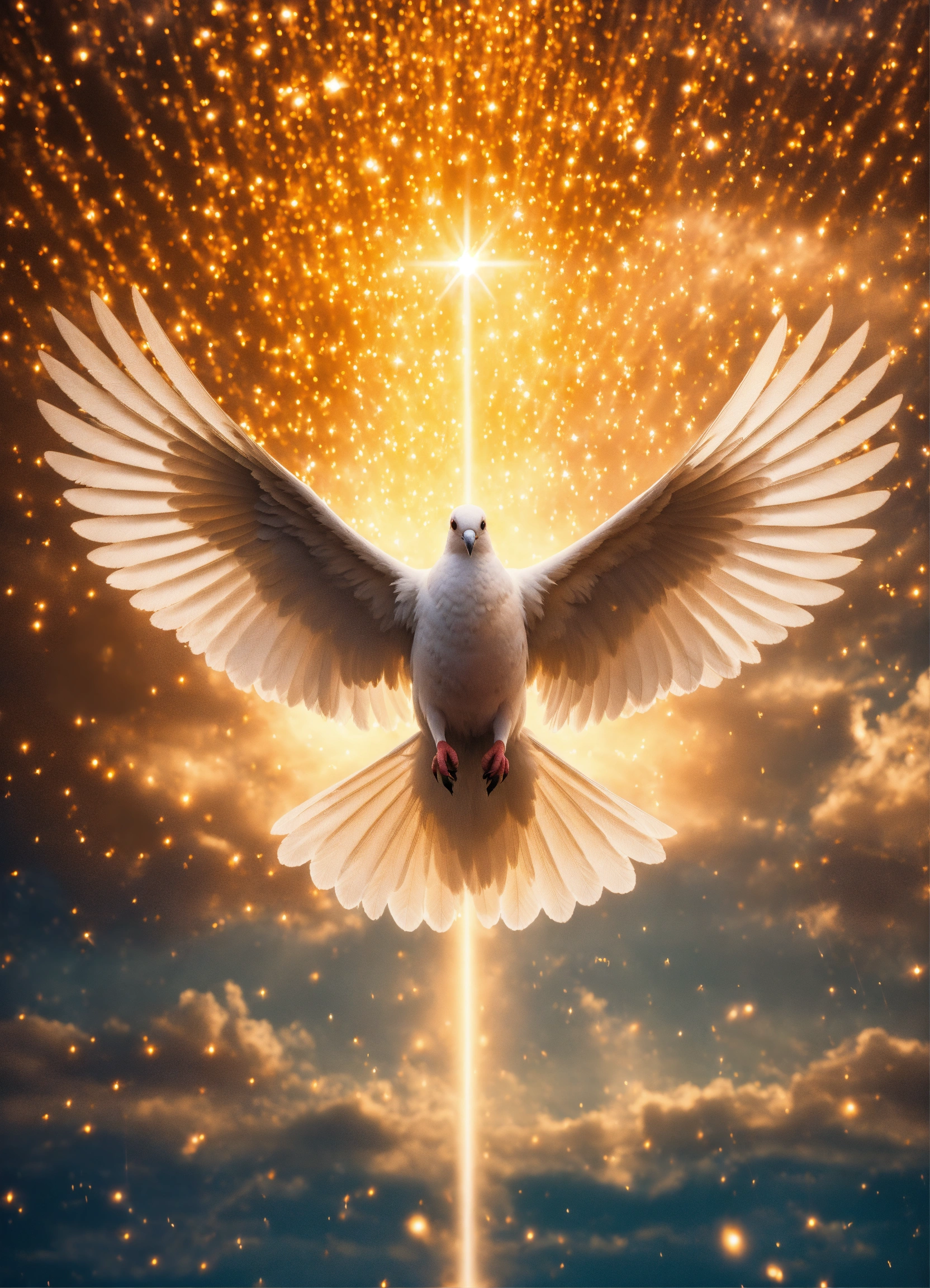 Iconoclastic surreal close up photo of holy spirit dove, symmetrical, iconic, striking, award winning photo, powerful, emotional, fantasy photoshoot, background raining sparkles and magic on a sunlit cloud.
