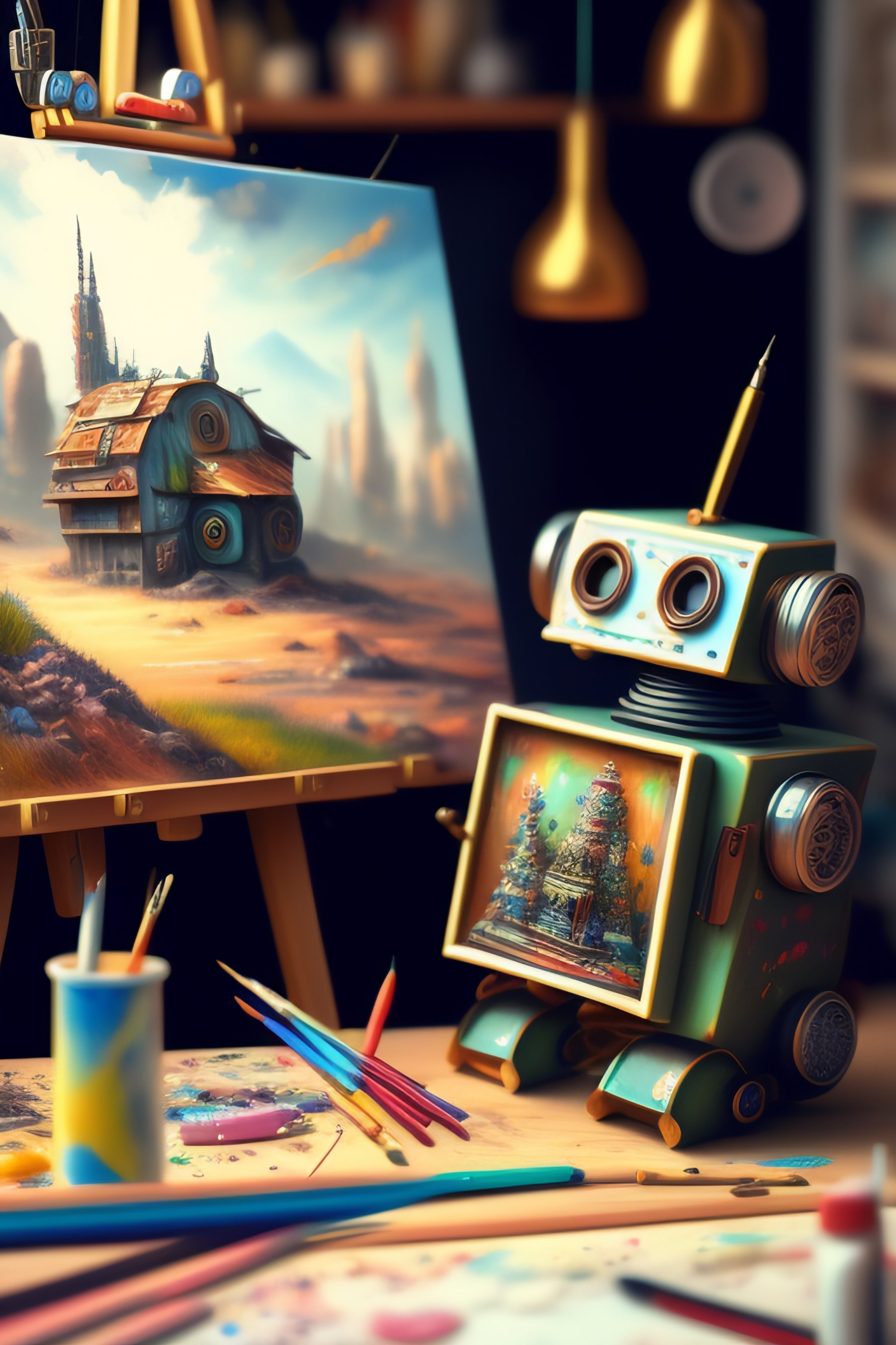 A messy, chaotic artist's workshop, inside is a cute robot painting a picture. the picture is of another robot