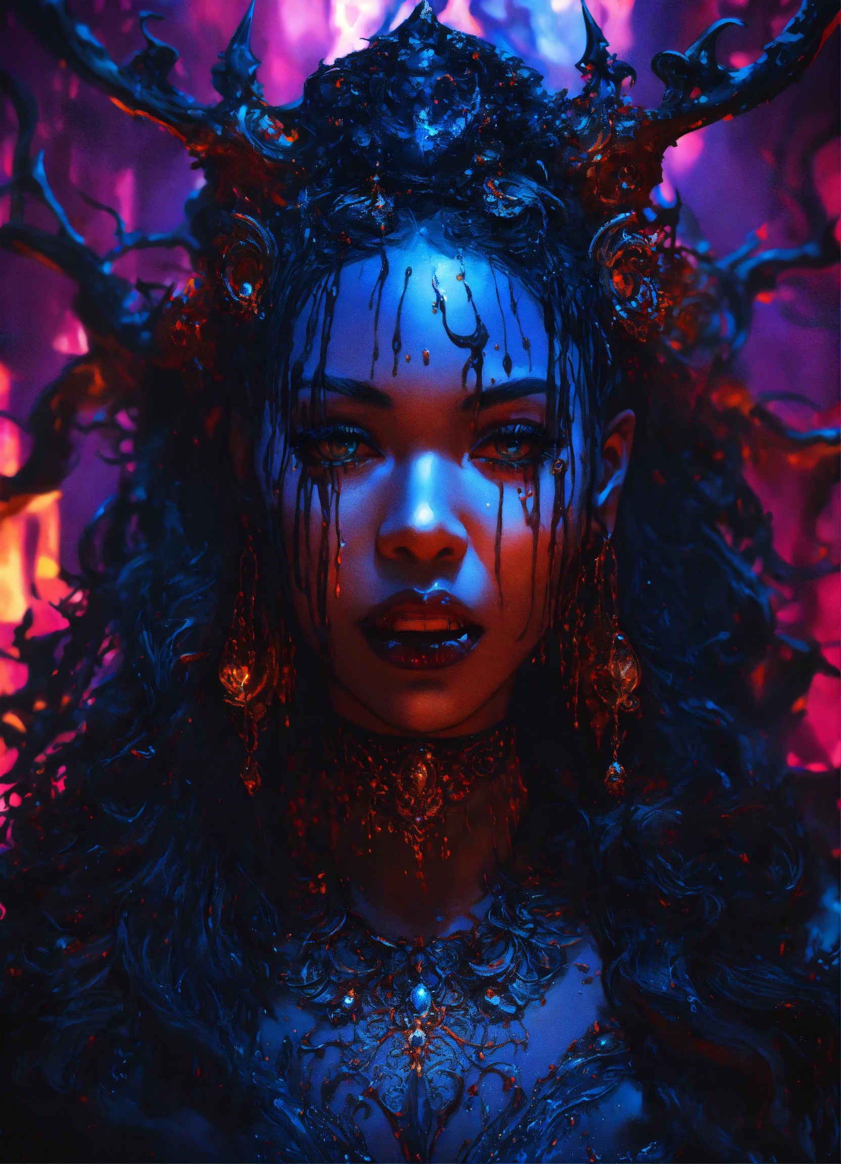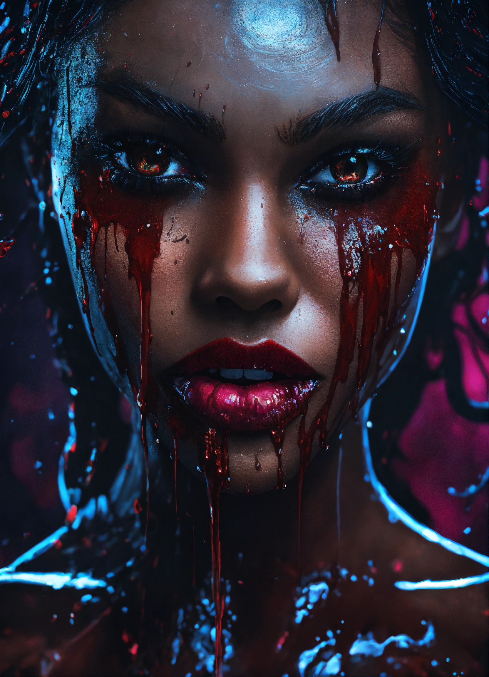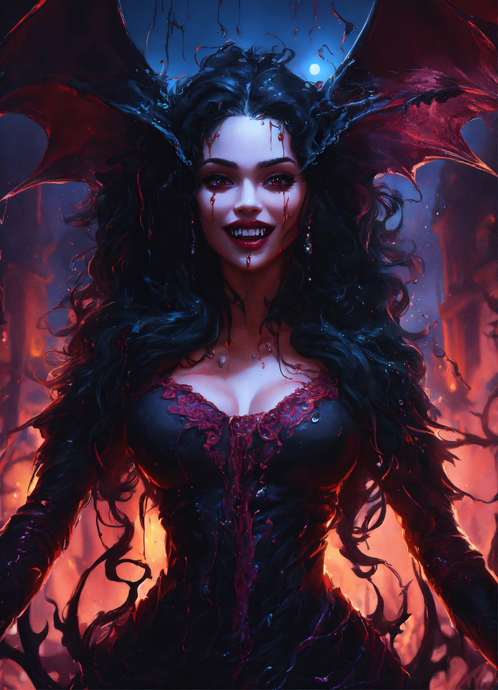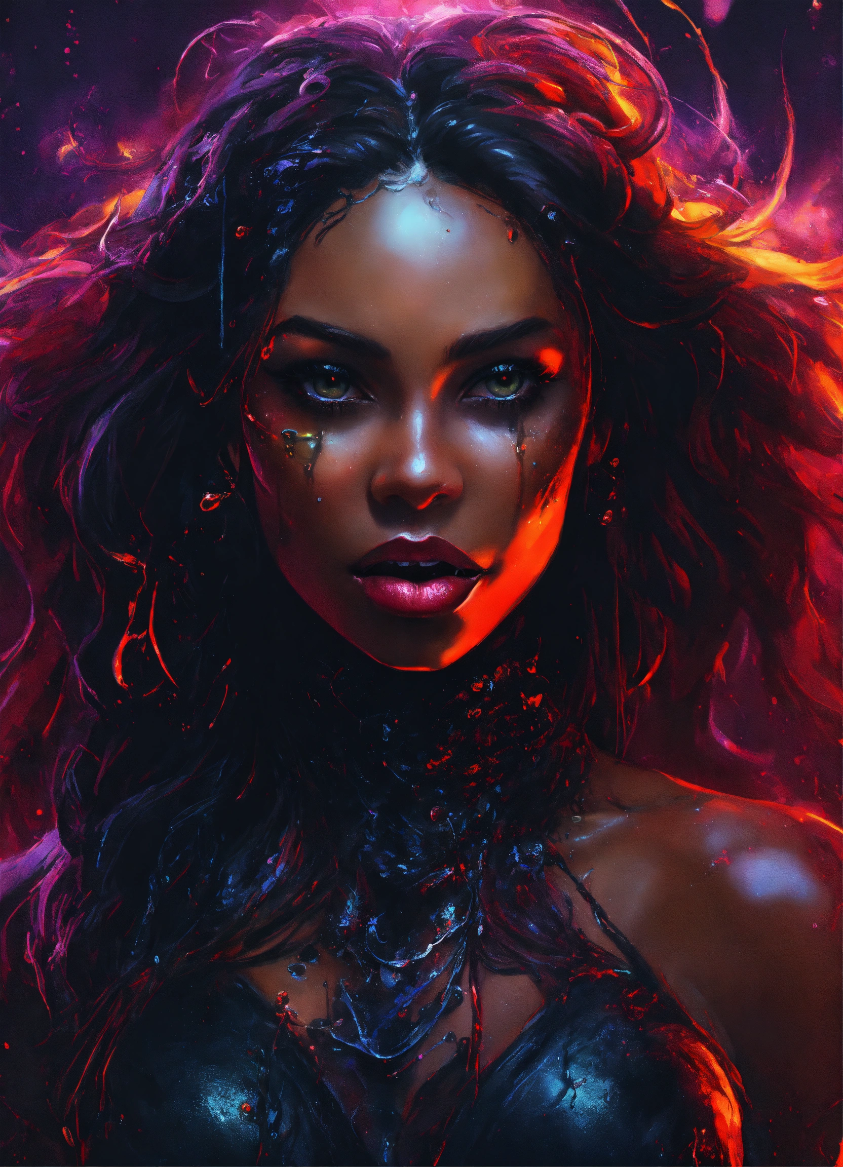 Splash art, a quirky liquid portrait of a hauntingly beautiful dark black vampire woman with fangs, splash style of paint, pixar style, halloween colors, hyper detailed intricately detailed, fantastical, intricate detail, splash screen, liquid, gooey, slime, splashy, fantasy, concept art, 8k resolution, masterpiece, melting, complex background, intricate detailed, dark colors, fantasy, concept art, digital art, intricate, oil on canvas, masterpiece, expert, insanely detailed, 4k resolution.