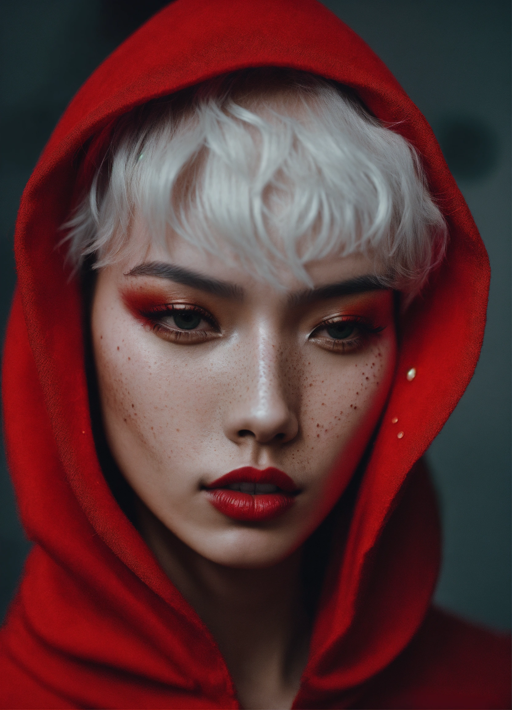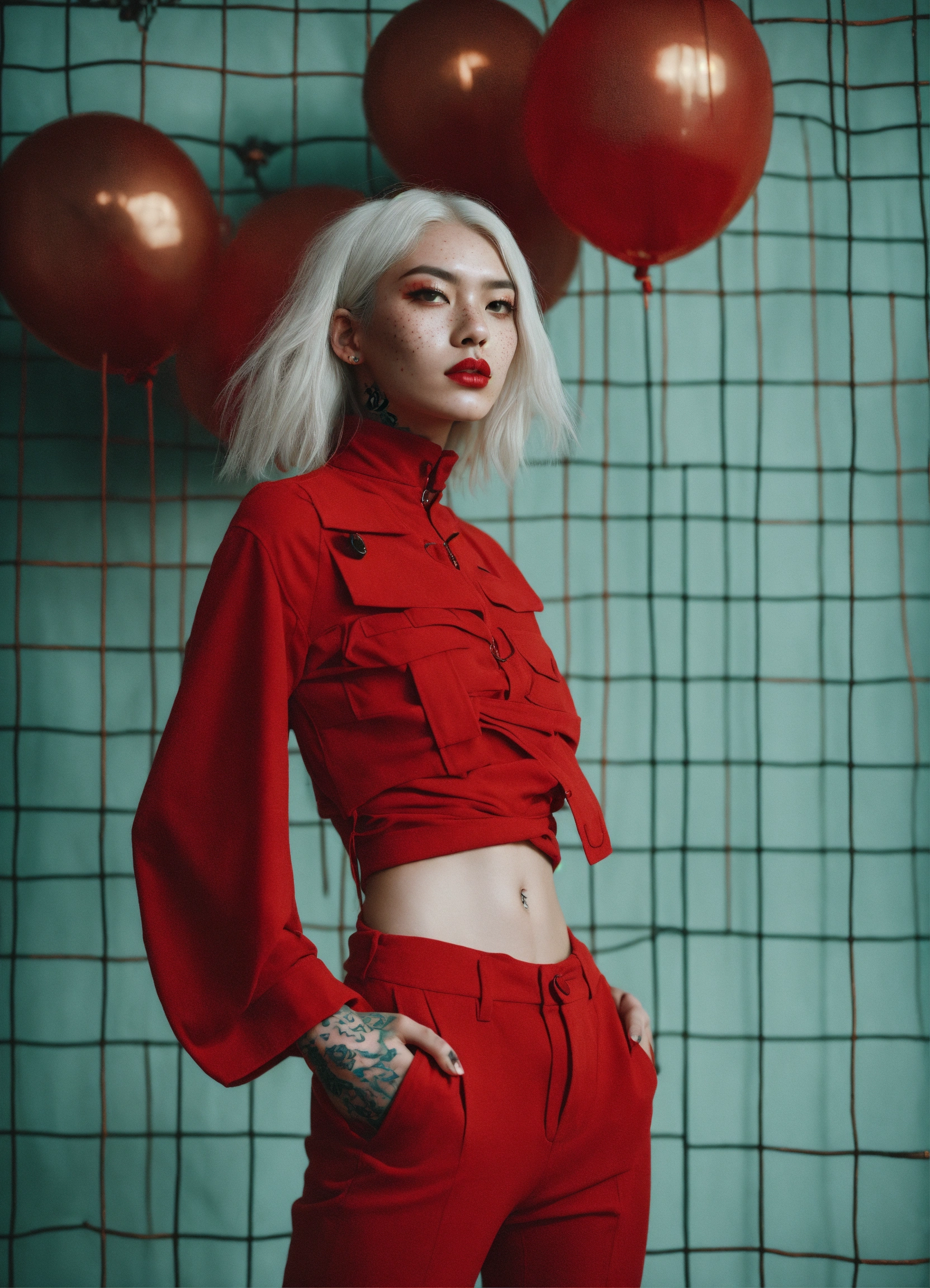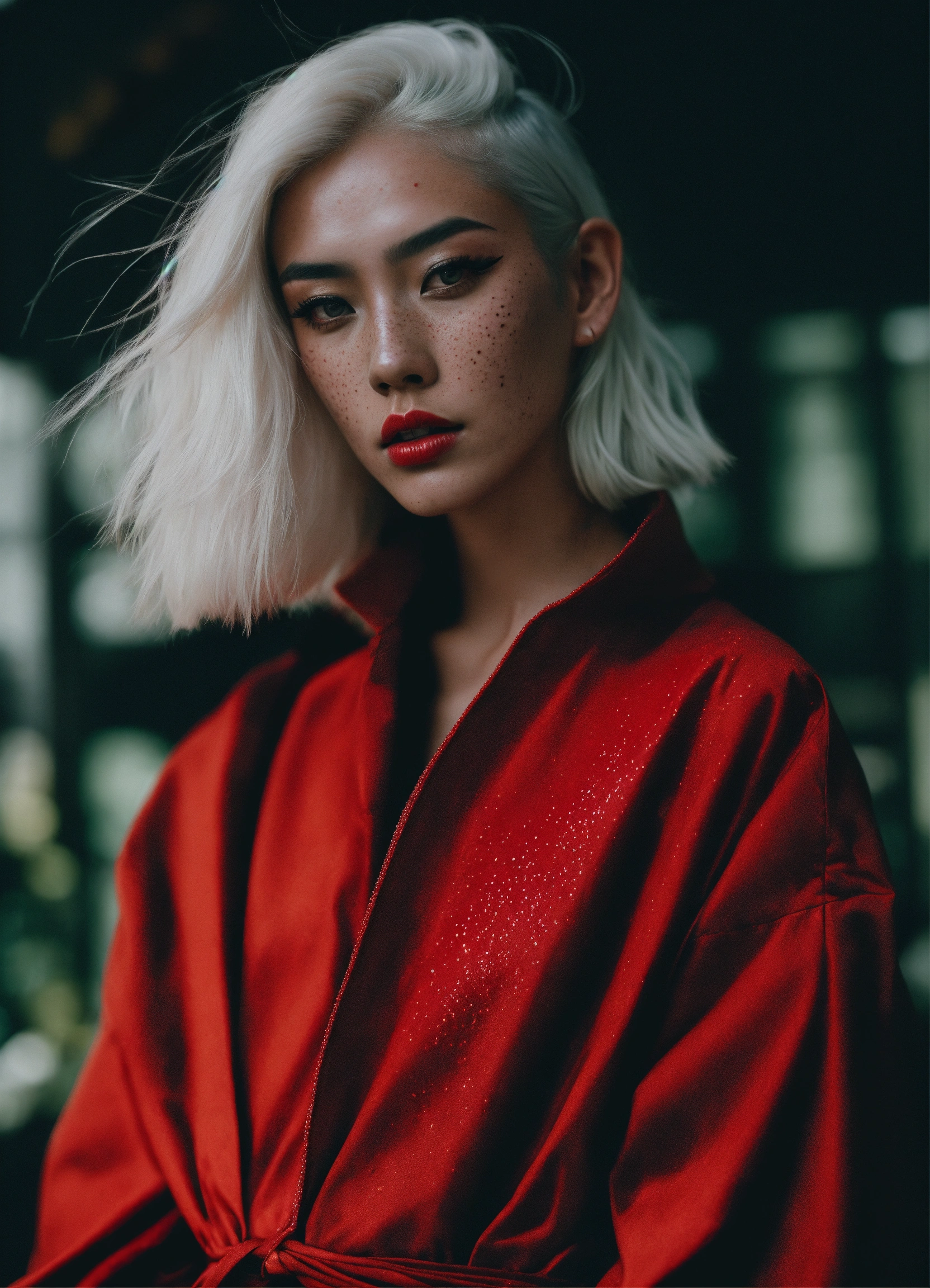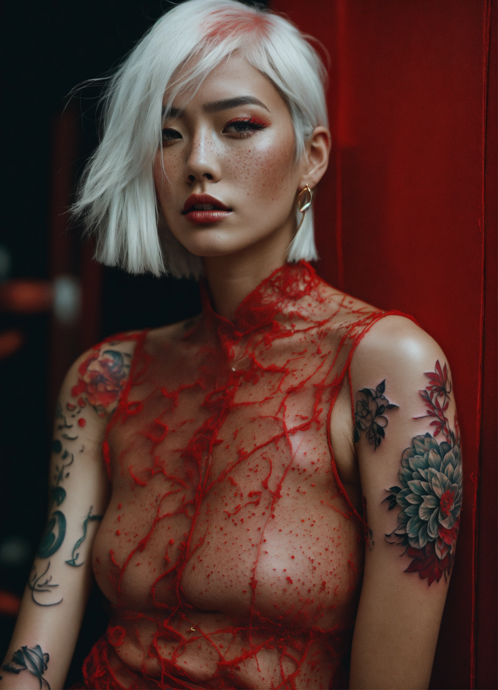 Beautiful model with attitude, asian exótico, white hair with red subtones, freckles, haris nukem, editorial magazine, full body, fashion photography, high future fashion, alessio albi photographer, halo, body tattoo