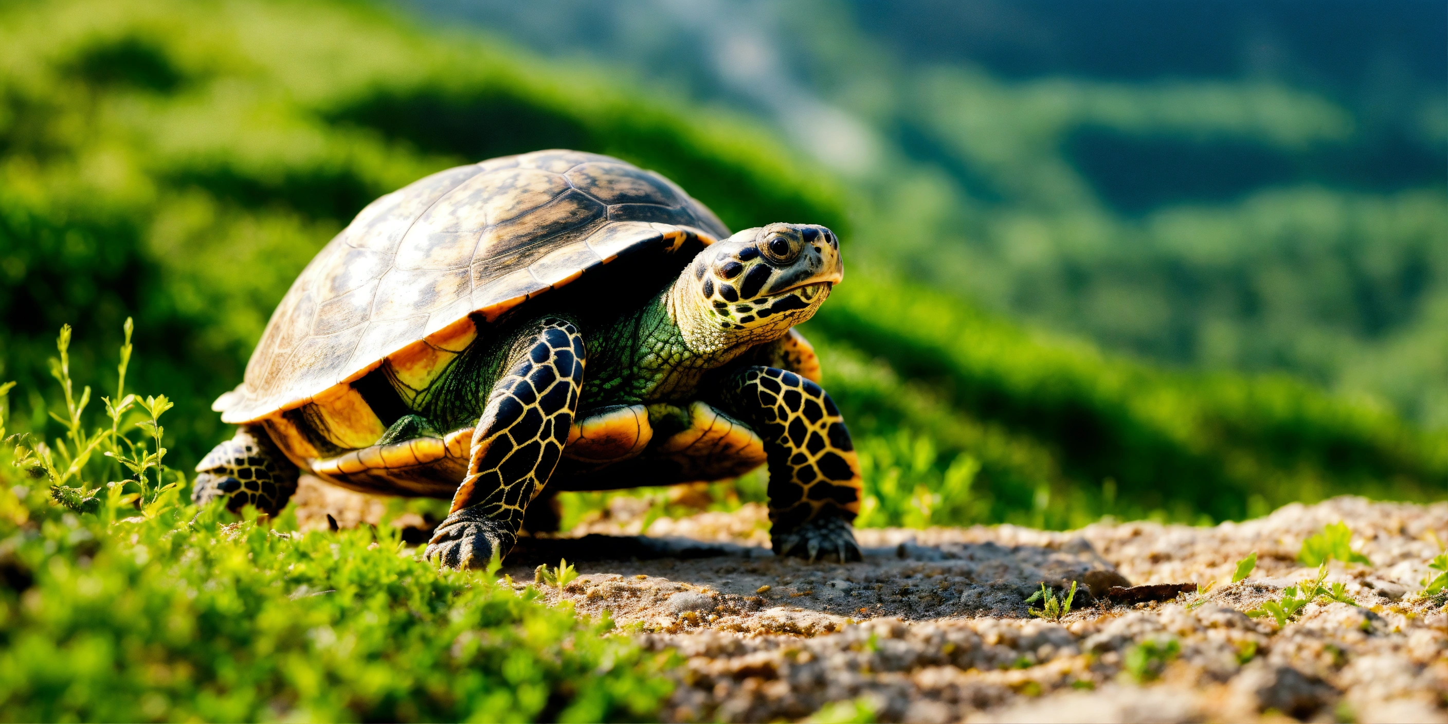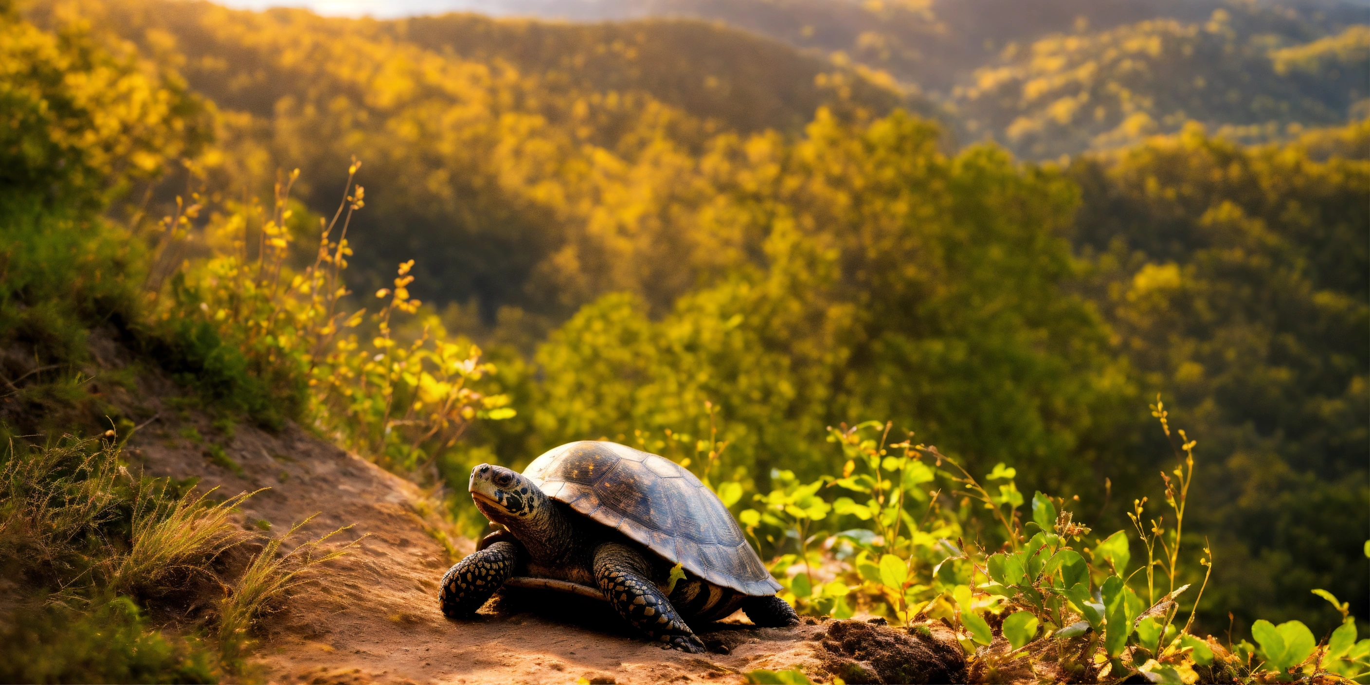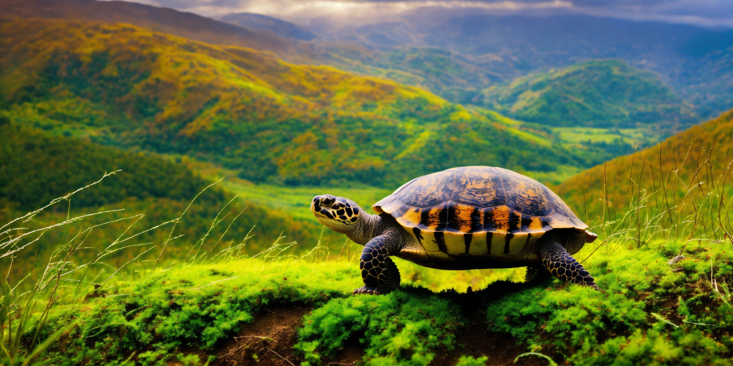 Échelle évolutive une tortue gravissant lentement une échelle spirale qui s'enroule autour d'une montagne. chaque échelon est marqué d'un mot-clé lié à la croissance personnelle (comme "apprentissage", "patience", "résilience").