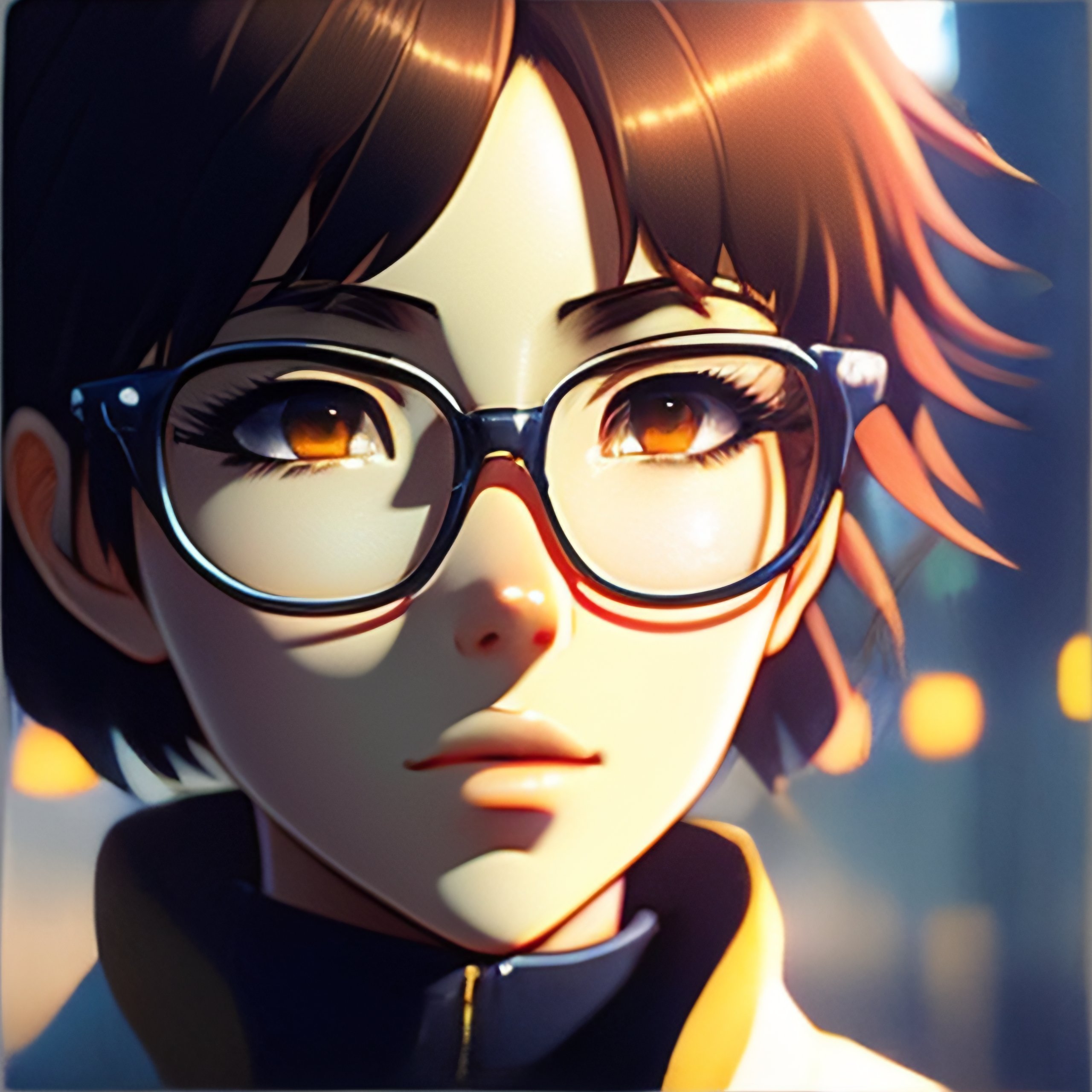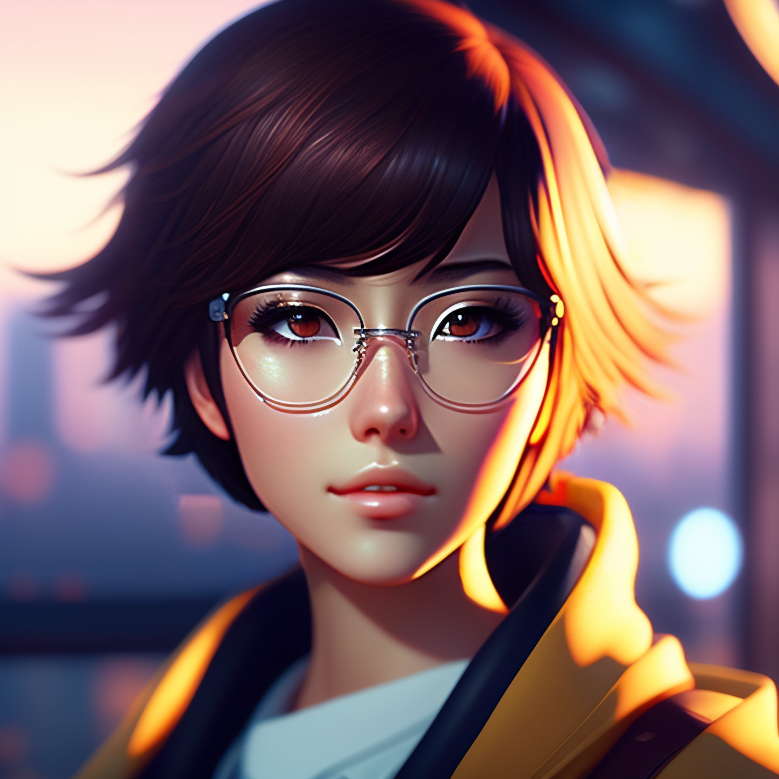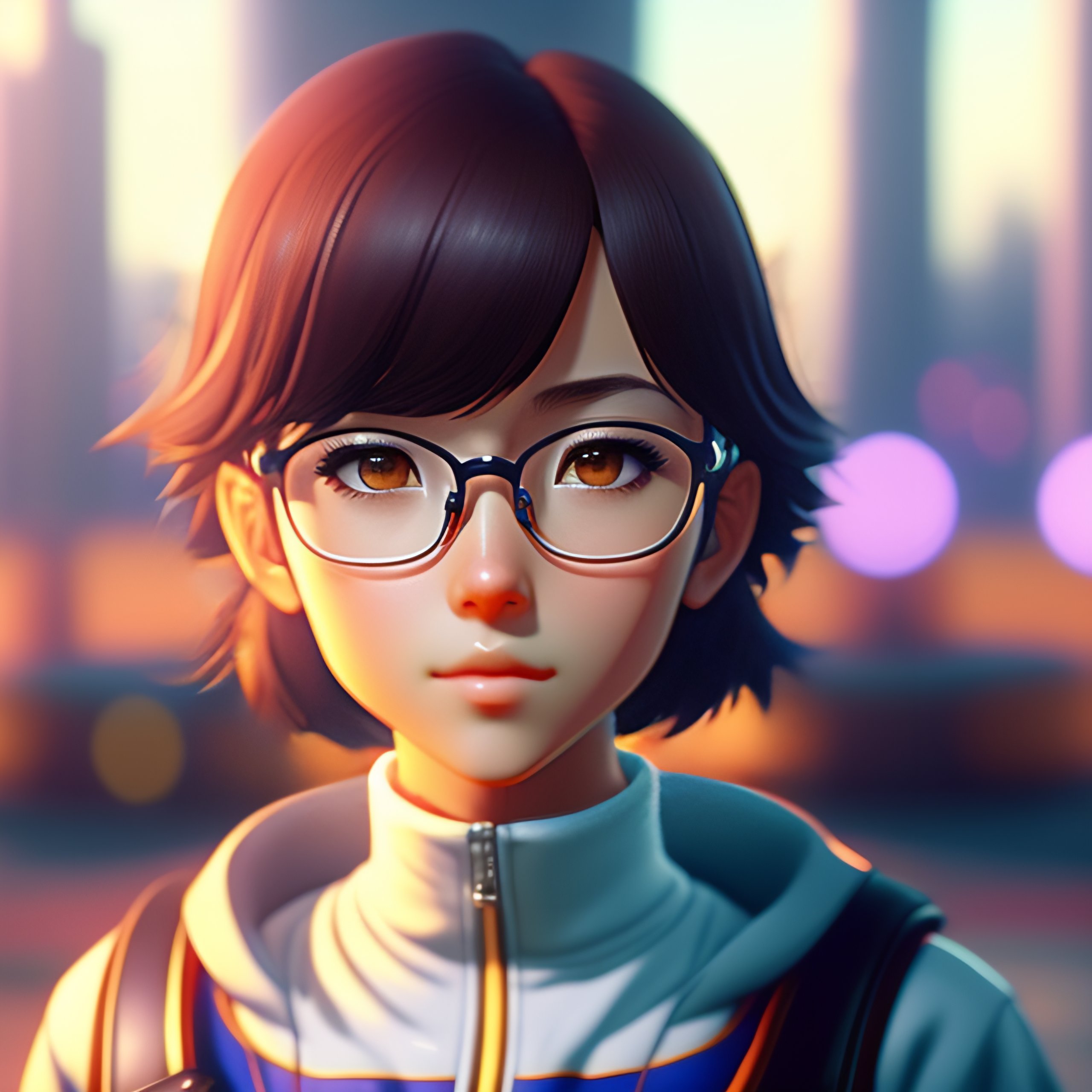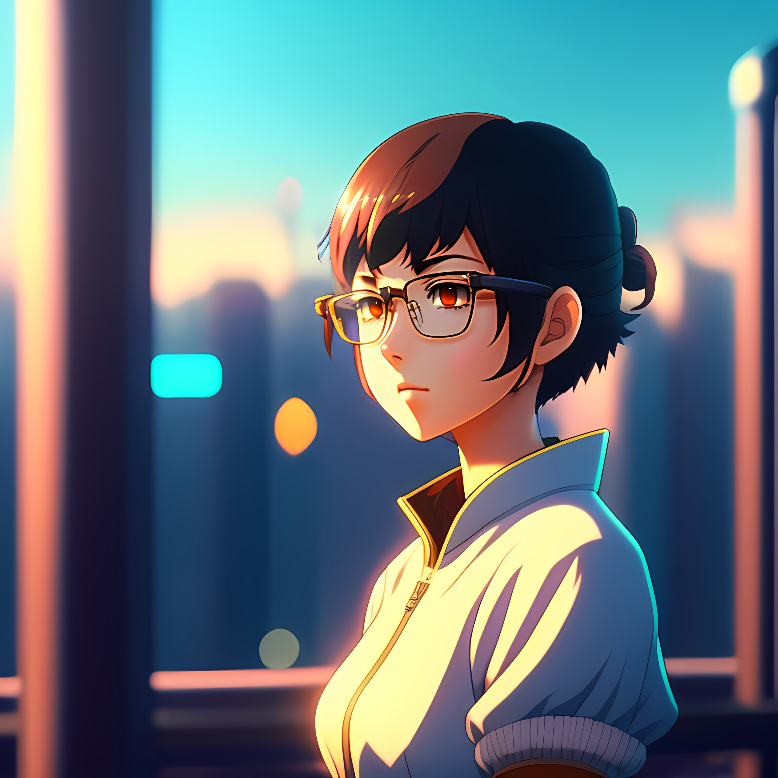 Anime screenshot anime girl with short brown hair and brown eyes and round glasses, cyberpunk room landscape on the background, deep bokeh, close-up, anime masterpiece by studio ghibli. 8k, sharp high quality classic anime from 2000 in style of hayao miyazaki