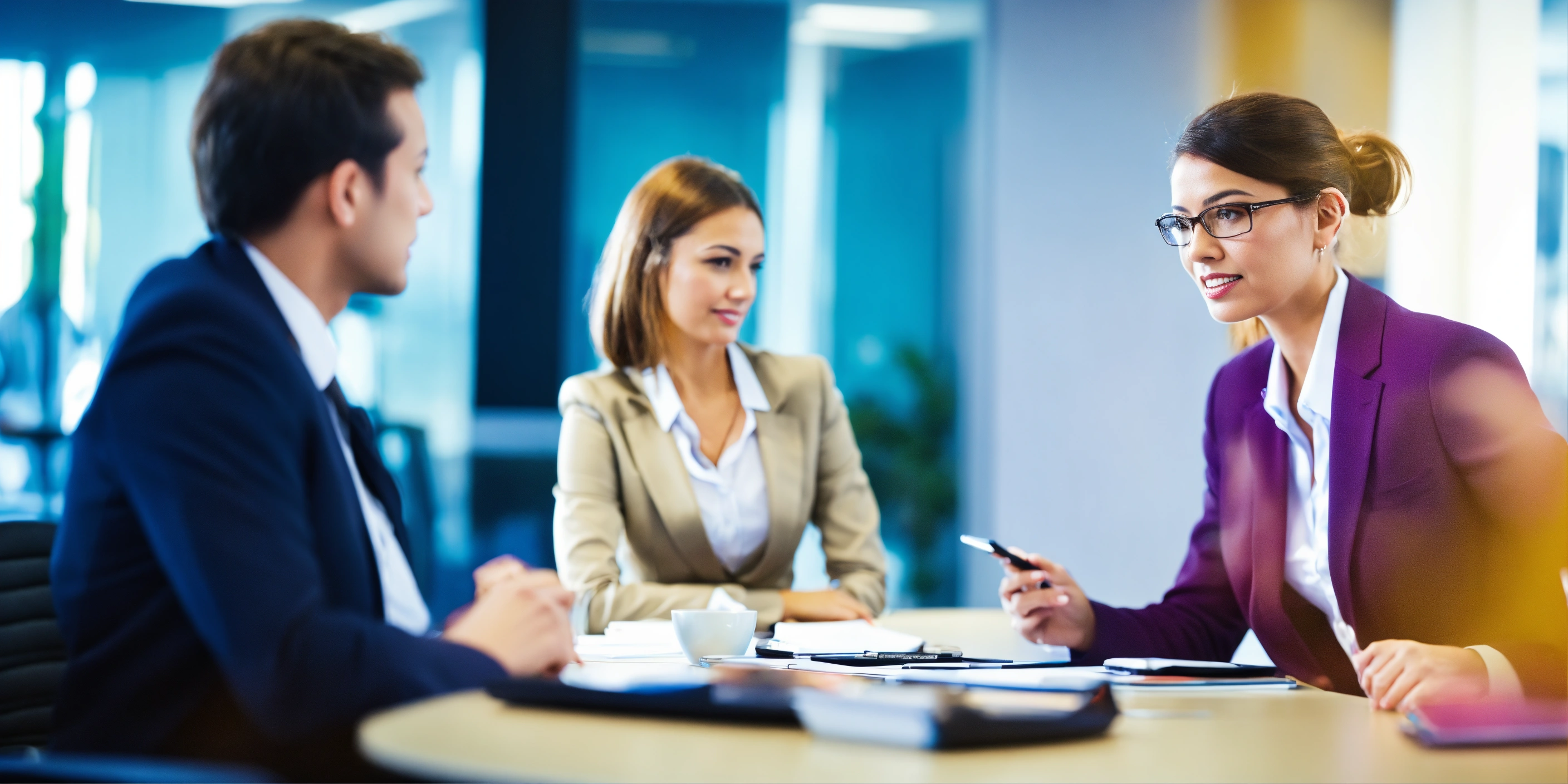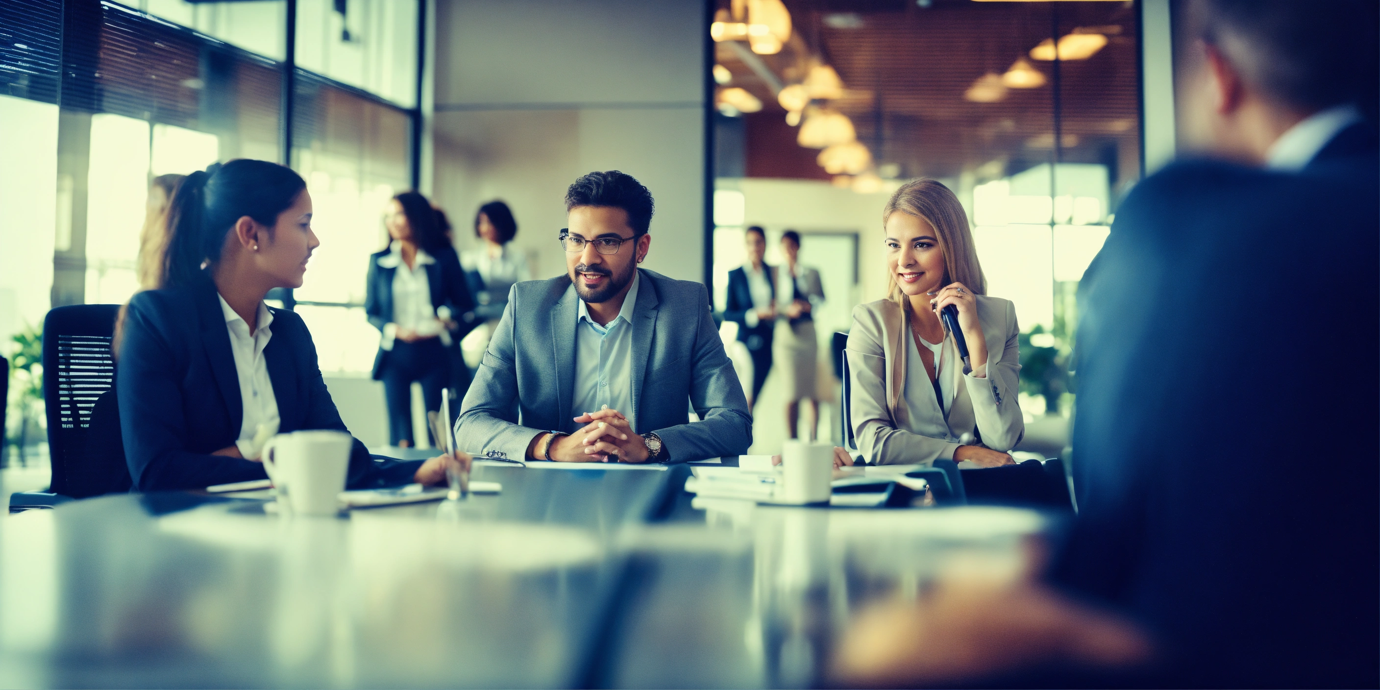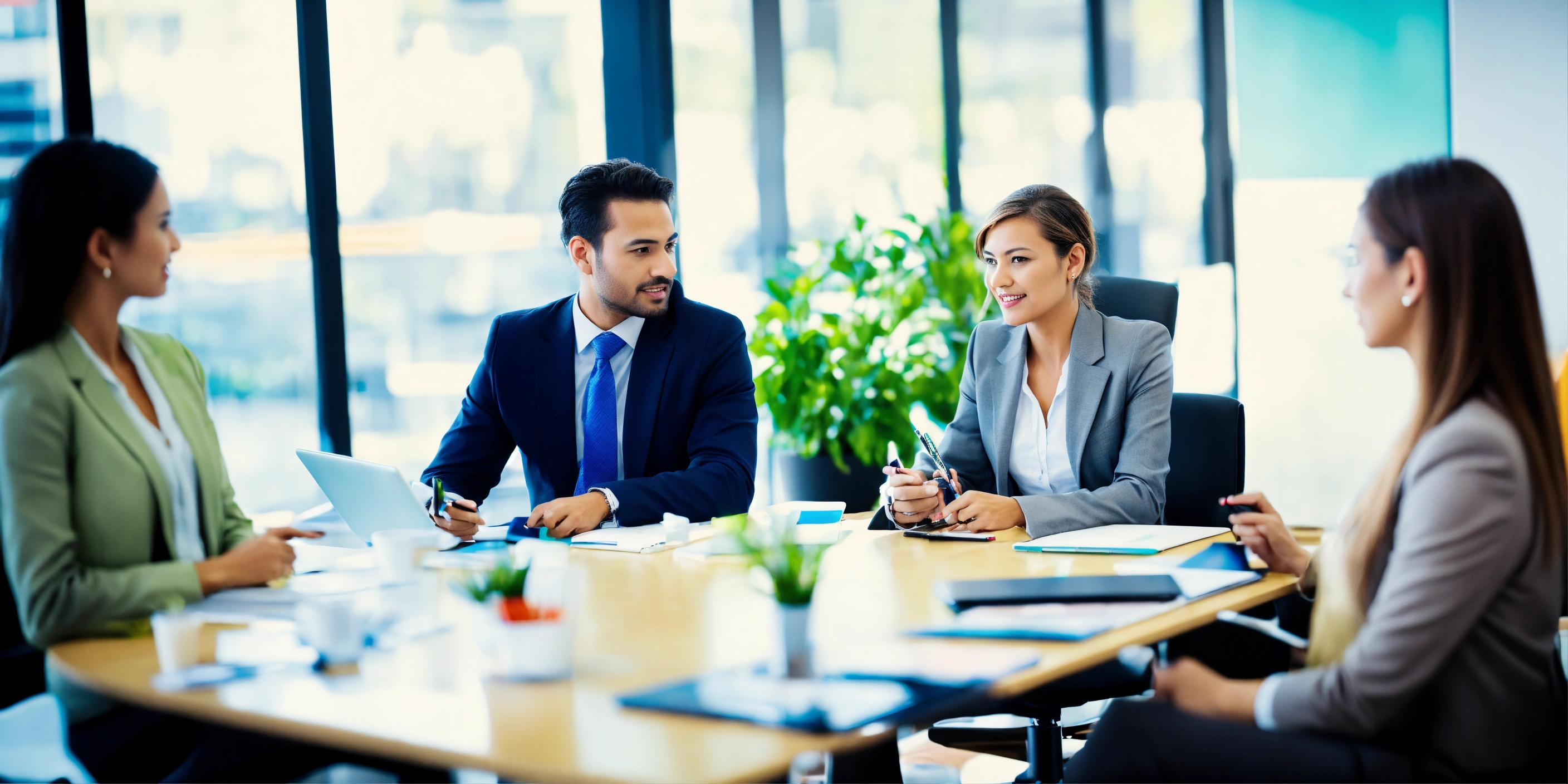 A vibrant image depicts office meeting with business women and business man! in the behind is defocus very modern office
