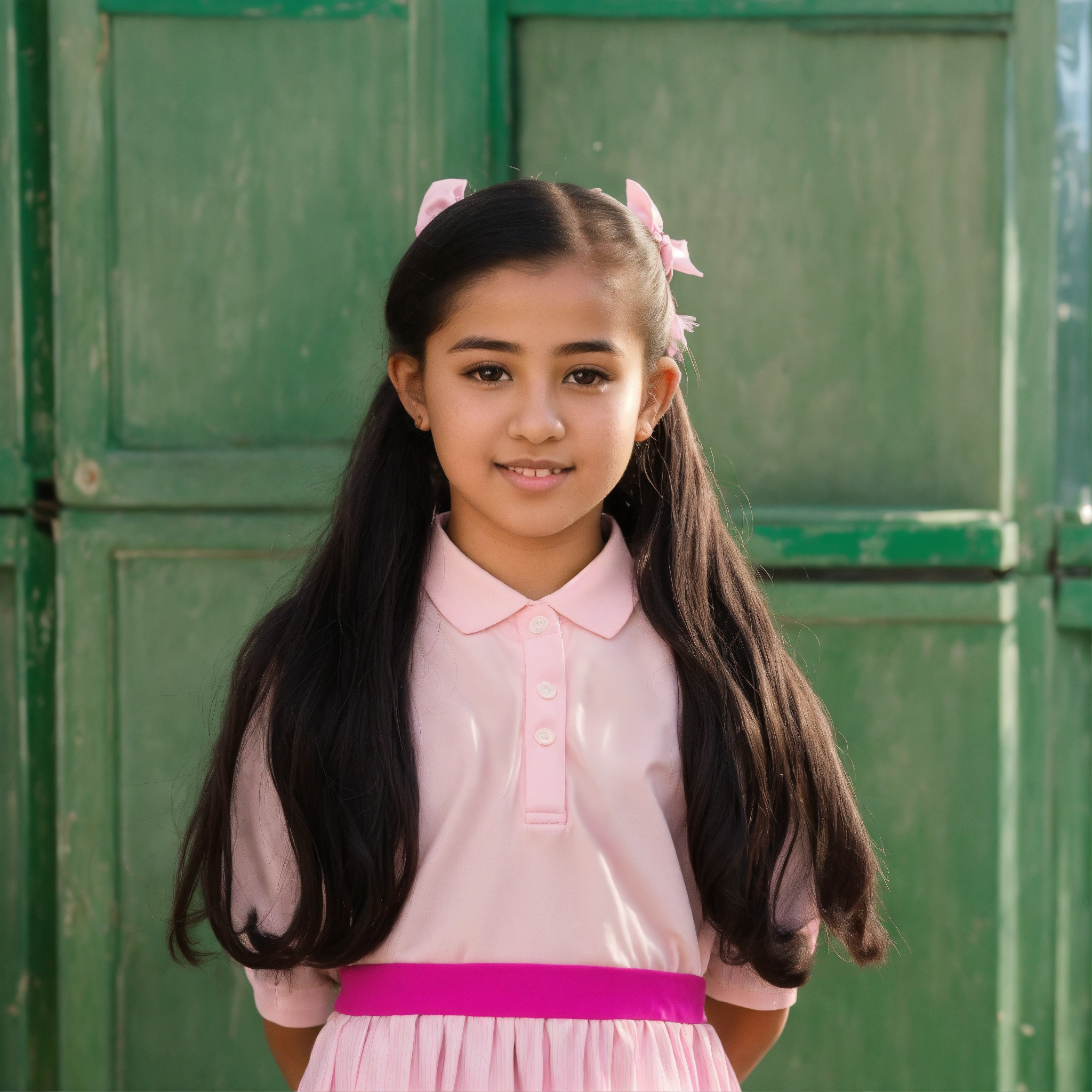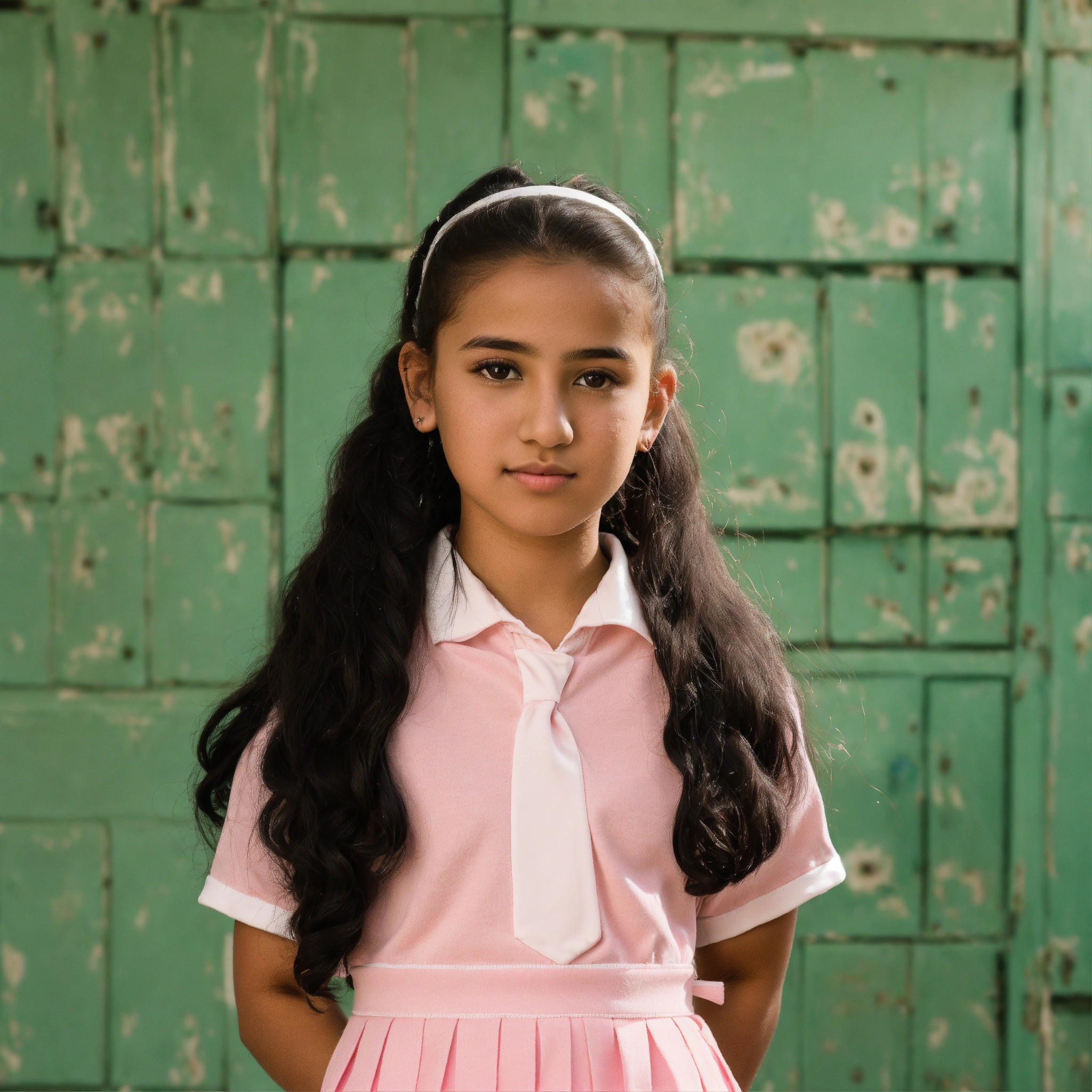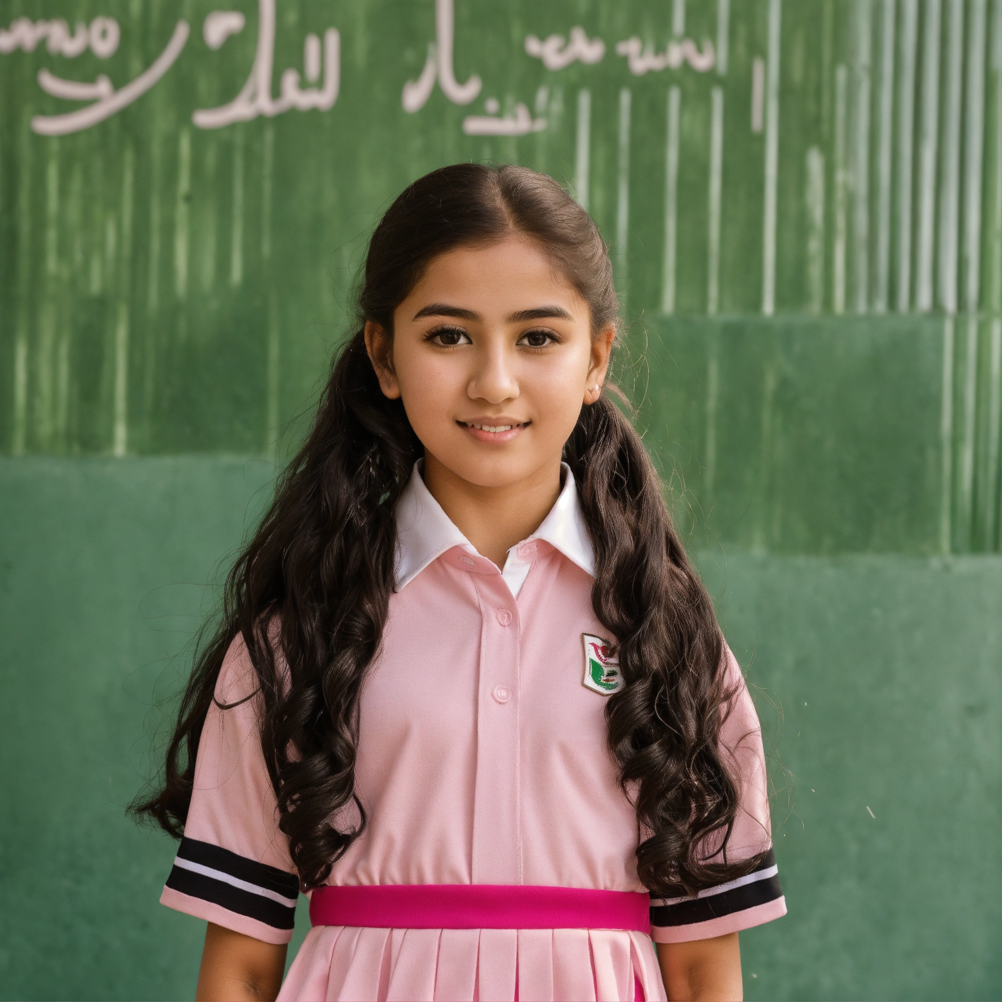 A student from the state of kuwait in the primary stage appears in a school photo in which she wears a school uniform consisting of a long-sleeved, light pink shirt with white stripes and a light pink dress. she has beautiful features, light skin, black eyes, and black hair with a ponytail. she wears black school shoes and white socks.