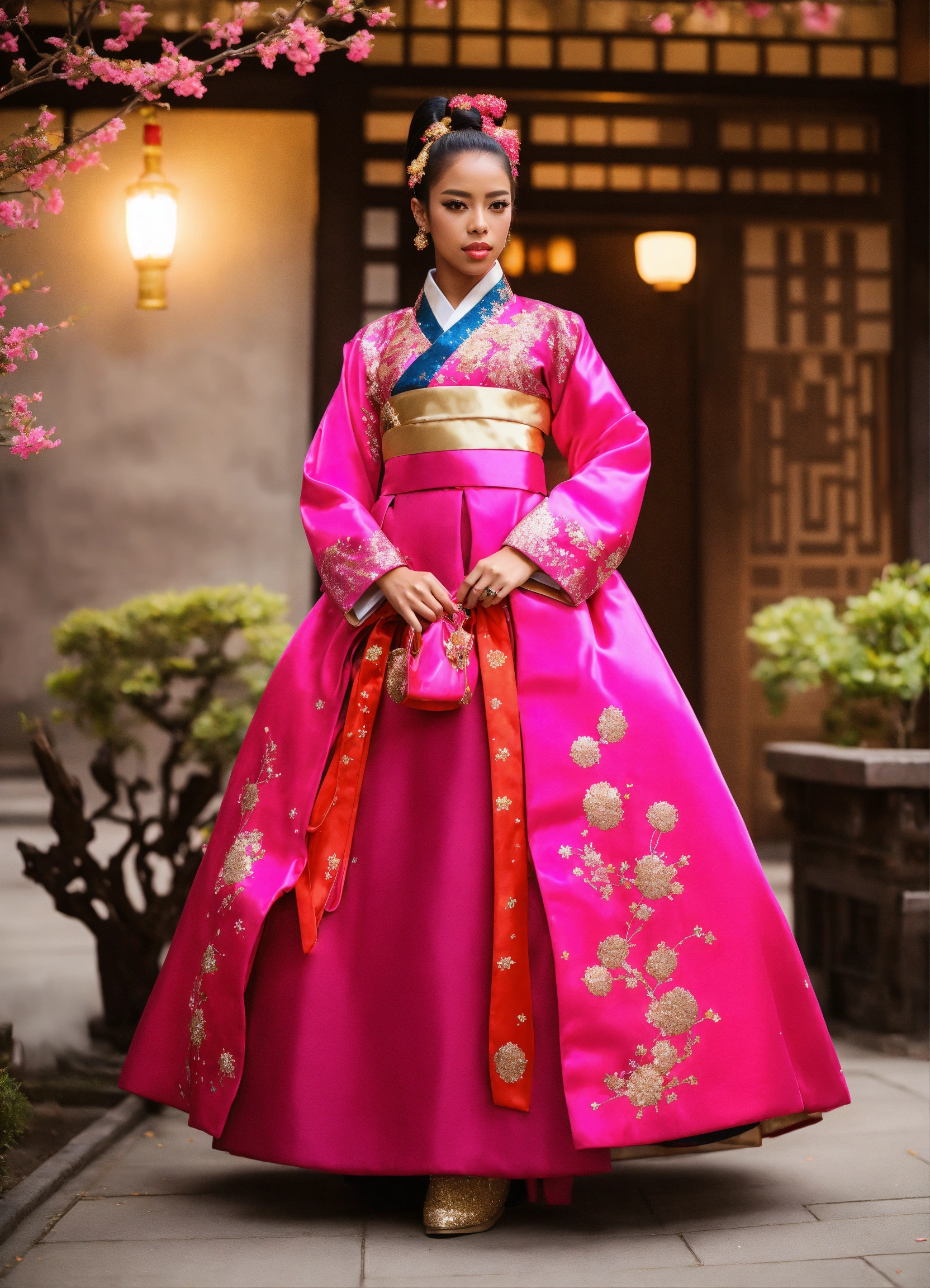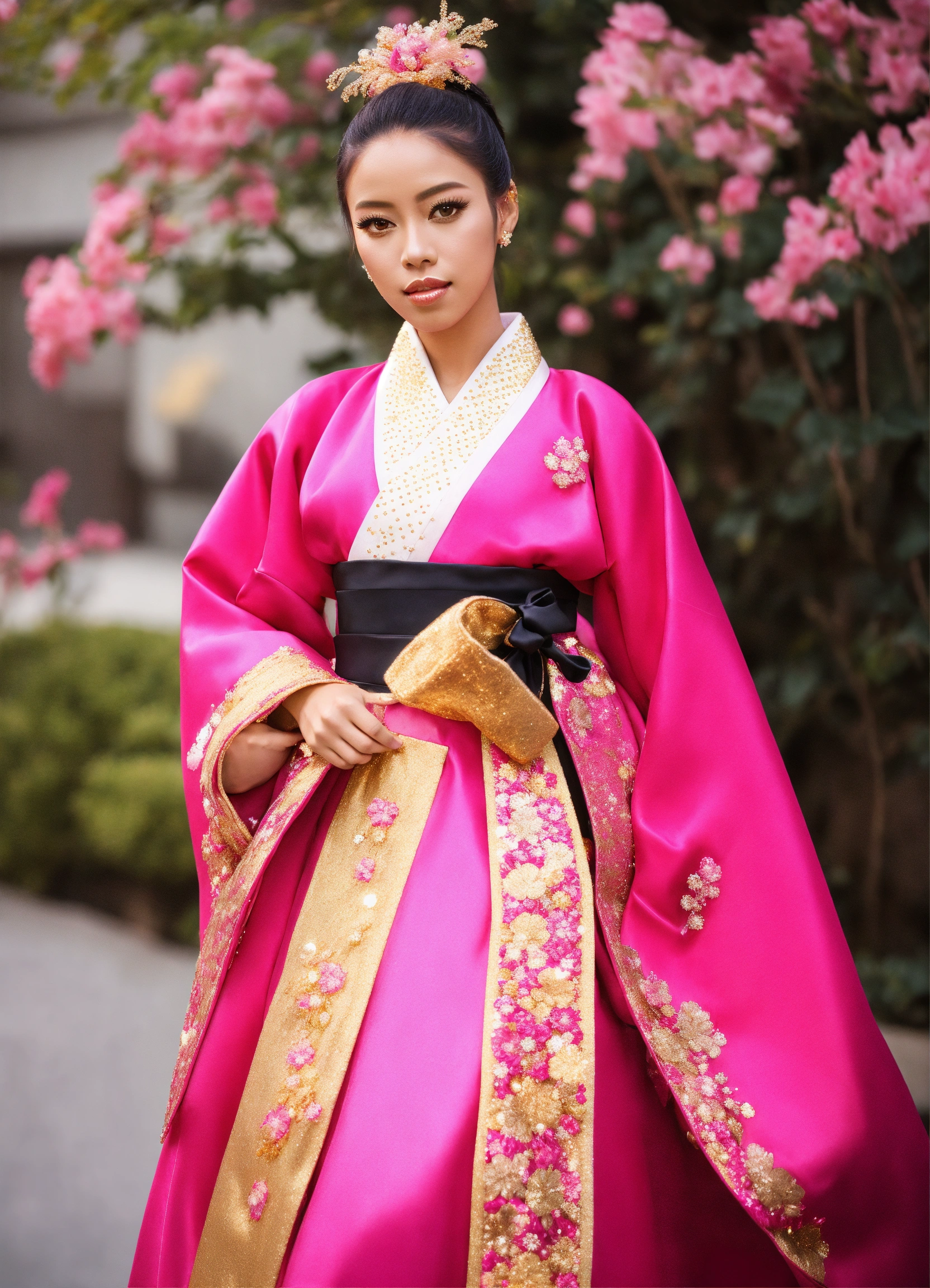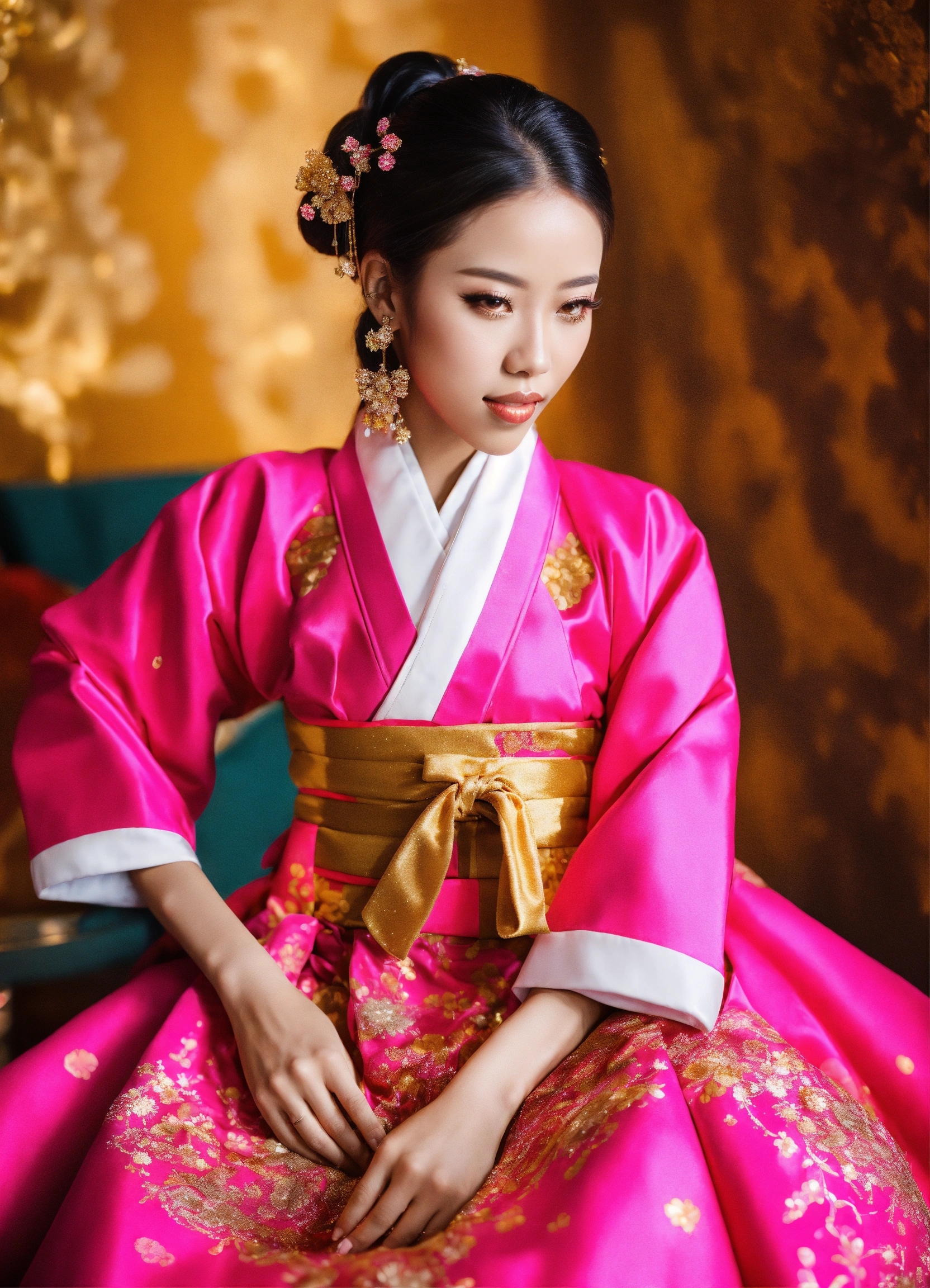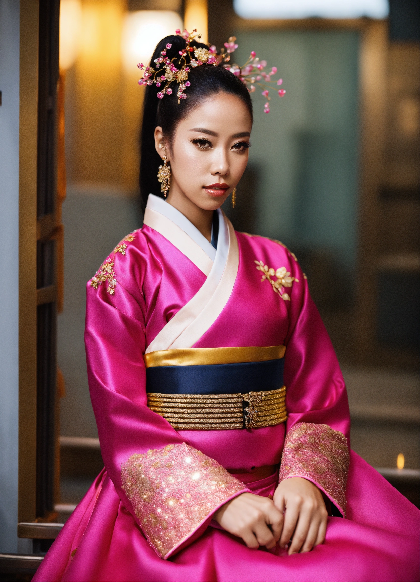 Aaliyah glamorous sparkly diamond studded hot pink and gold modern hanbok with high ponytail