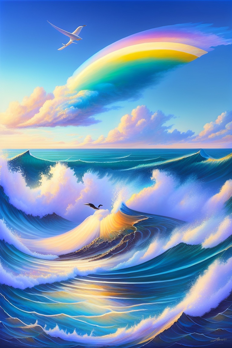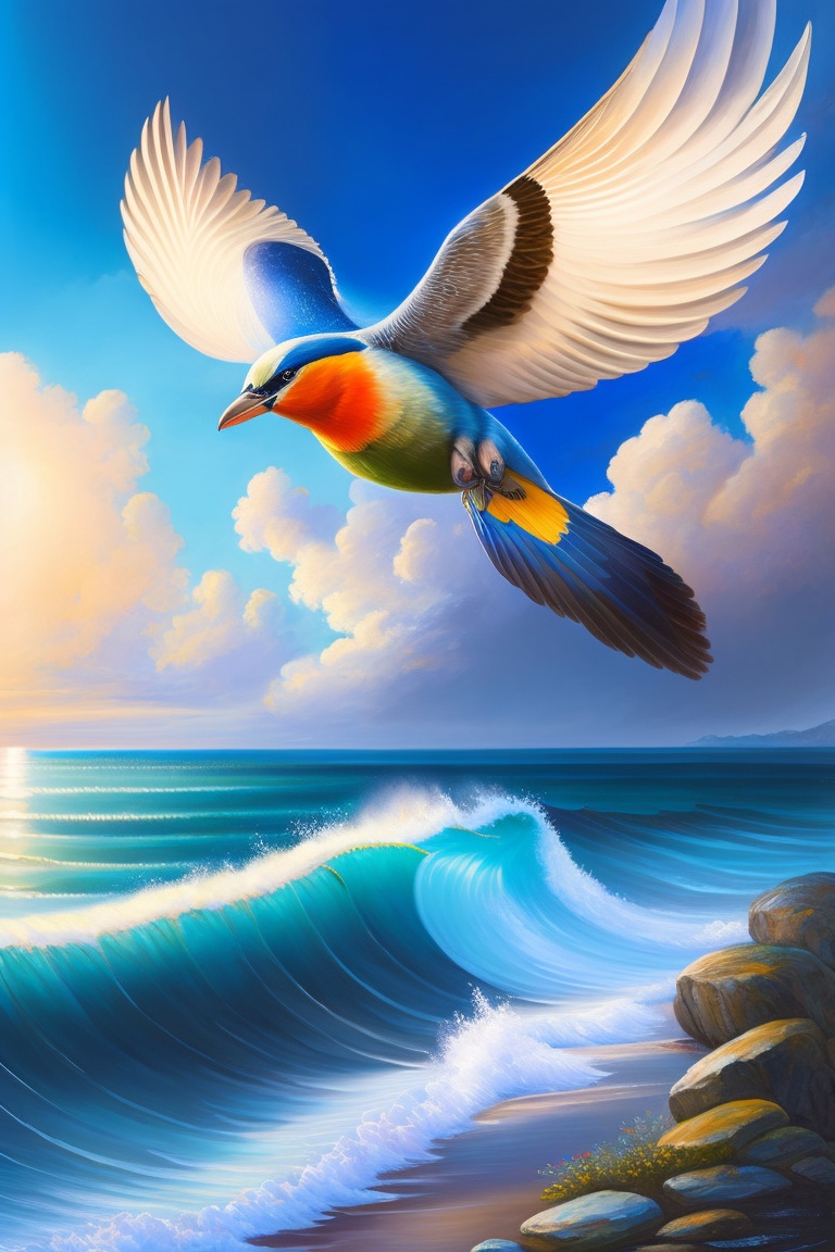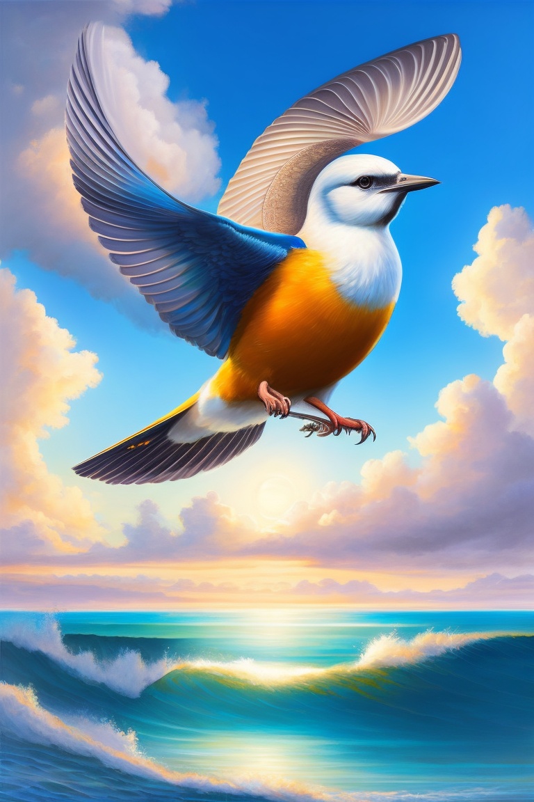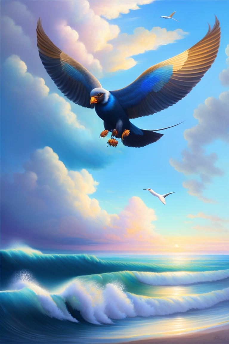 "embrace the freedom within: create an illustration of a bird soaring above an expansive ocean" imagine a captivating illustration capturing the essence of freedom and boundless possibilities. picture a graceful bird, wings outstretched, soaring high above the vast expanse of the ocean. the bird is a symbol of liberation, effortlessly gliding through the open sky, with the shimmering waves of the ocean below reflecting the serenity and tranquility of the moment. use your artistic skills to bring to life the sense of freedom, adventure, and limitless potential that can be found when we embrace the boundless nature of our own spirits.