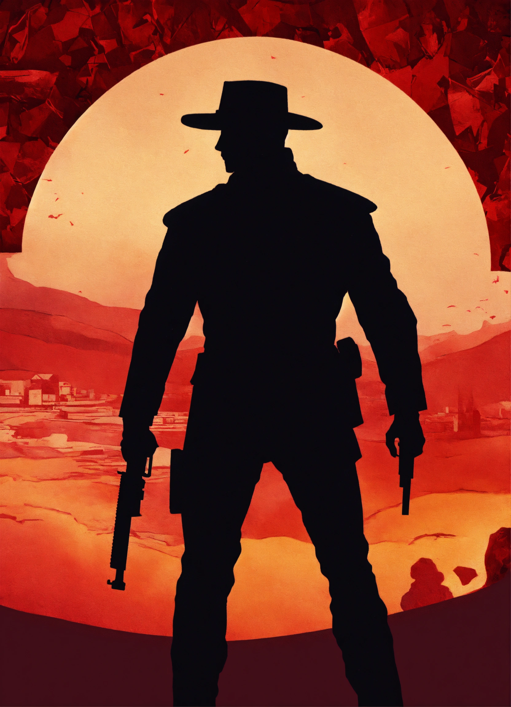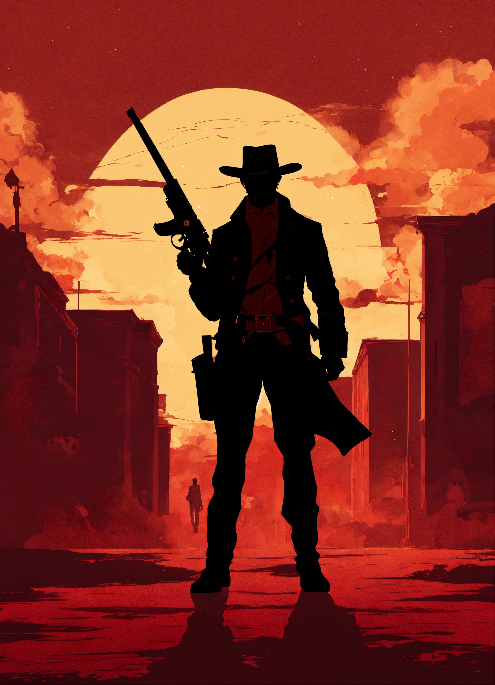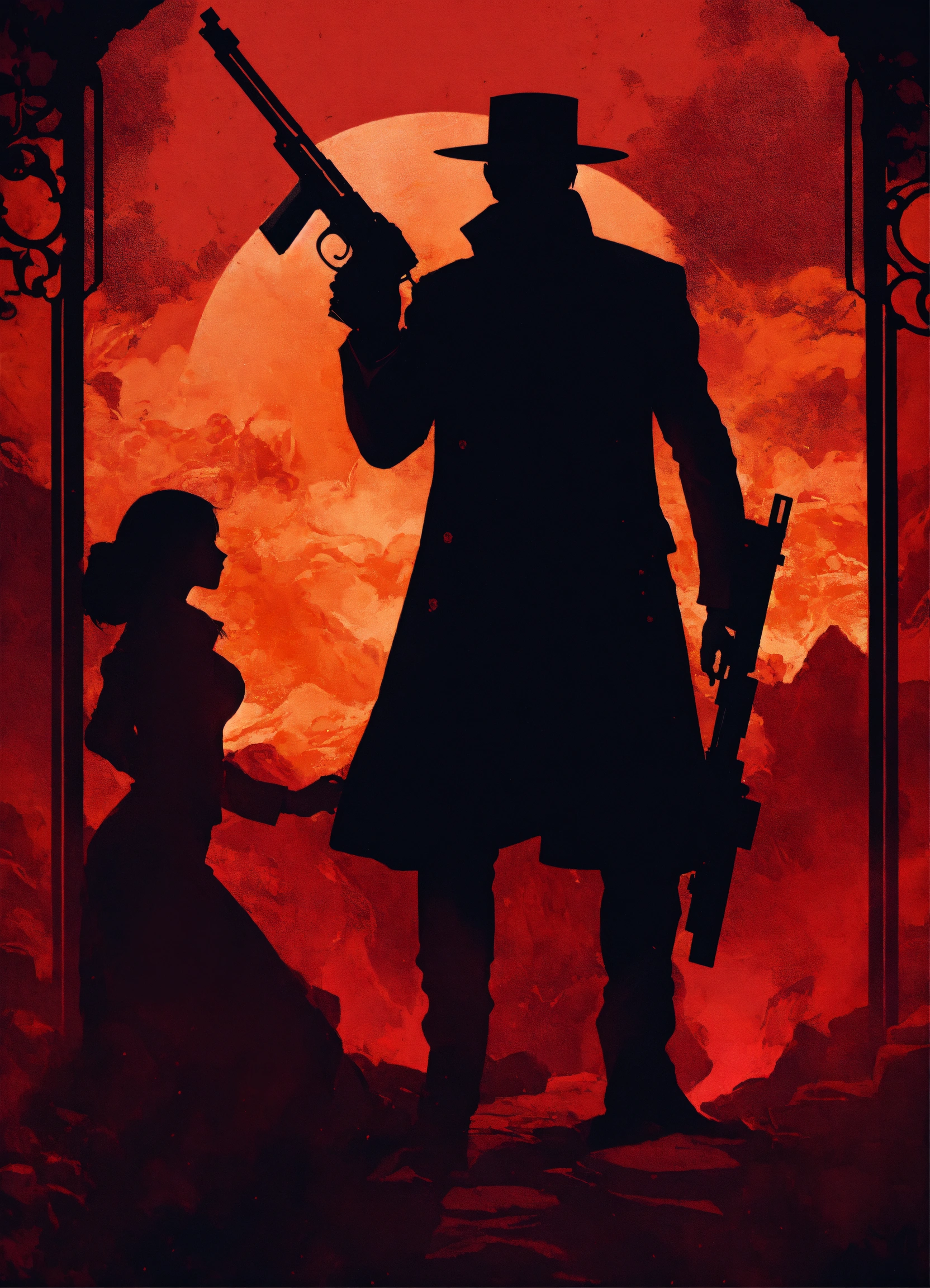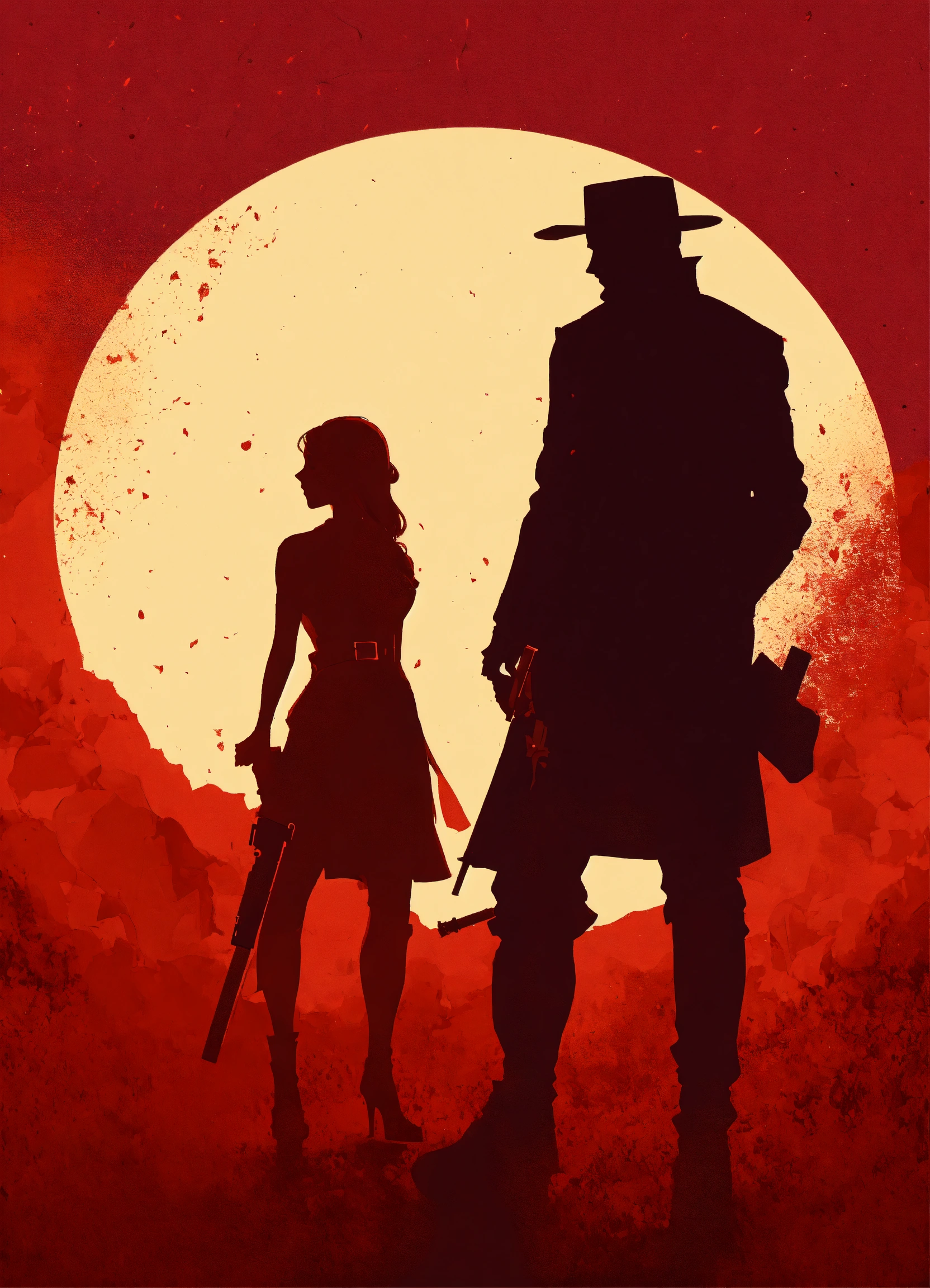 Garnet background with the silhouette of a man with a revolver protecting a woman