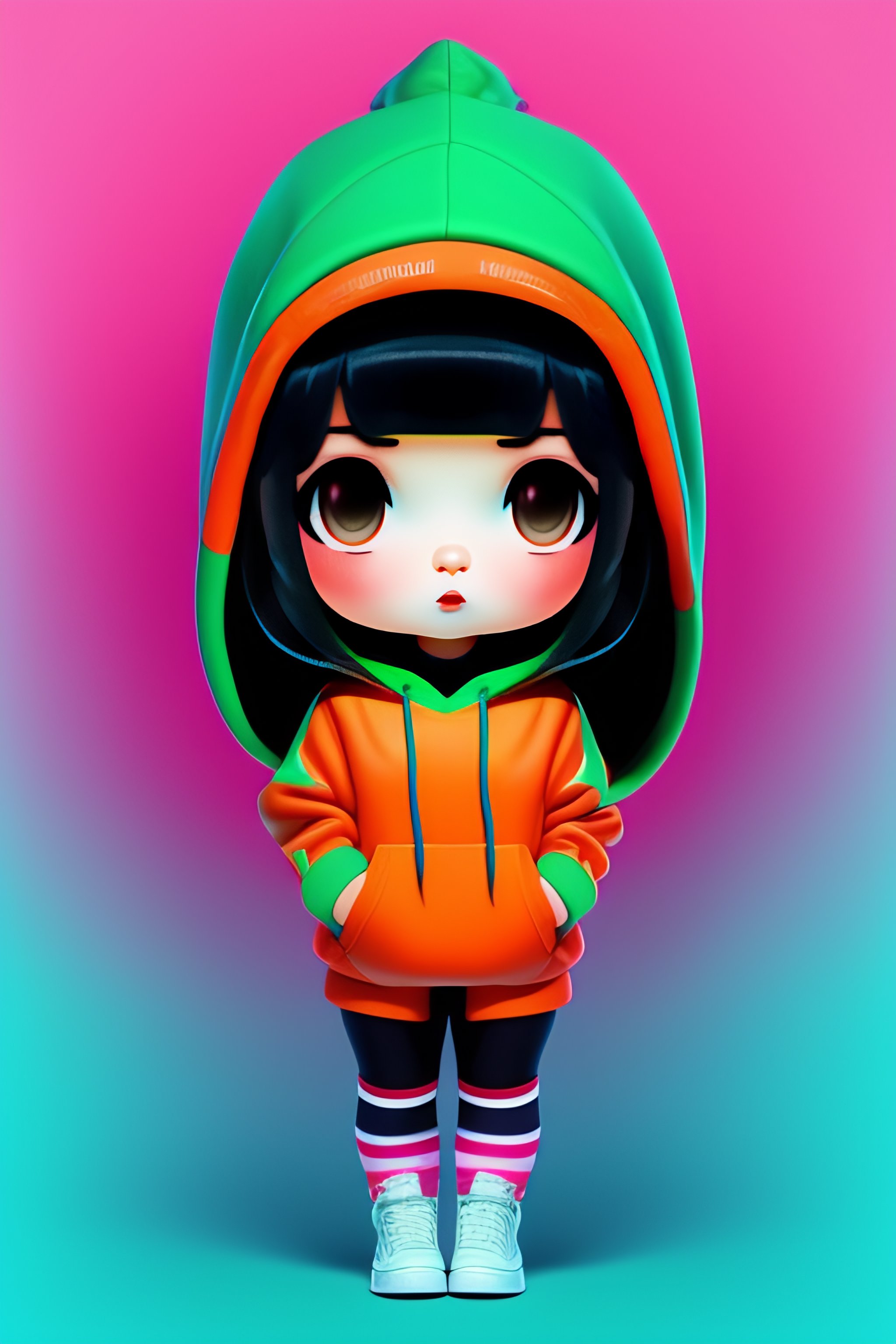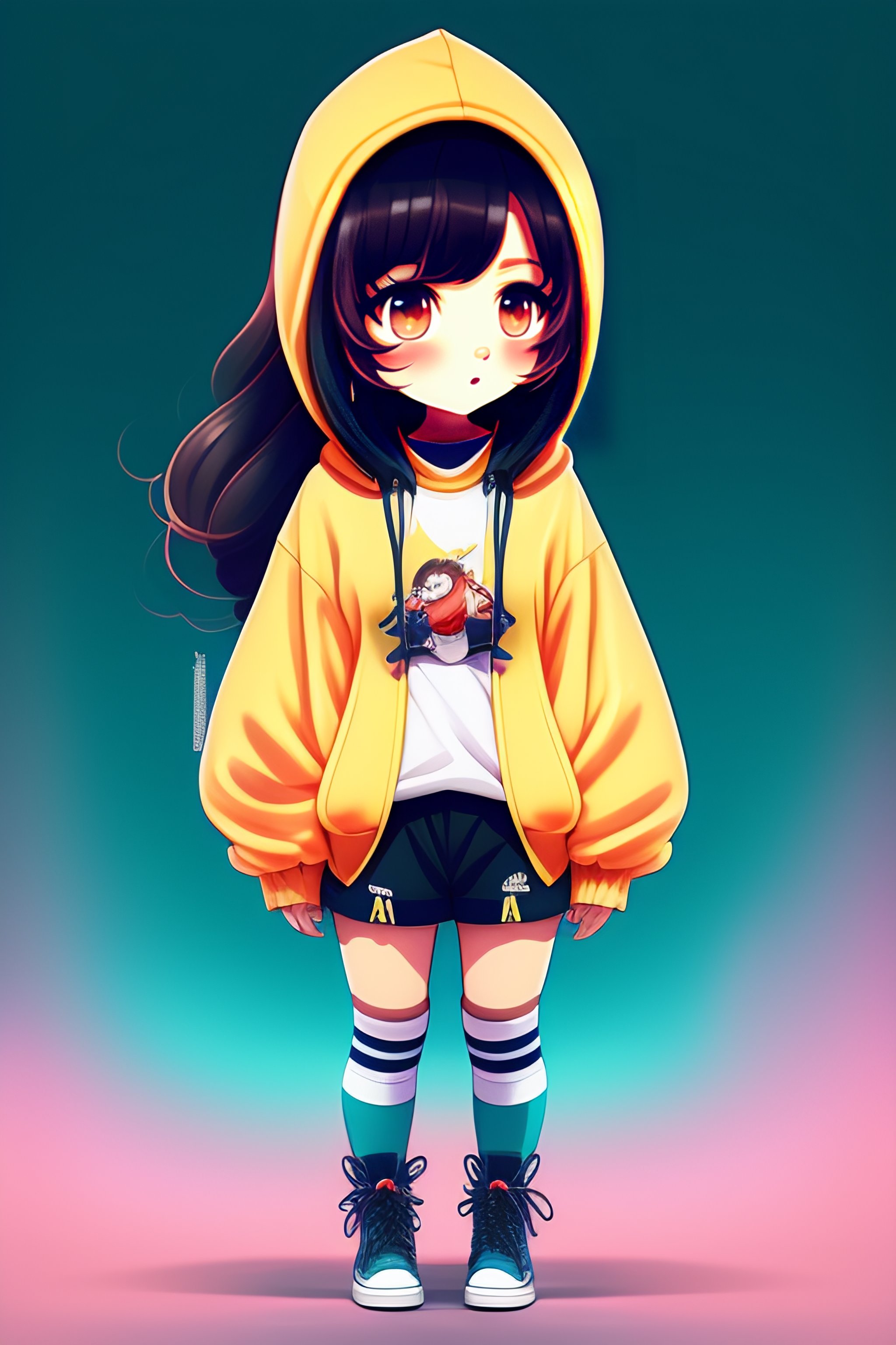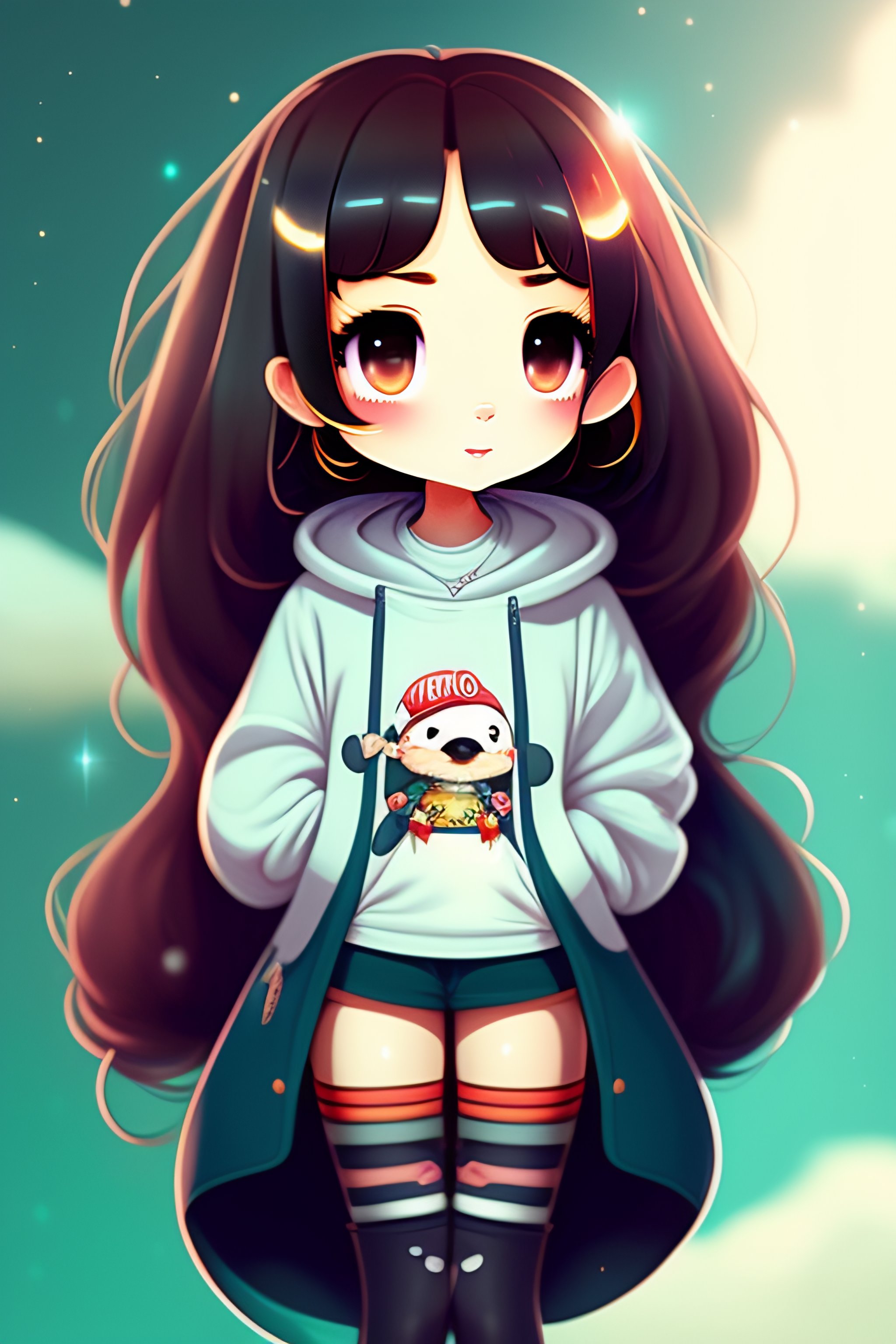 Chibi girl with long hair wearing oversized hoodie and thigh socks