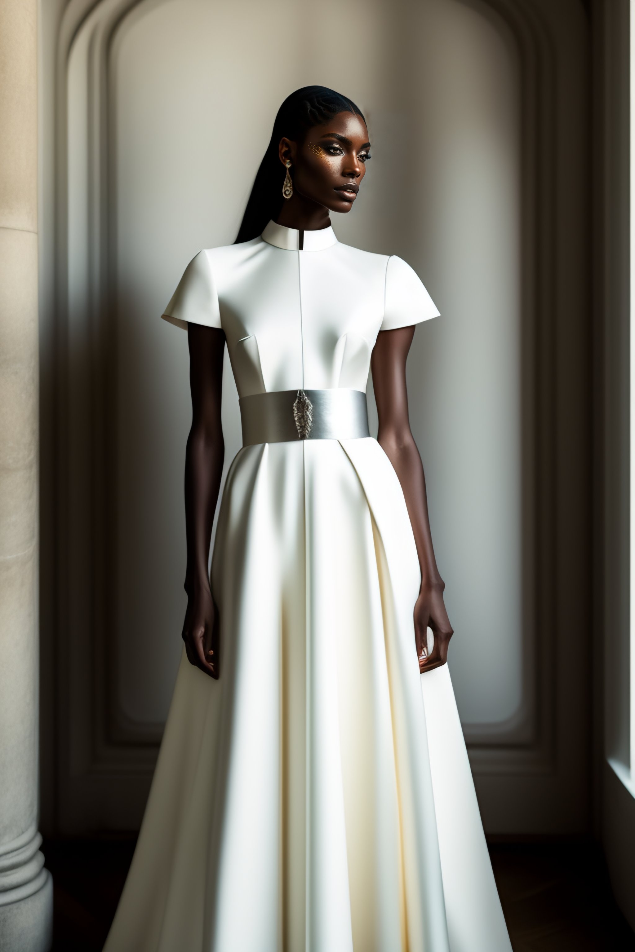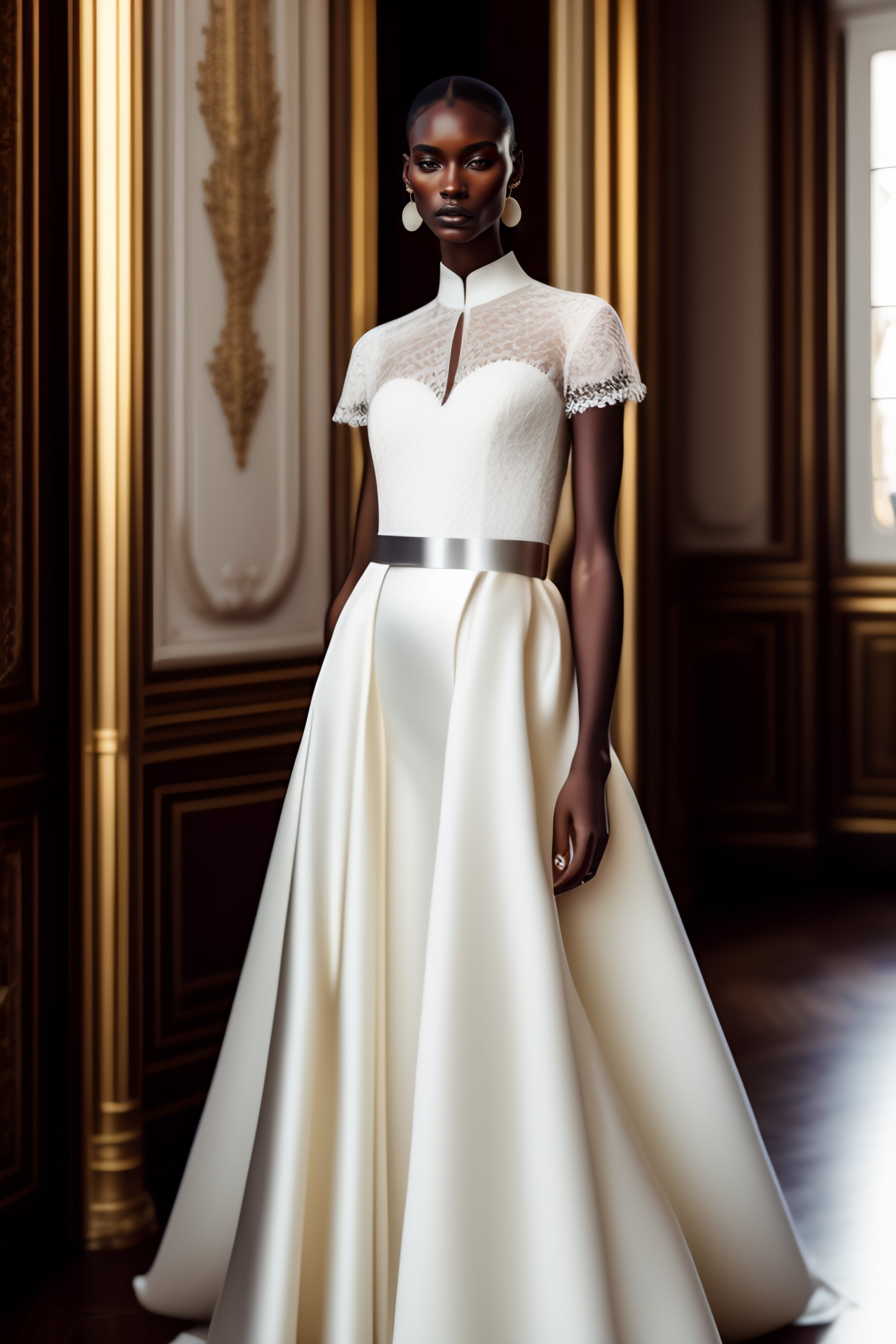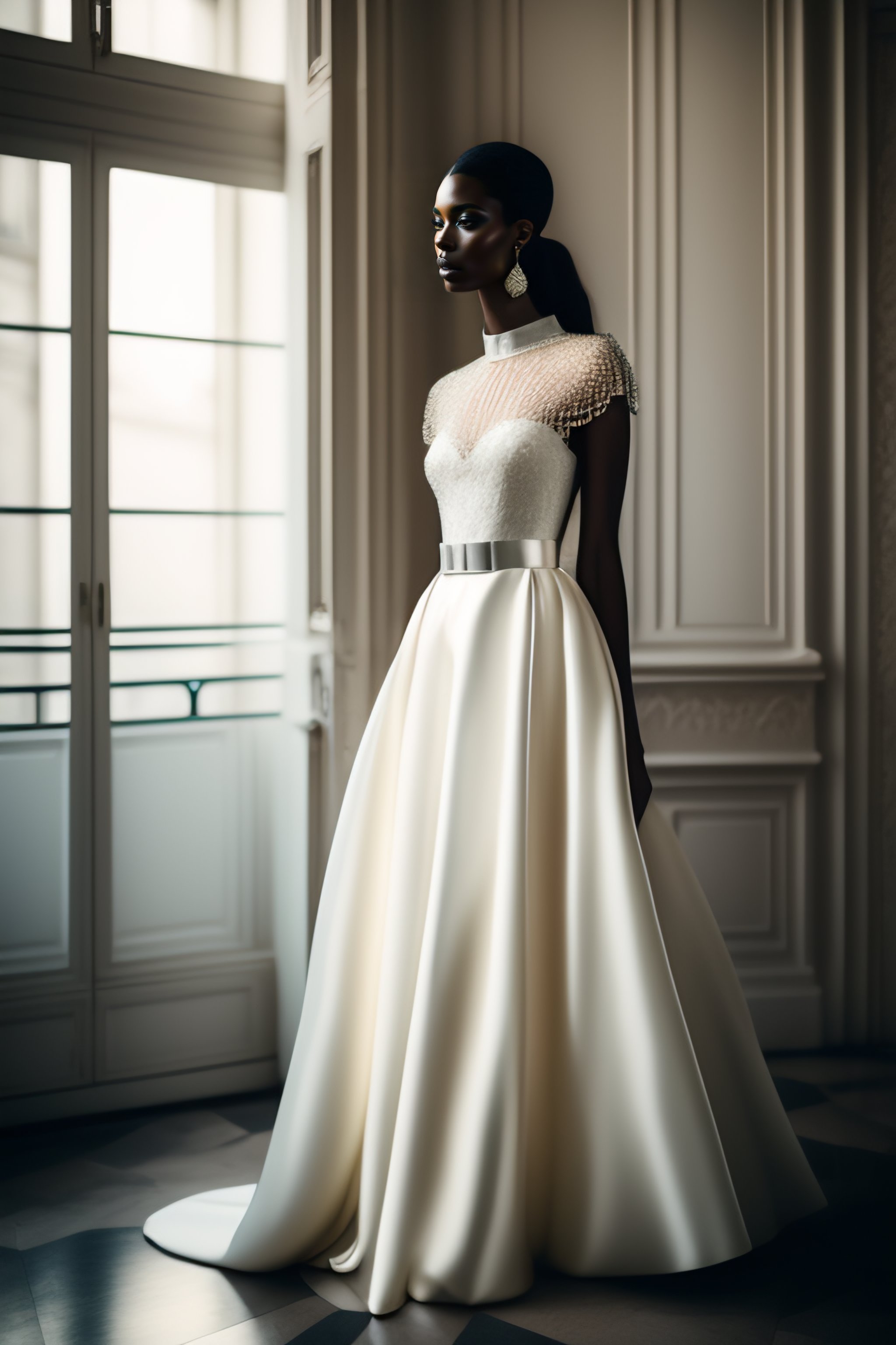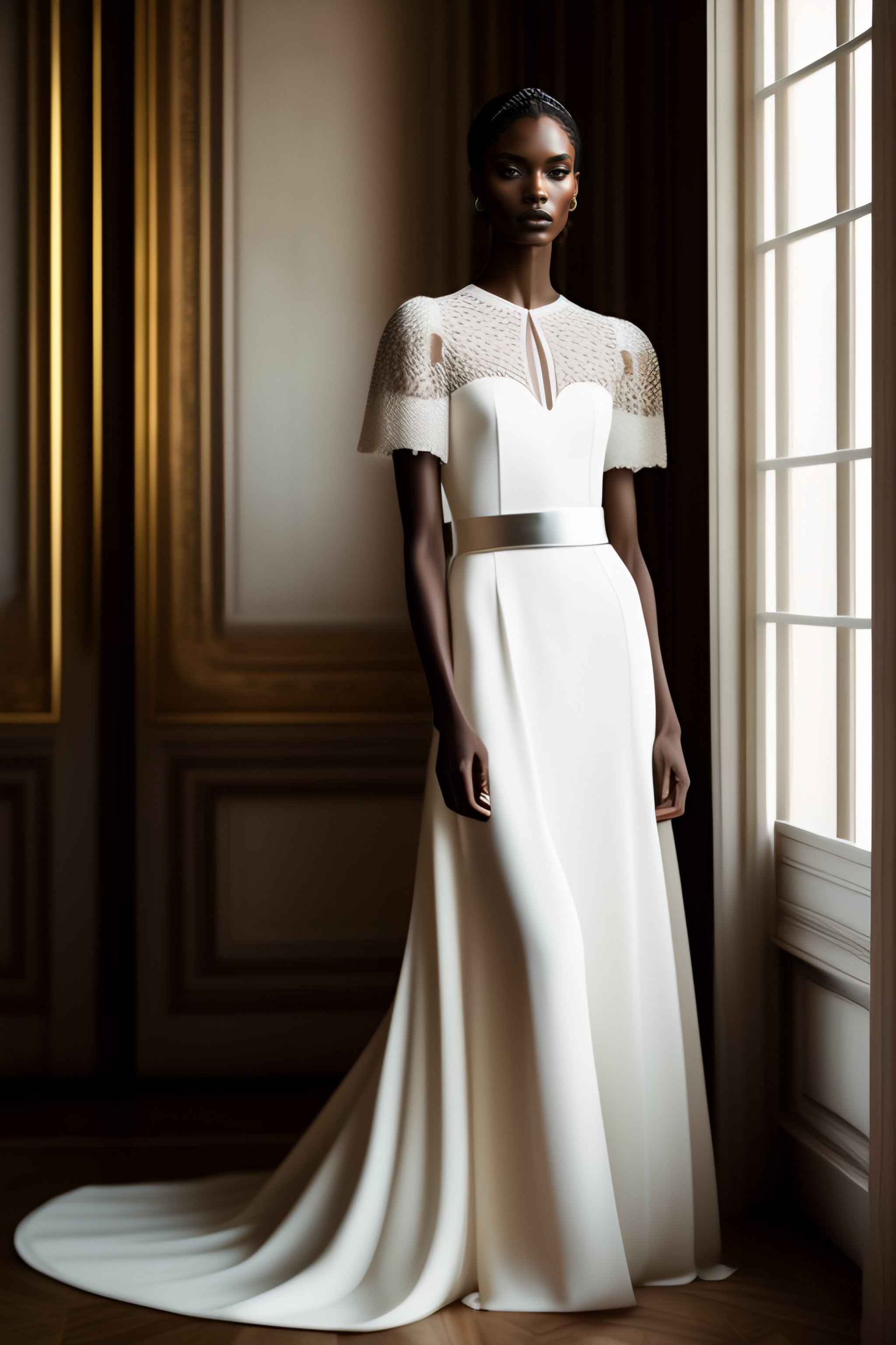 Fashion model wearing a long wedding dress with fish tale silhouette, short sleeves and turtle nek in crepe de chine ivory with a small silver embellished belt, standing in an empty haussmannien appartement in paris