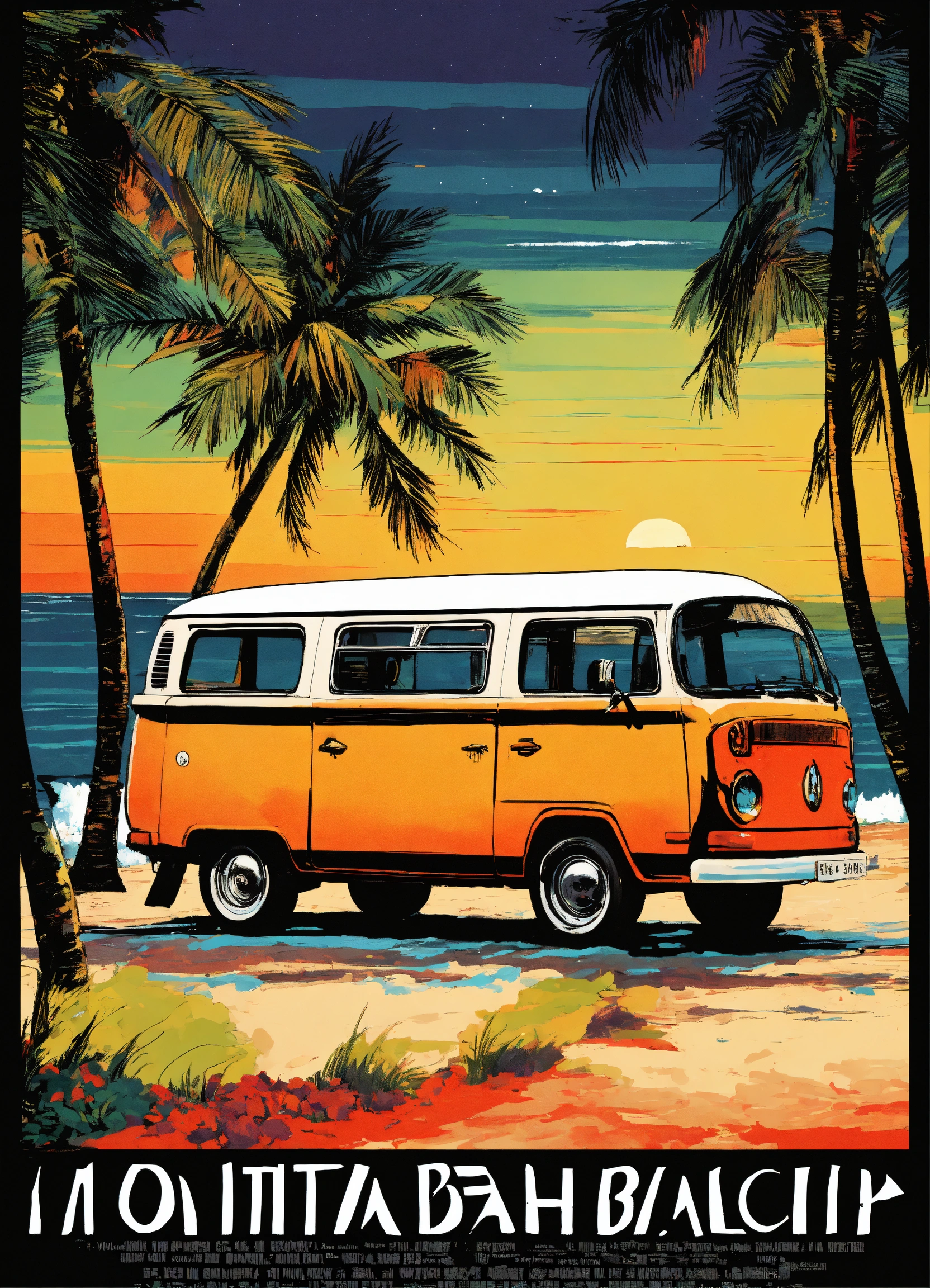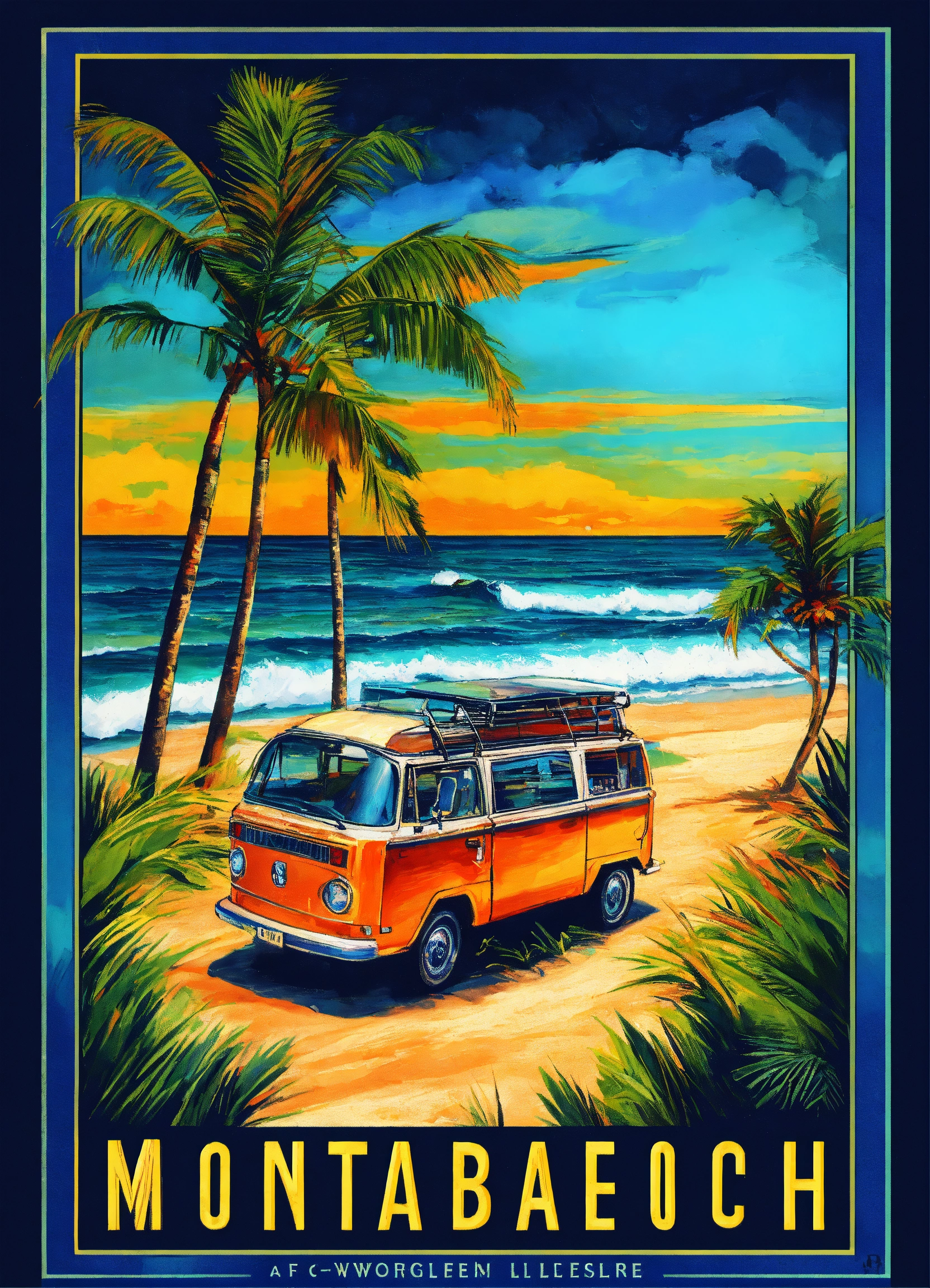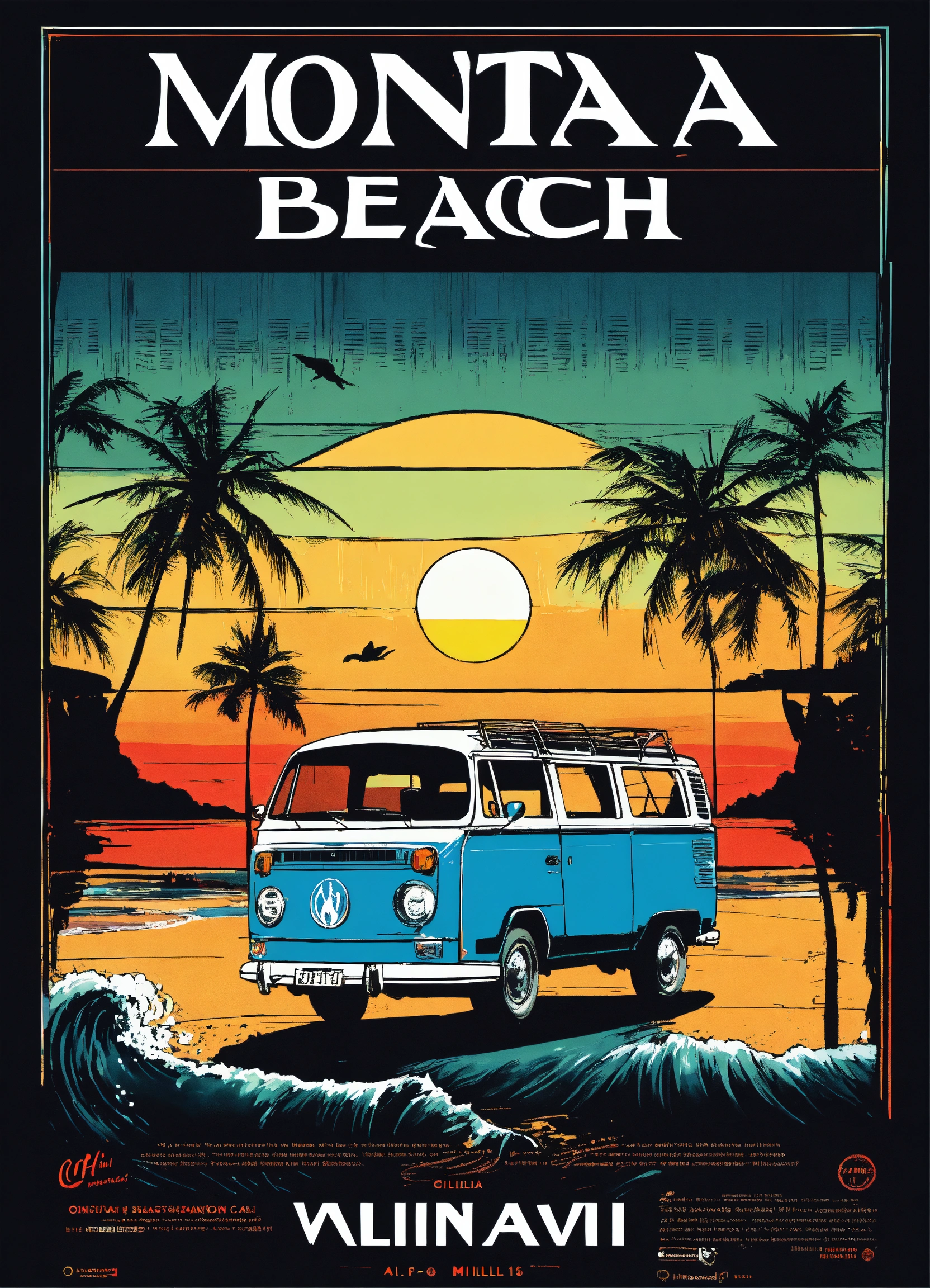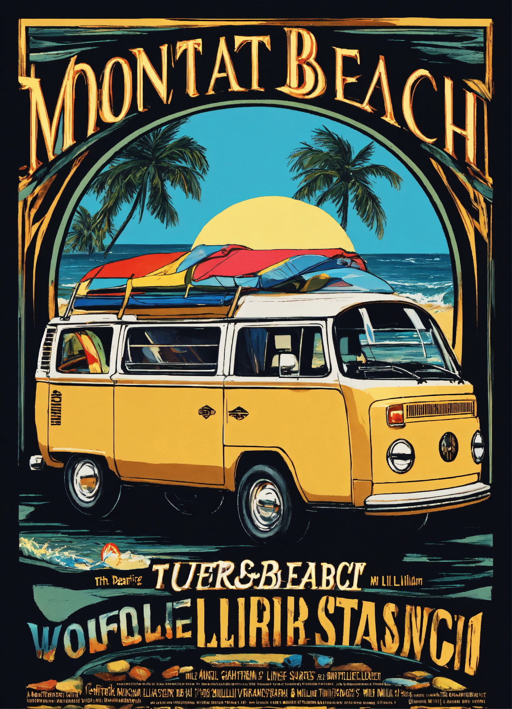 Variant, t-shirt, title "montabeach" a poster with ultra realistic surf, t1 wolwagen combi, with the words of daniel castancarne griffithsandreas lieruss millsleonid afremov, black background