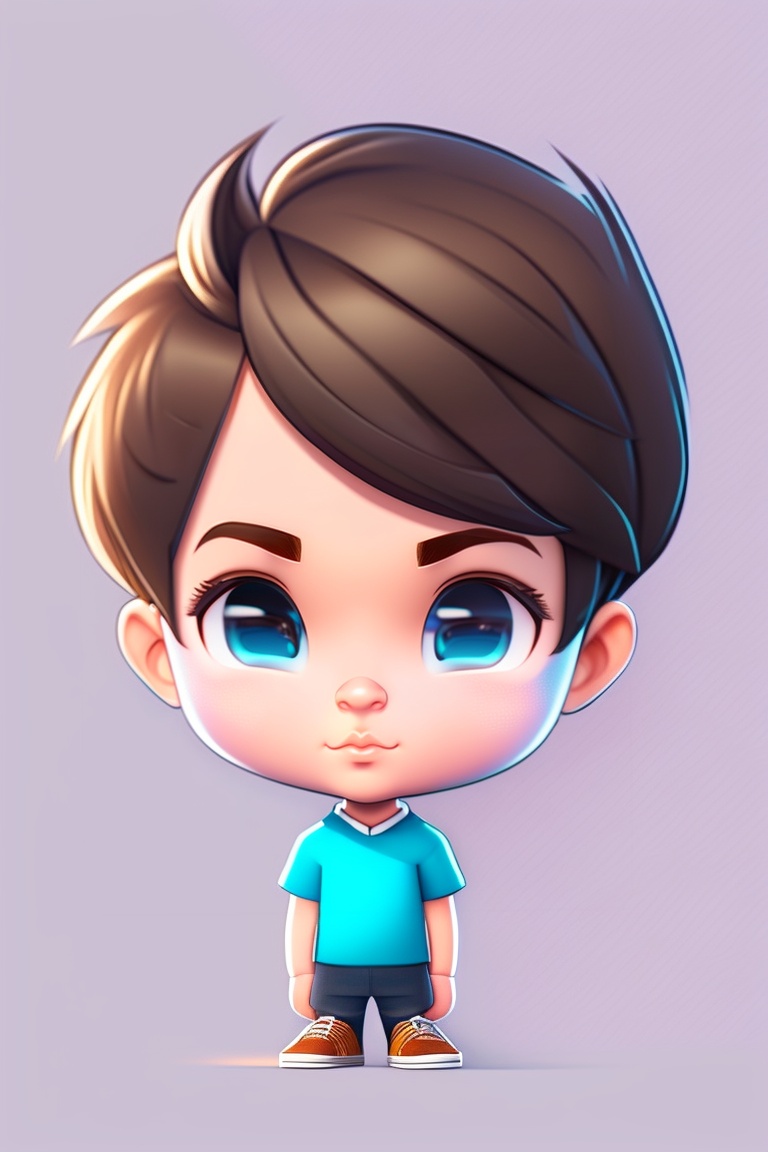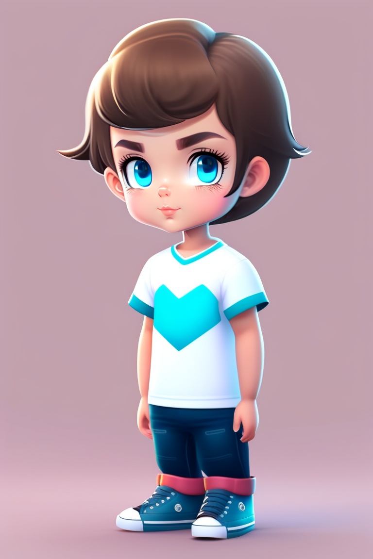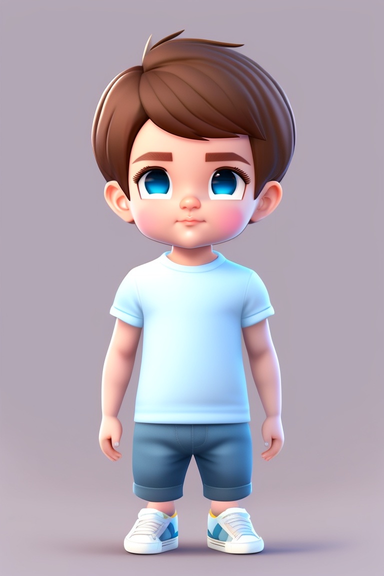Front view of a cartoon boy standing wearing tshirt character design, full body, drawing a face in maximum quality, high-quality drawing of the face, clipart, full illustration, 4k, sharp focus, smooth soft skin, symmetrical, detailed face, concept art, style fairy tales, chibi kawaii, . octane rendering, 3d, perfect face, detailed face, delicate face, perfect sharp lips, detailed eyes.
