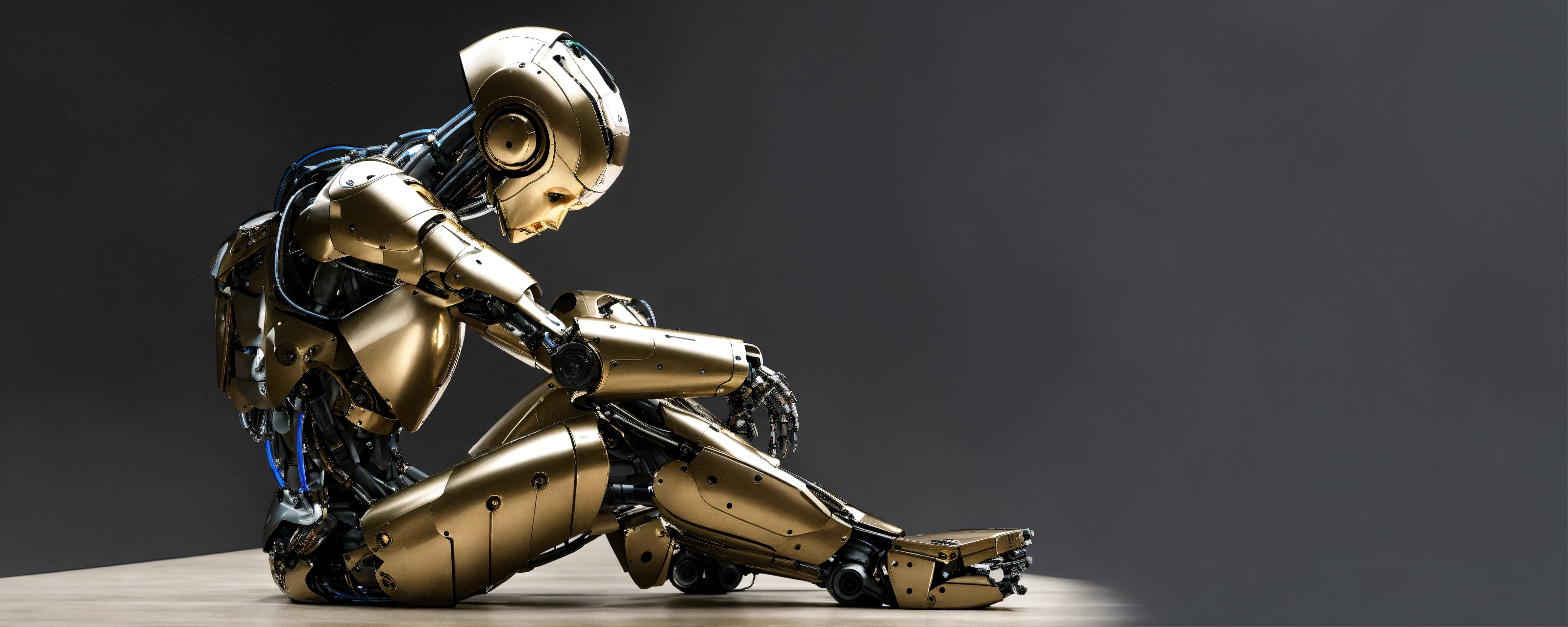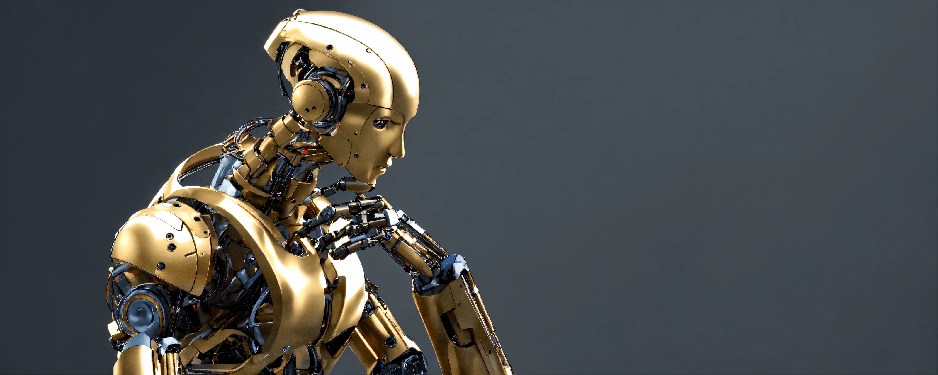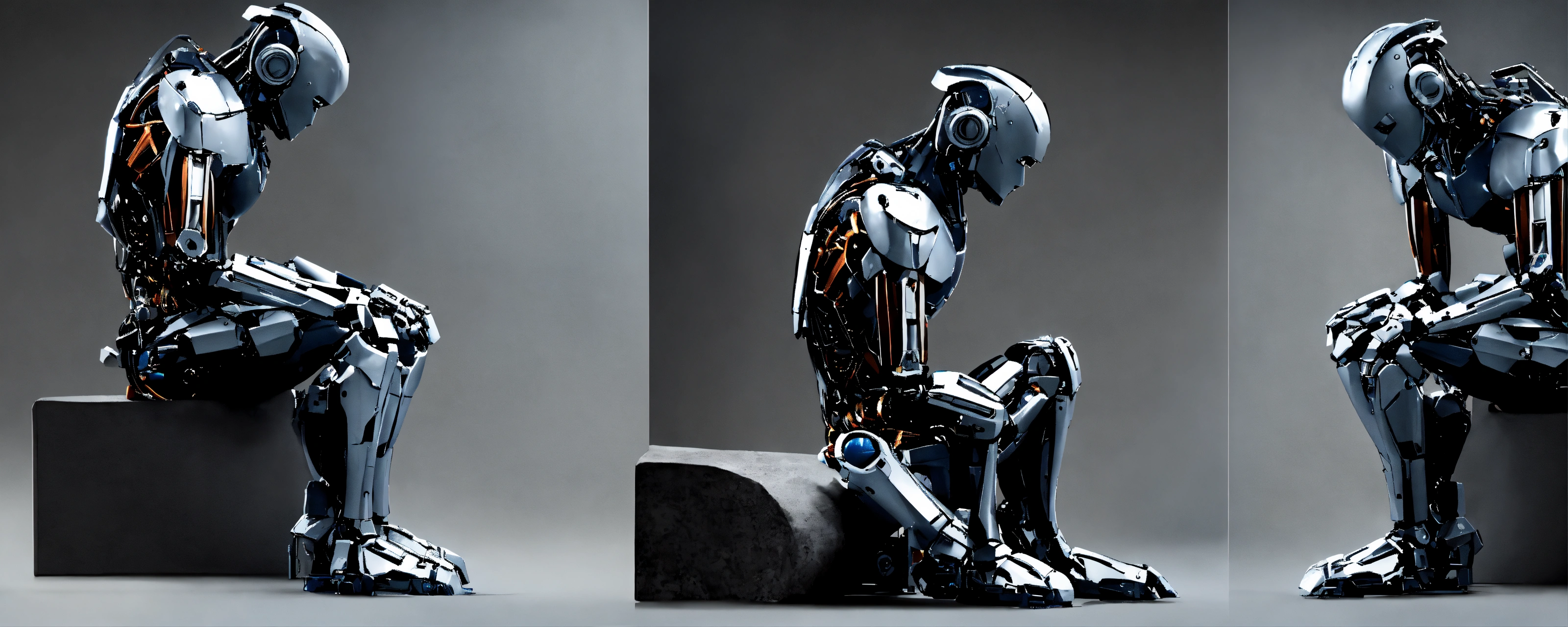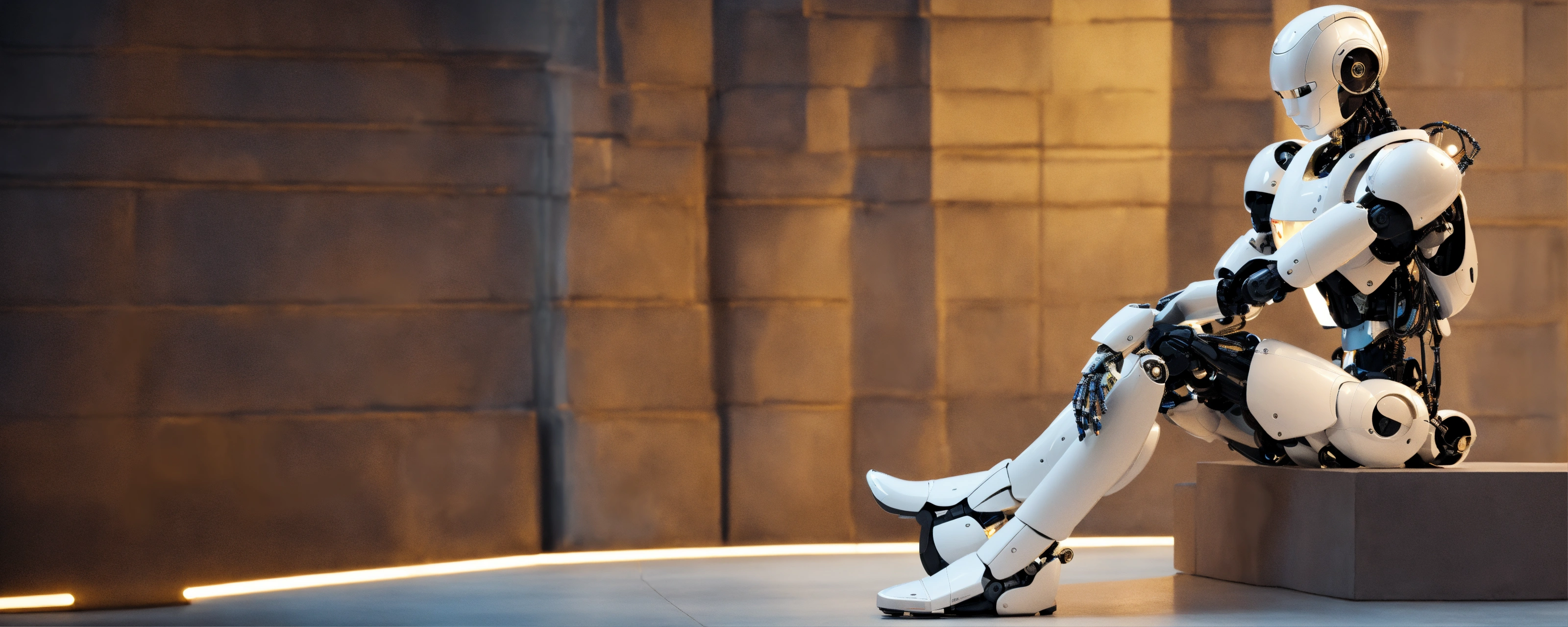 Create an image of a humanoid robot sitting in a contemplative pose, mimicking "the thinker" statue by rodin. the robot should look advanced, with visible mechanical joints and futuristic materials. place it against a neutral background to focus on the details of the robot. the robot is sitting, resting its elbow on its leg and resting its chin on its hand.