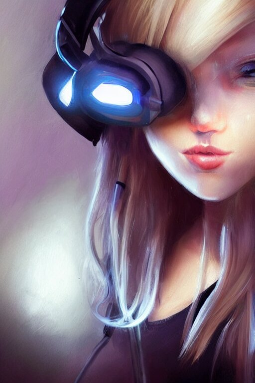 Gorgeous gamer girl with blonde hair and dark eyes playing on her computer, portrait shot of her face lit up by the monitor, cute nose piercing, wearing gaming headset, dark atmosphere, dynamic lighting, ssci - fi and fantasy, intricate and very very beautiful, highly detailed, digital painting, artstation, concept art, smooth and sharp focus, illustration, art by tian zi and wlop and alphonse mucha