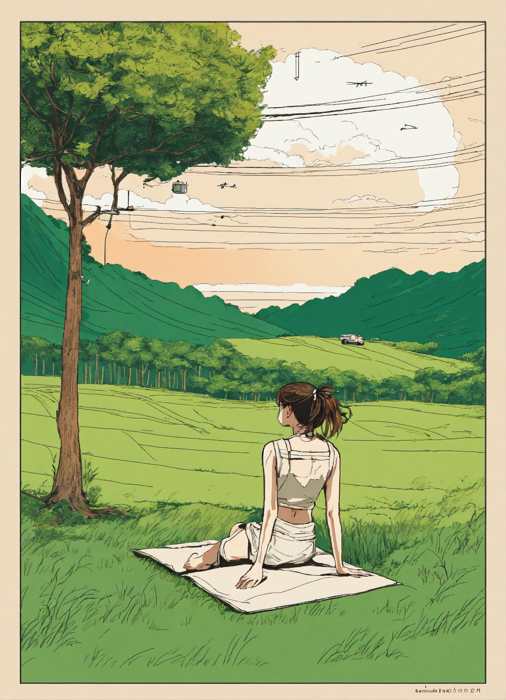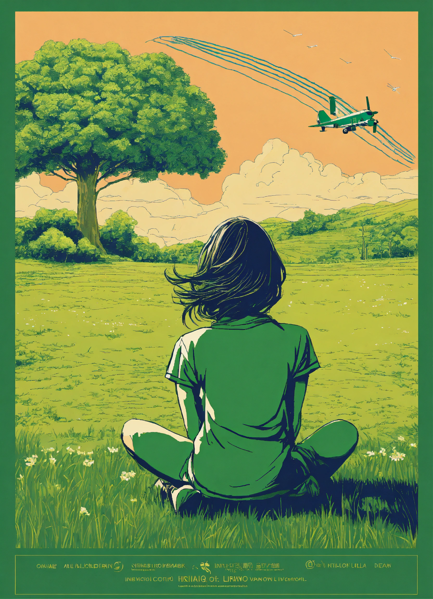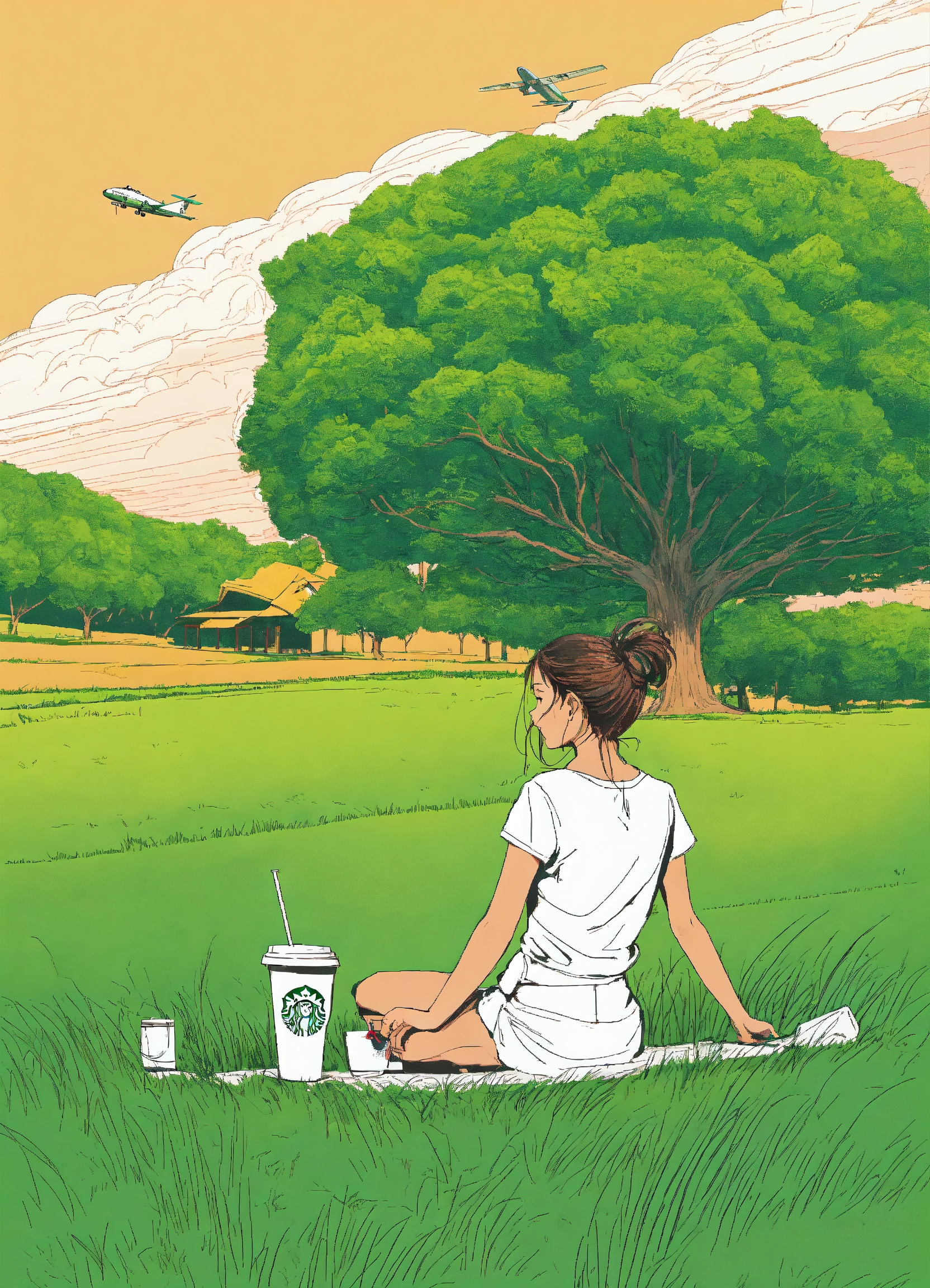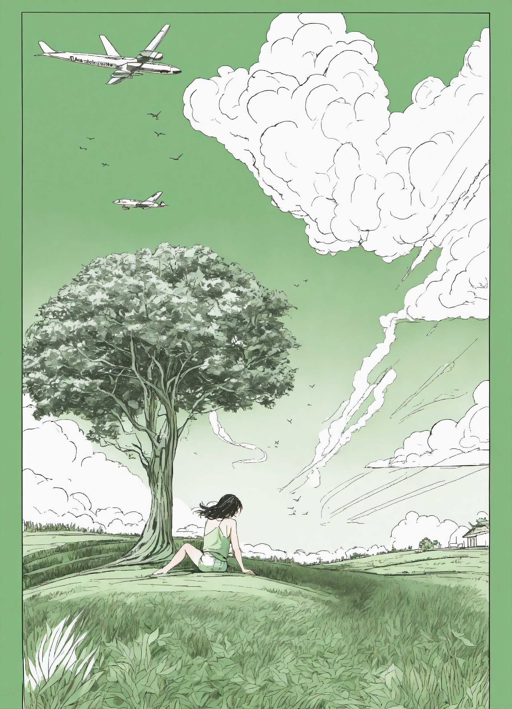 Simple vector line drawing, bold outline of a girl sitting on green, clean vector day time, tree, illustration. sitting on a large meadow, a young girl hula dancer looks at contrails and planes. the contrail seemed to draw some letters. a perspective looking straight back and diagonally. draw deformed. poster style. a design like the starbucks logo. a deformed taste like a picture book. back view. in ink.draw in one color.