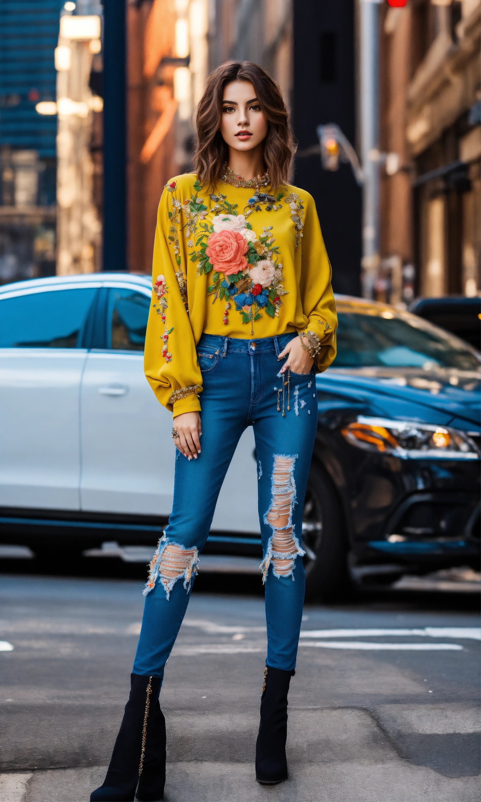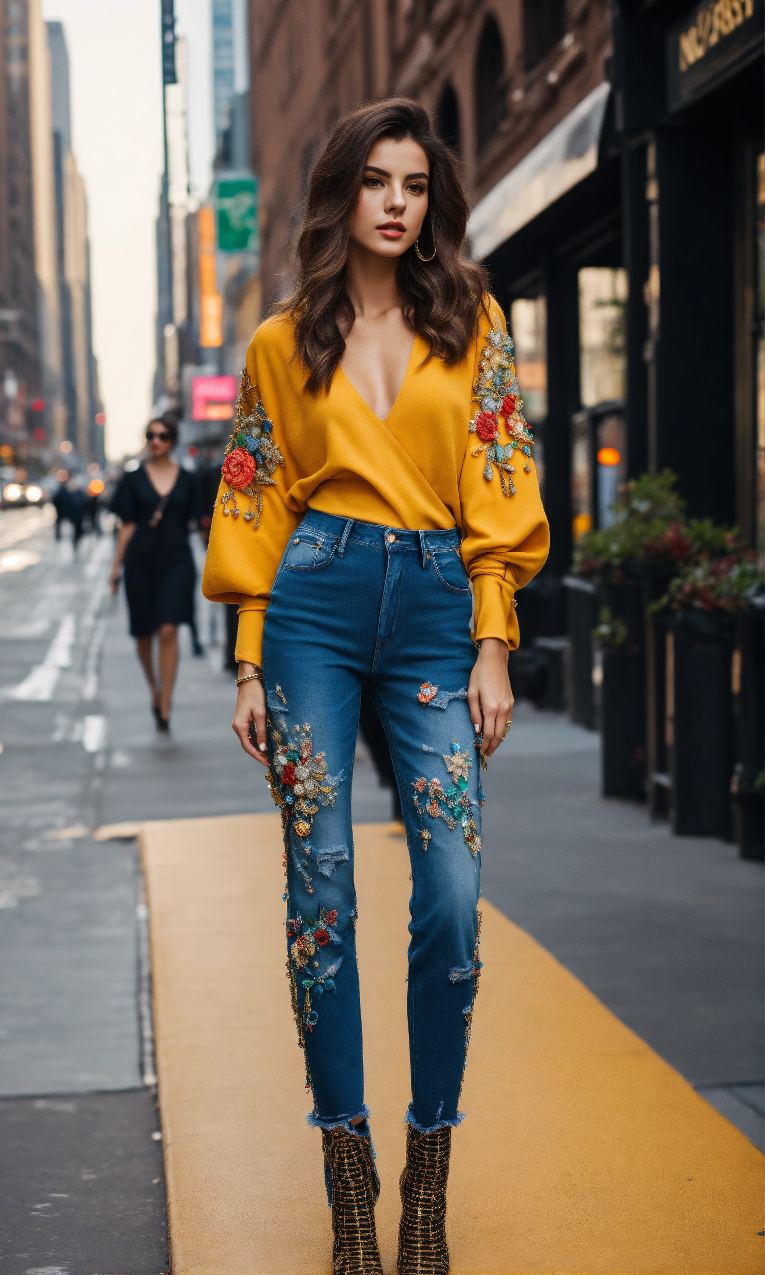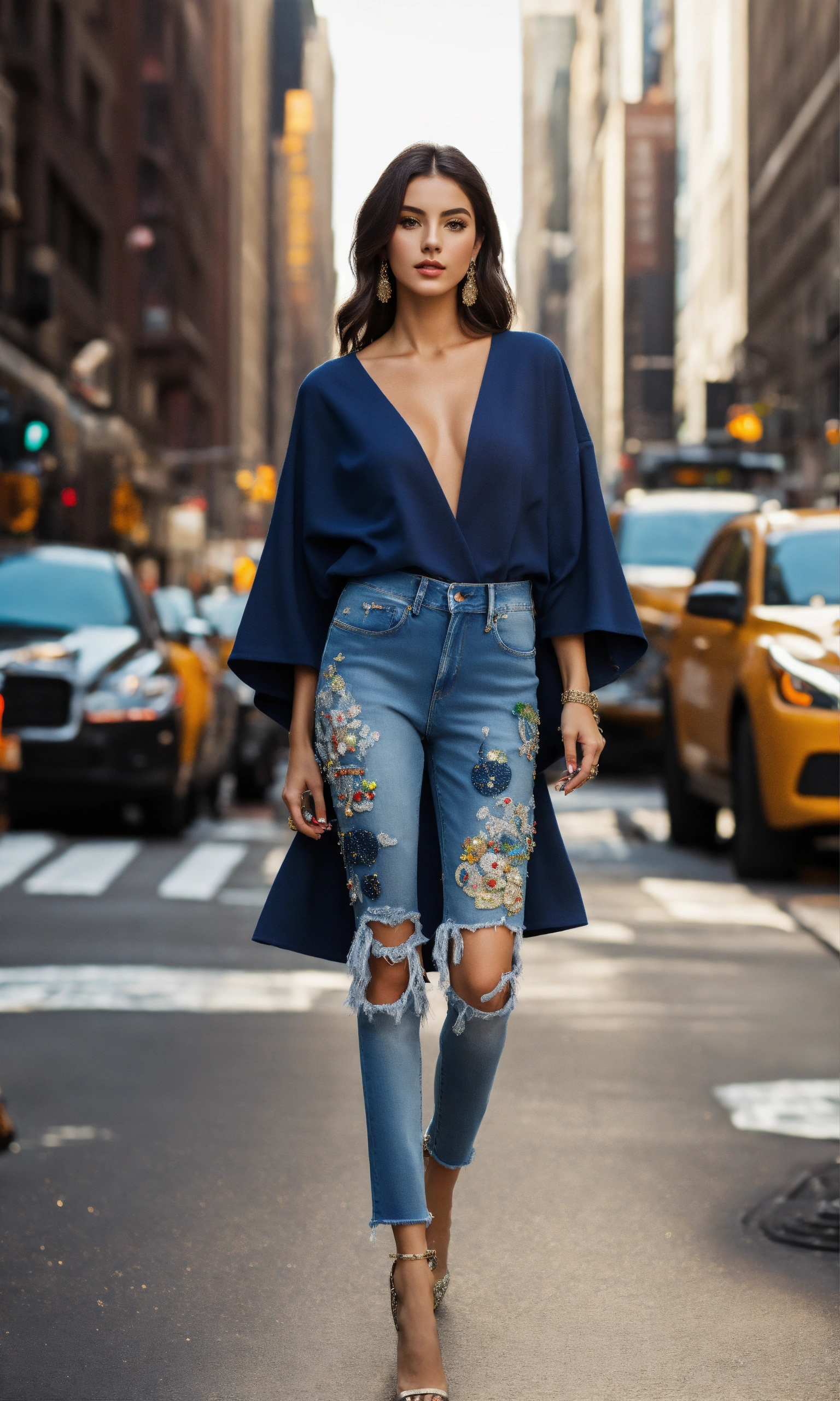 Ultra realistic full body photo of petite italian female model modeling upscale very artistic dolman sleeve travel inspired embellished jeans outfit with cool unusual elements in new york