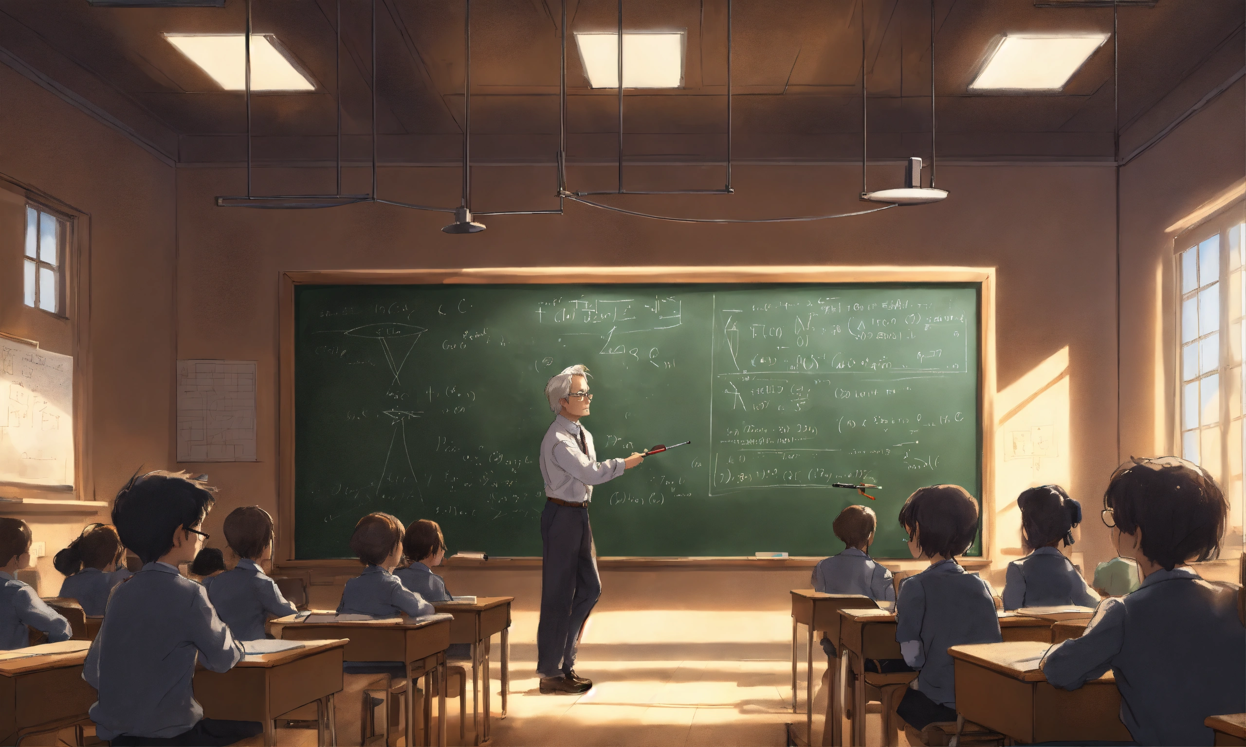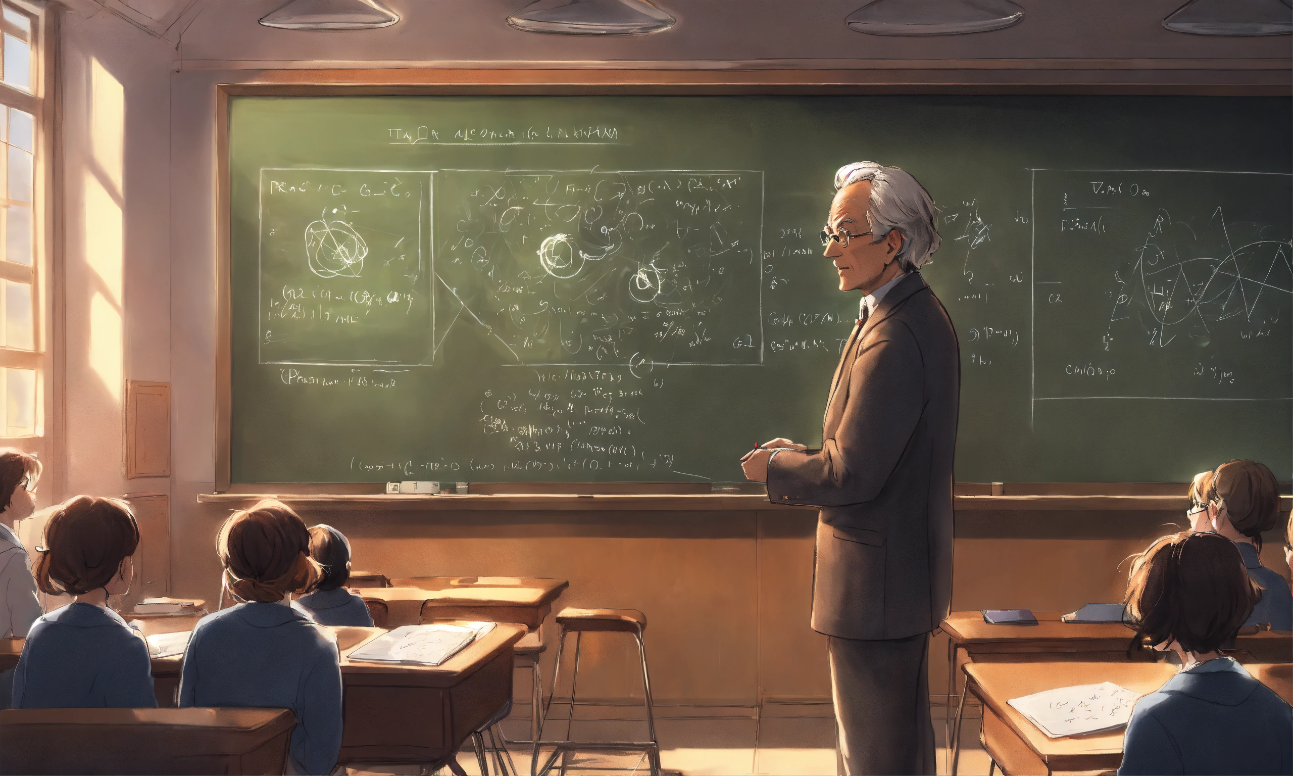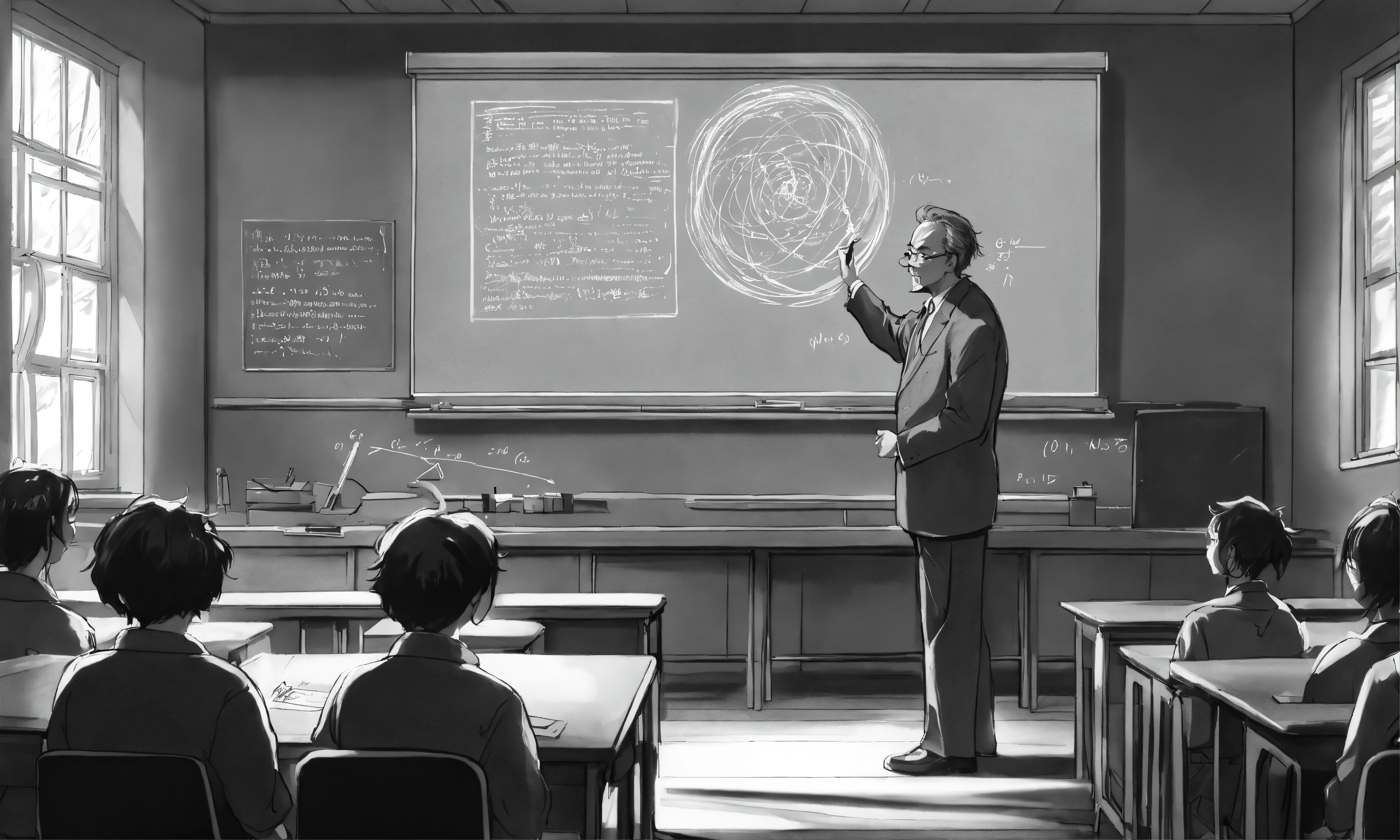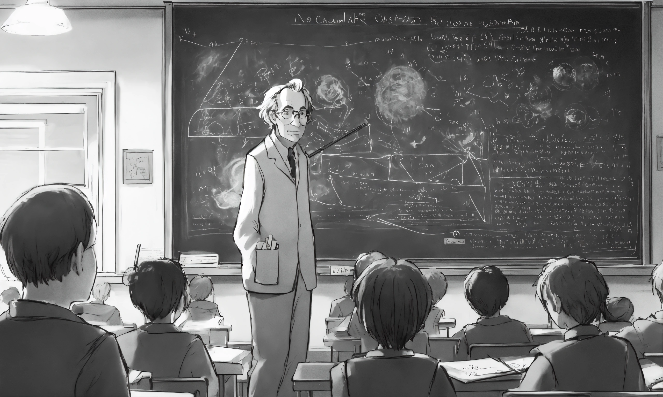 Professor at a chalkboard in front of a classroom doing physics greyscale anime richard feynman pastel art in front of a classroom of many students