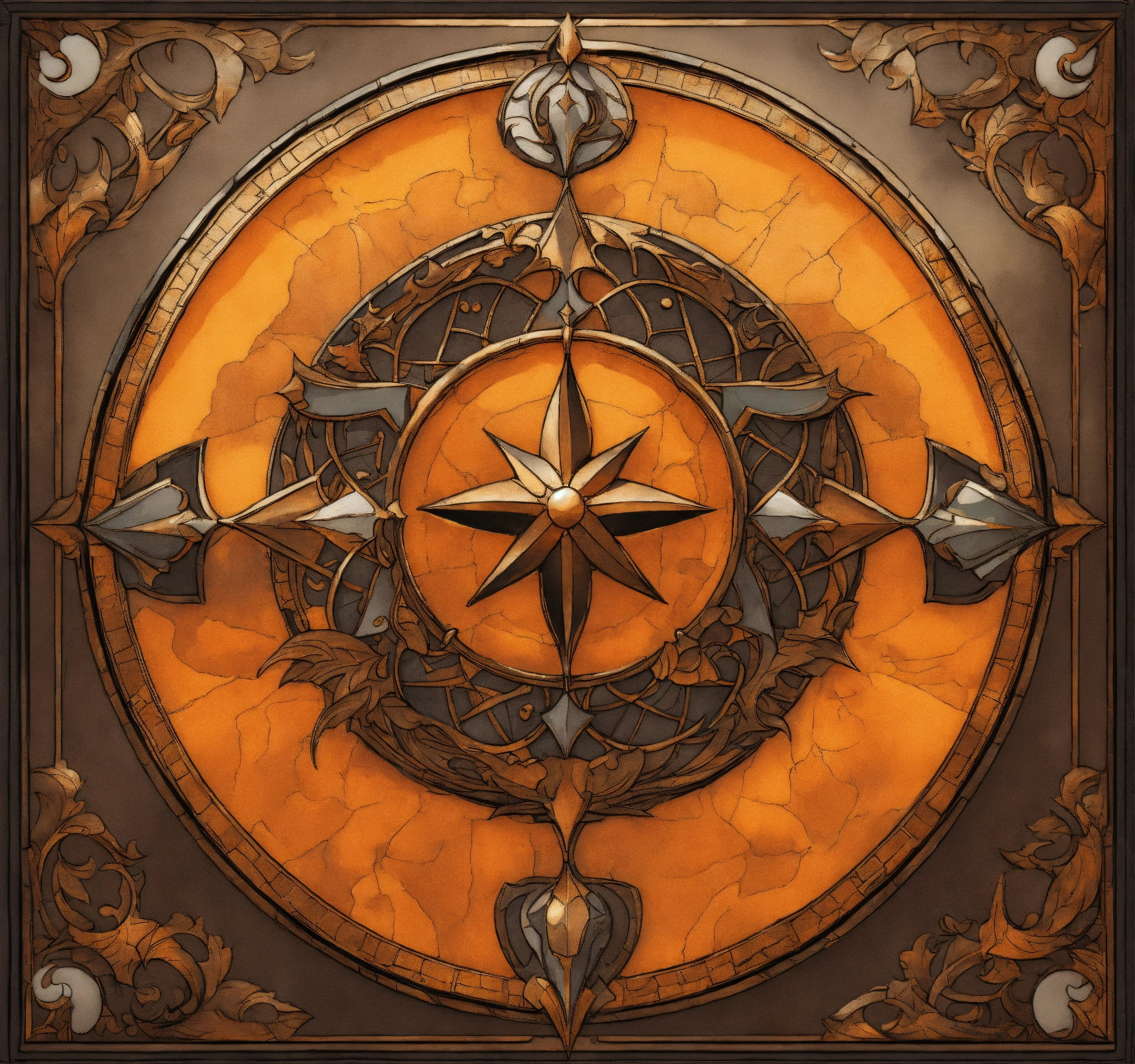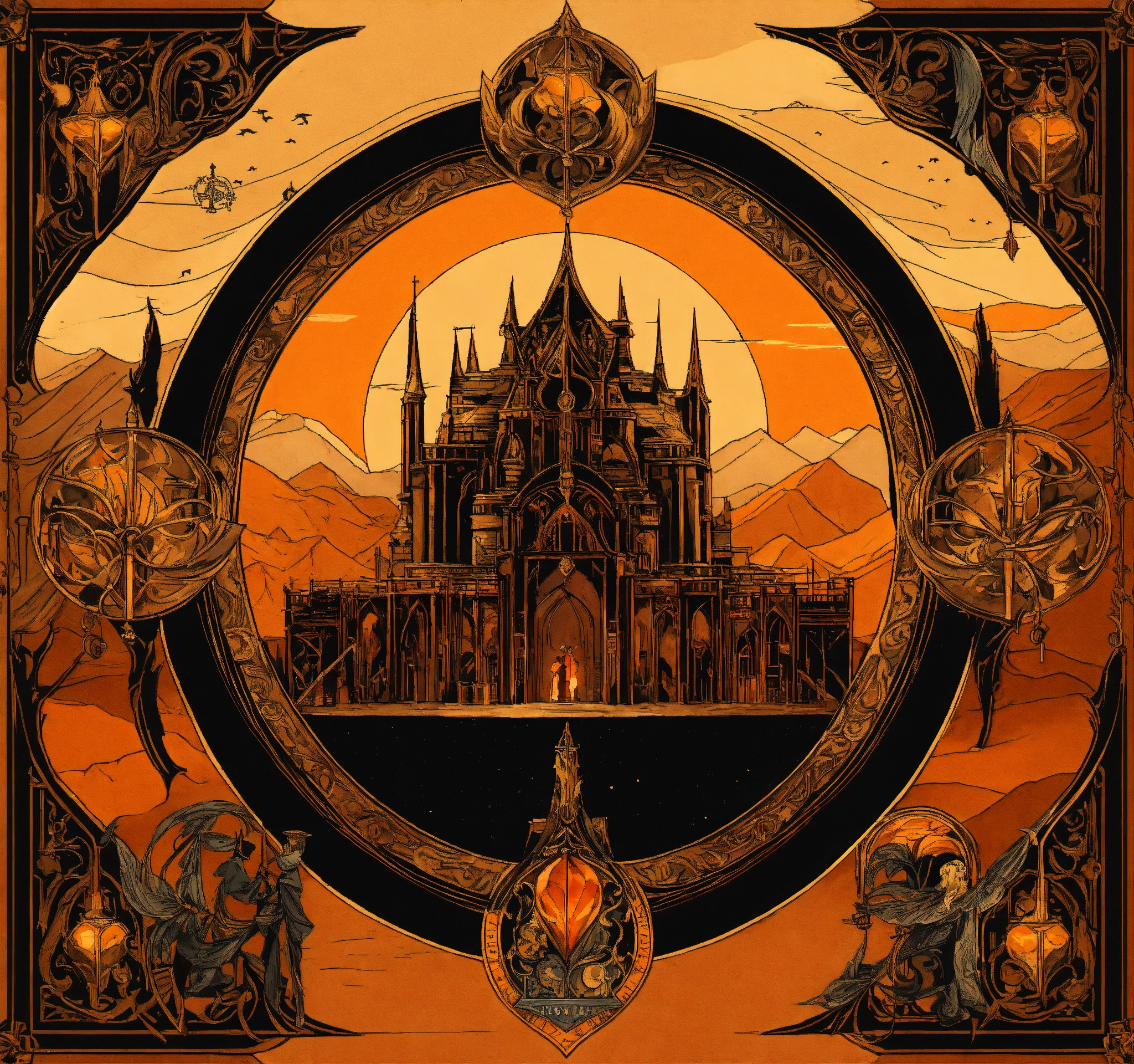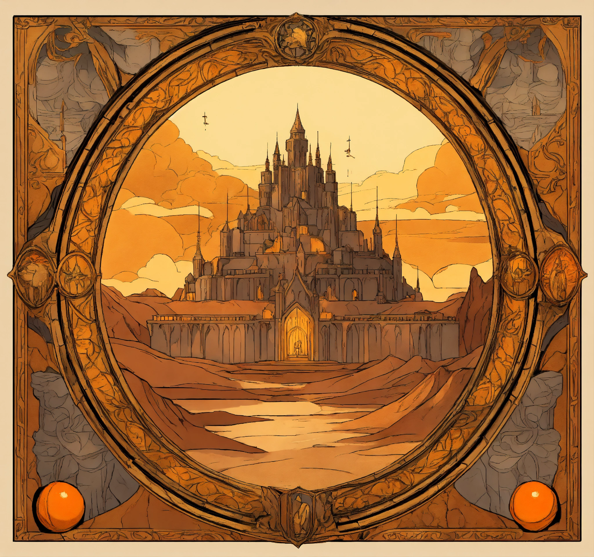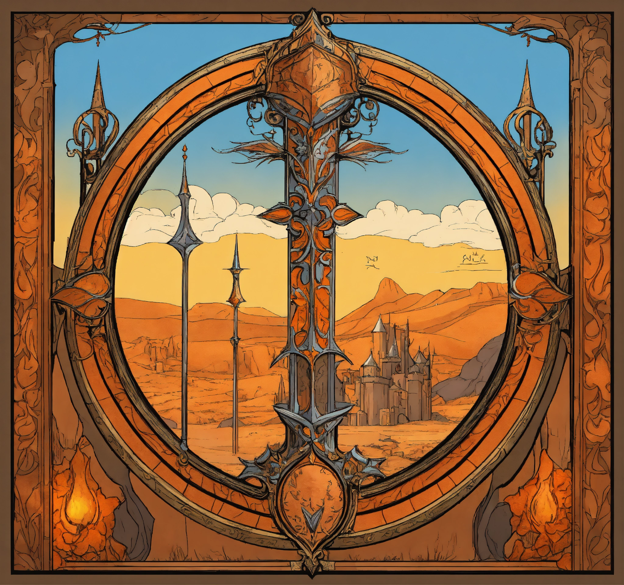 Fantasy setting, heraldry for a desert nomadic elvish kingdom, browns, oranges, golds and black, in comic book and gothic art form