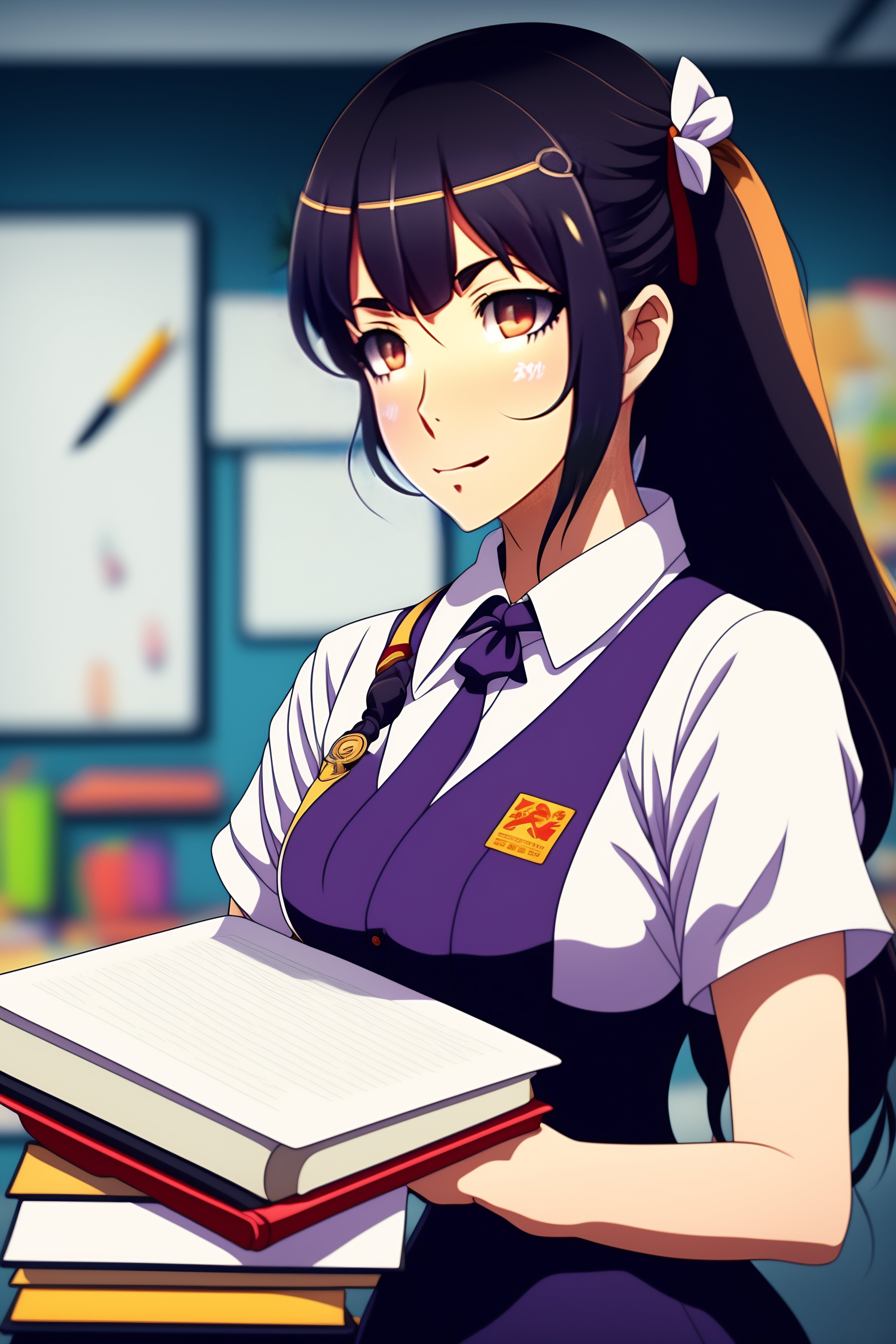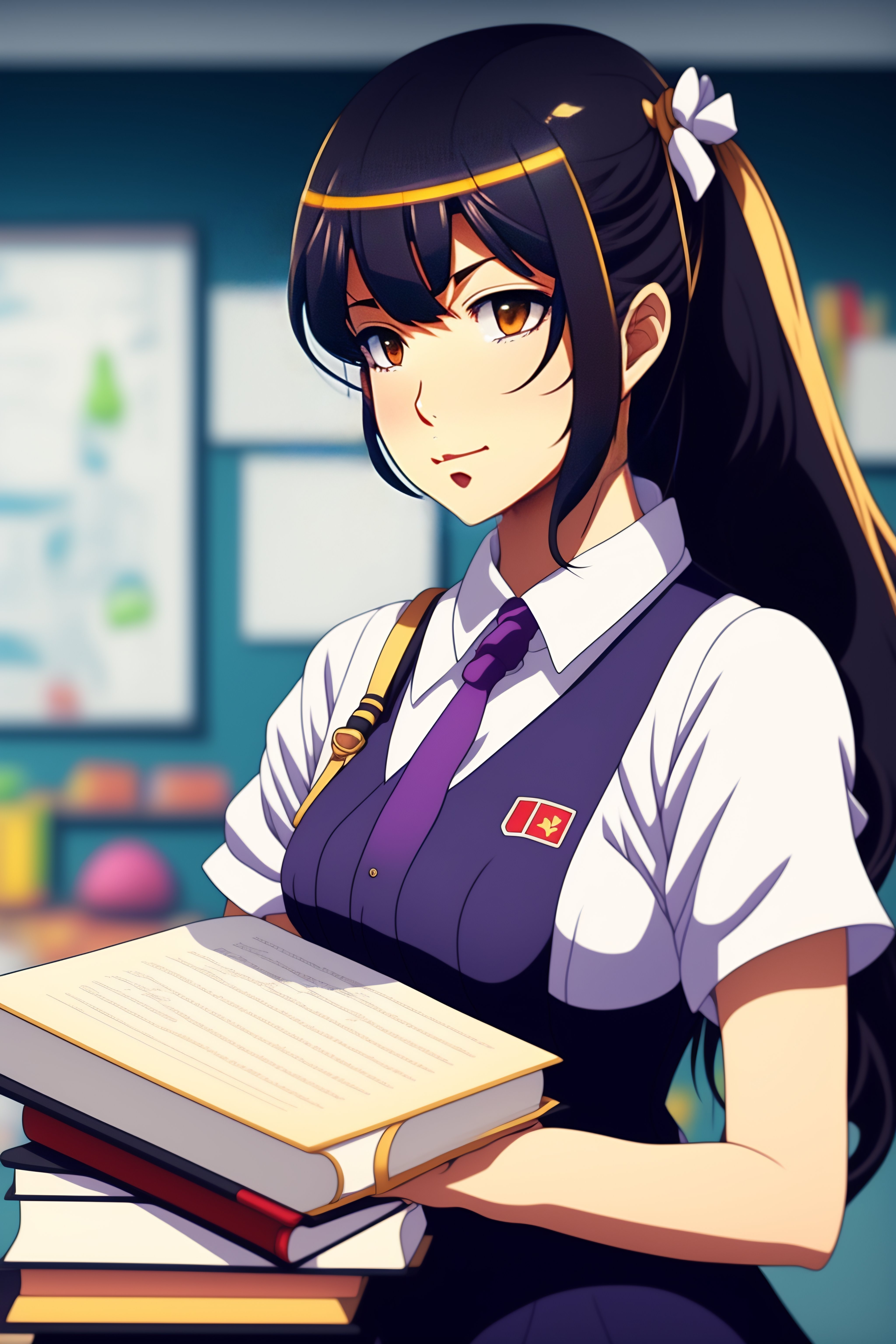 A beautiful female teacher, wearing a uniform, holding a textbook, is teaching in the classroom, anime style,anime line art