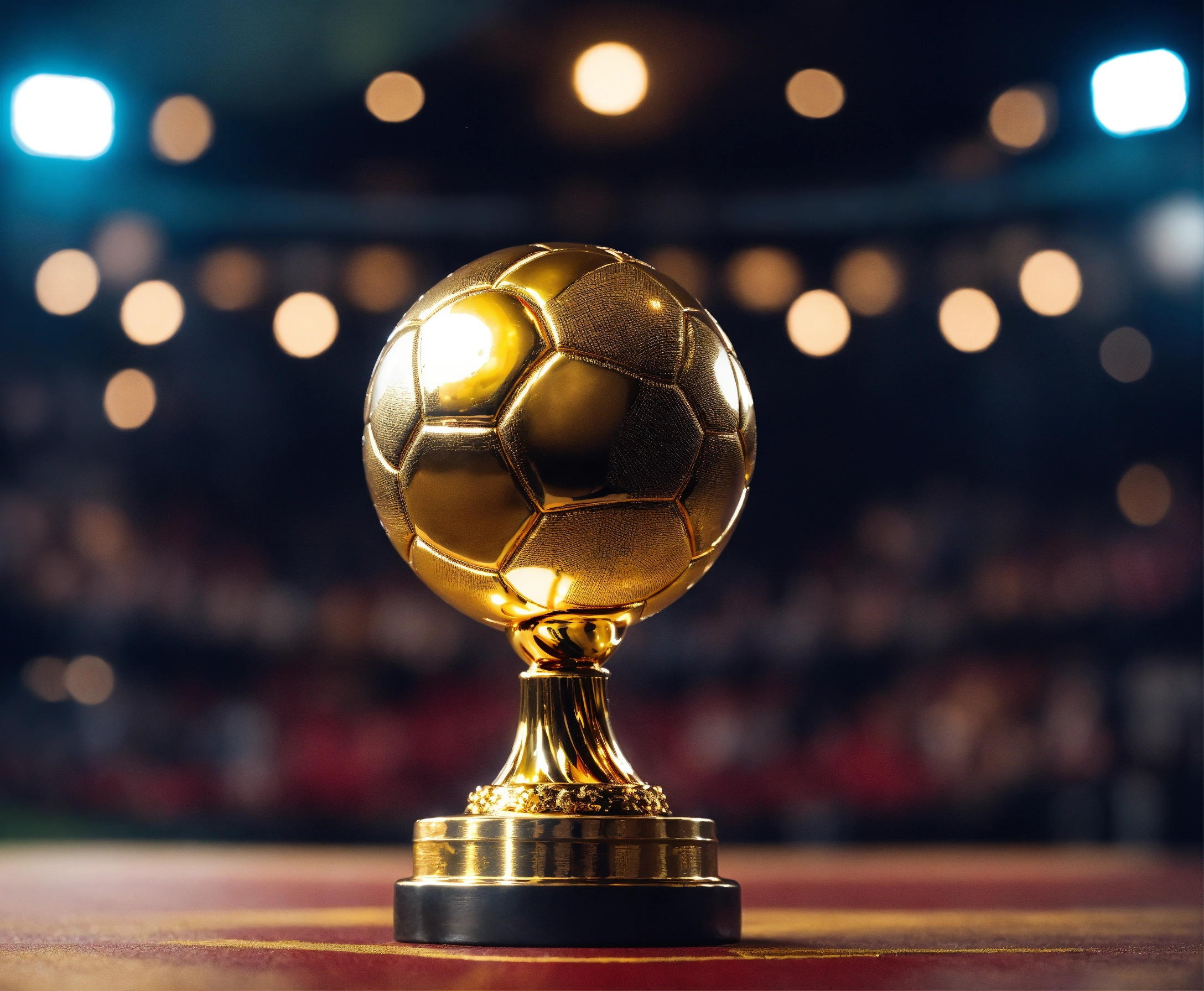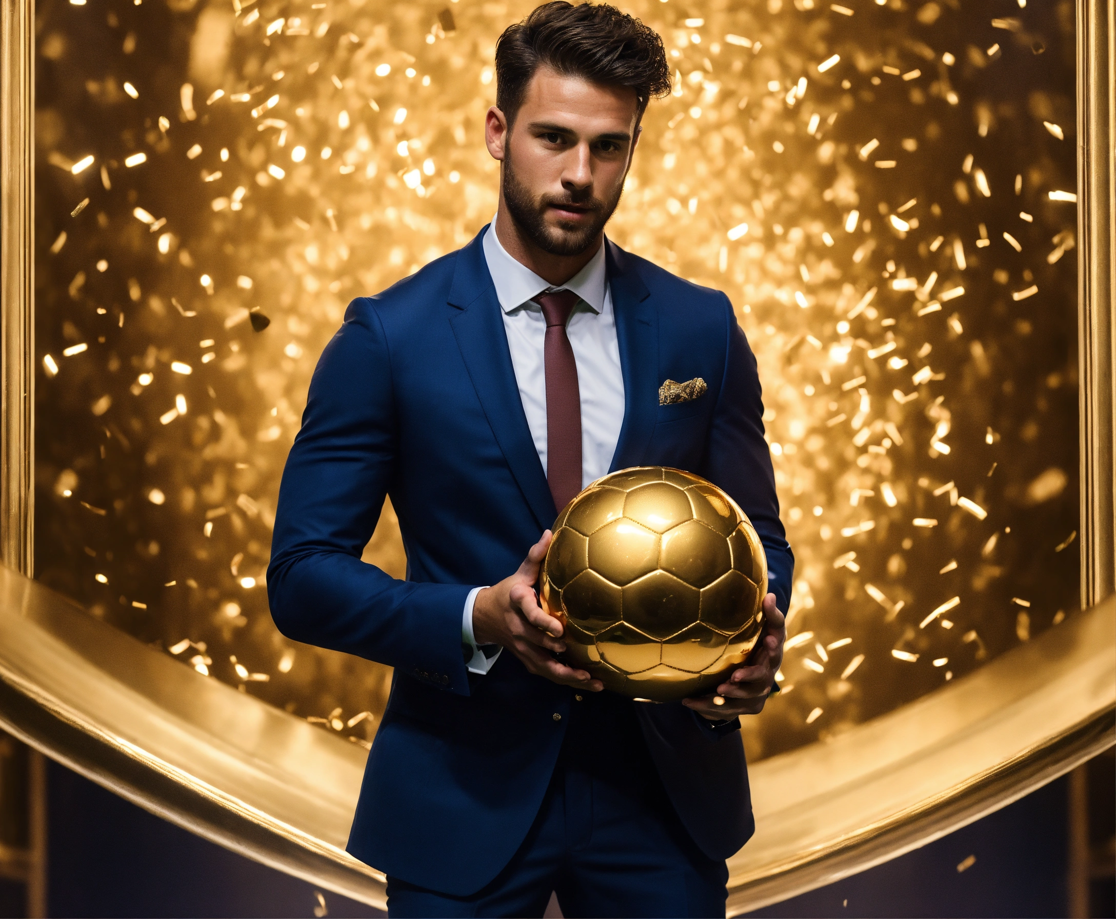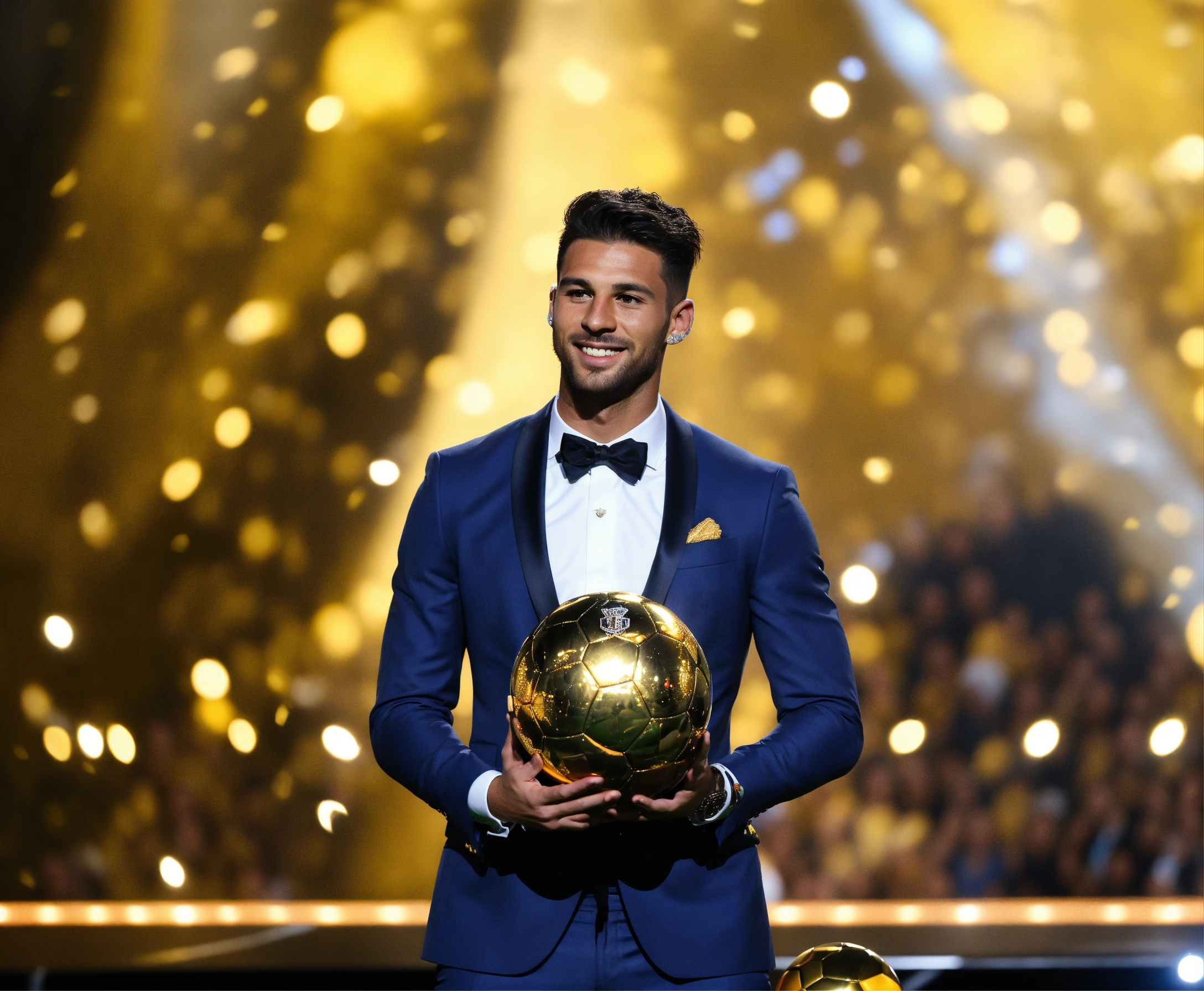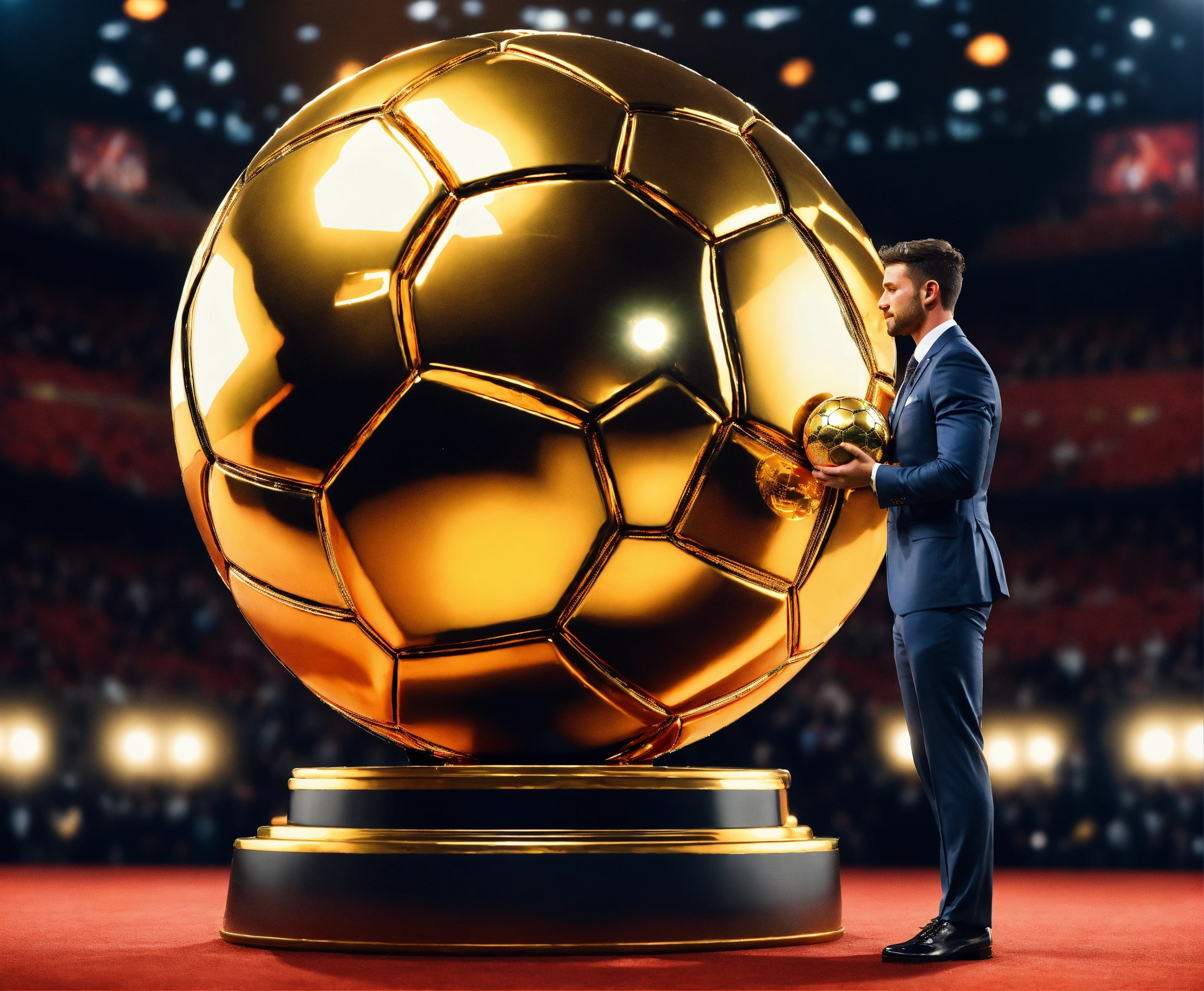 Awarding the golden ball to the best football player, on stage, half of the body is visible, a cute man in a suit